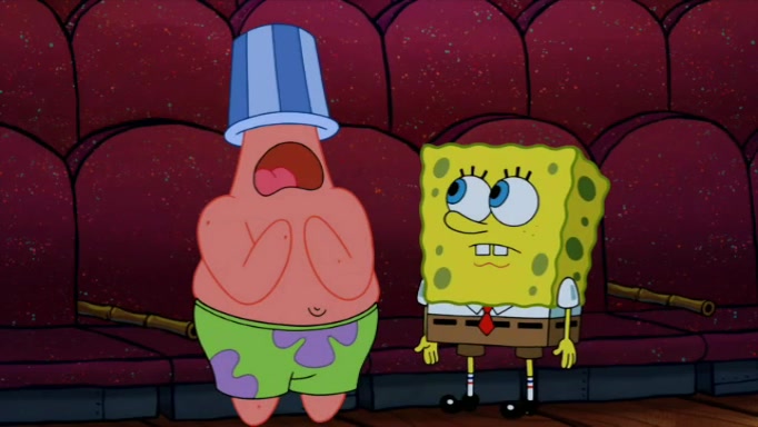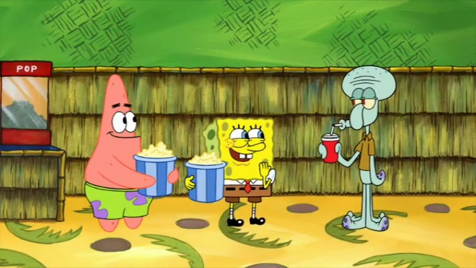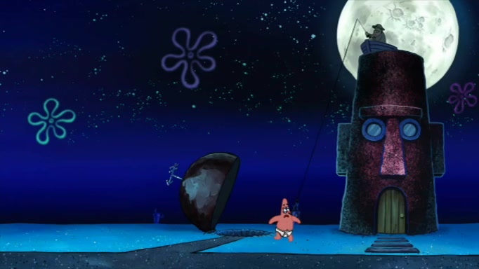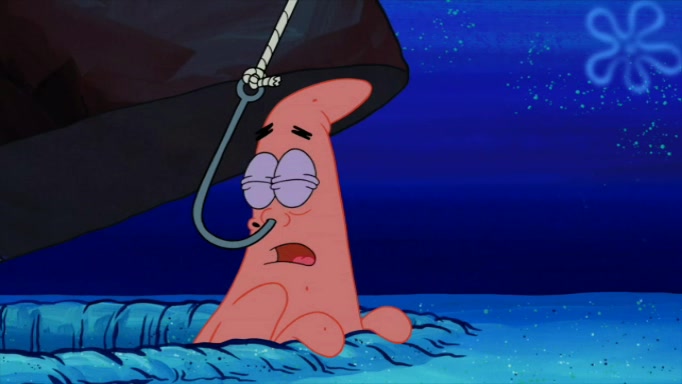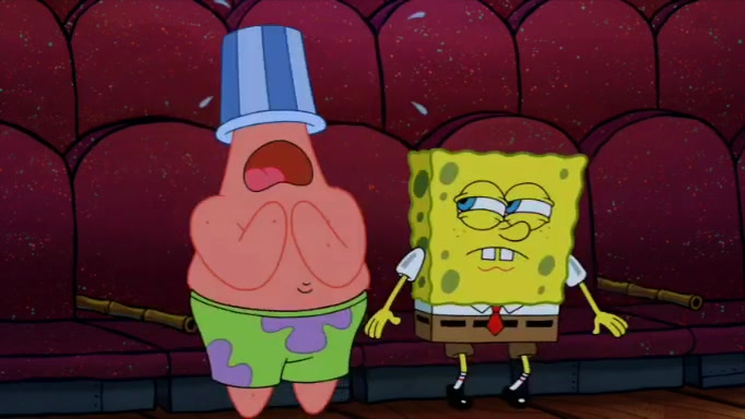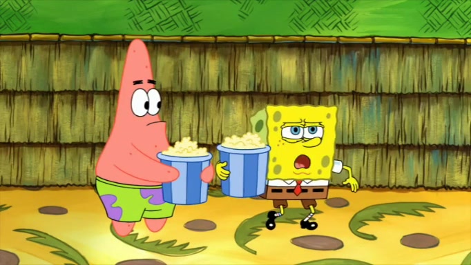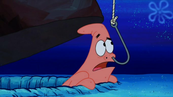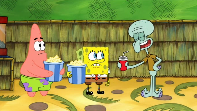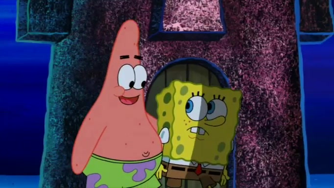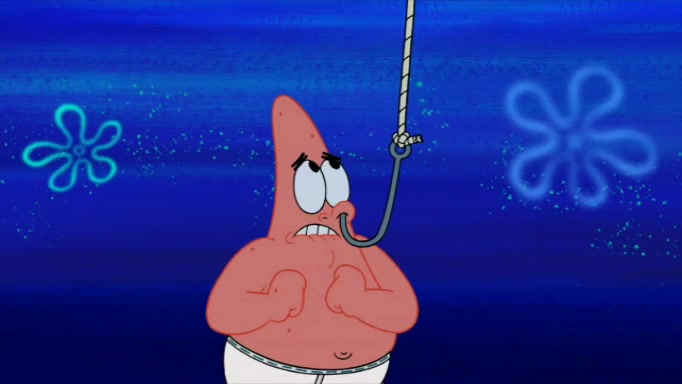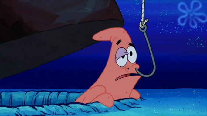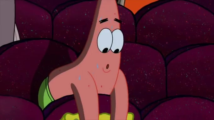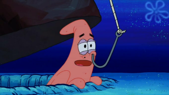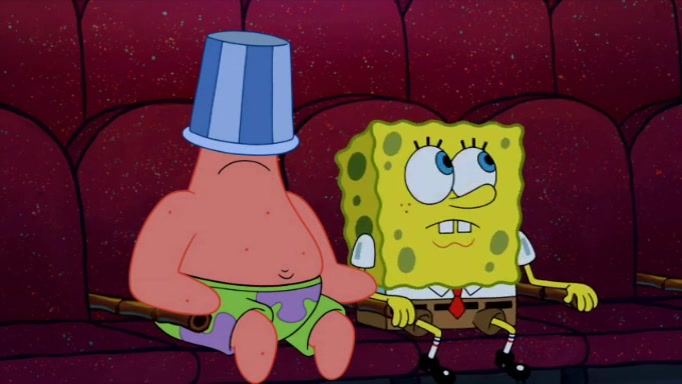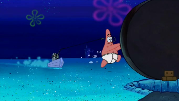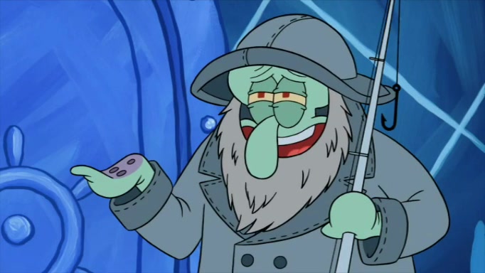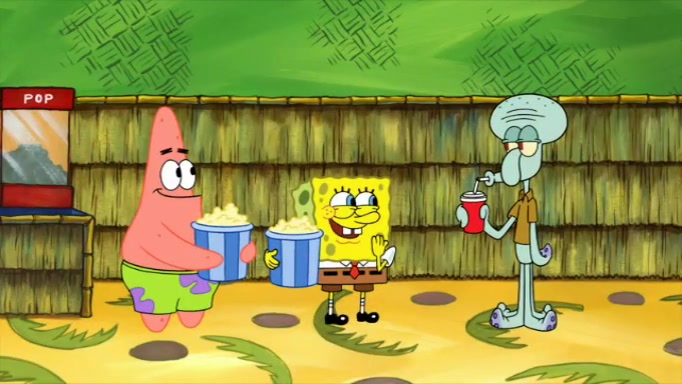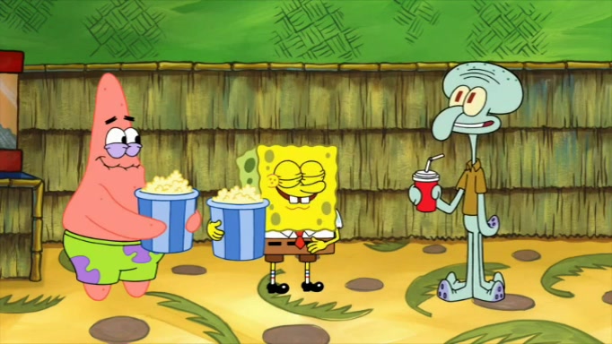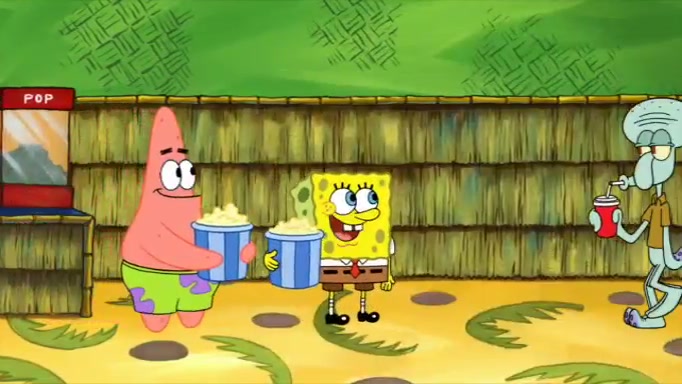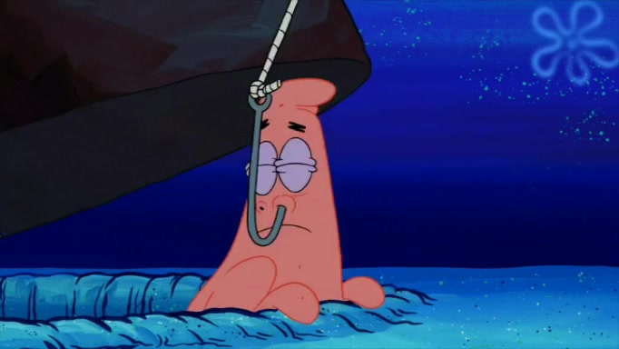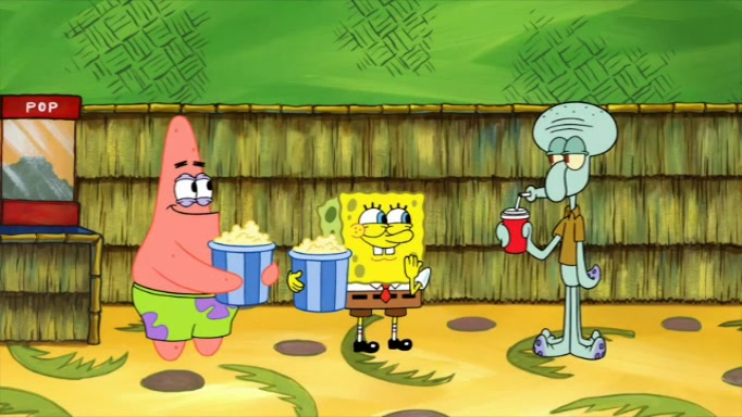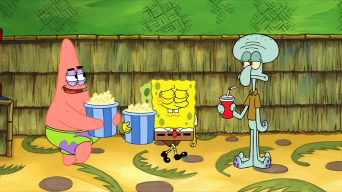 SpongeBob and Patrick are at the movie theater going to see Fisherman 4: Attack of the Hook. They meet Squidward who laughs saying they won't have any sleep after seeing the movie. They both claim they're grown-up men, but Squidward says "Boo" in monotone and scares them effortlessly.