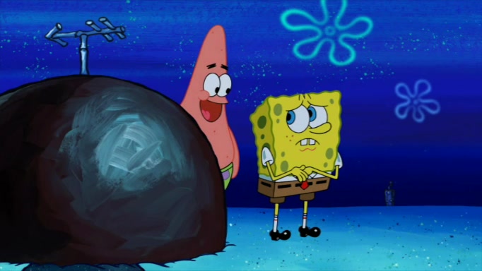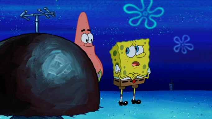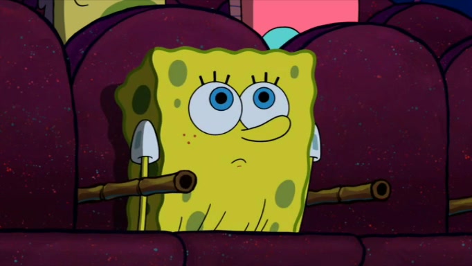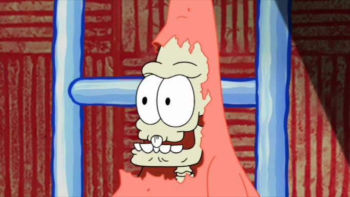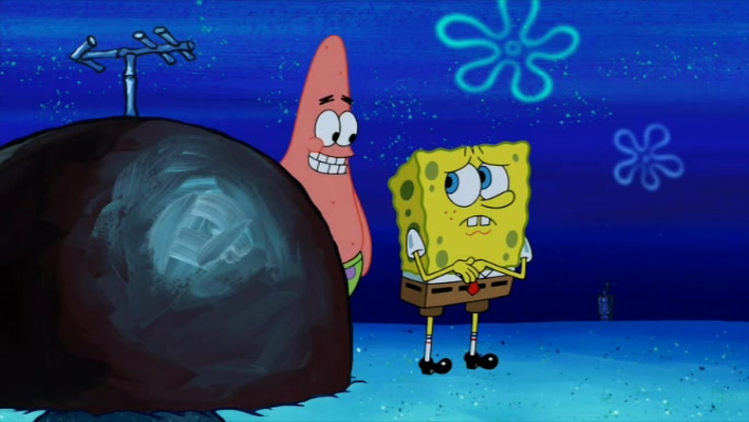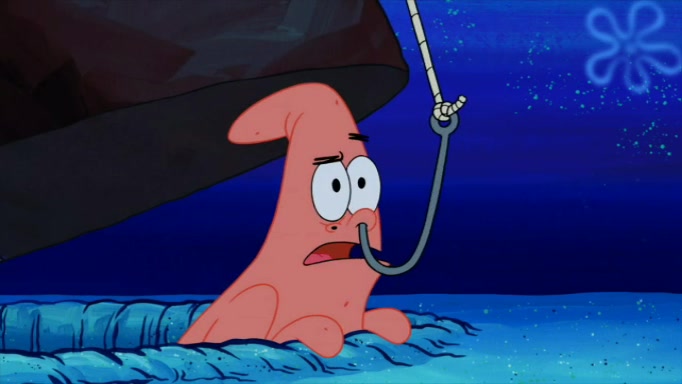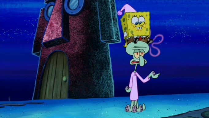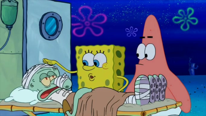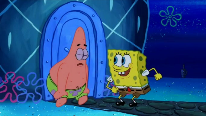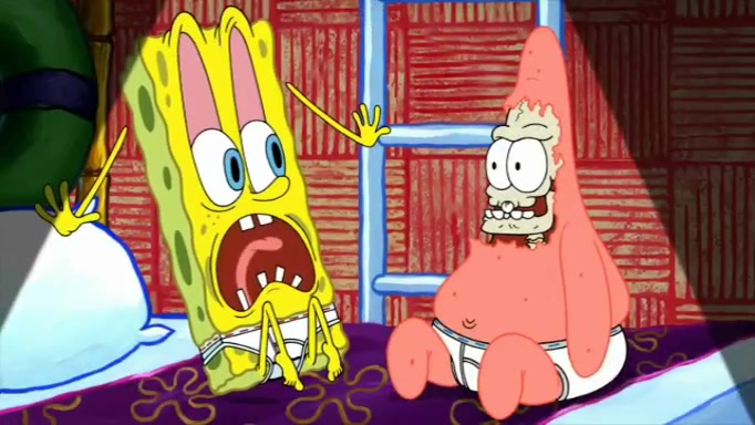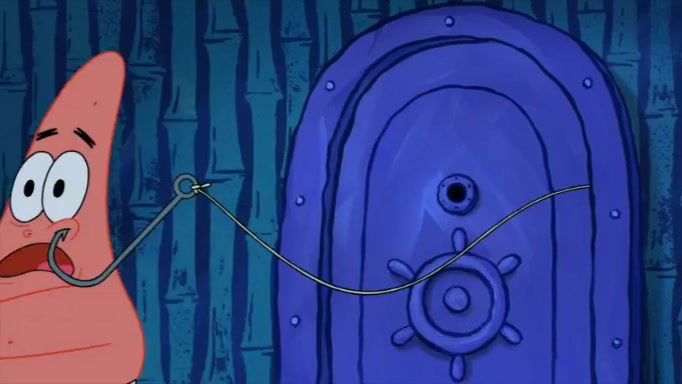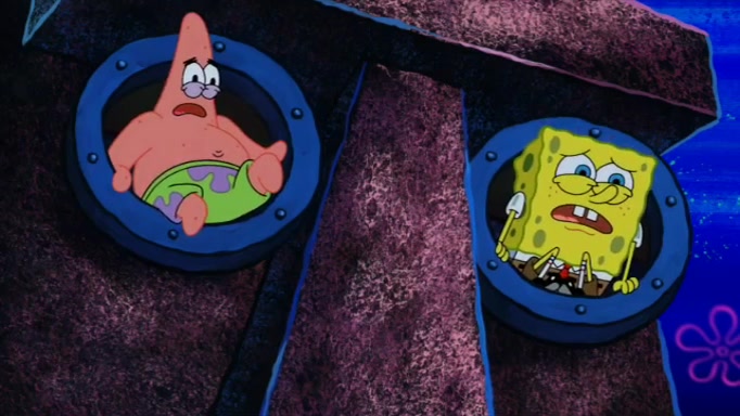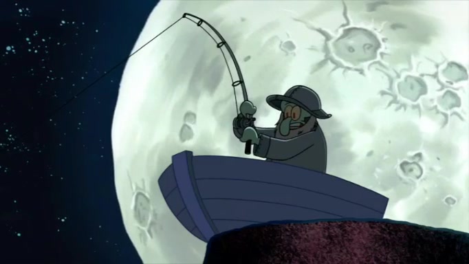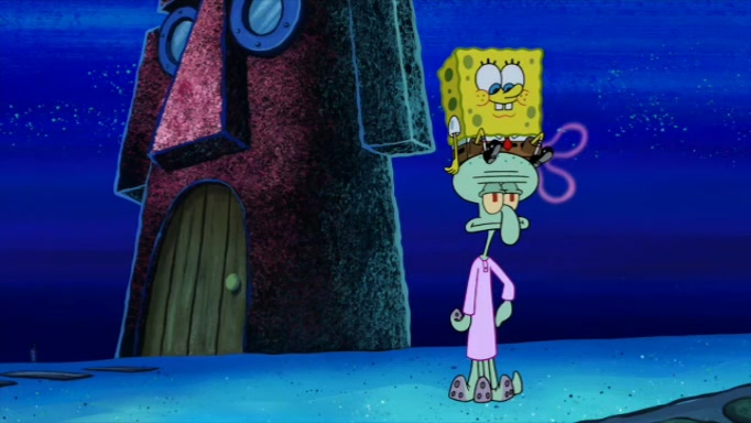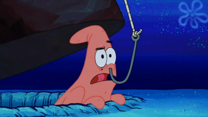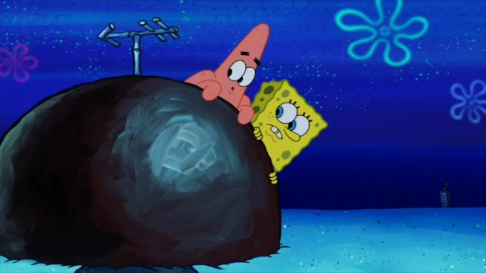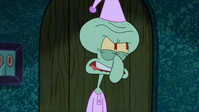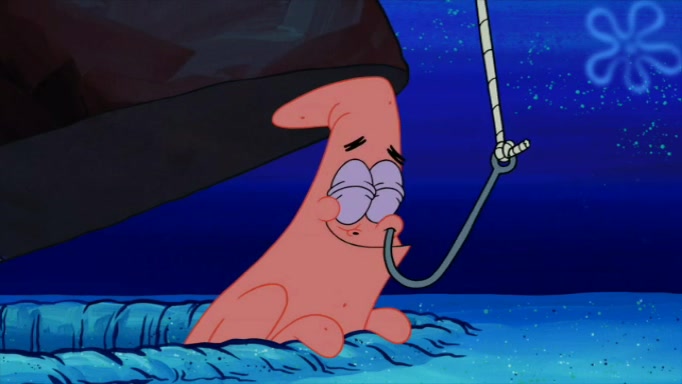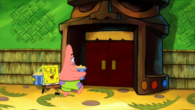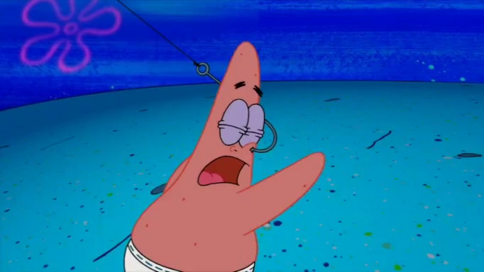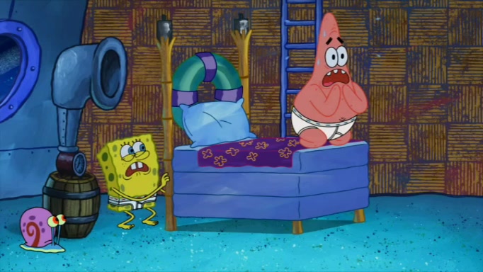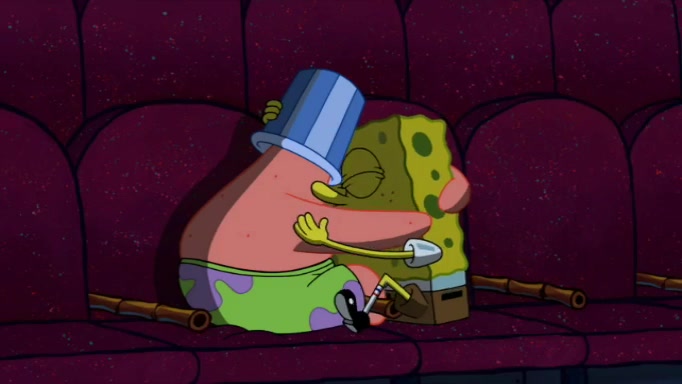 SpongeBob and Patrick are at the movie theater going to see Fisherman 4: Attack of the Hook. They meet Squidward who laughs saying they won't have any sleep after seeing the movie. They both claim they're grown-up men, but Squidward says "Boo" in monotone and scares them effortlessly.