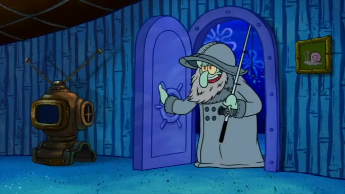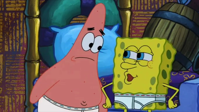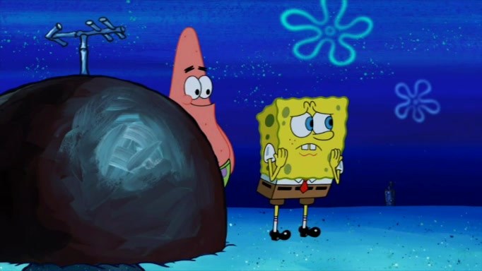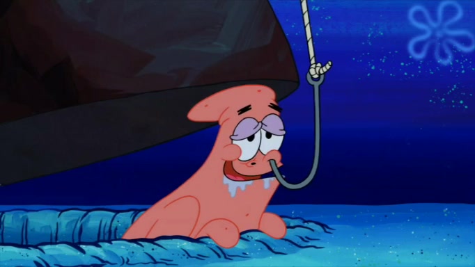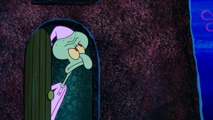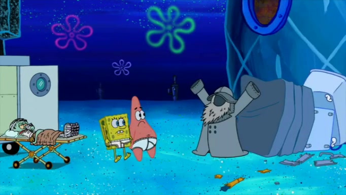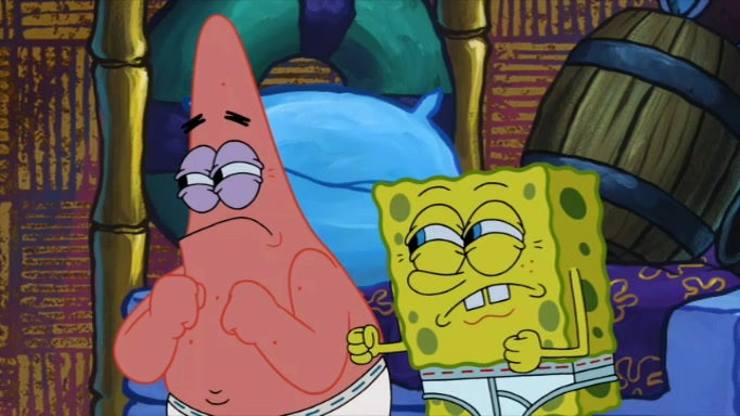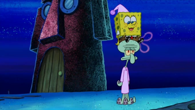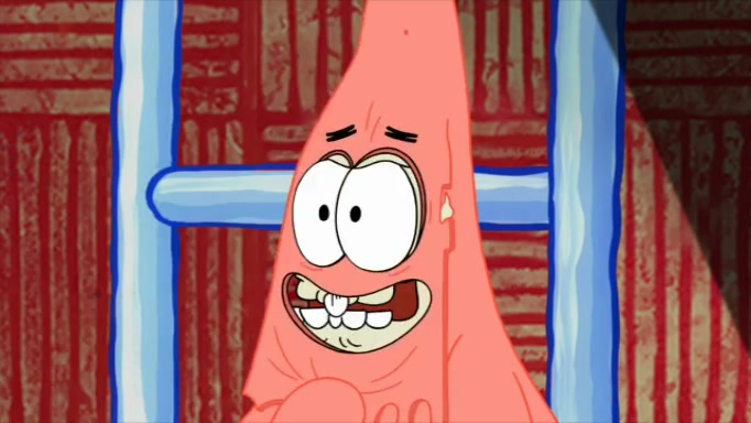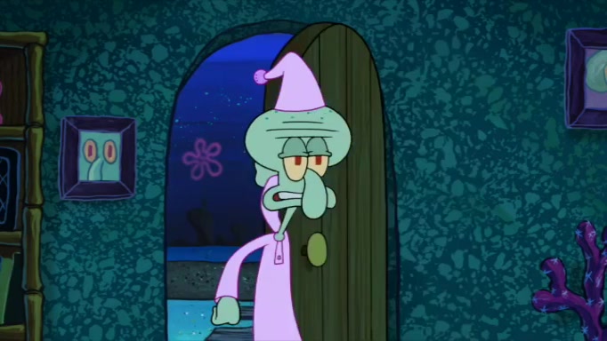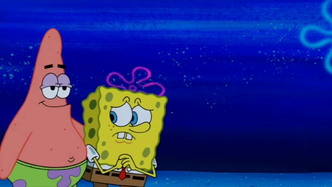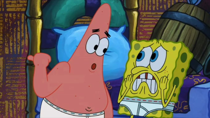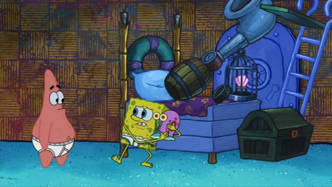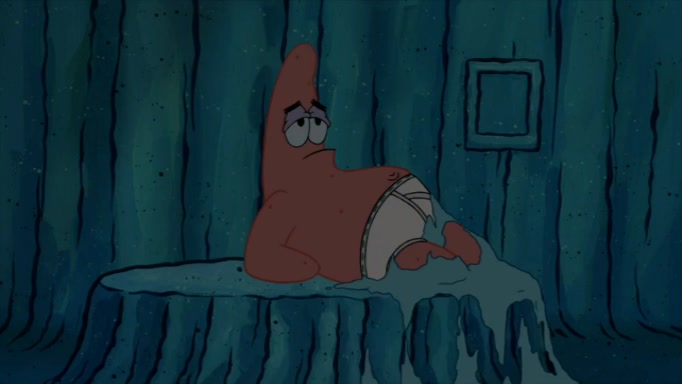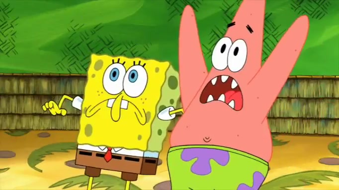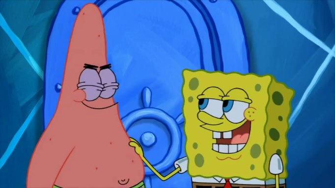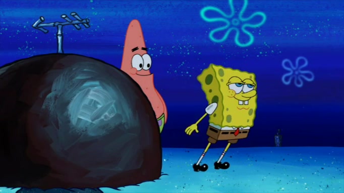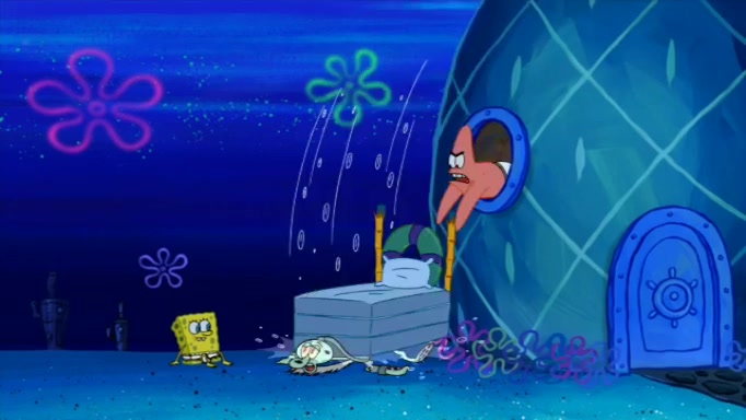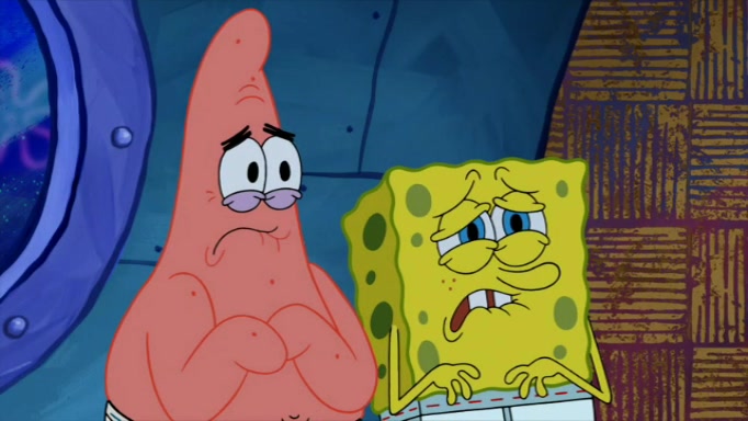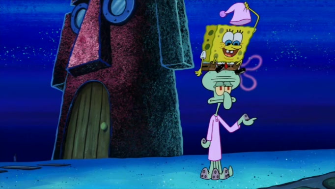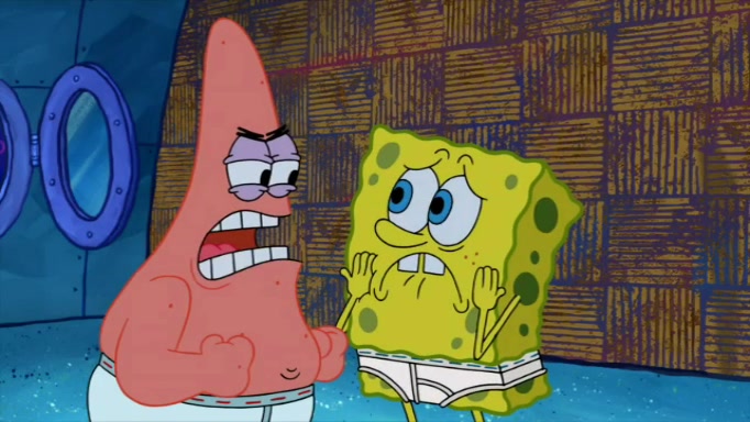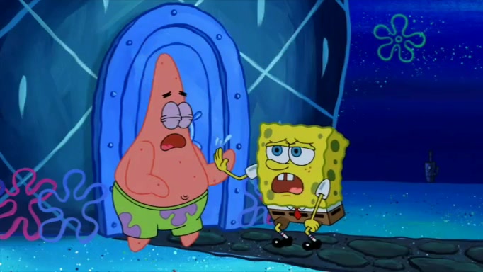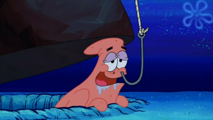 SpongeBob and Patrick are at the movie theater going to see Fisherman 4: Attack of the Hook. They meet Squidward who laughs saying they won't have any sleep after seeing the movie. They both claim they're grown-up men, but Squidward says "Boo" in monotone and scares them effortlessly.
