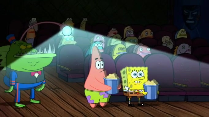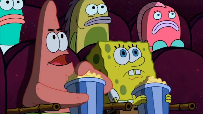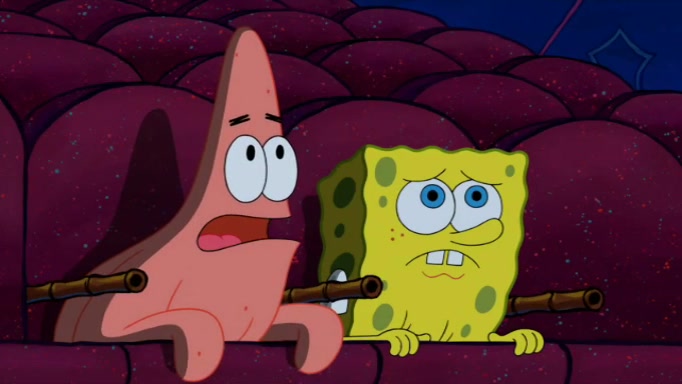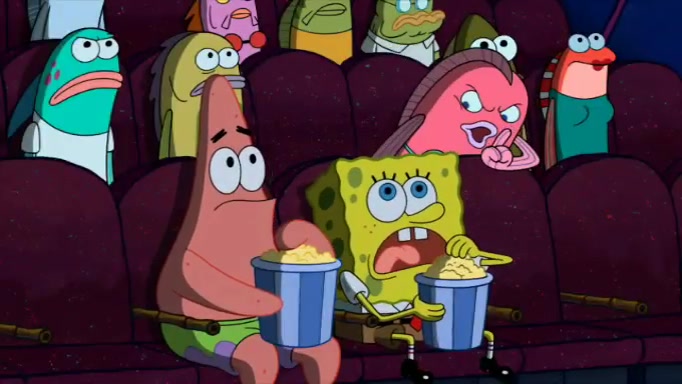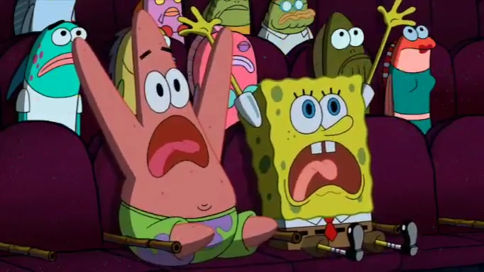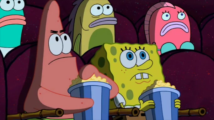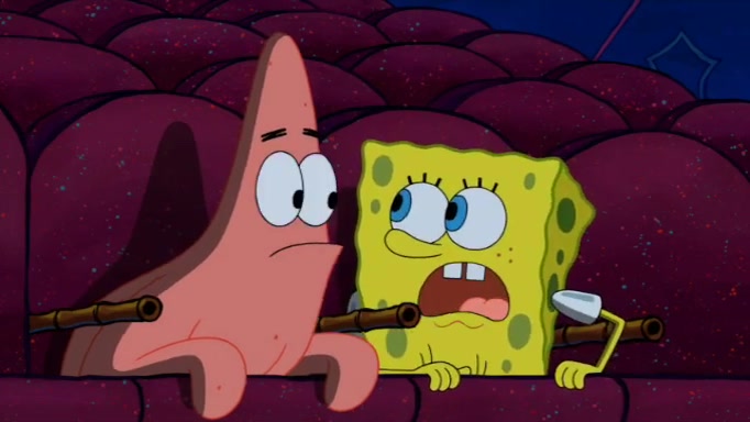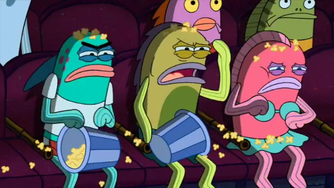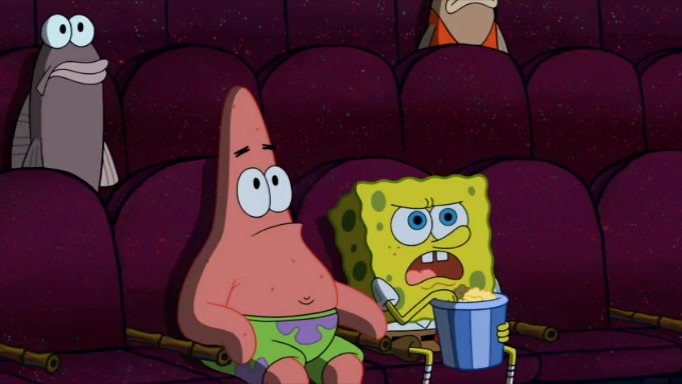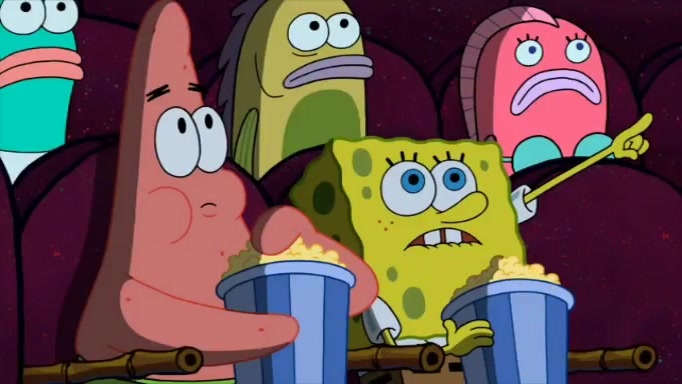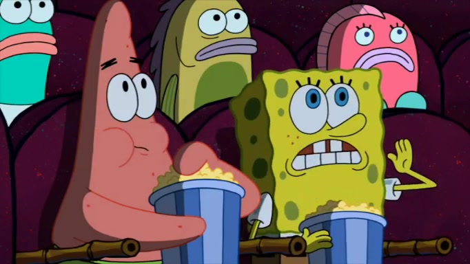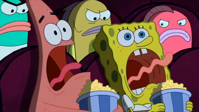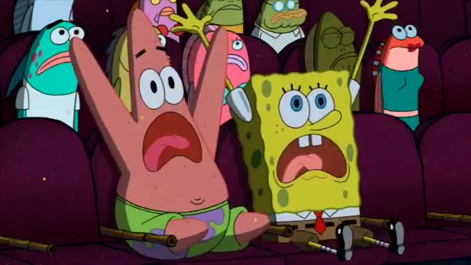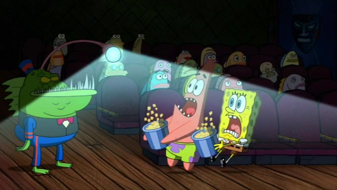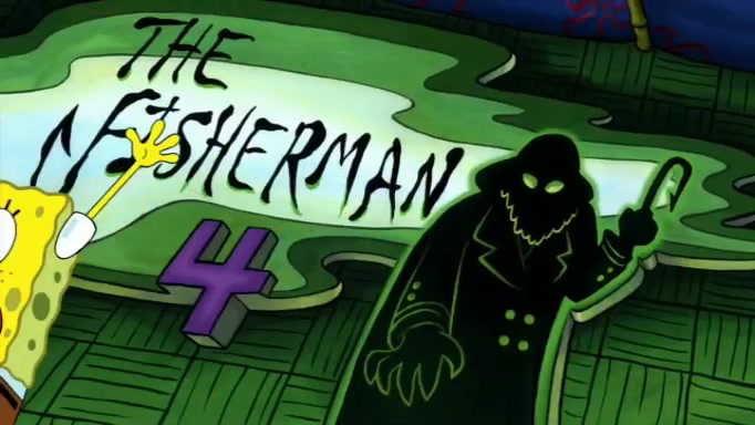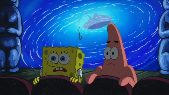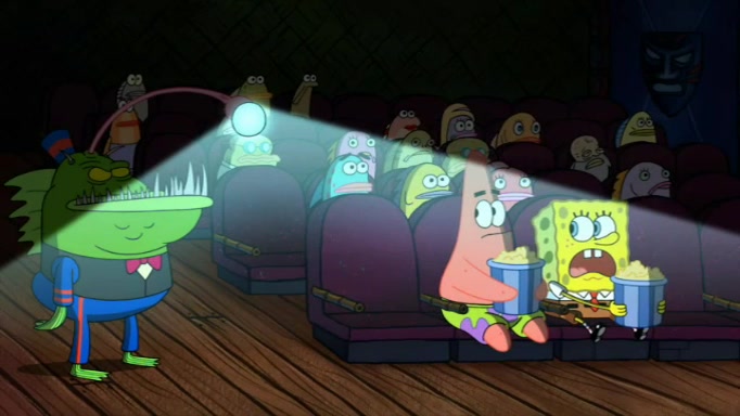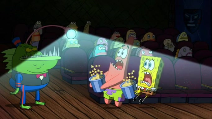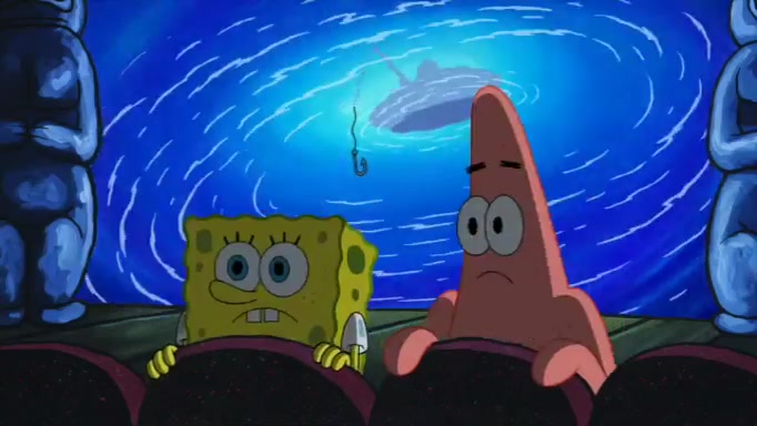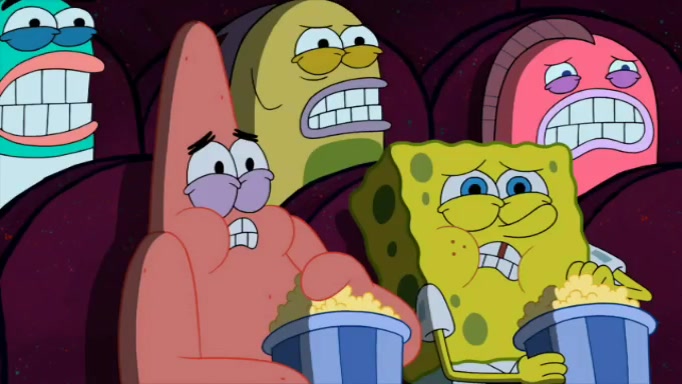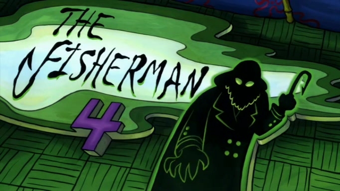 Then they decide that they'll show Squidward that they are not afraid of Fisherman 4: Attack of the Hook. They go and see the movie, and are instantly scared. They try not to look at the movie, but it is over when they open their eyes. They stay for the second showing to try to keep their eyes open, but they fail again. When they get out, they realize that it is midnight, the time when the Fisherman strikes.