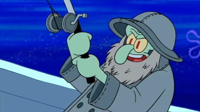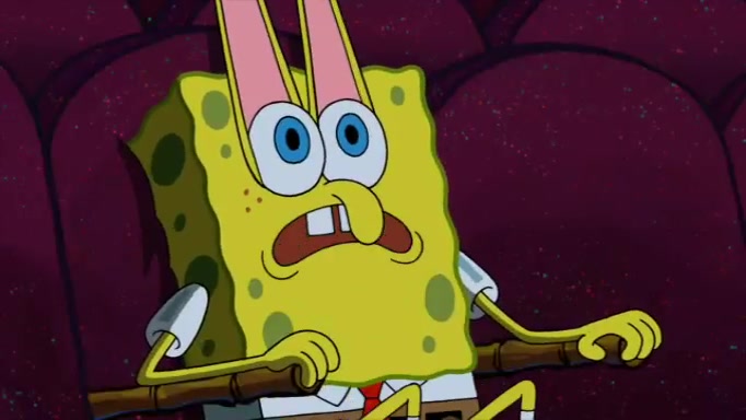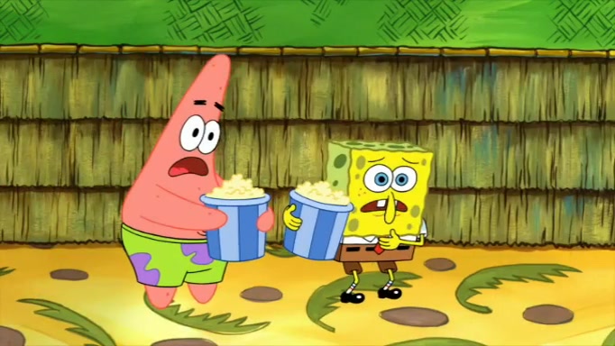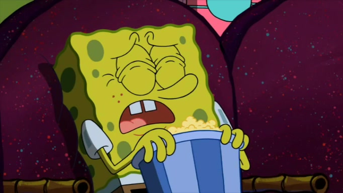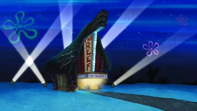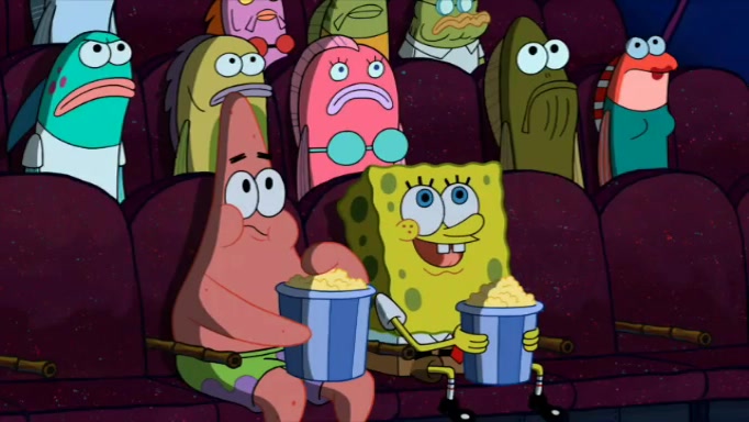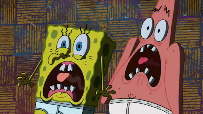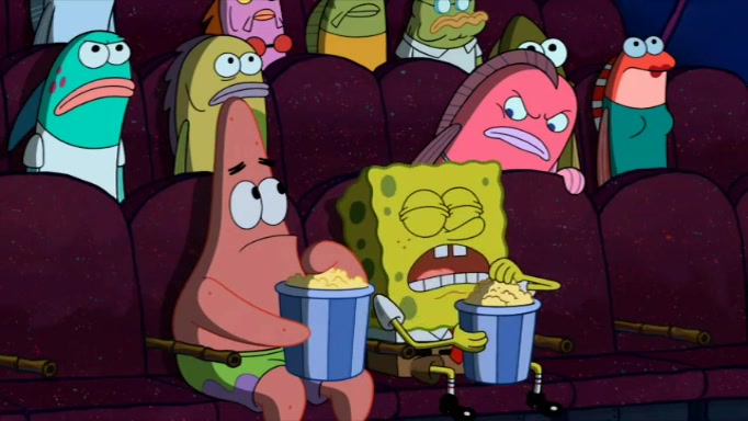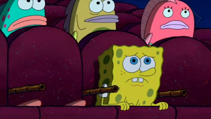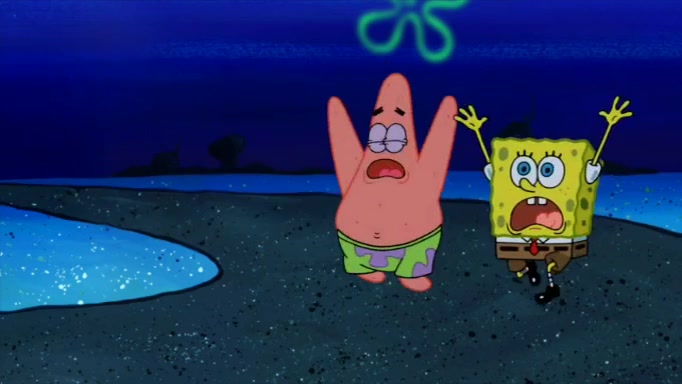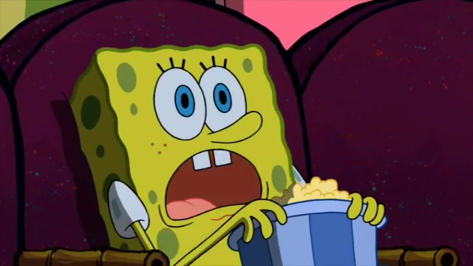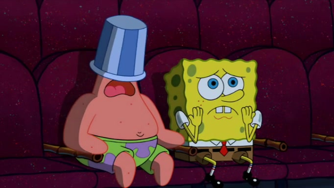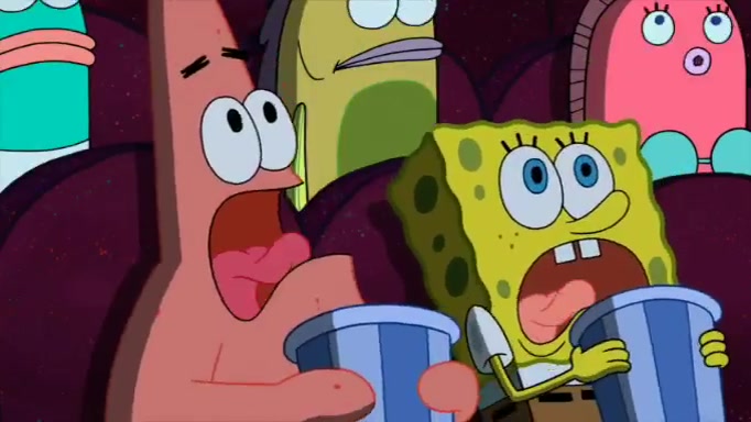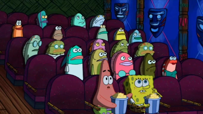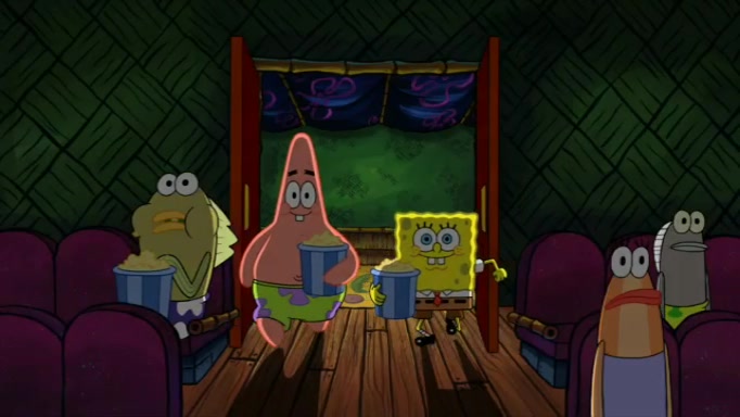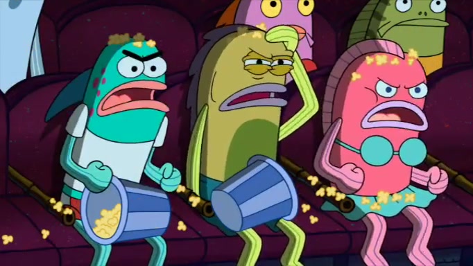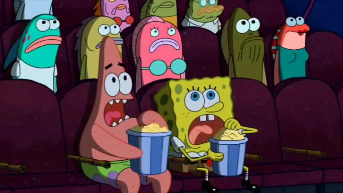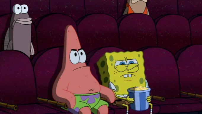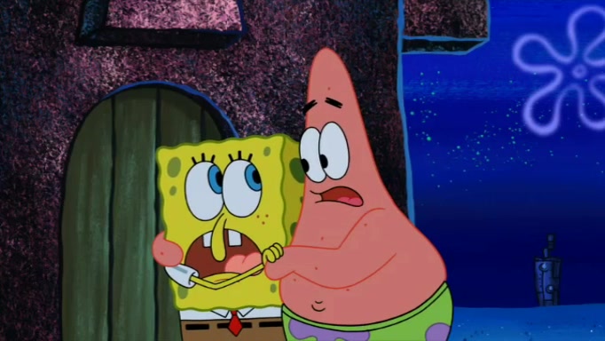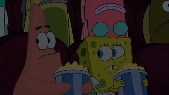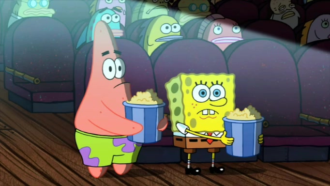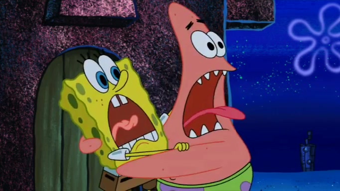 Then they decide that they'll show Squidward that they are not afraid of Fisherman 4: Attack of the Hook. They go and see the movie, and are instantly scared. They try not to look at the movie, but it is over when they open their eyes. They stay for the second showing to try to keep their eyes open, but they fail again. When they get out, they realize that it is midnight, the time when the Fisherman strikes.