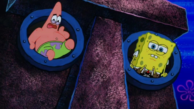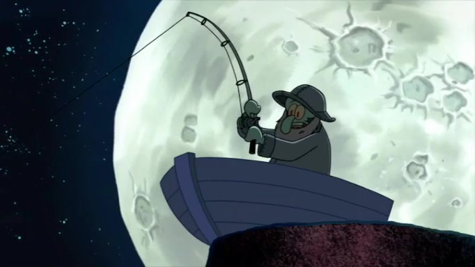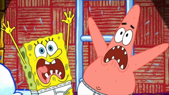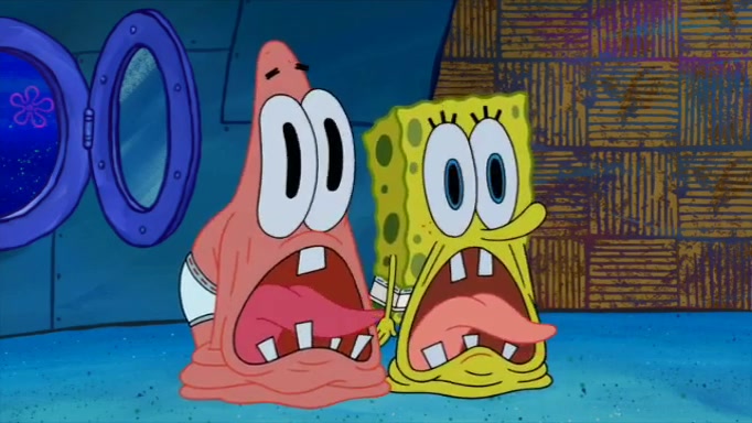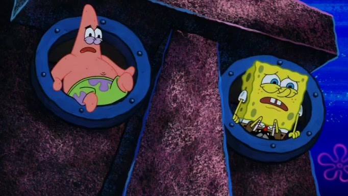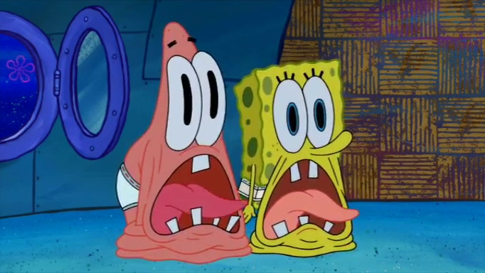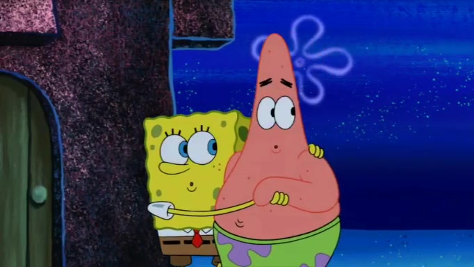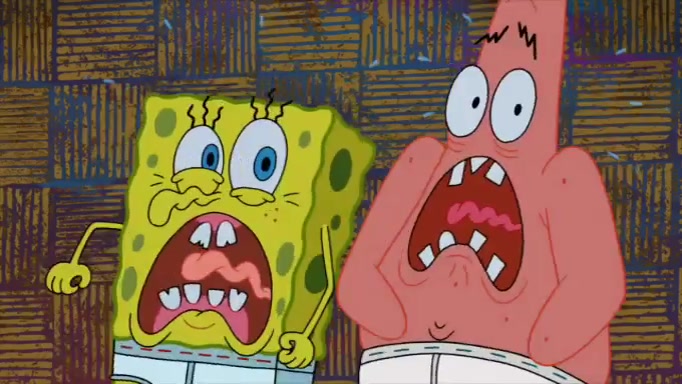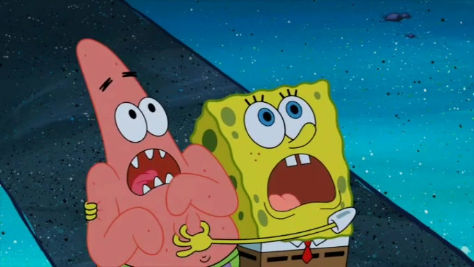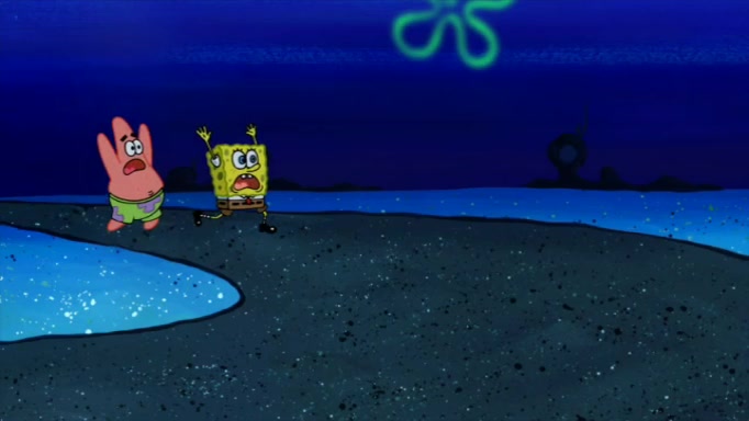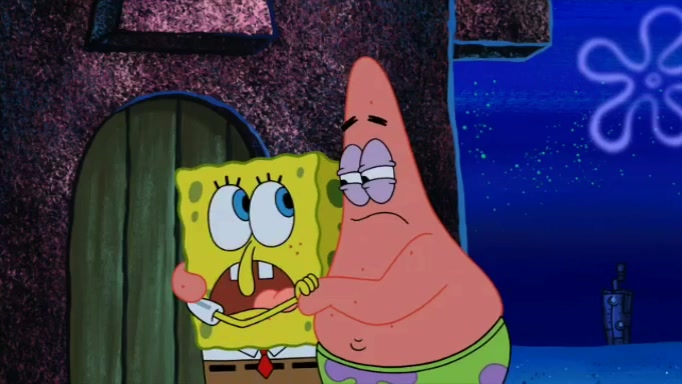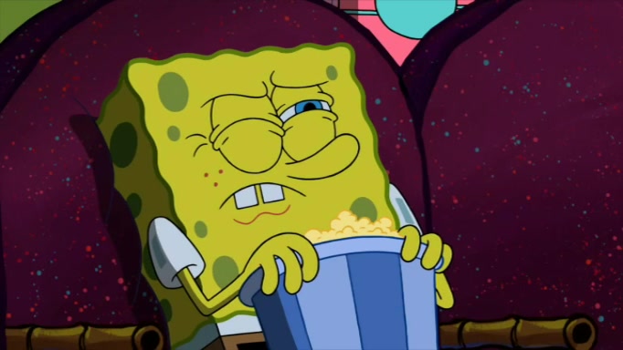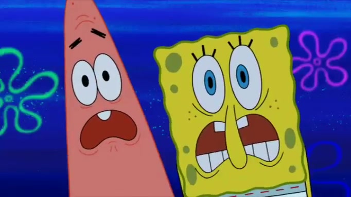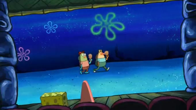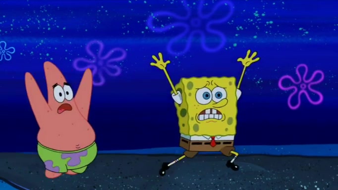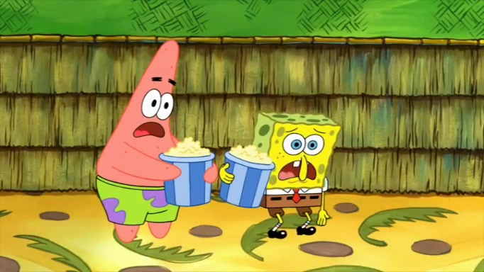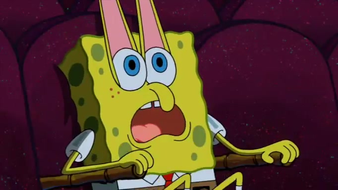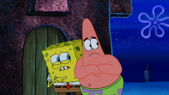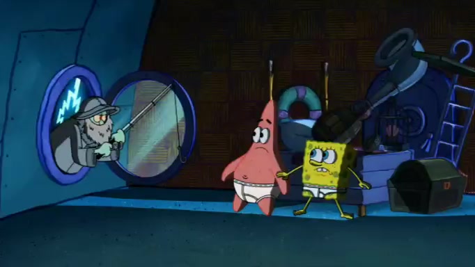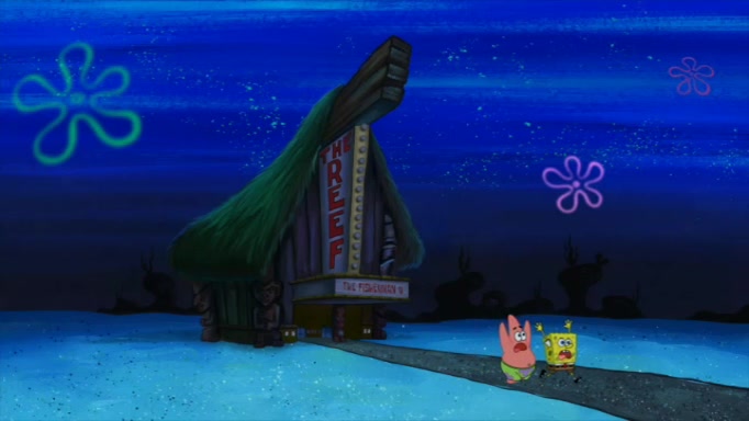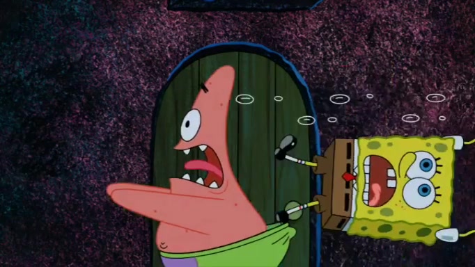 Then they decide that they'll show Squidward that they are not afraid of Fisherman 4: Attack of the Hook. They go and see the movie, and are instantly scared. They try not to look at the movie, but it is over when they open their eyes. They stay for the second showing to try to keep their eyes open, but they fail again. When they get out, they realize that it is midnight, the time when the Fisherman strikes.