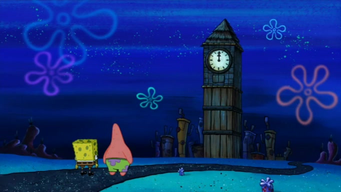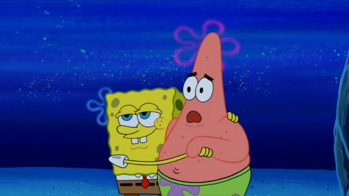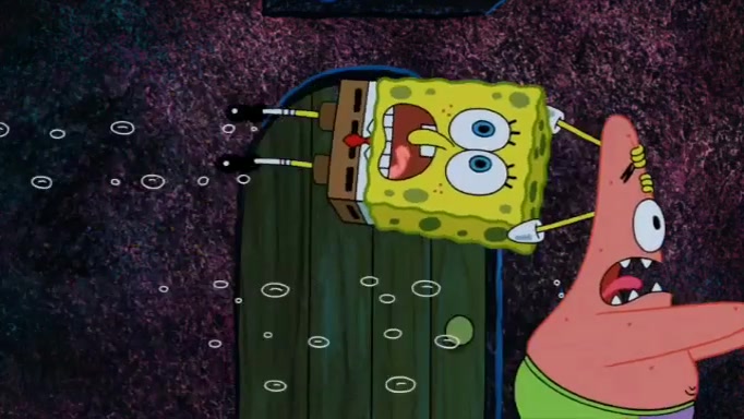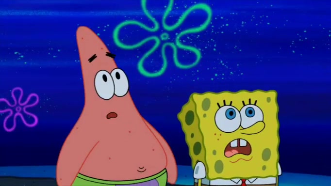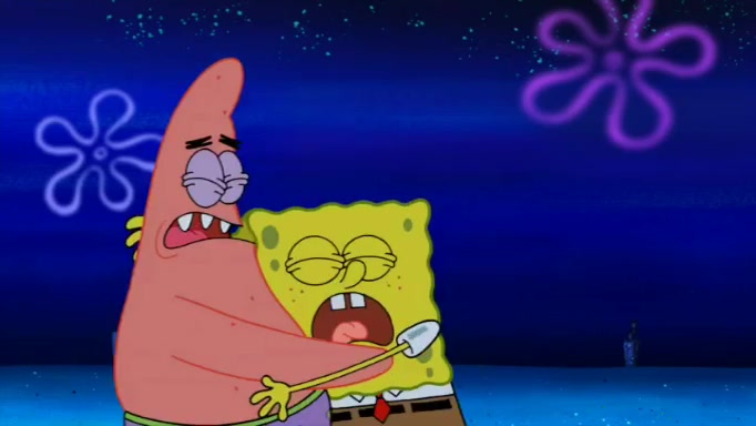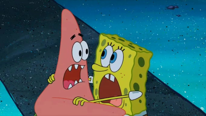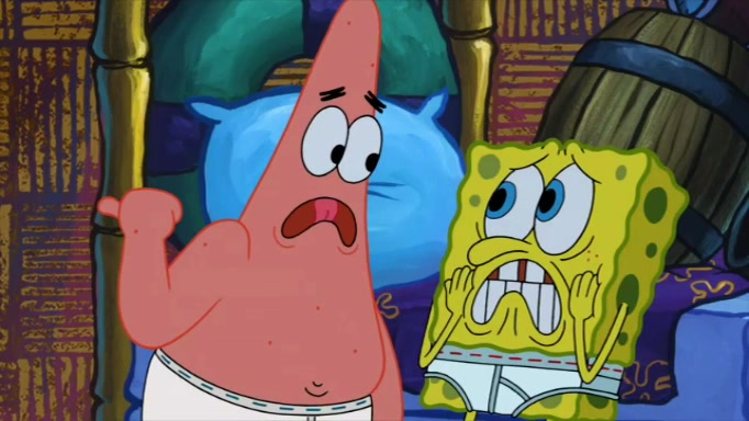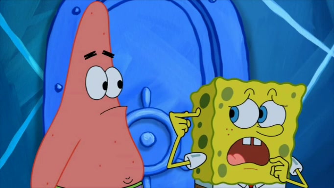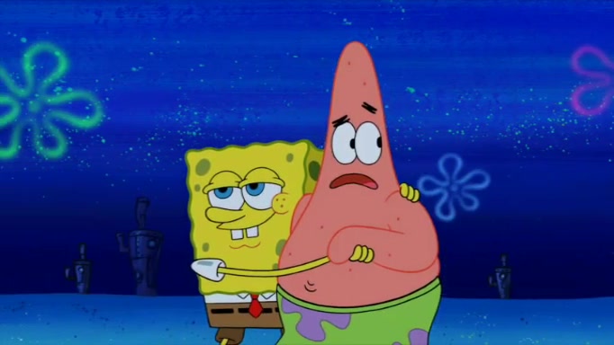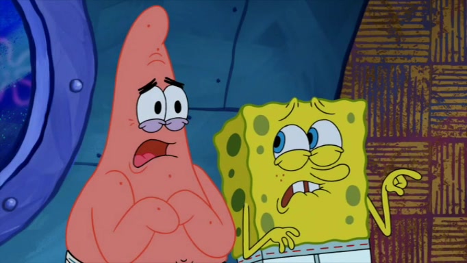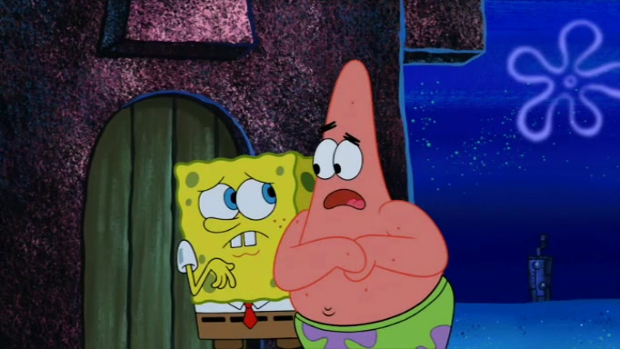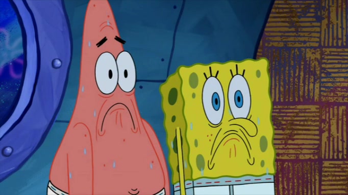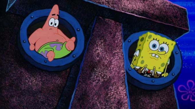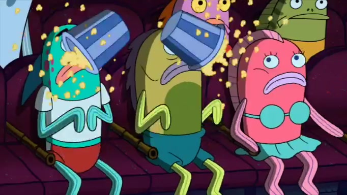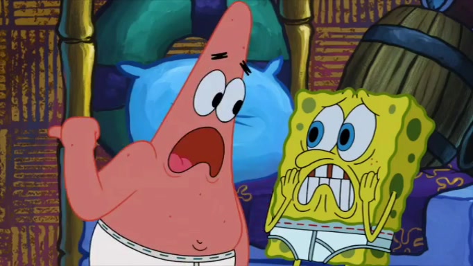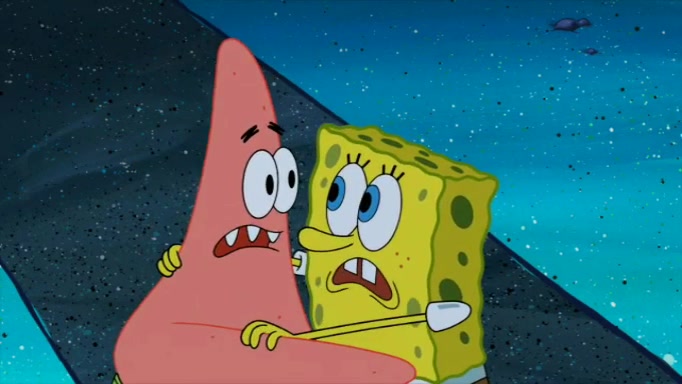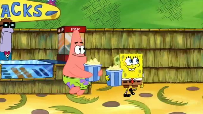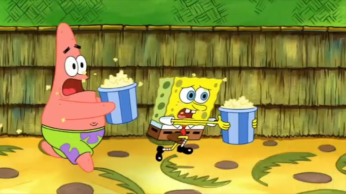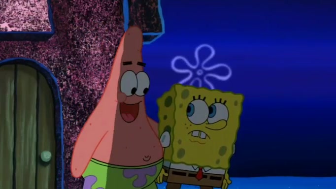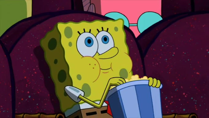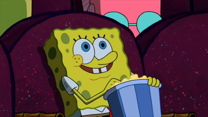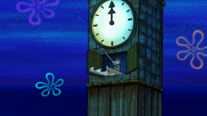 Then they decide that they'll show Squidward that they are not afraid of Fisherman 4: Attack of the Hook. They go and see the movie, and are instantly scared. They try not to look at the movie, but it is over when they open their eyes. They stay for the second showing to try to keep their eyes open, but they fail again. When they get out, they realize that it is midnight, the time when the Fisherman strikes.