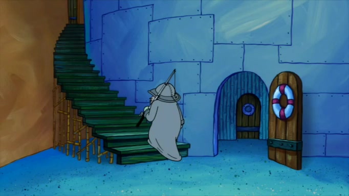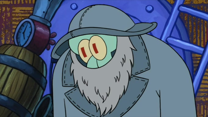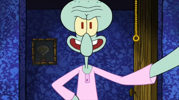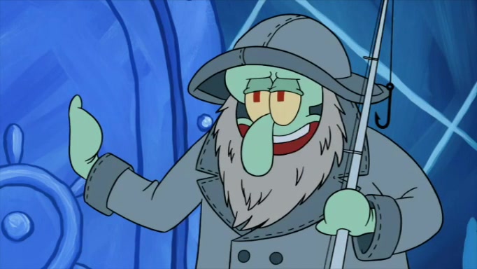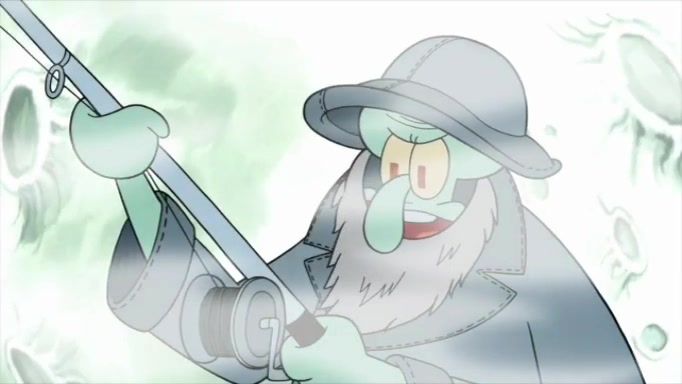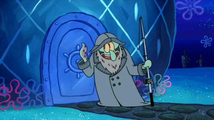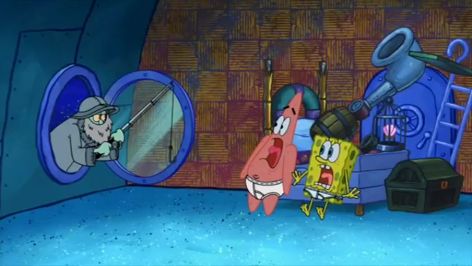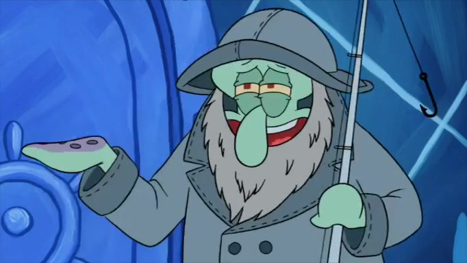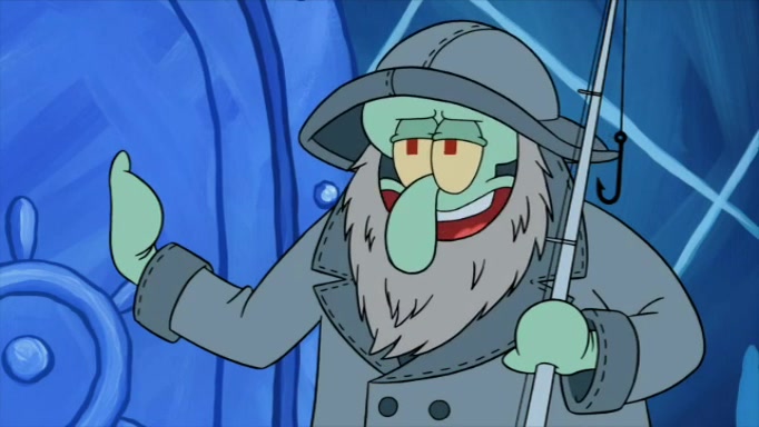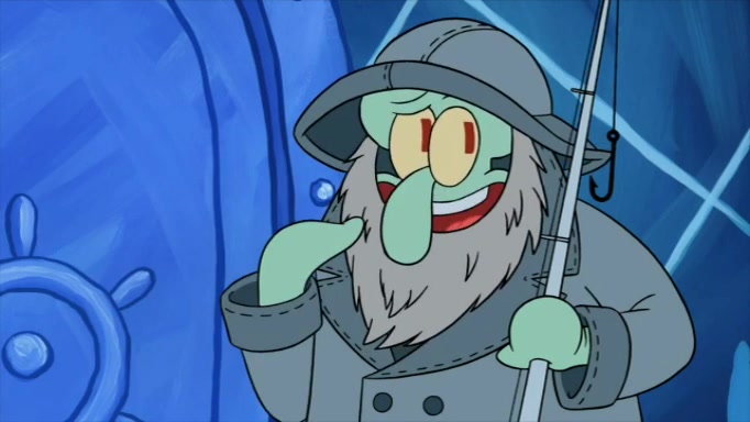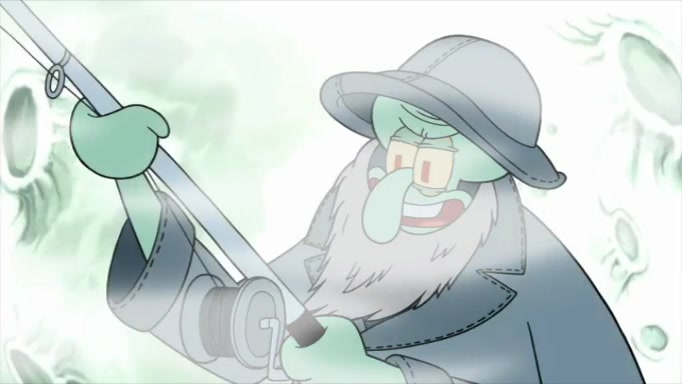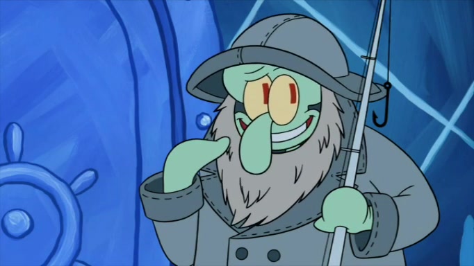 They quickly run home, and repeatedly mistake the Fisherman for shadows of harmless beings. They become so frightened that they are too scared to walk to their houses by themselves. Each of them take turns walking the other home, but they are scared by a harmless noise and they wake Squidward up. Squidward gets annoyed by this, so he carries them to their houses. Even after they get home, they yell back and forth between their houses, which annoys Squidward even more. Squidward then decides to disguise as The Fisherman to scare SpongeBob and Patrick. He goes on top of his house(dressed like the Fisherman) and hooks Patrick's nose up, who runs screaming into SpongeBob's house while getting his face ripped off by the hook. Patrick runs into SpongeBob's bedroom and scares him because of his ripped out face. He tells SpongeBob about the Fisherman (who is really Squidward), and they become even more scared.