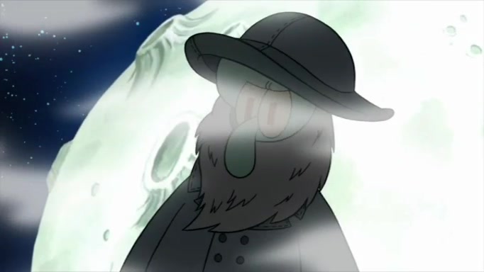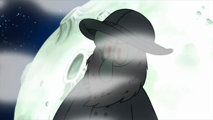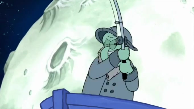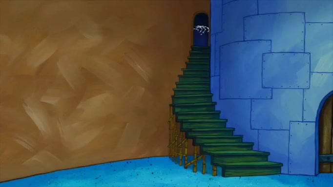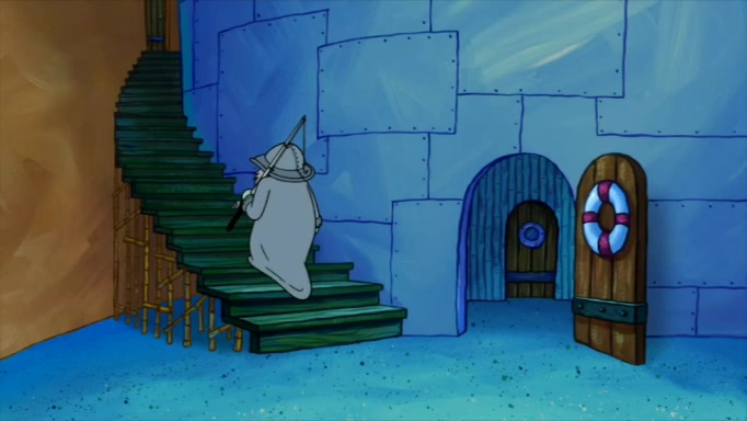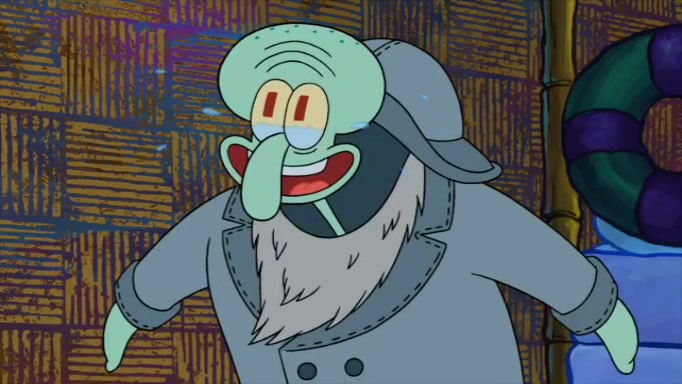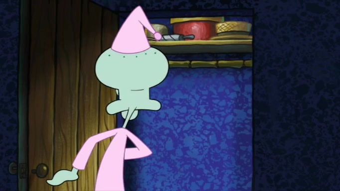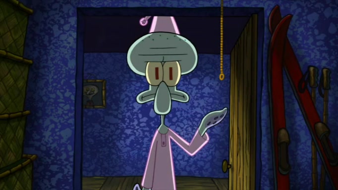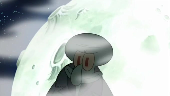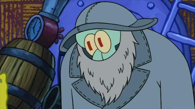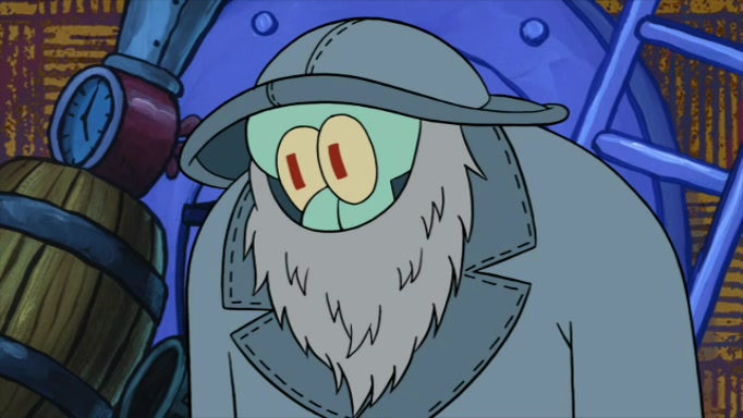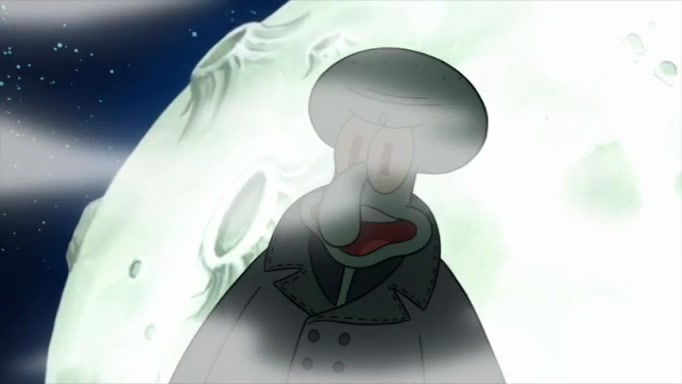 They quickly run home, and repeatedly mistake the Fisherman for shadows of harmless beings. They become so frightened that they are too scared to walk to their houses by themselves. Each of them take turns walking the other home, but they are scared by a harmless noise and they wake Squidward up. Squidward gets annoyed by this, so he carries them to their houses. Even after they get home, they yell back and forth between their houses, which annoys Squidward even more. Squidward then decides to disguise as The Fisherman to scare SpongeBob and Patrick. He goes on top of his house(dressed like the Fisherman) and hooks Patrick's nose up, who runs screaming into SpongeBob's house while getting his face ripped off by the hook. Patrick runs into SpongeBob's bedroom and scares him because of his ripped out face. He tells SpongeBob about the Fisherman (who is really Squidward), and they become even more scared.