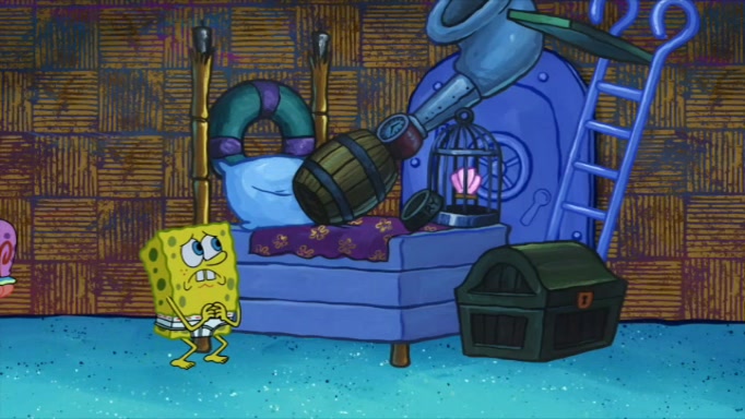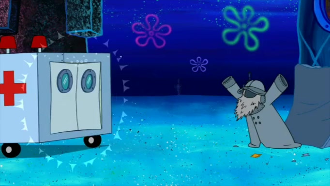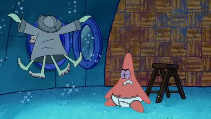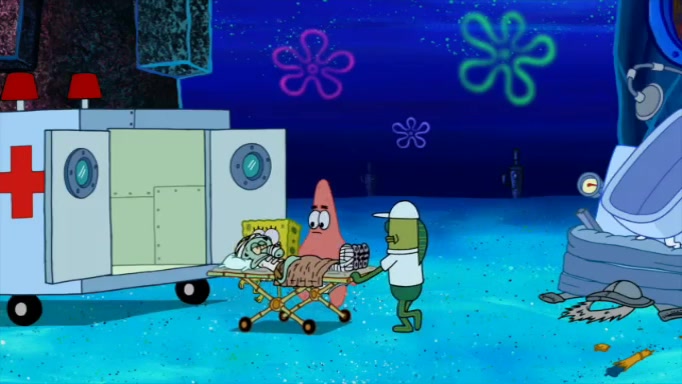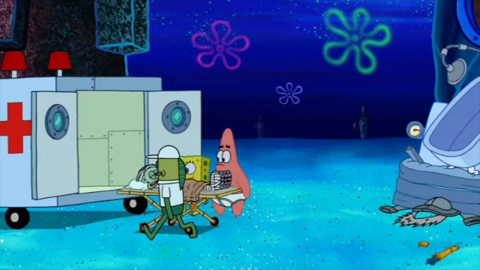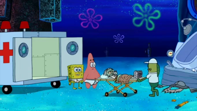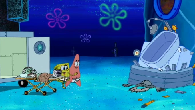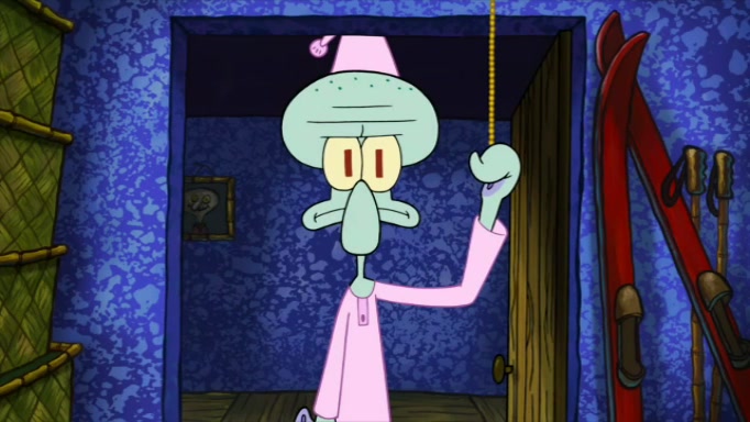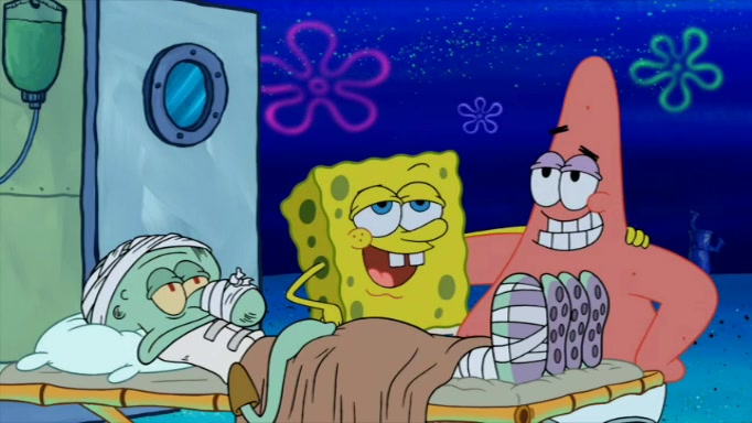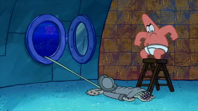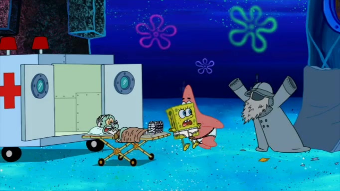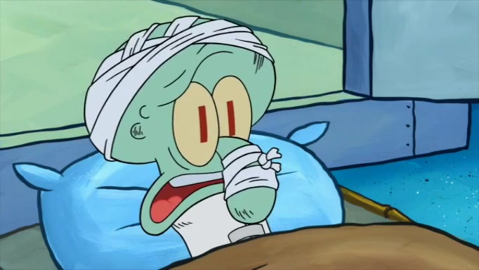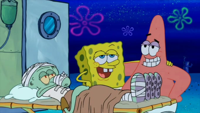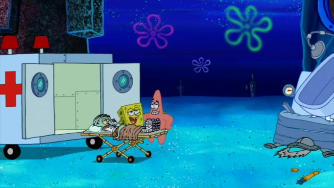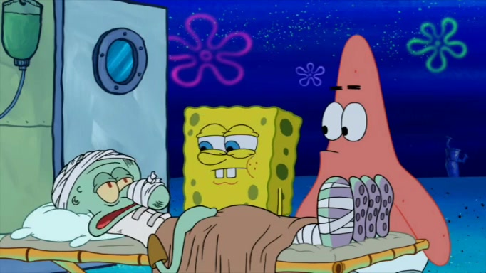 They board up the door to SpongeBob's bedroom, but Squidward enters through the window anyway. SpongeBob and Patrick are scared out of their wits, and exchange each other's underwear so they don't die in their own. While SpongeBob and Patrick are screaming, Squidward's head comes out of his disguise, while laughing, which SpongeBob and Patrick mistake as the Fisherman eating Squidward. They attack Squidward, attempting to save him. They throw him out of the window and Patrick then flings heavy objects on Squidward, leaving him in a coma. An ambulance comes to get Squidward, who is badly injured while SpongeBob and Patrick are glad now that they don't have to worry about the Fisherman anymore.