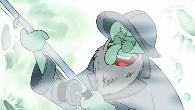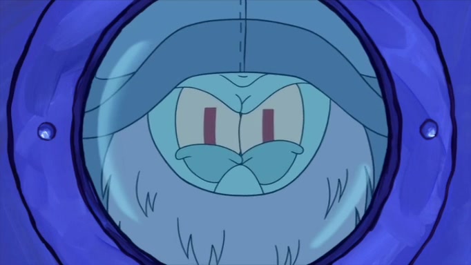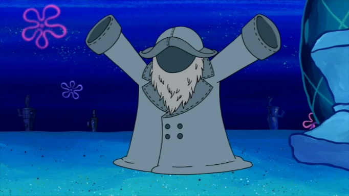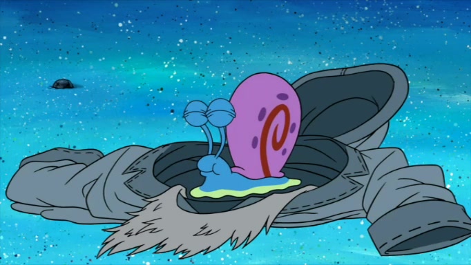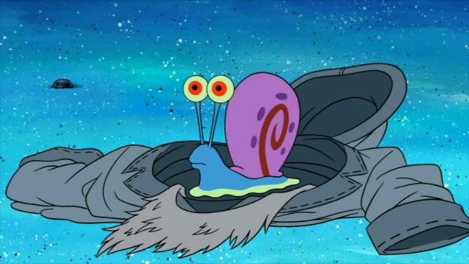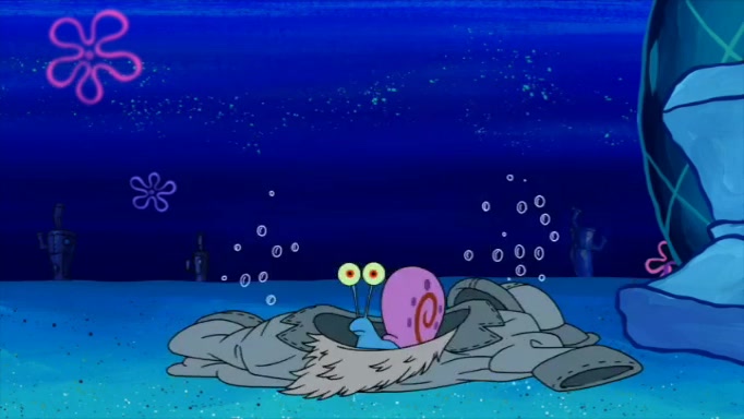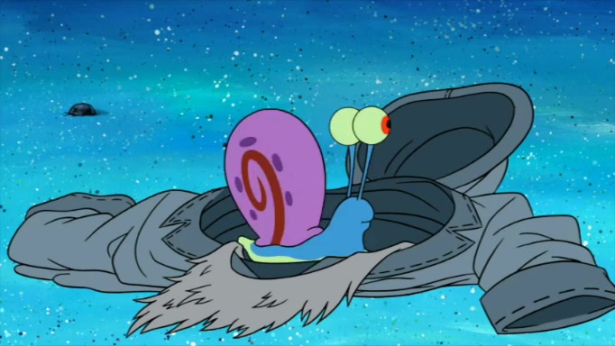 Then the Fisherman costume rises up and roars, this time without Squidward. SpongeBob, Patrick and Squidward get scared out of their minds and go in the ambulance with Squidward, only for The Fisherman costume to fall, revealing Gary. The episodes ends with Gary meowing in the Fisherman costume and spinning around inside it and then purring.