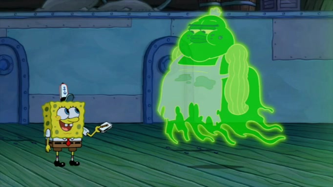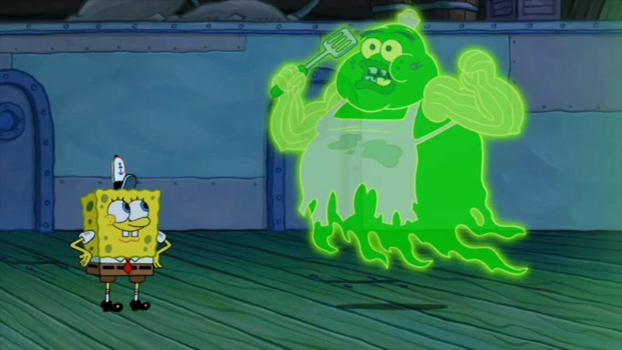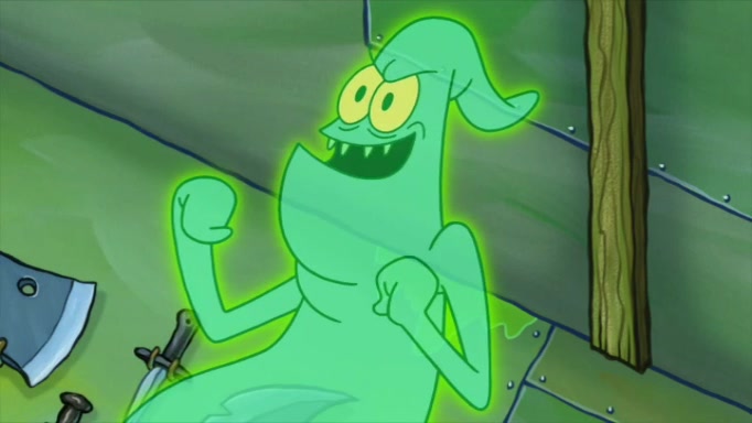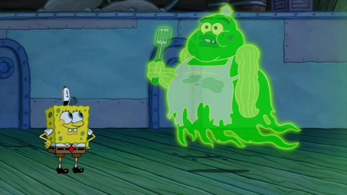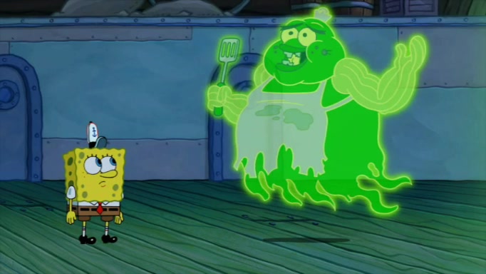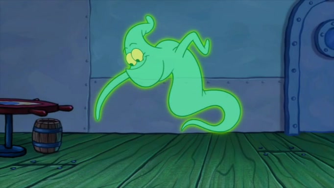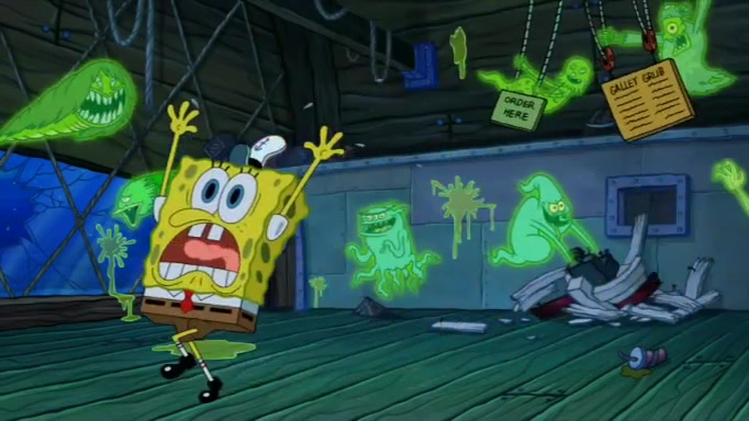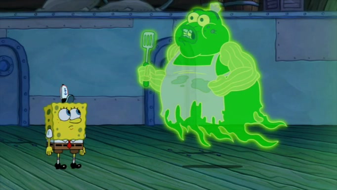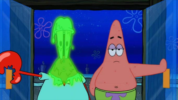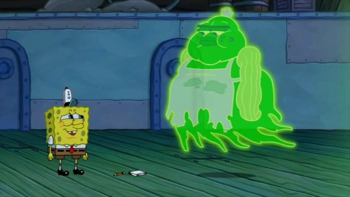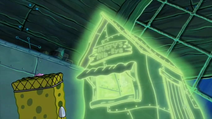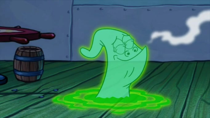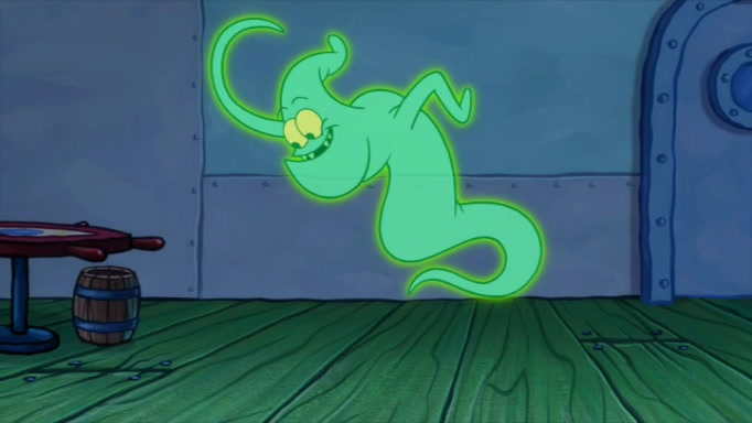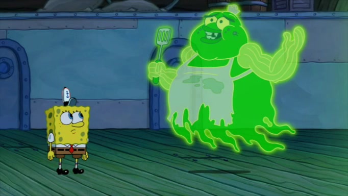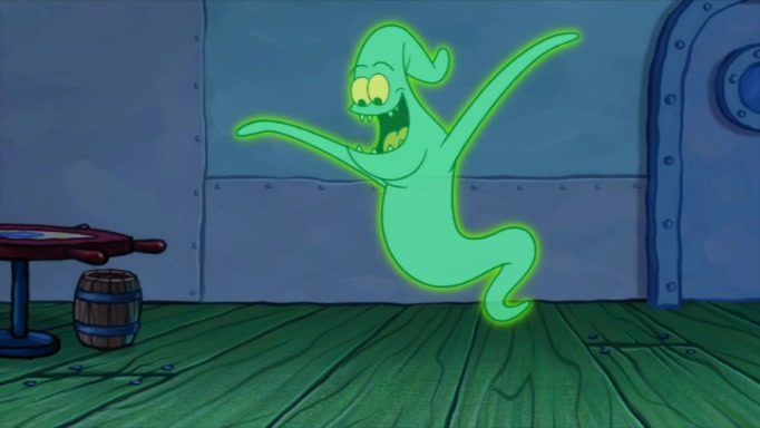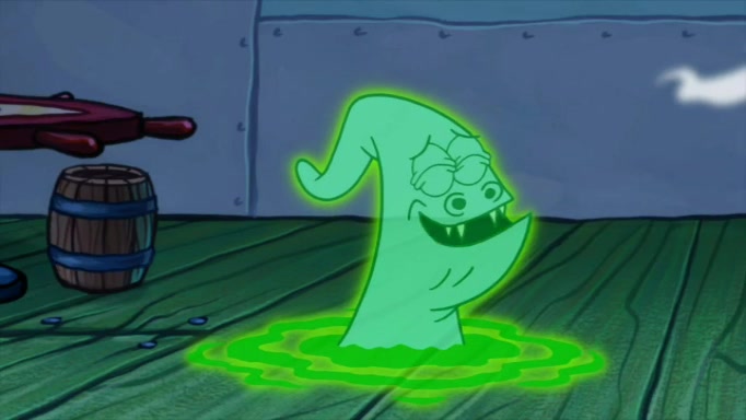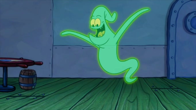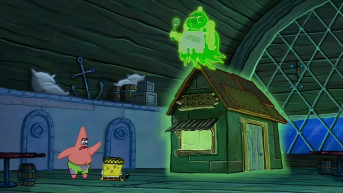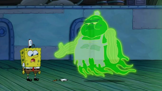 So, later that night, SpongeBob calls Patrick over to the Krusty Krab. Mr. Krabs tells them not to eat any furniture which upsets Patrick and causes him to ask SpongeBob why he called him there. SpongeBob replies by saying that they are going to perform a seance at the Krusty Krab. After SpongeBob reads the ingredients of a mustard container and summons the spirit of Rusty's Rib Eye, the ghost soon appears. Patrick runs to get Mr. Krabs after being scared by the "big ghost."