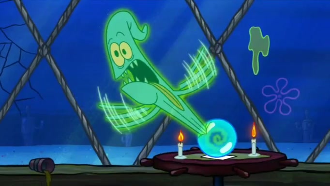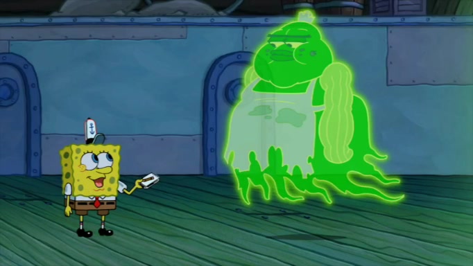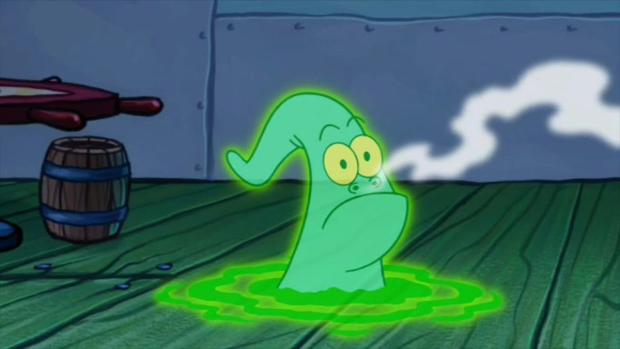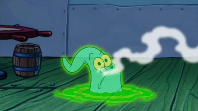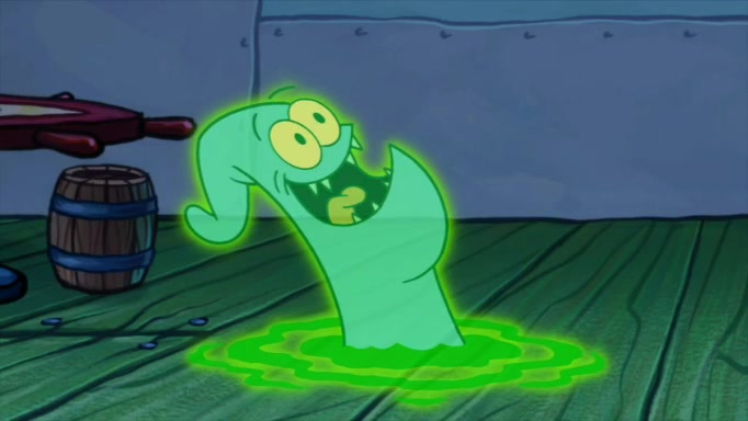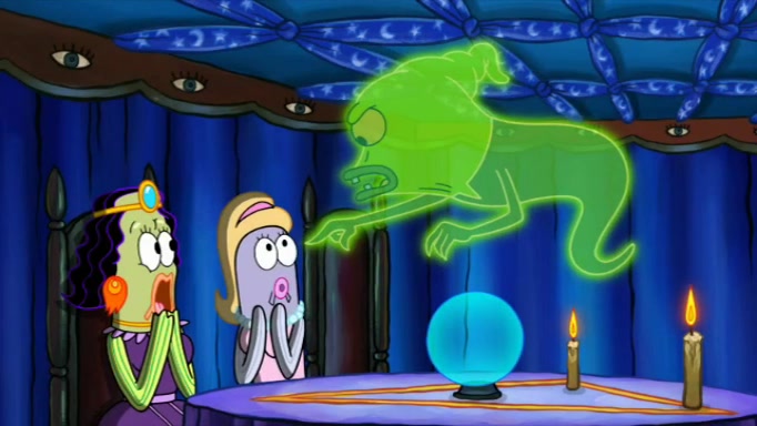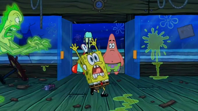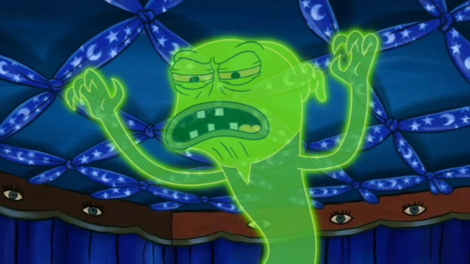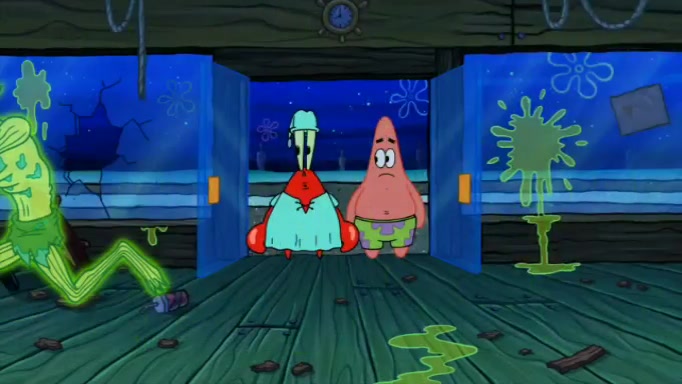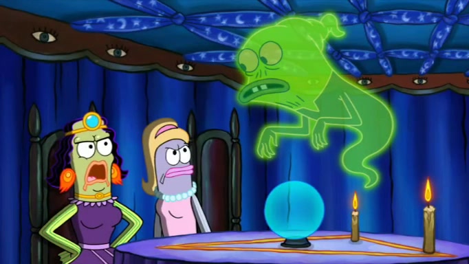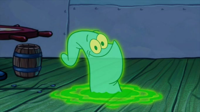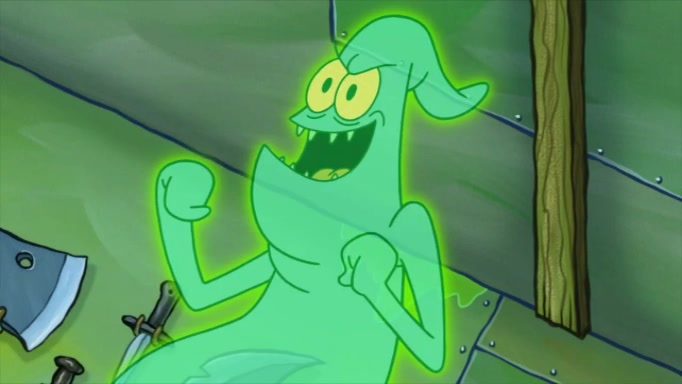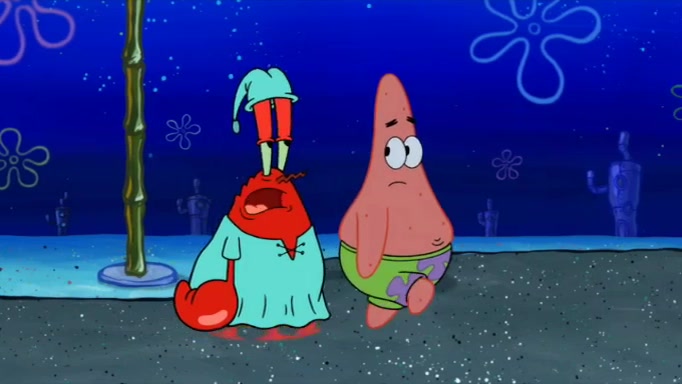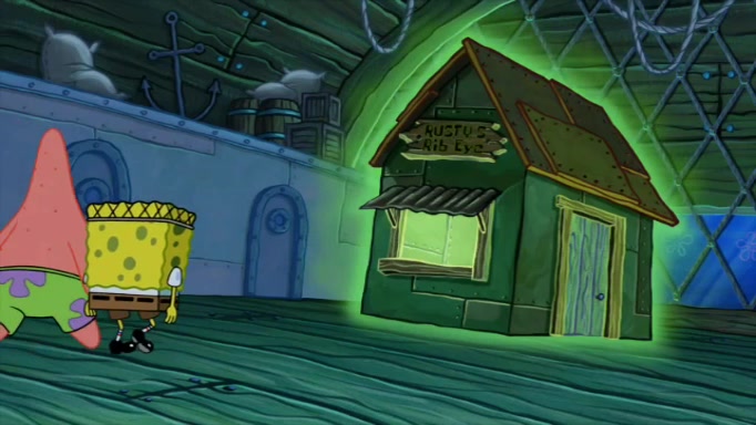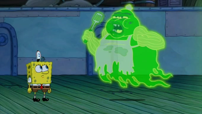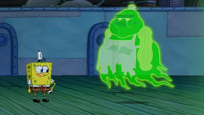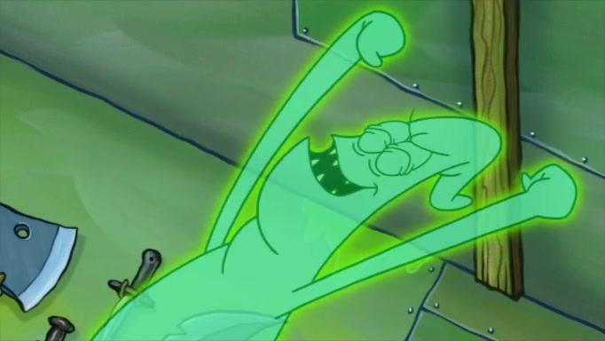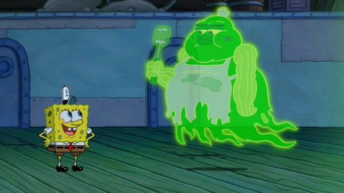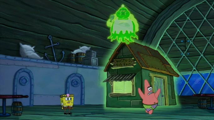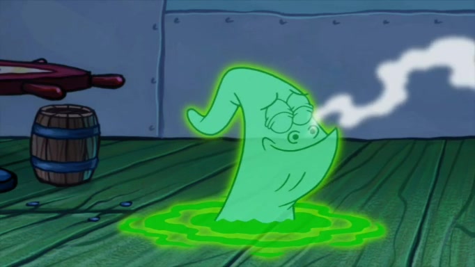 So, later that night, SpongeBob calls Patrick over to the Krusty Krab. Mr. Krabs tells them not to eat any furniture which upsets Patrick and causes him to ask SpongeBob why he called him there. SpongeBob replies by saying that they are going to perform a seance at the Krusty Krab. After SpongeBob reads the ingredients of a mustard container and summons the spirit of Rusty's Rib Eye, the ghost soon appears. Patrick runs to get Mr. Krabs after being scared by the "big ghost."