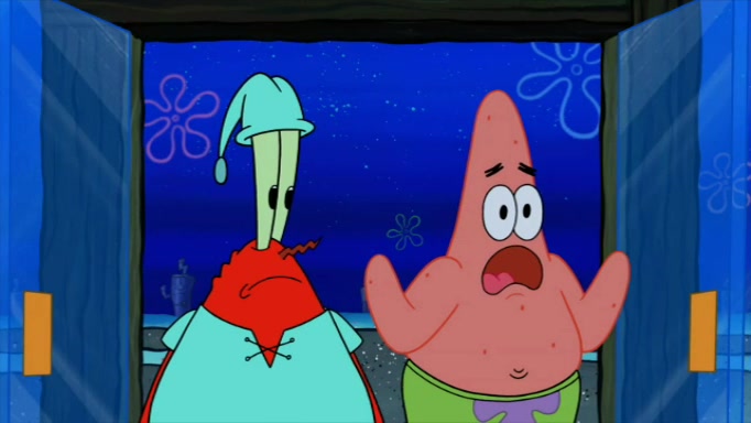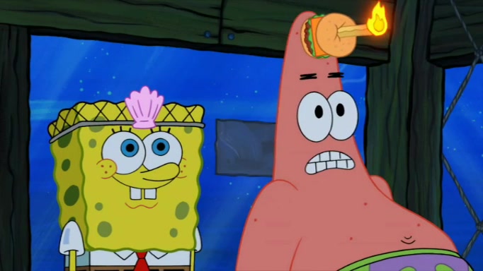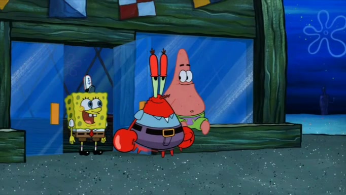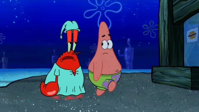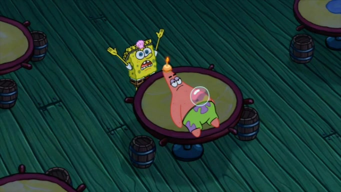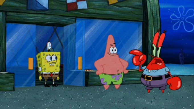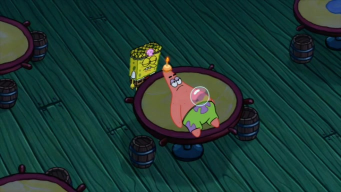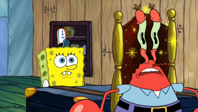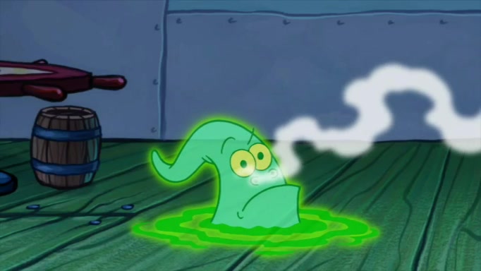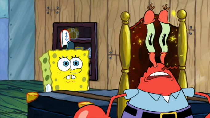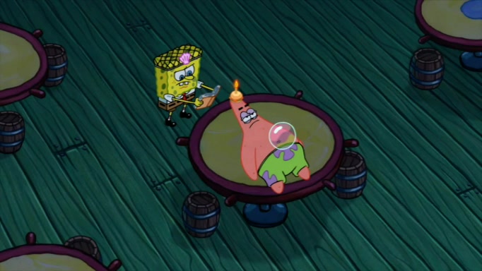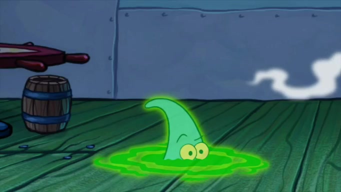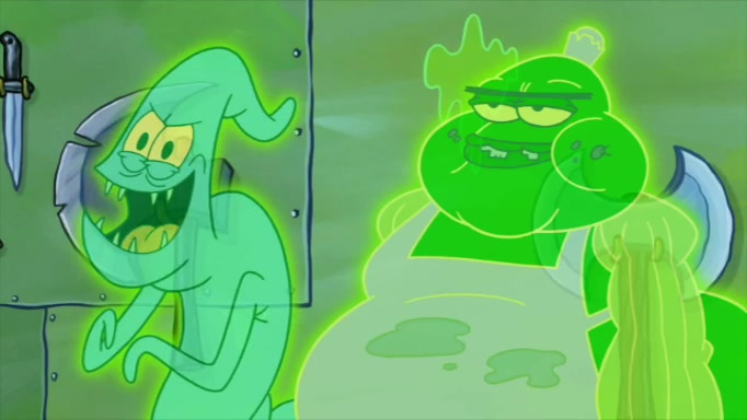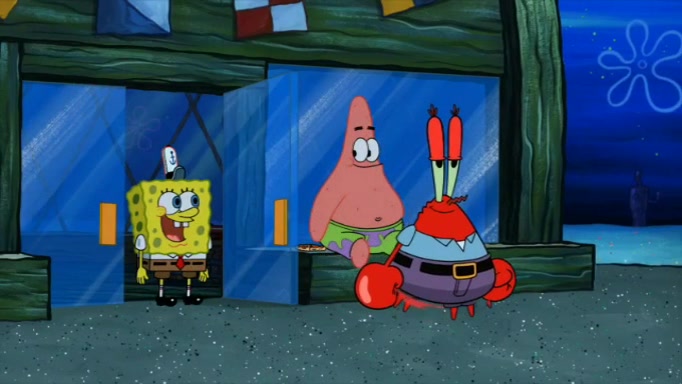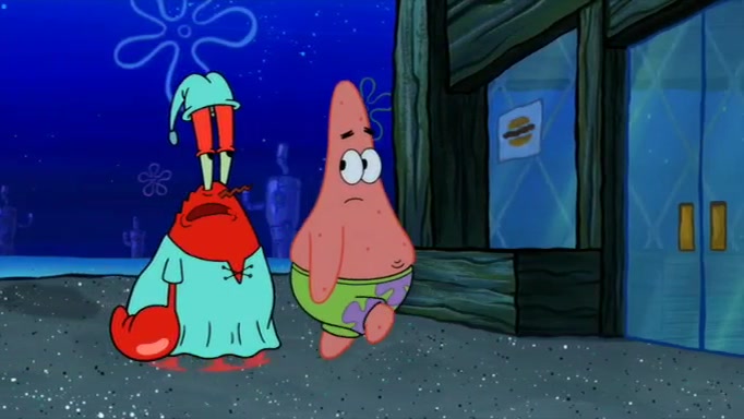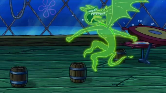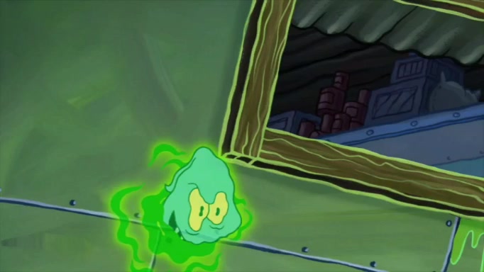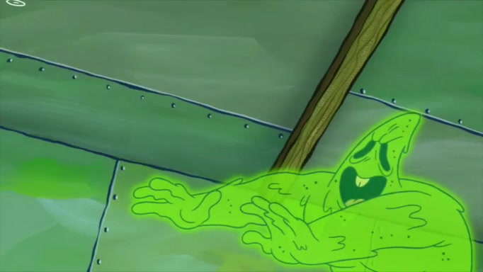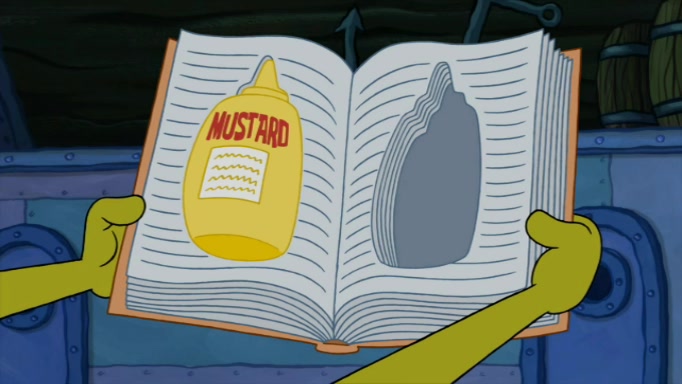 So, later that night, SpongeBob calls Patrick over to the Krusty Krab. Mr. Krabs tells them not to eat any furniture which upsets Patrick and causes him to ask SpongeBob why he called him there. SpongeBob replies by saying that they are going to perform a seance at the Krusty Krab. After SpongeBob reads the ingredients of a mustard container and summons the spirit of Rusty's Rib Eye, the ghost soon appears. Patrick runs to get Mr. Krabs after being scared by the "big ghost."
