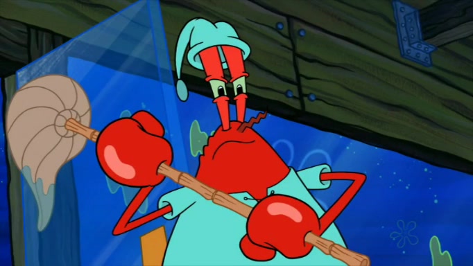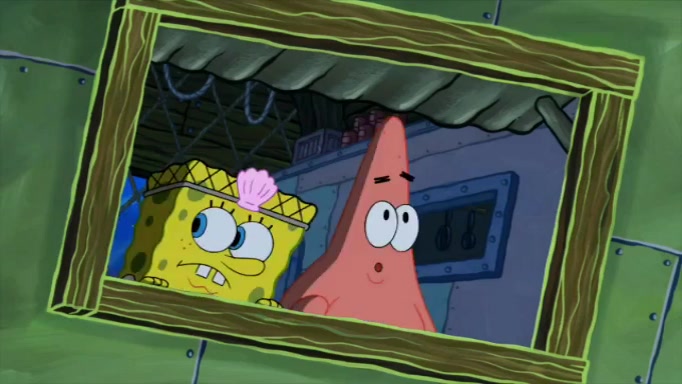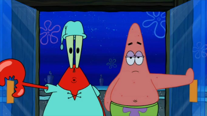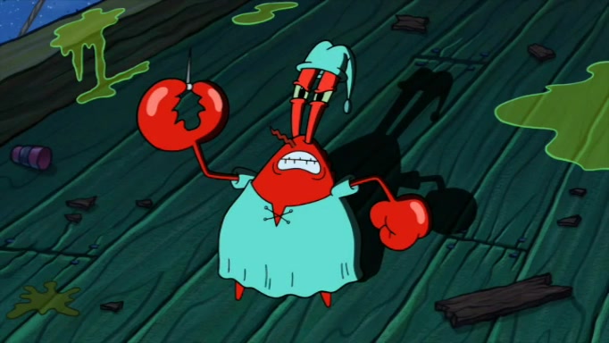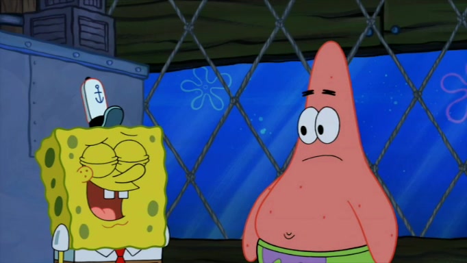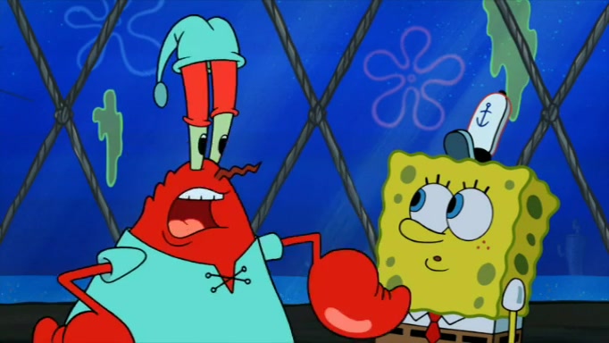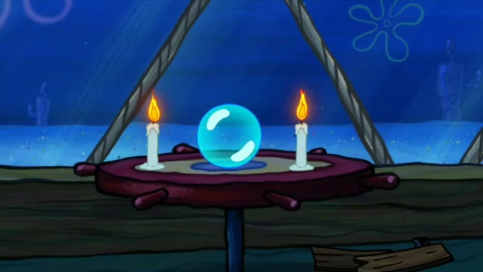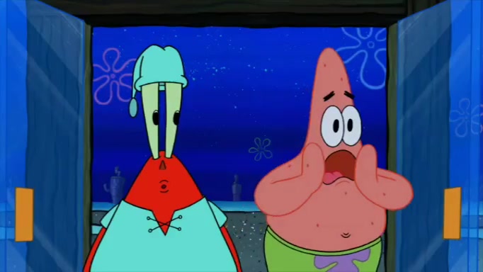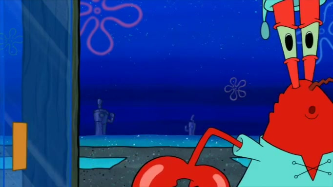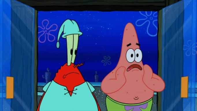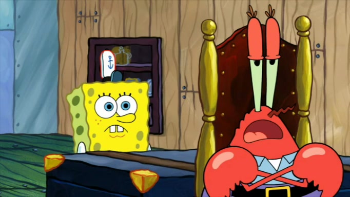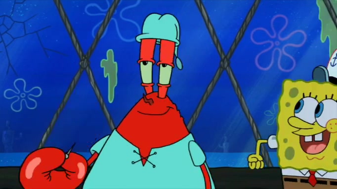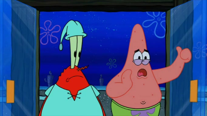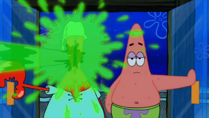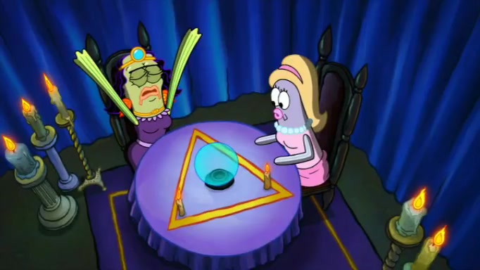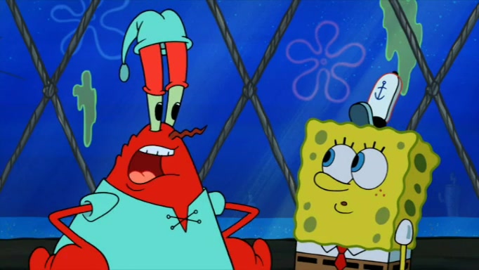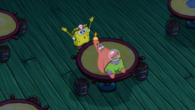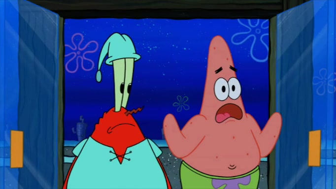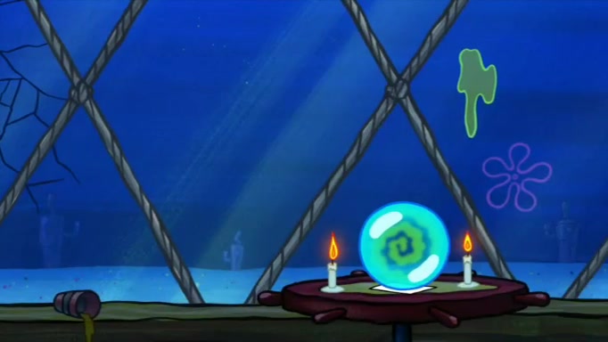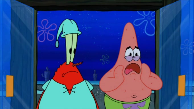 So, later that night, SpongeBob calls Patrick over to the Krusty Krab. Mr. Krabs tells them not to eat any furniture which upsets Patrick and causes him to ask SpongeBob why he called him there. SpongeBob replies by saying that they are going to perform a seance at the Krusty Krab. After SpongeBob reads the ingredients of a mustard container and summons the spirit of Rusty's Rib Eye, the ghost soon appears. Patrick runs to get Mr. Krabs after being scared by the "big ghost."