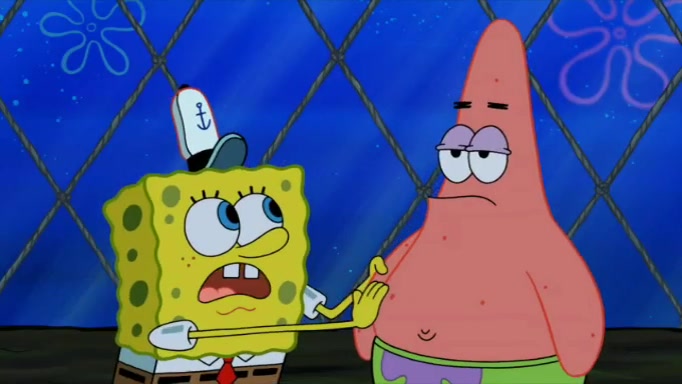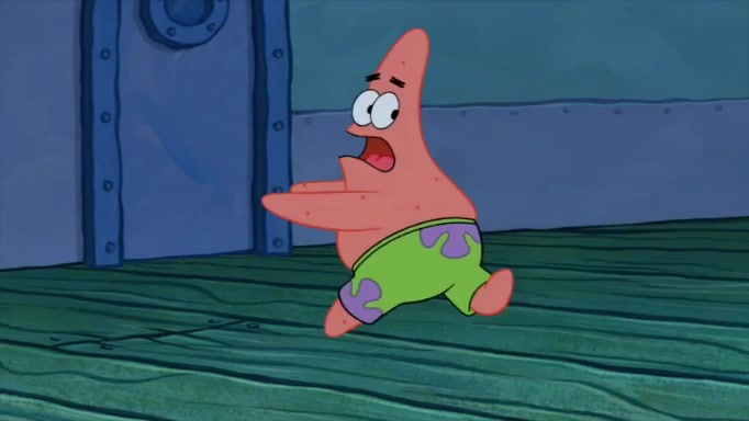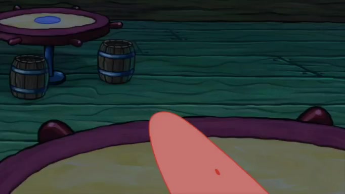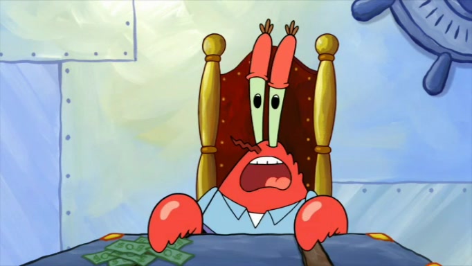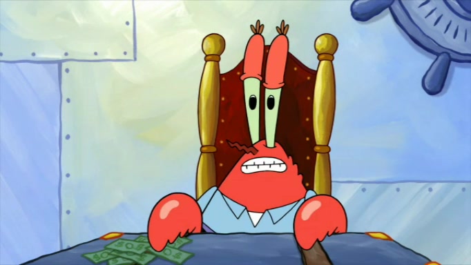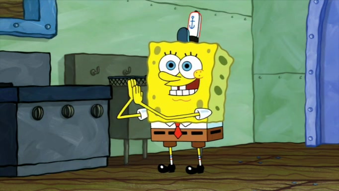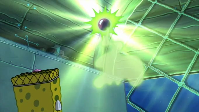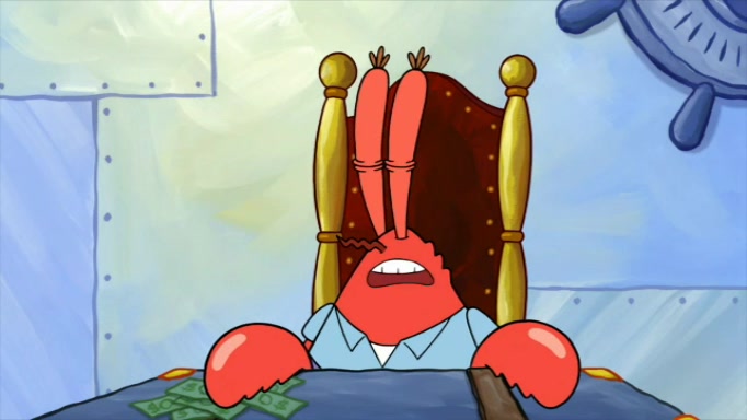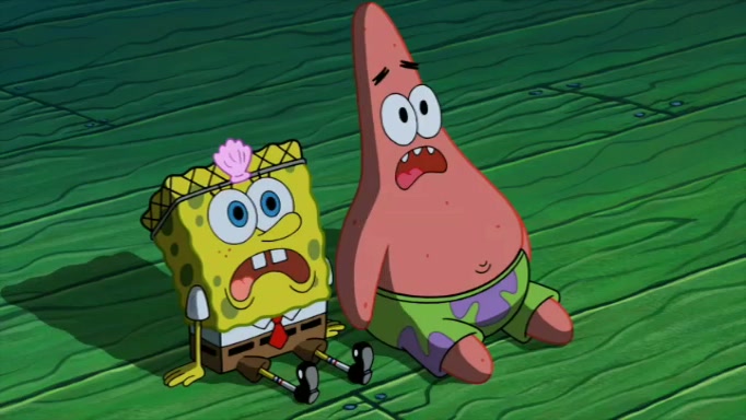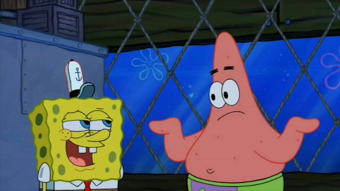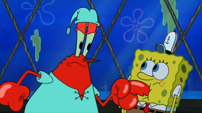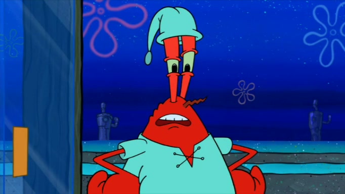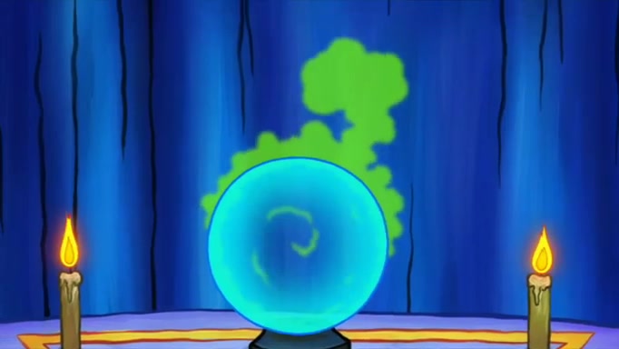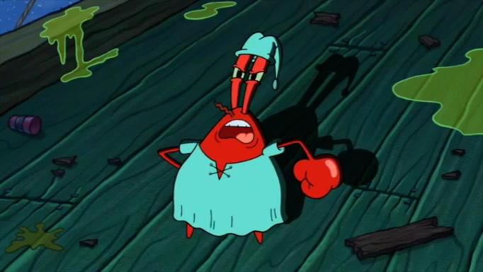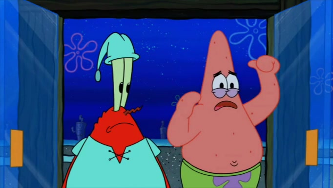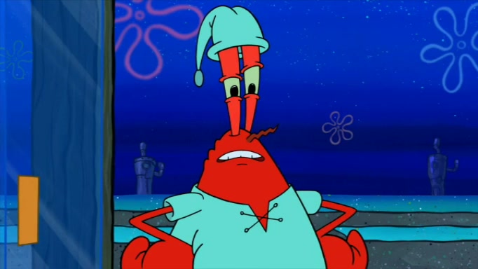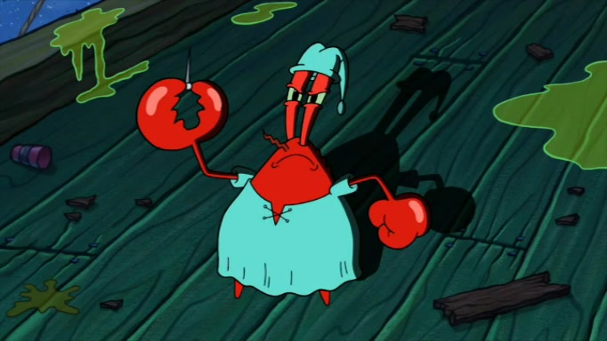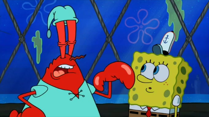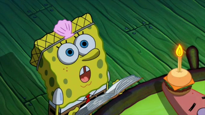 So, later that night, SpongeBob calls Patrick over to the Krusty Krab. Mr. Krabs tells them not to eat any furniture which upsets Patrick and causes him to ask SpongeBob why he called him there. SpongeBob replies by saying that they are going to perform a seance at the Krusty Krab. After SpongeBob reads the ingredients of a mustard container and summons the spirit of Rusty's Rib Eye, the ghost soon appears. Patrick runs to get Mr. Krabs after being scared by the "big ghost."
