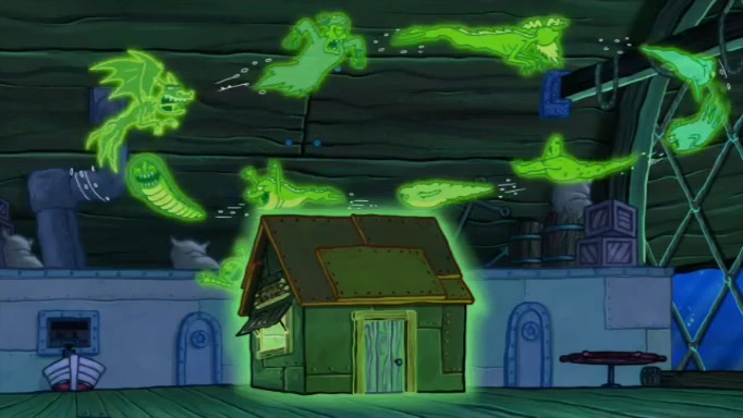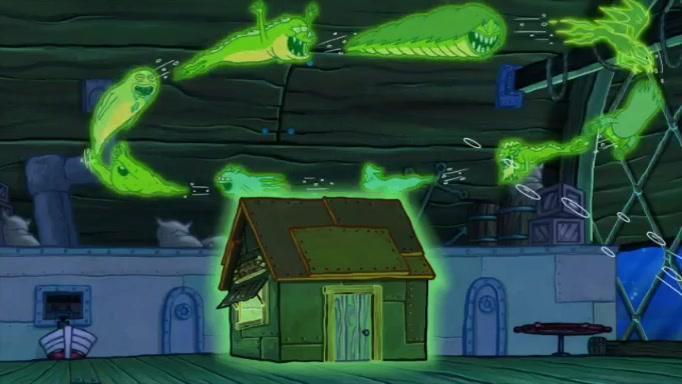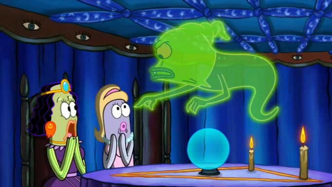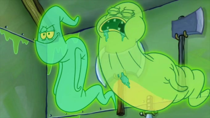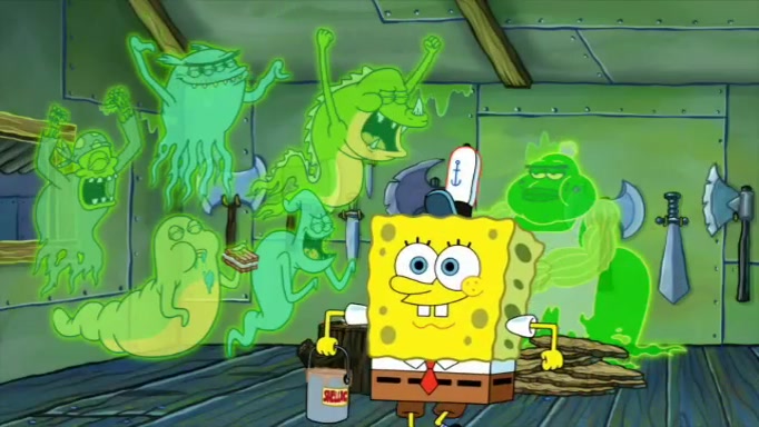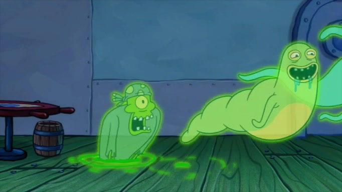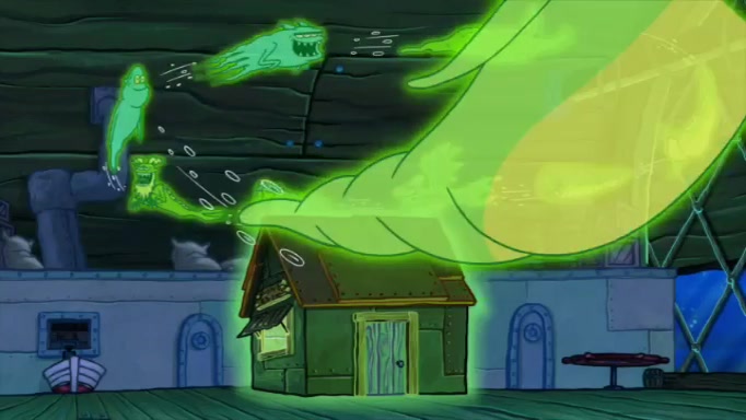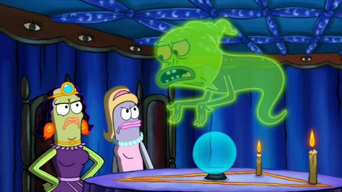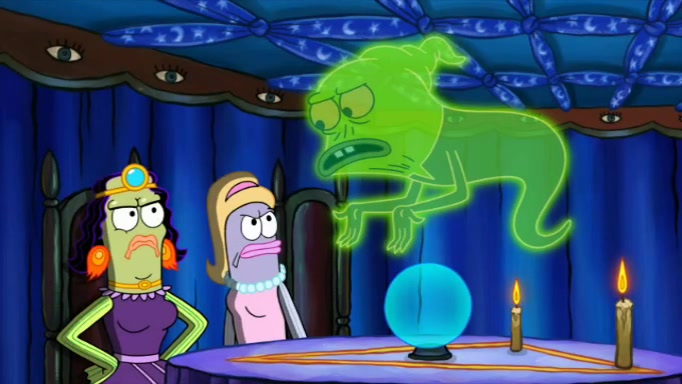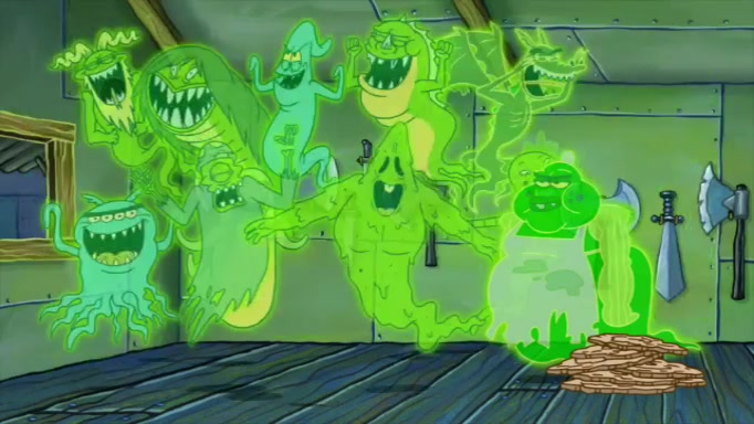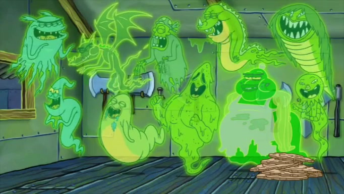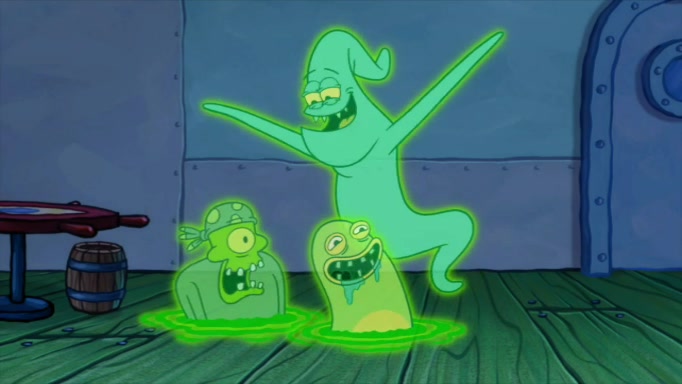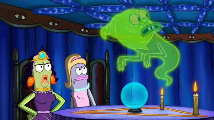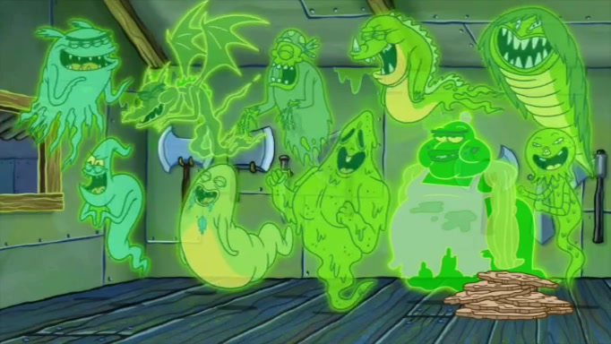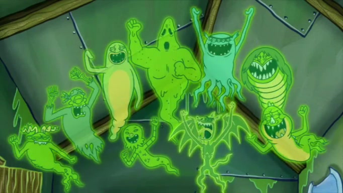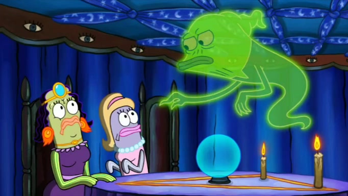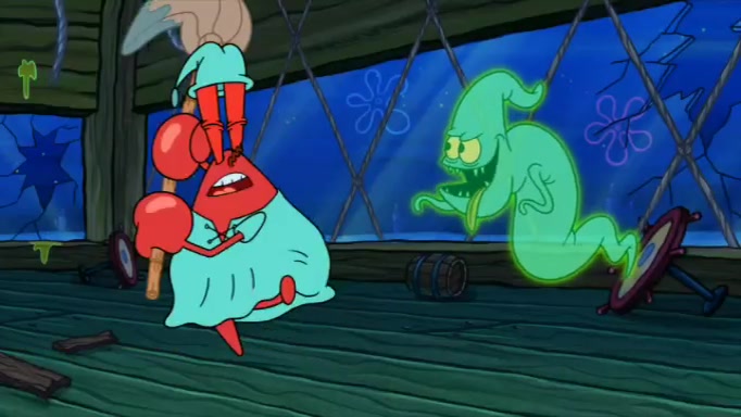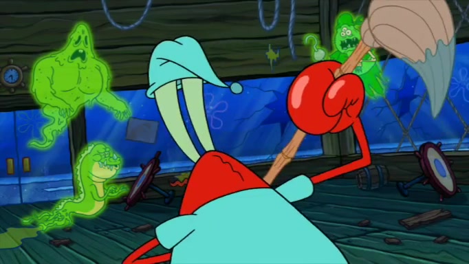 After hanging around for a while, SpongeBob asks them to leave, but they began to cause chaos at the Krusty Krab! Patrick and Mr. Krabs return and see the horrifying cause of SpongeBob's séance. Patrick, still scared, runs around the Krusty Krab screaming. Mr. Krabs sees the orb that the ghosts came from and defeats the ghosts by pushing them back in the orb and pops it. Mr. Krabs warns SpongeBob never to hold a seance without his permission, because "ghosts are like relatives. Once you let them in, they'll never leave."