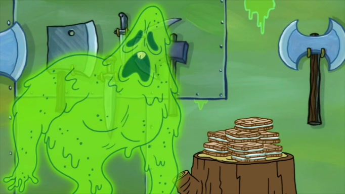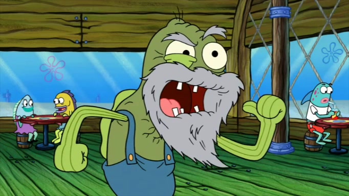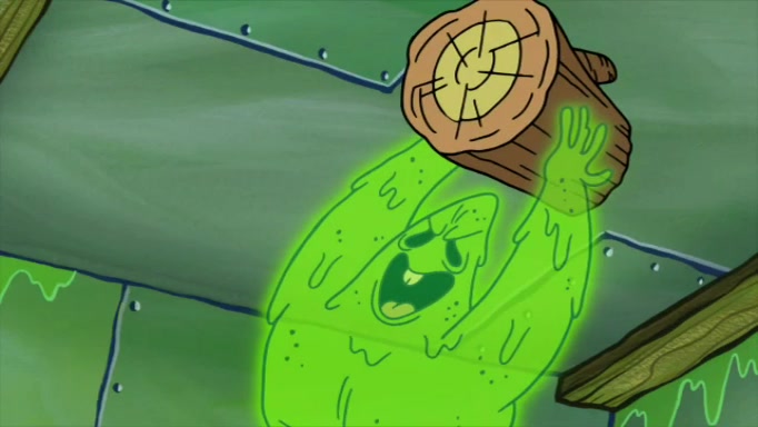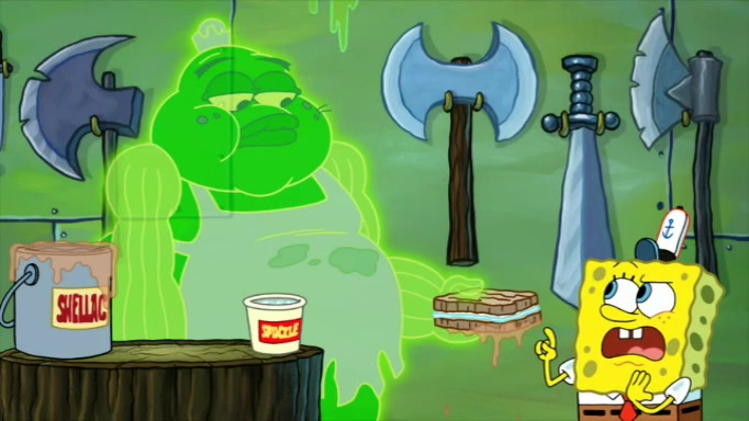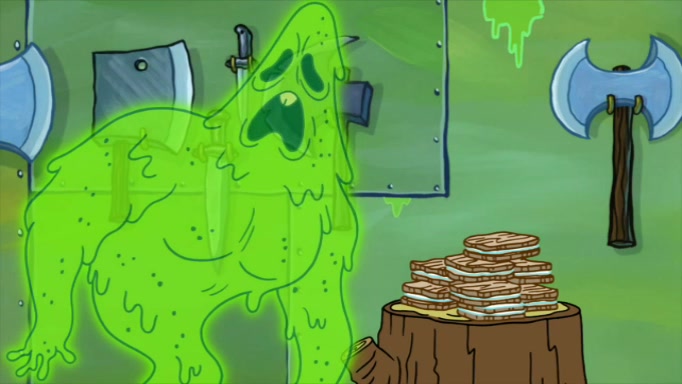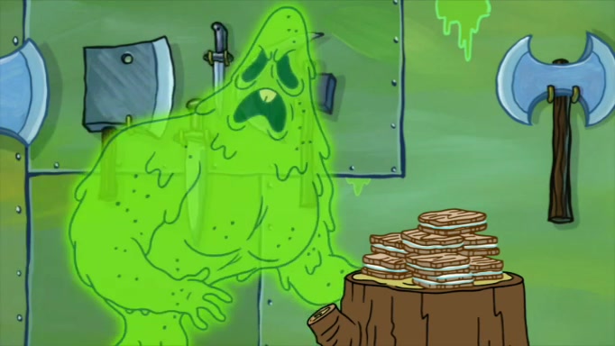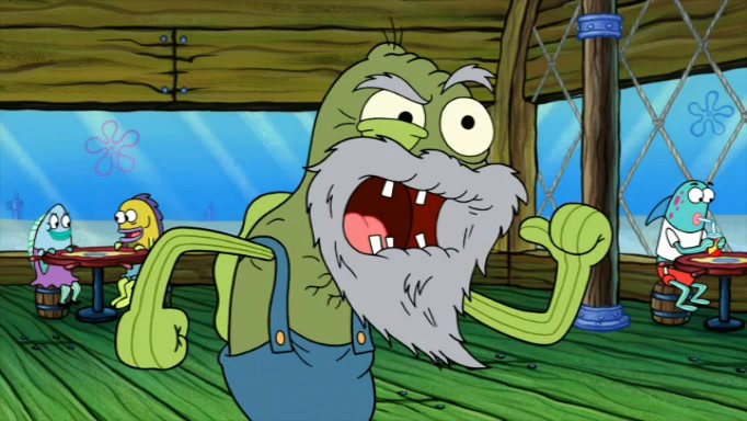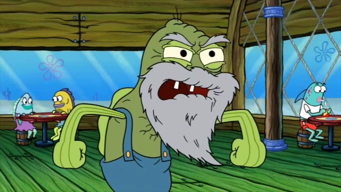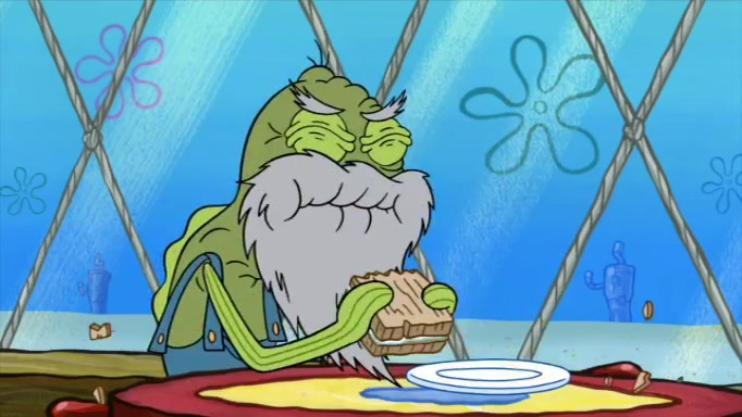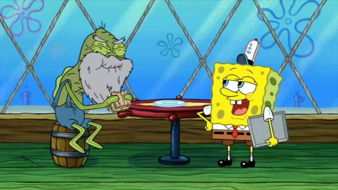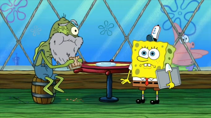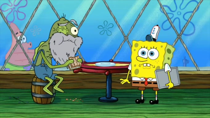 The next day, SpongeBob serves Old Man Jenkins the driftwood sandwich. After he takes a bite, SpongeBob is now satisfied that Old Man Jenkins is satisfied. Then, they hear Patrick still running around the Krusty Krab, moaning ghost sounds.