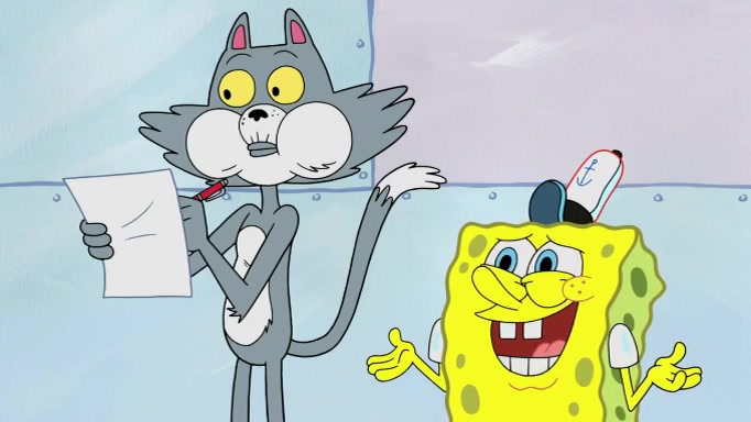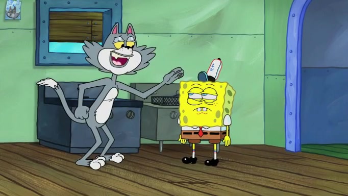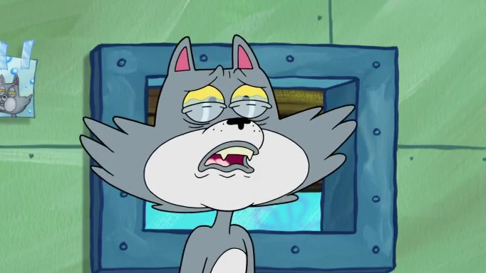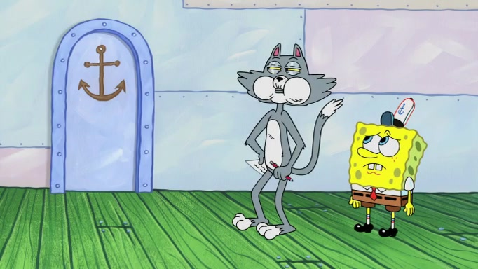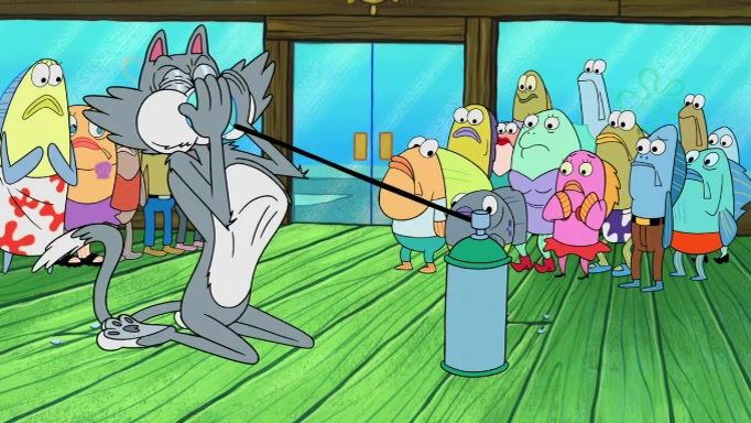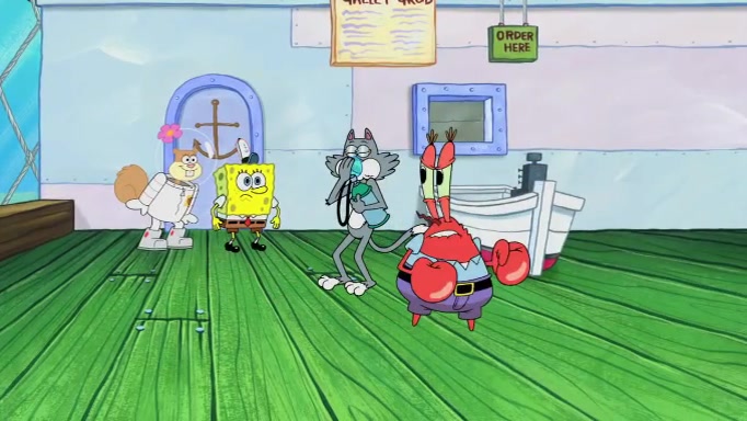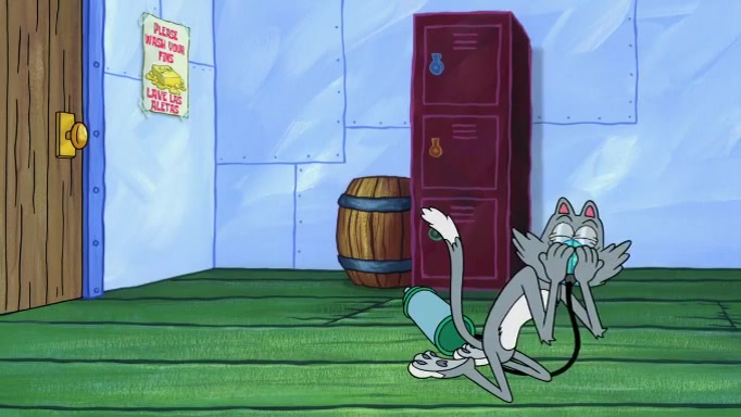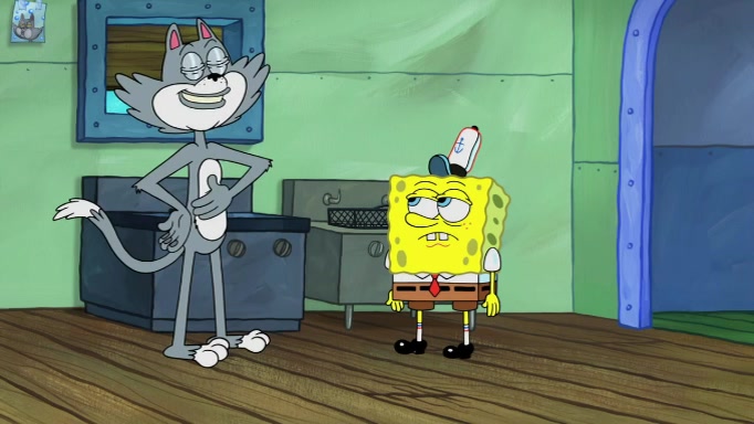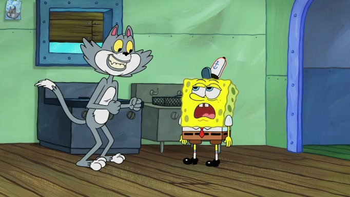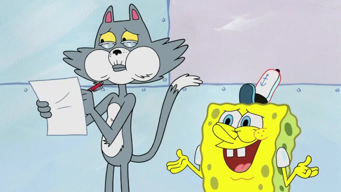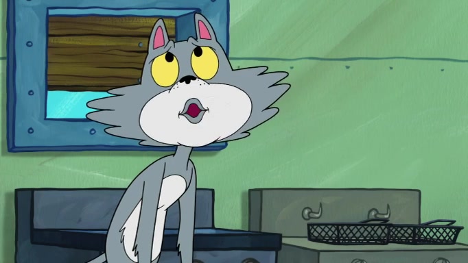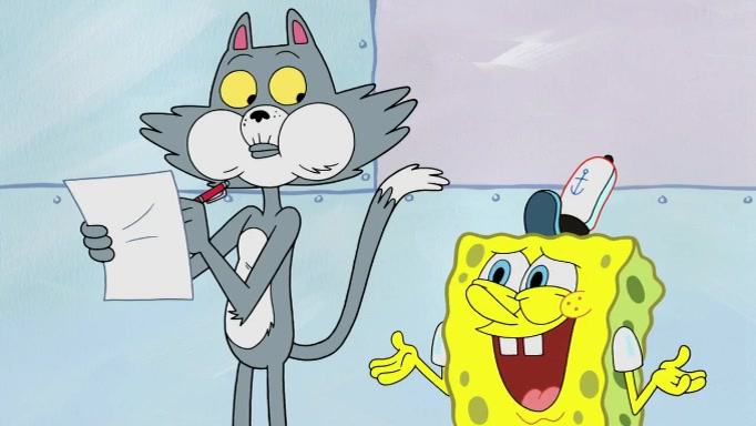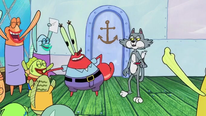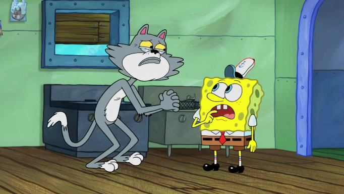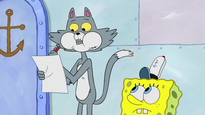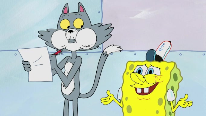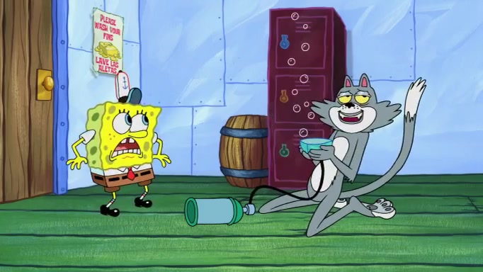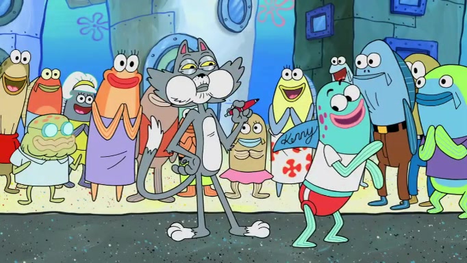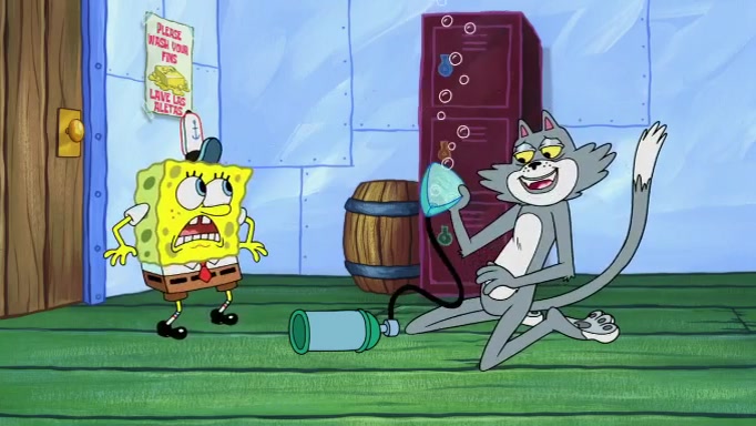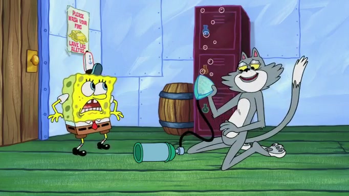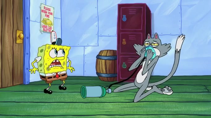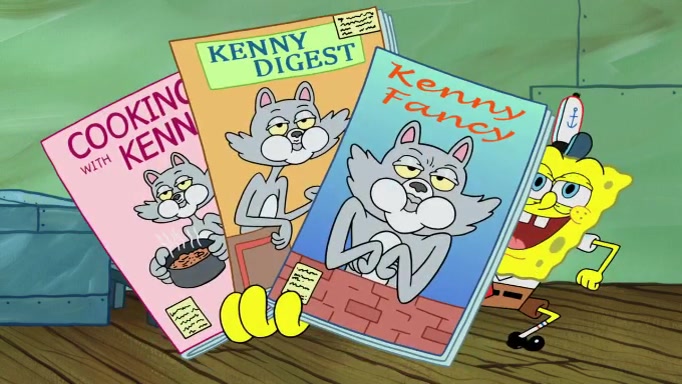 The next day, Kenny the Cat finally arrives and starts giving out autographs. SpongeBob asks Kenny to autograph his custom Kenny spatula. He then invites him to the Krusty Krab. Kenny arrives at the Krusty Krab and Mr. Krabs gives him free ketchup packets and an all-you-can-eat buffet in his honor. He begins to struggle, as he needs to take a breath. He draws a toilet, and runs to the restroom. In the bathroom, Kenny takes an oxygen tank out from behind his back and uses it to breathe. SpongeBob sees this and realizes that Kenny is a fraud after all. Kenny begs SpongeBob not to reveal his secret because he just wants to be special and SpongeBob agrees.