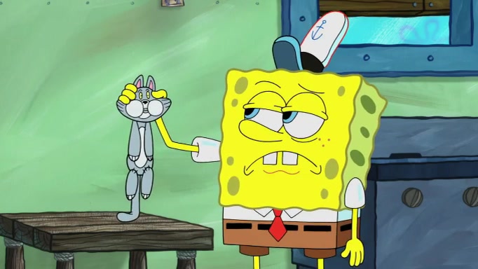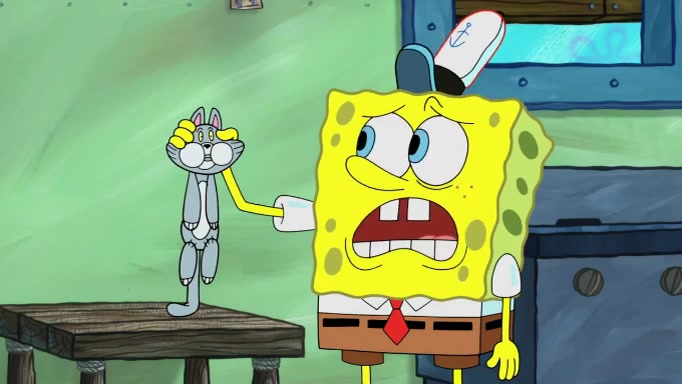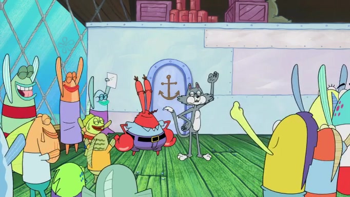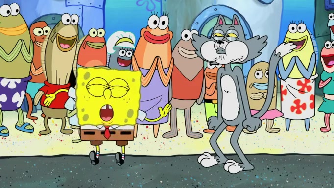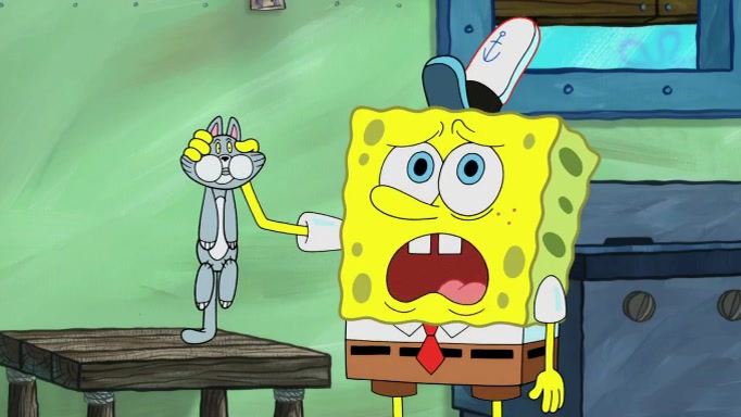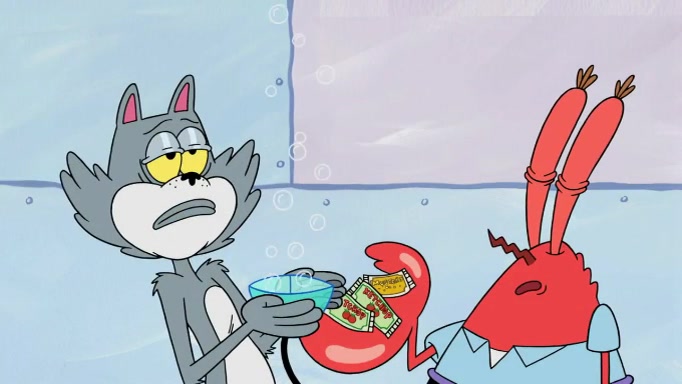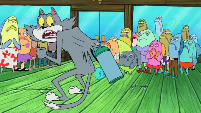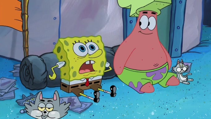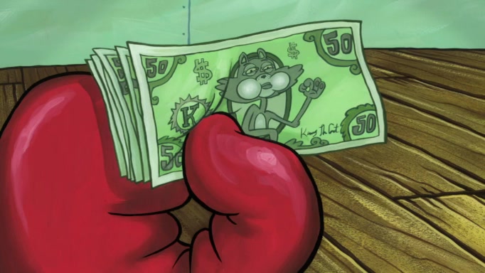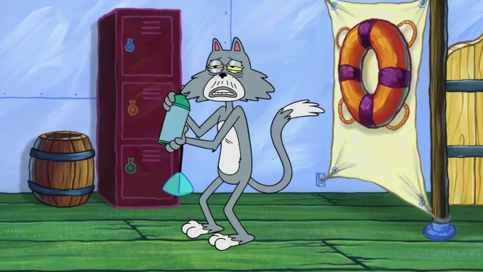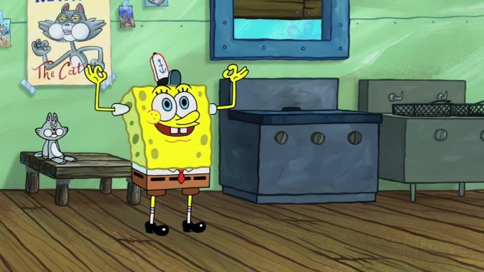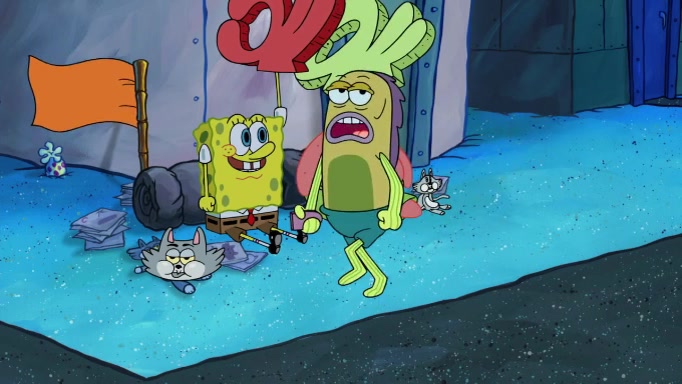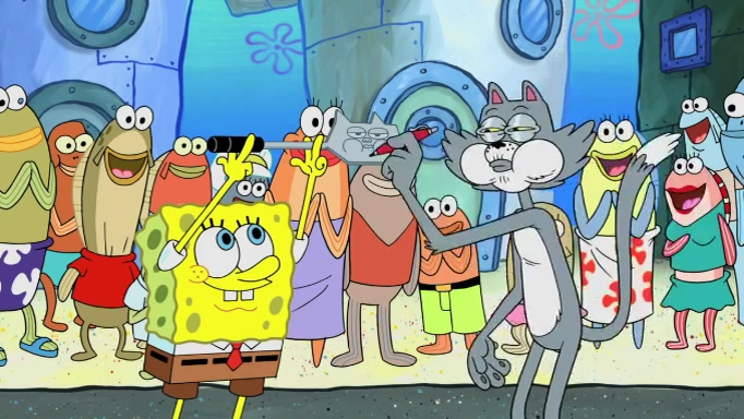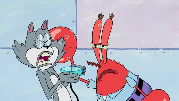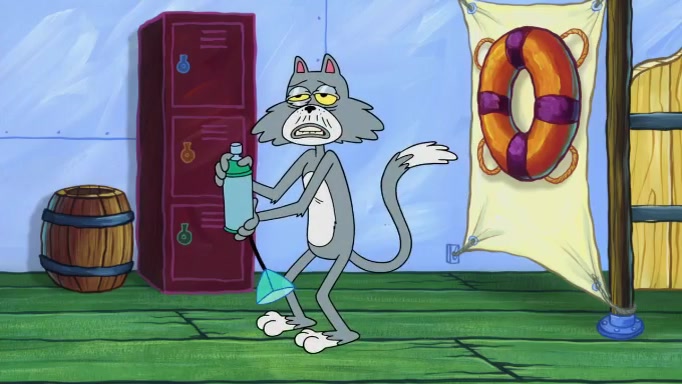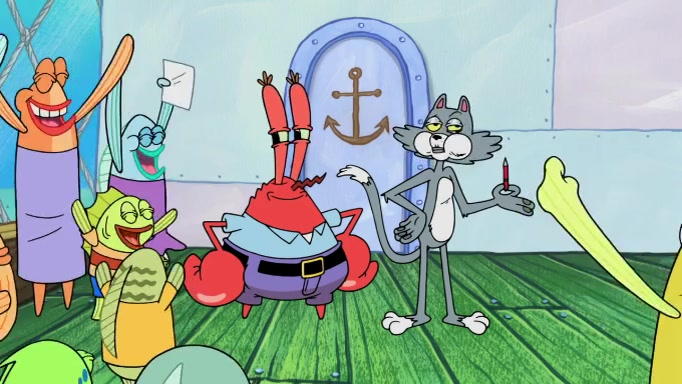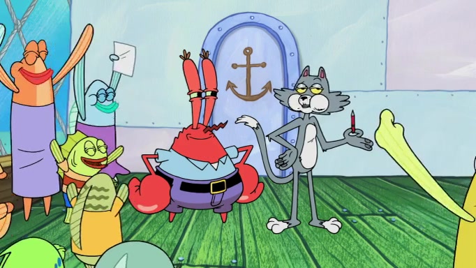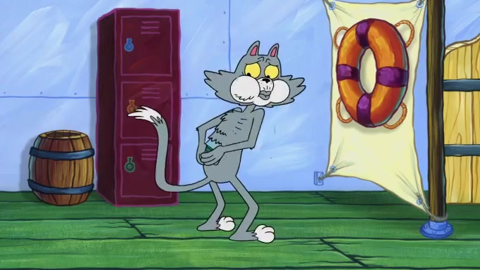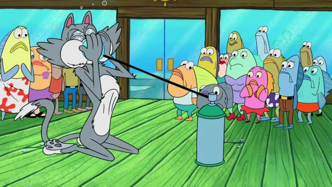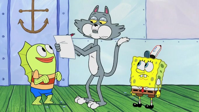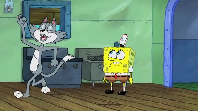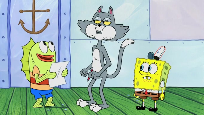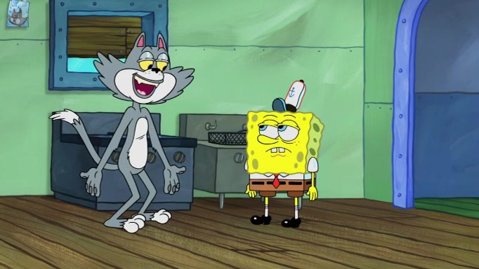 The next day, Kenny the Cat finally arrives and starts giving out autographs. SpongeBob asks Kenny to autograph his custom Kenny spatula. He then invites him to the Krusty Krab. Kenny arrives at the Krusty Krab and Mr. Krabs gives him free ketchup packets and an all-you-can-eat buffet in his honor. He begins to struggle, as he needs to take a breath. He draws a toilet, and runs to the restroom. In the bathroom, Kenny takes an oxygen tank out from behind his back and uses it to breathe. SpongeBob sees this and realizes that Kenny is a fraud after all. Kenny begs SpongeBob not to reveal his secret because he just wants to be special and SpongeBob agrees.