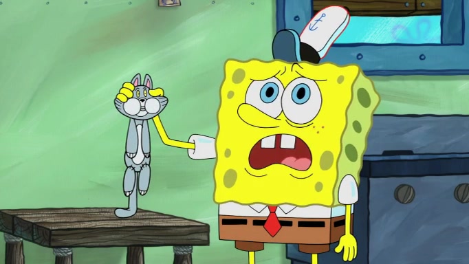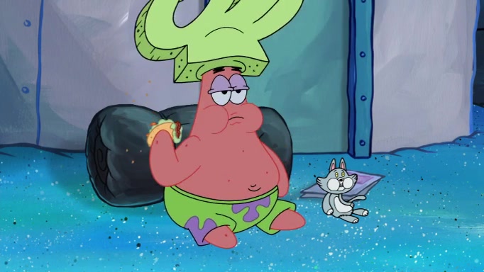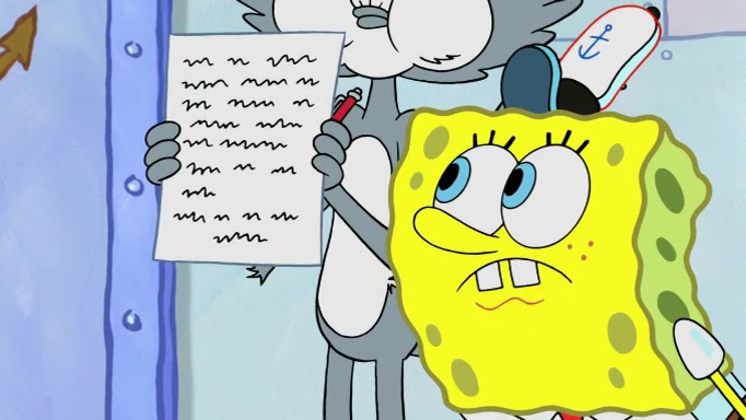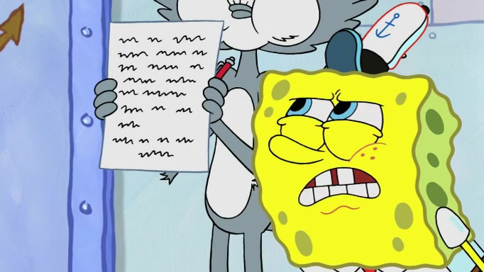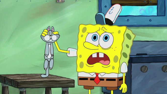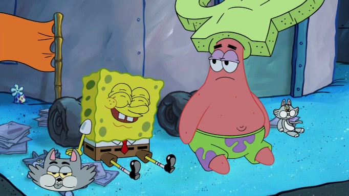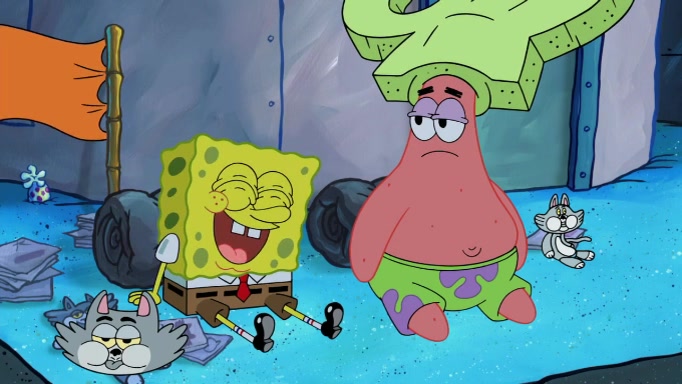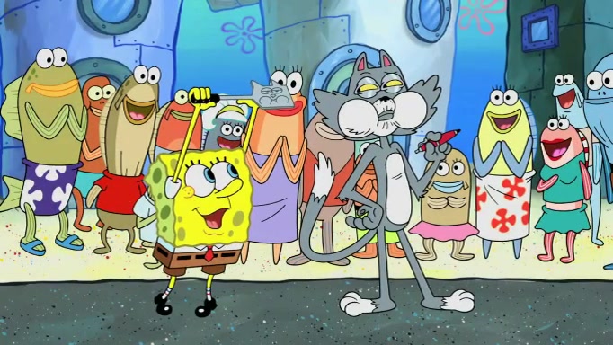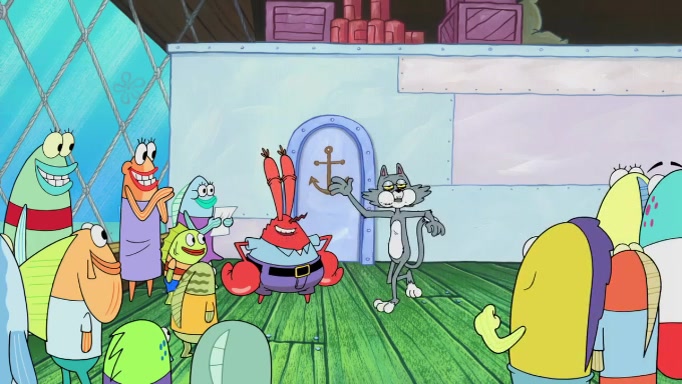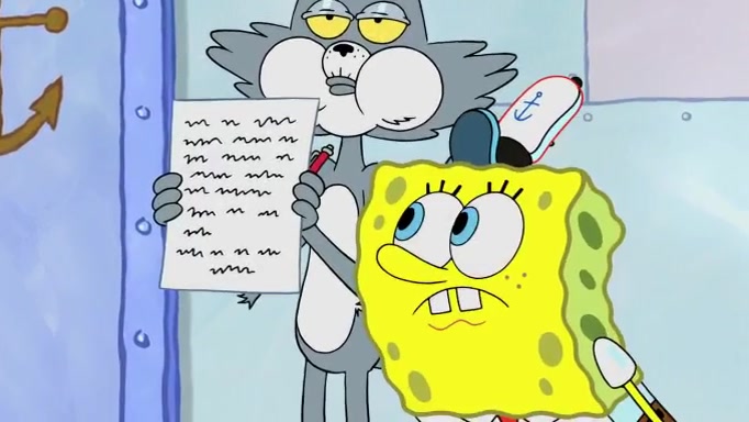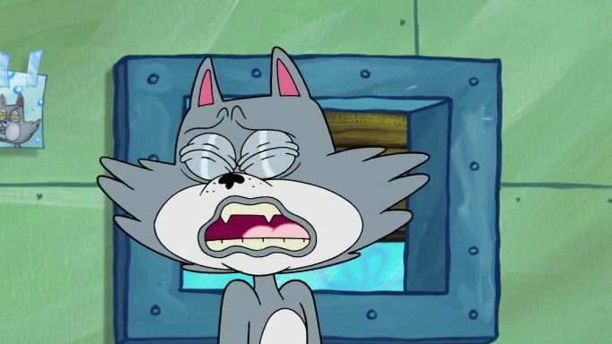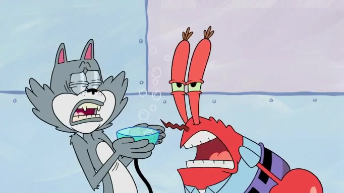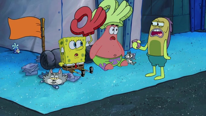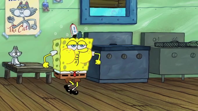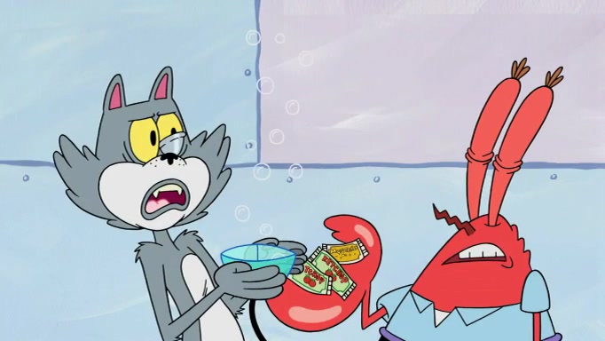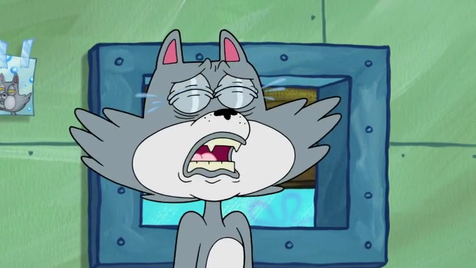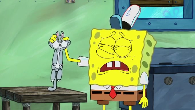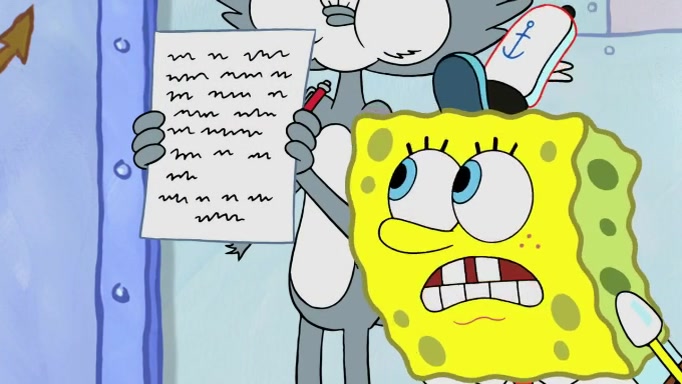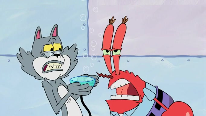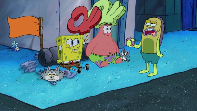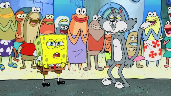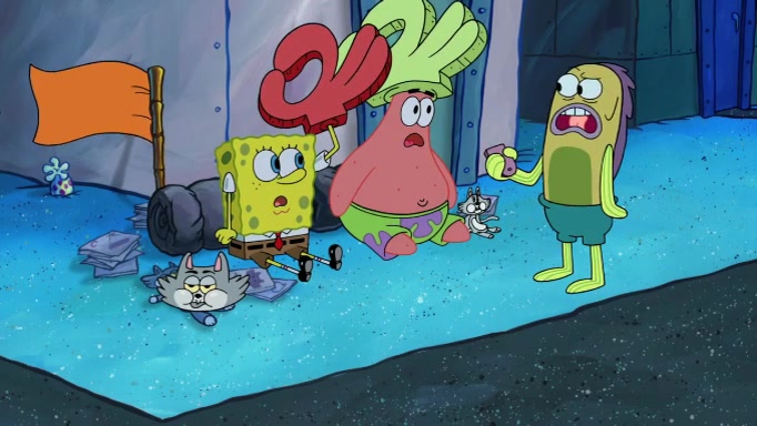 The next day, Kenny the Cat finally arrives and starts giving out autographs. SpongeBob asks Kenny to autograph his custom Kenny spatula. He then invites him to the Krusty Krab. Kenny arrives at the Krusty Krab and Mr. Krabs gives him free ketchup packets and an all-you-can-eat buffet in his honor. He begins to struggle, as he needs to take a breath. He draws a toilet, and runs to the restroom. In the bathroom, Kenny takes an oxygen tank out from behind his back and uses it to breathe. SpongeBob sees this and realizes that Kenny is a fraud after all. Kenny begs SpongeBob not to reveal his secret because he just wants to be special and SpongeBob agrees.
