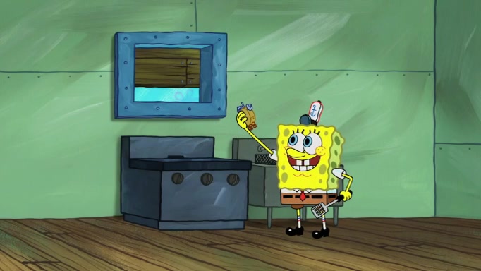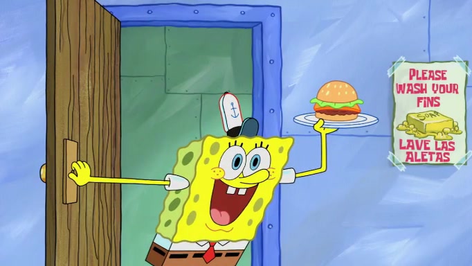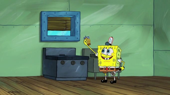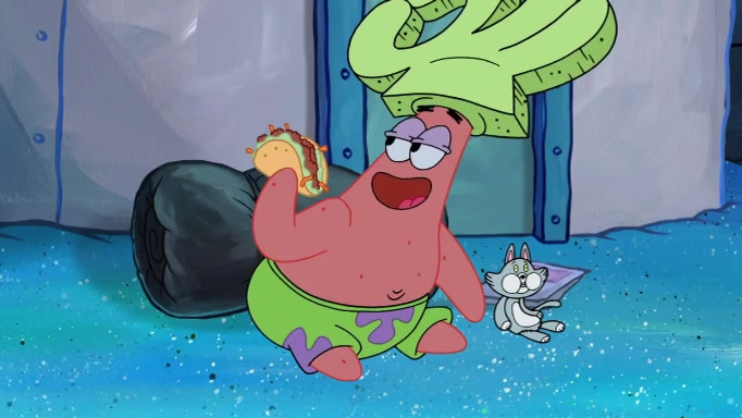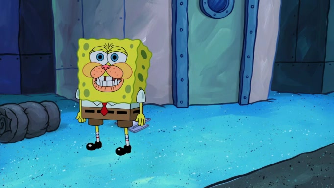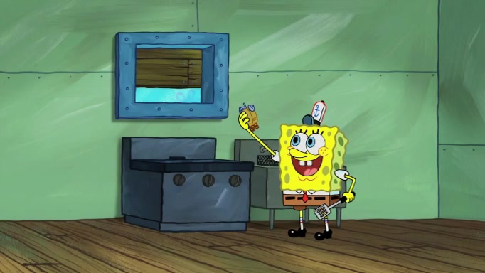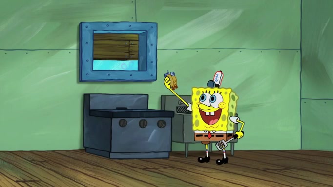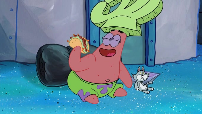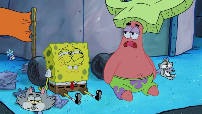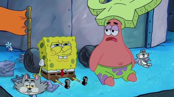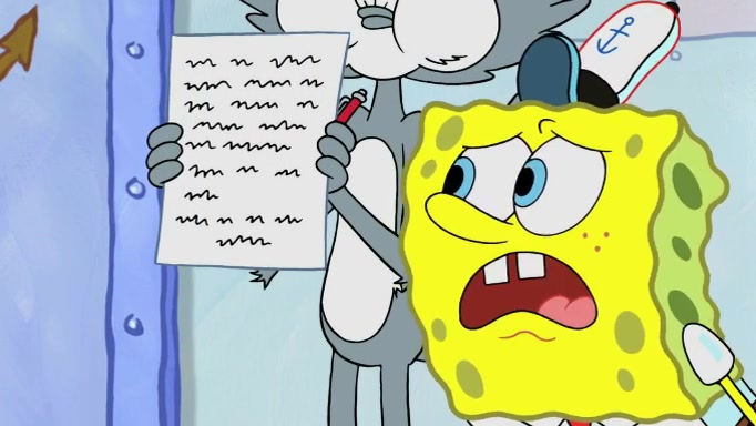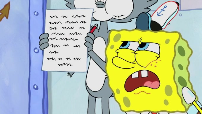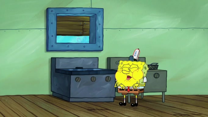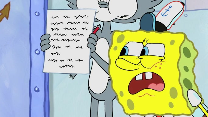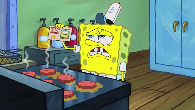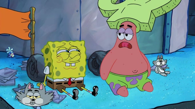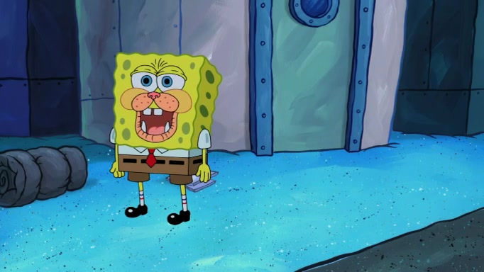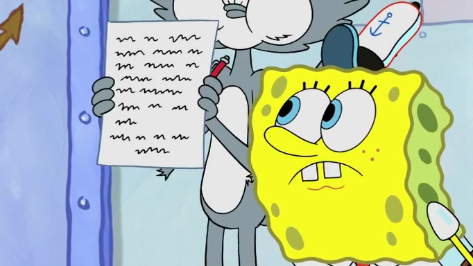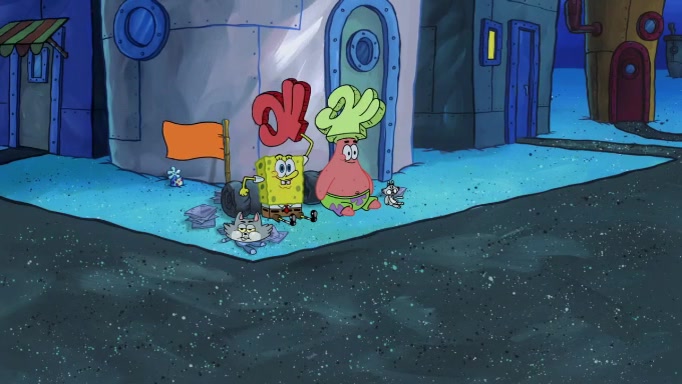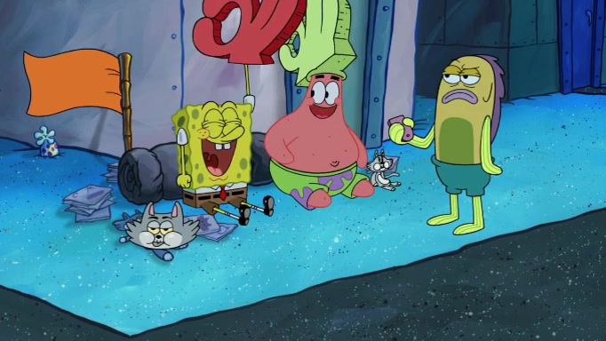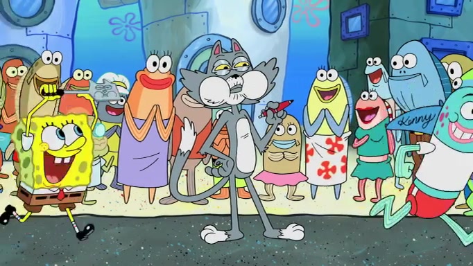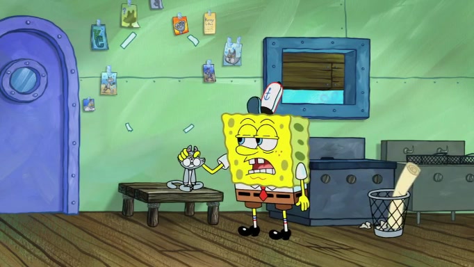The next day, Kenny the Cat finally arrives and starts giving out autographs. SpongeBob asks Kenny to autograph his custom Kenny spatula. He then invites him to the Krusty Krab. Kenny arrives at the Krusty Krab and Mr. Krabs gives him free ketchup packets and an all-you-can-eat buffet in his honor. He begins to struggle, as he needs to take a breath. He draws a toilet, and runs to the restroom. In the bathroom, Kenny takes an oxygen tank out from behind his back and uses it to breathe. SpongeBob sees this and realizes that Kenny is a fraud after all. Kenny begs SpongeBob not to reveal his secret because he just wants to be special and SpongeBob agrees.