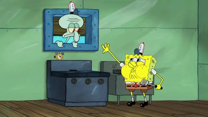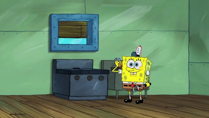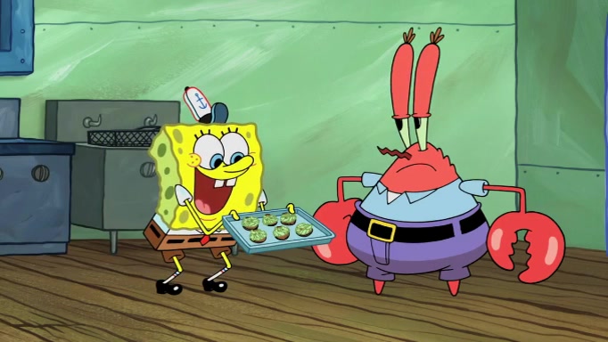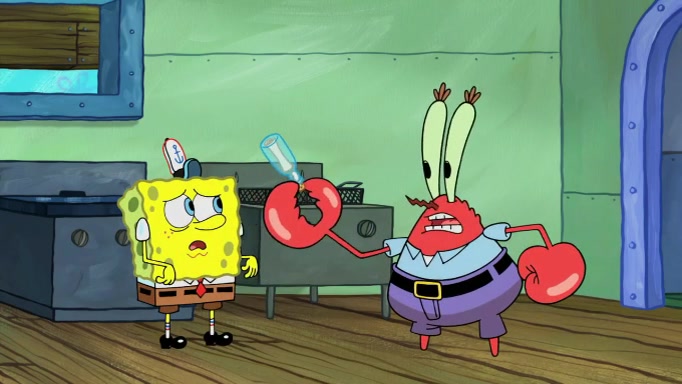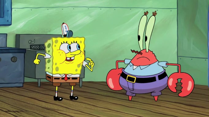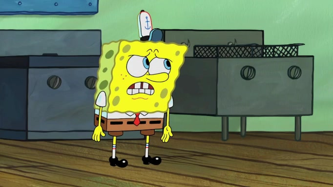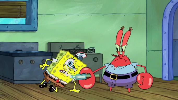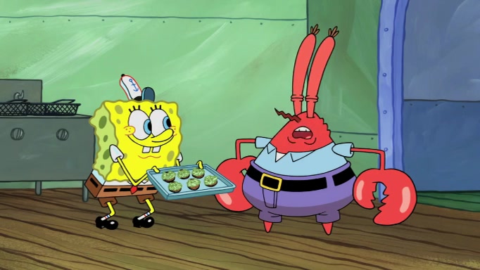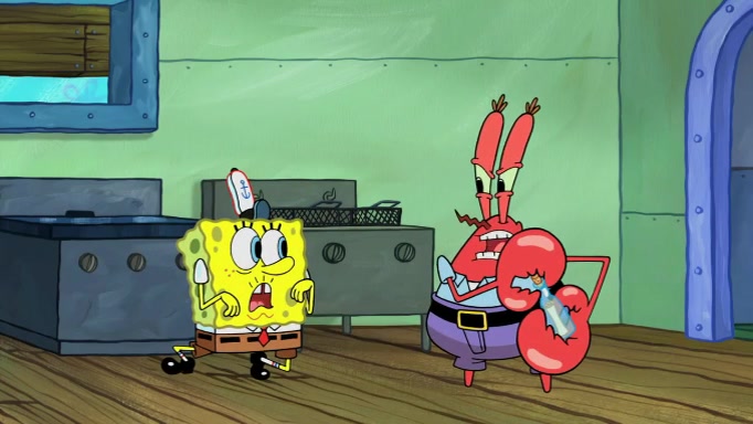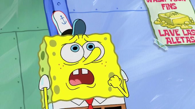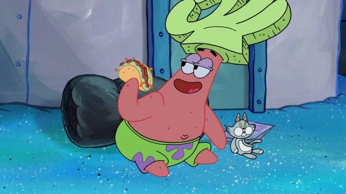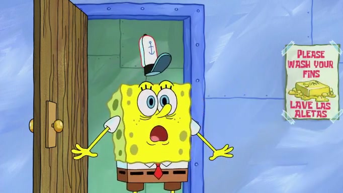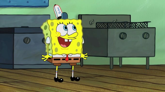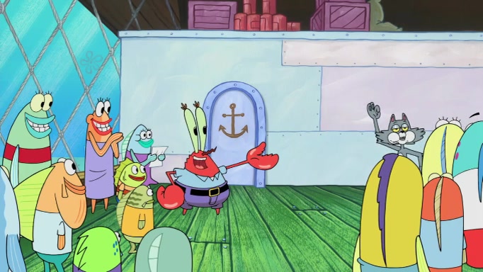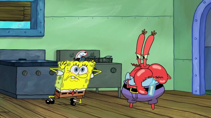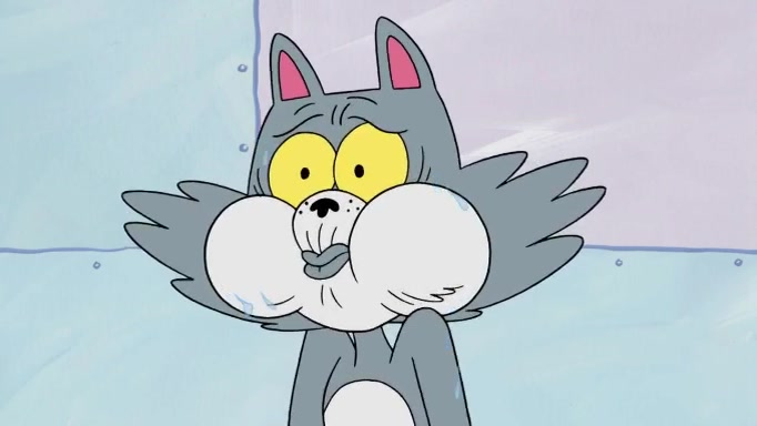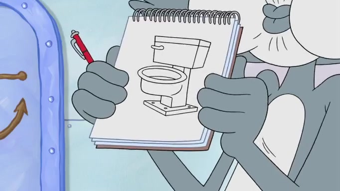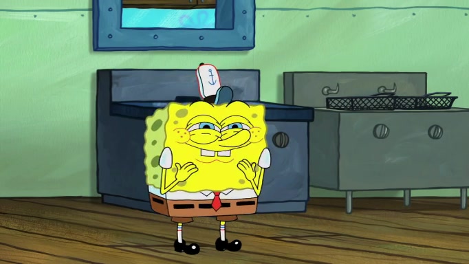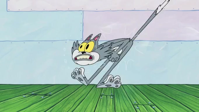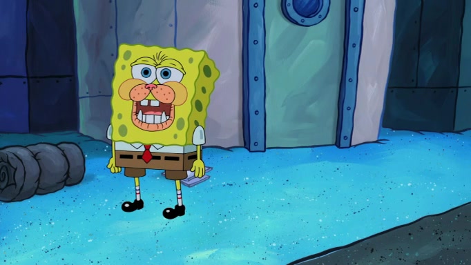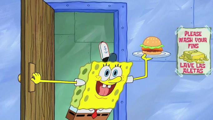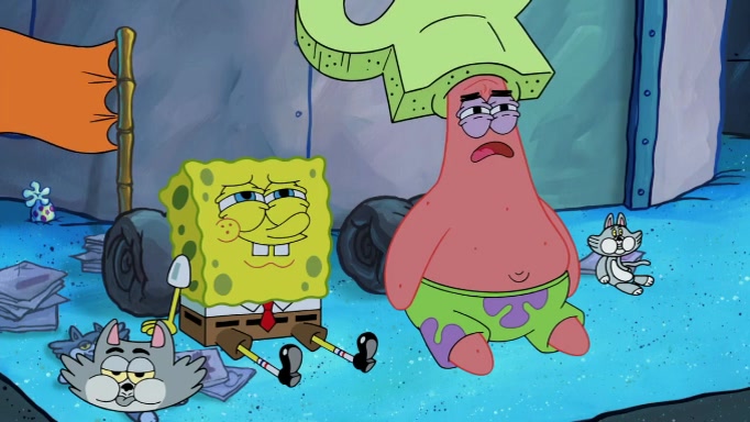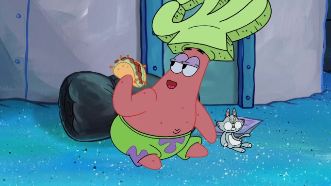 The next day, Kenny the Cat finally arrives and starts giving out autographs. SpongeBob asks Kenny to autograph his custom Kenny spatula. He then invites him to the Krusty Krab. Kenny arrives at the Krusty Krab and Mr. Krabs gives him free ketchup packets and an all-you-can-eat buffet in his honor. He begins to struggle, as he needs to take a breath. He draws a toilet, and runs to the restroom. In the bathroom, Kenny takes an oxygen tank out from behind his back and uses it to breathe. SpongeBob sees this and realizes that Kenny is a fraud after all. Kenny begs SpongeBob not to reveal his secret because he just wants to be special and SpongeBob agrees.