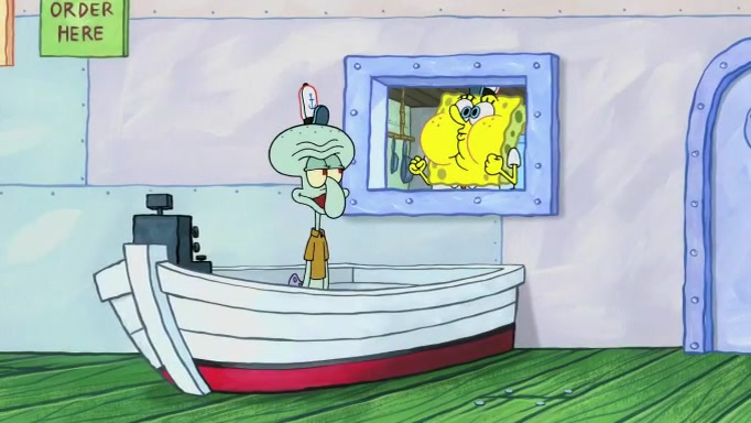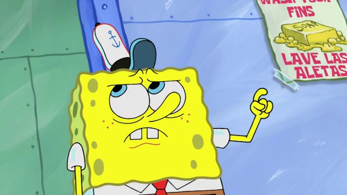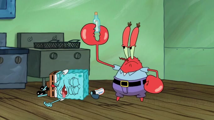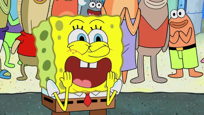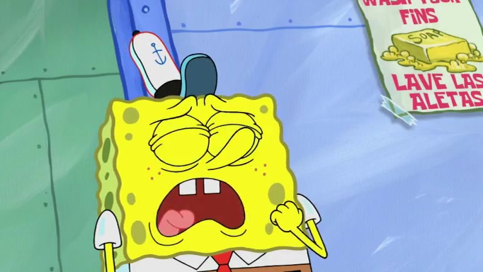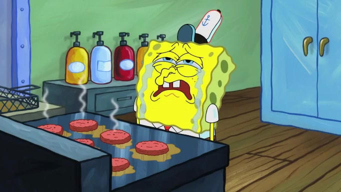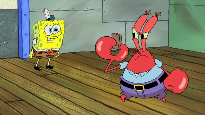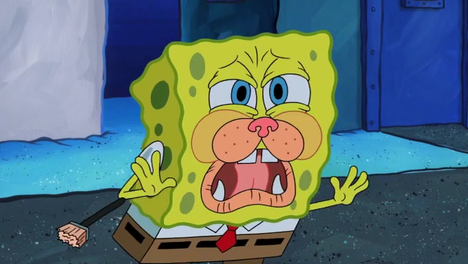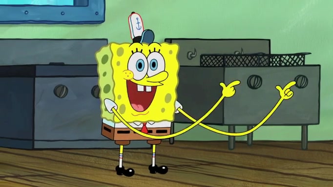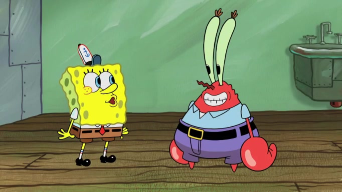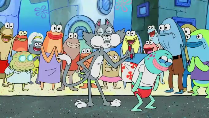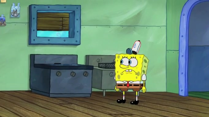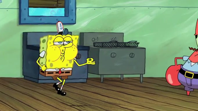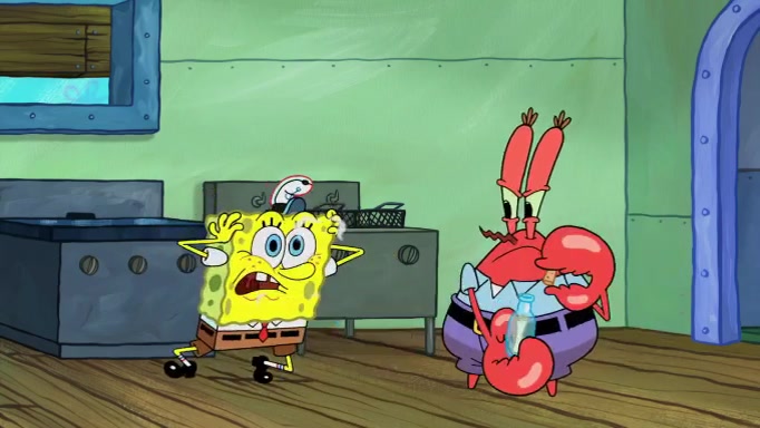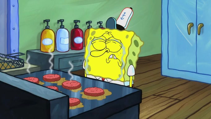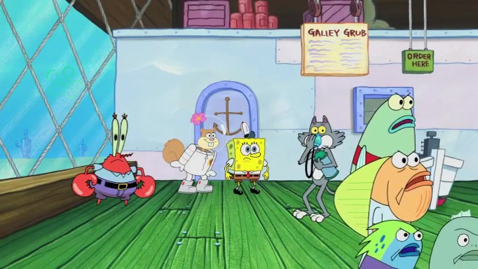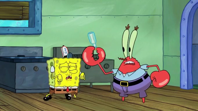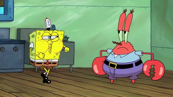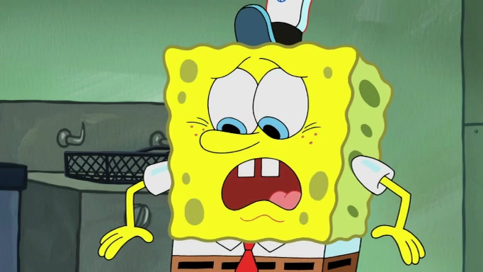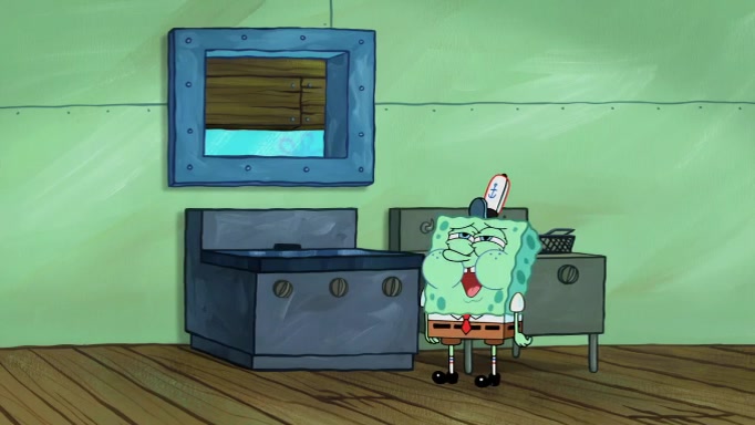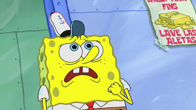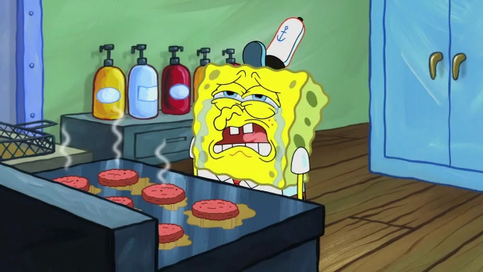 The next day, Kenny the Cat finally arrives and starts giving out autographs. SpongeBob asks Kenny to autograph his custom Kenny spatula. He then invites him to the Krusty Krab. Kenny arrives at the Krusty Krab and Mr. Krabs gives him free ketchup packets and an all-you-can-eat buffet in his honor. He begins to struggle, as he needs to take a breath. He draws a toilet, and runs to the restroom. In the bathroom, Kenny takes an oxygen tank out from behind his back and uses it to breathe. SpongeBob sees this and realizes that Kenny is a fraud after all. Kenny begs SpongeBob not to reveal his secret because he just wants to be special and SpongeBob agrees.