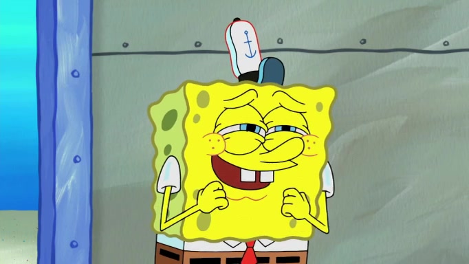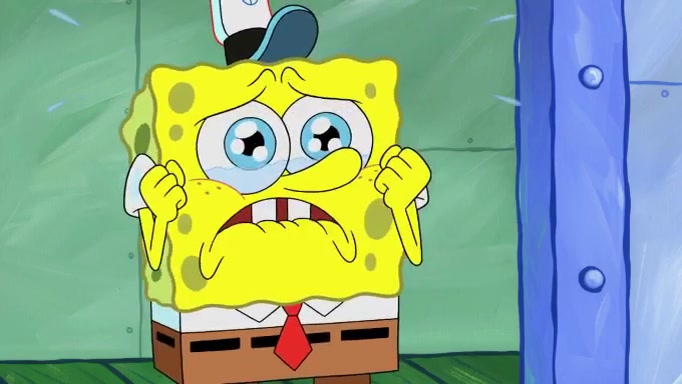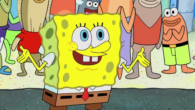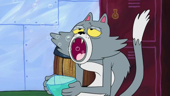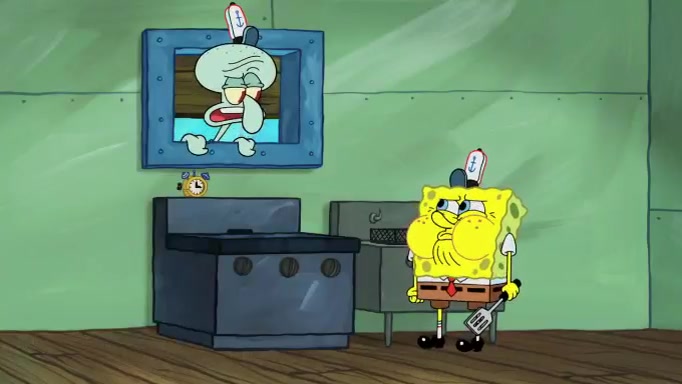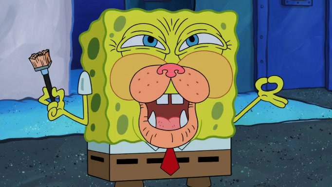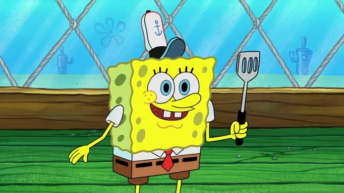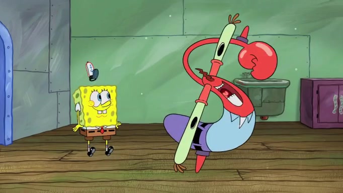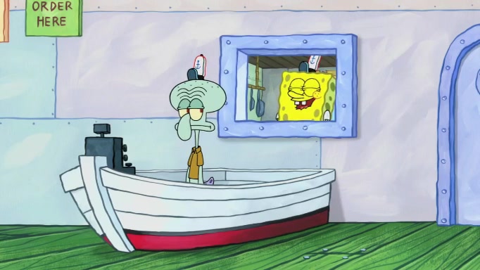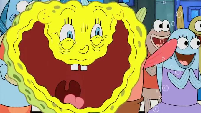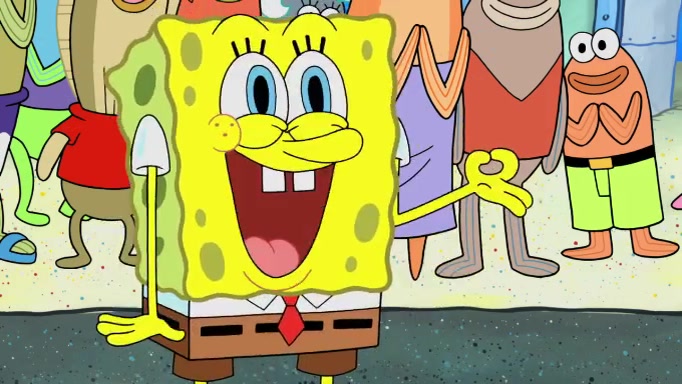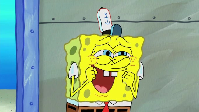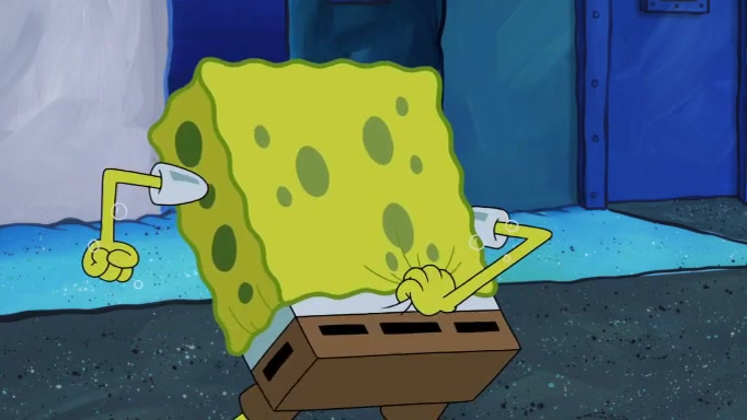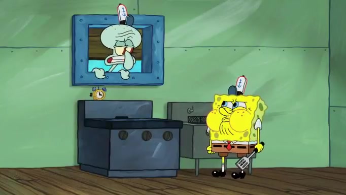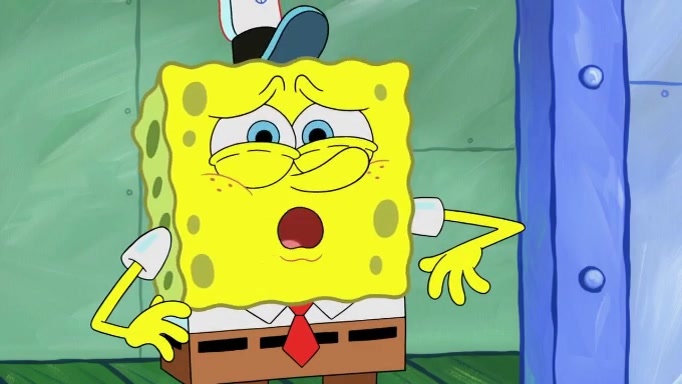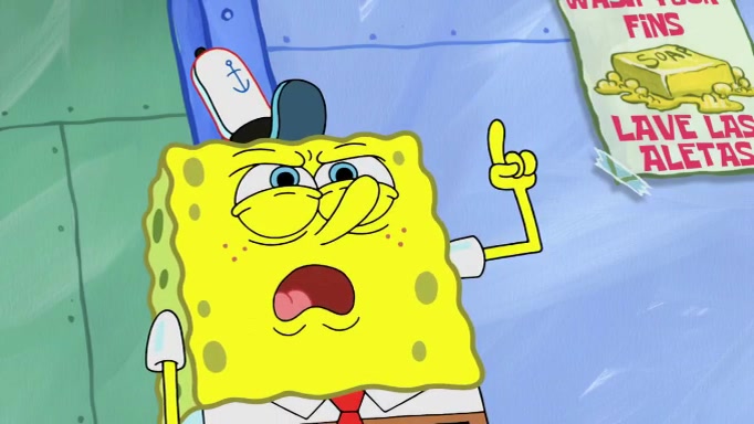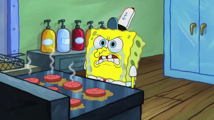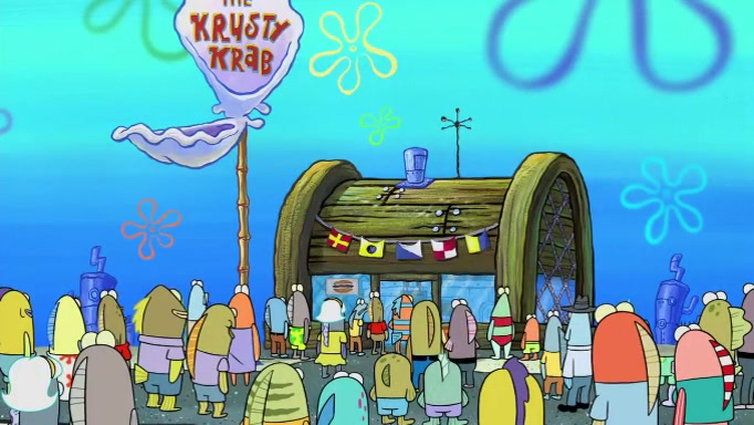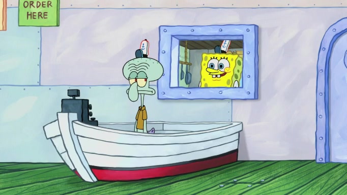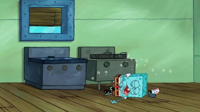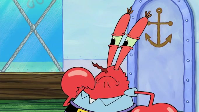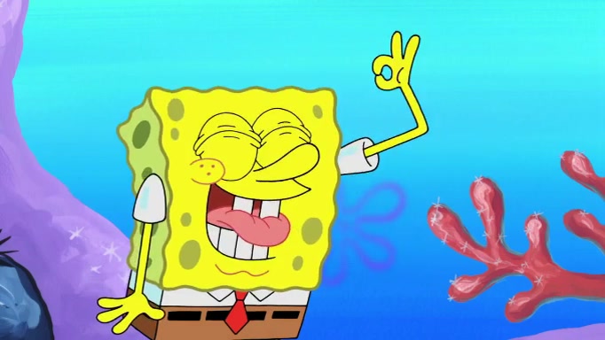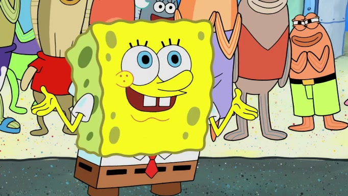 The next day, Kenny the Cat finally arrives and starts giving out autographs. SpongeBob asks Kenny to autograph his custom Kenny spatula. He then invites him to the Krusty Krab. Kenny arrives at the Krusty Krab and Mr. Krabs gives him free ketchup packets and an all-you-can-eat buffet in his honor. He begins to struggle, as he needs to take a breath. He draws a toilet, and runs to the restroom. In the bathroom, Kenny takes an oxygen tank out from behind his back and uses it to breathe. SpongeBob sees this and realizes that Kenny is a fraud after all. Kenny begs SpongeBob not to reveal his secret because he just wants to be special and SpongeBob agrees.