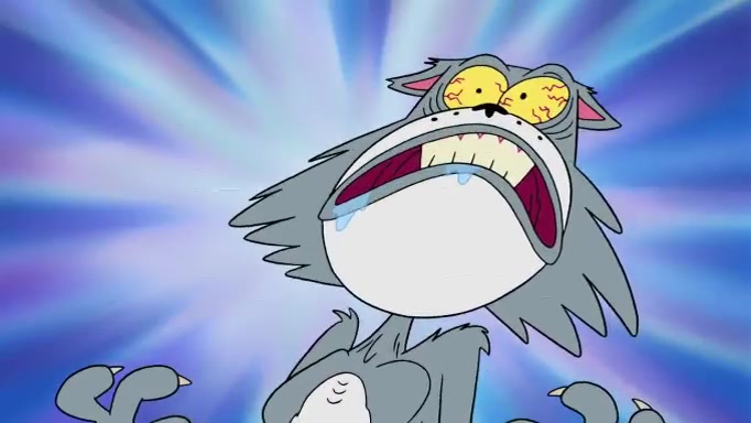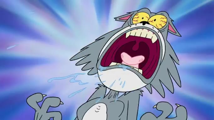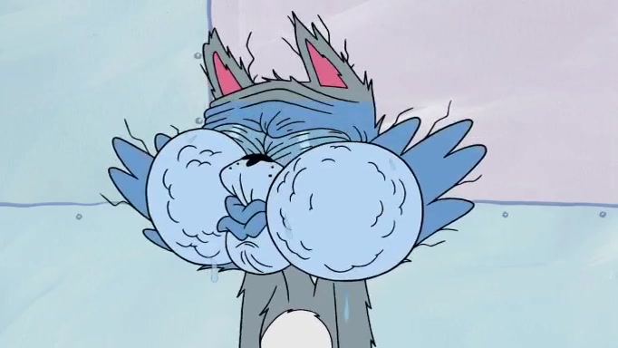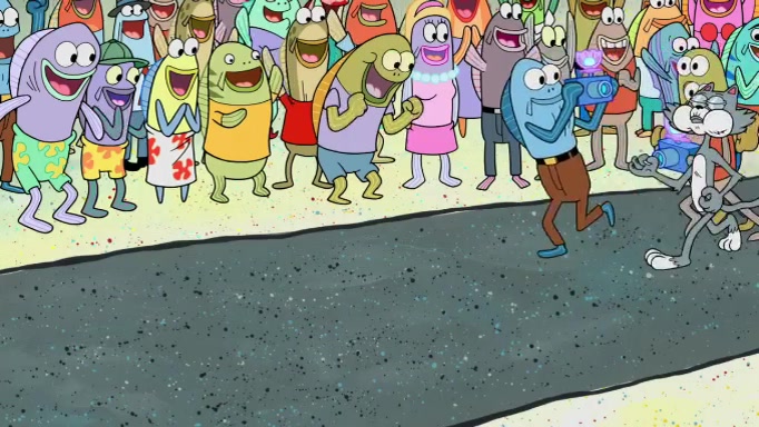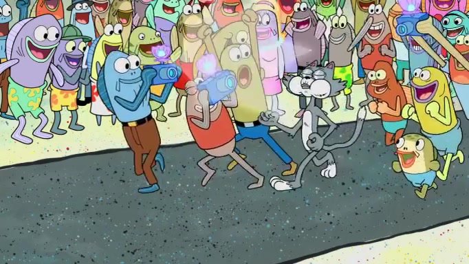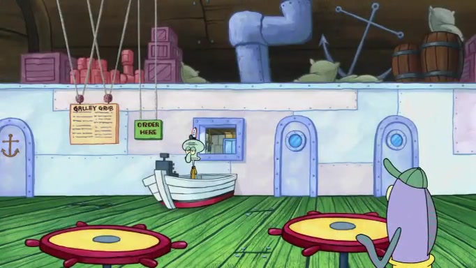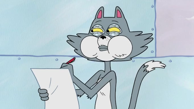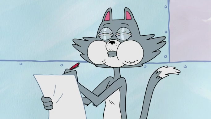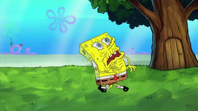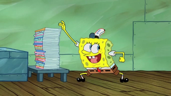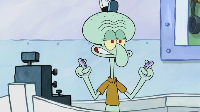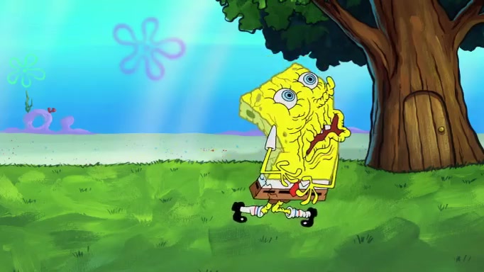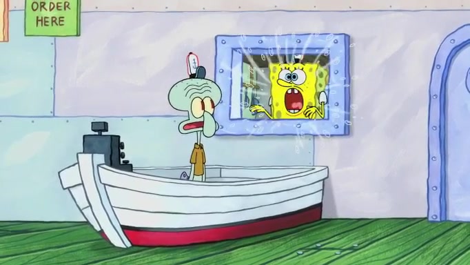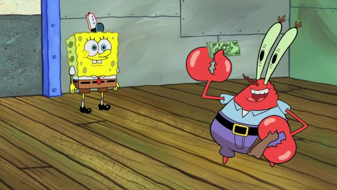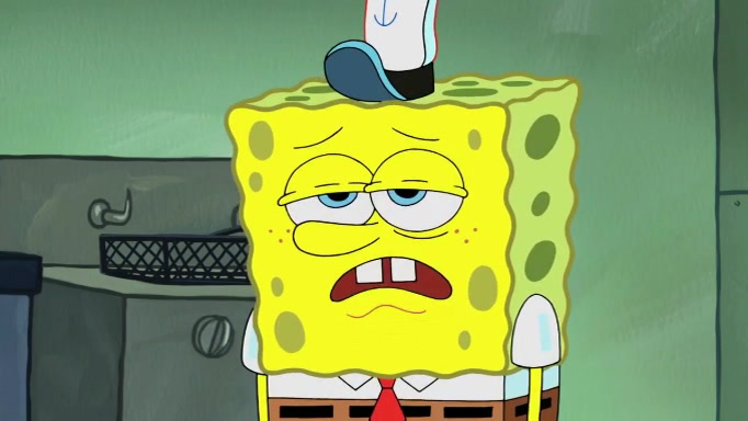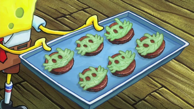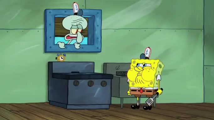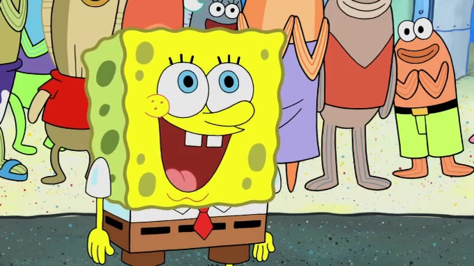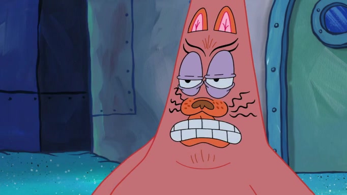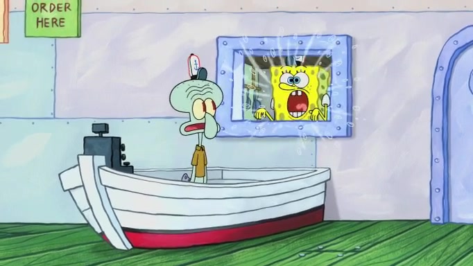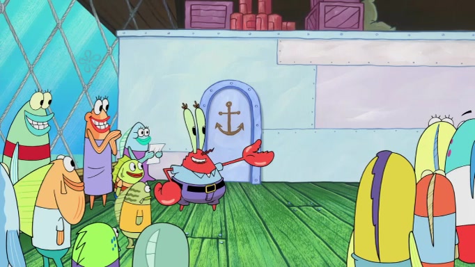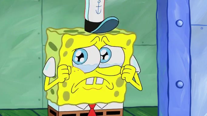 The next day, Kenny the Cat finally arrives and starts giving out autographs. SpongeBob asks Kenny to autograph his custom Kenny spatula. He then invites him to the Krusty Krab. Kenny arrives at the Krusty Krab and Mr. Krabs gives him free ketchup packets and an all-you-can-eat buffet in his honor. He begins to struggle, as he needs to take a breath. He draws a toilet, and runs to the restroom. In the bathroom, Kenny takes an oxygen tank out from behind his back and uses it to breathe. SpongeBob sees this and realizes that Kenny is a fraud after all. Kenny begs SpongeBob not to reveal his secret because he just wants to be special and SpongeBob agrees.