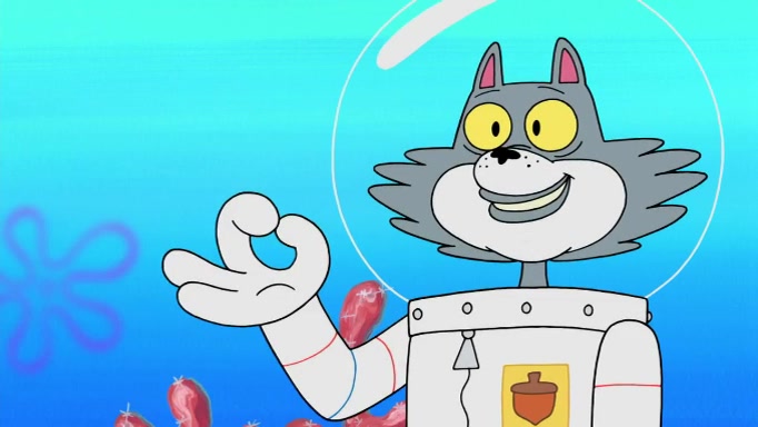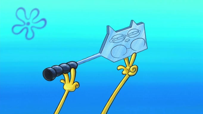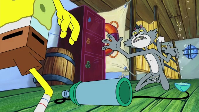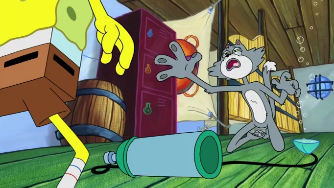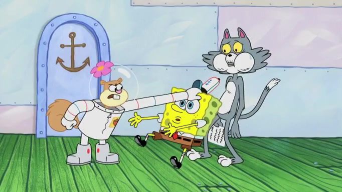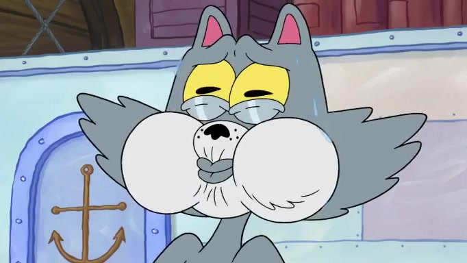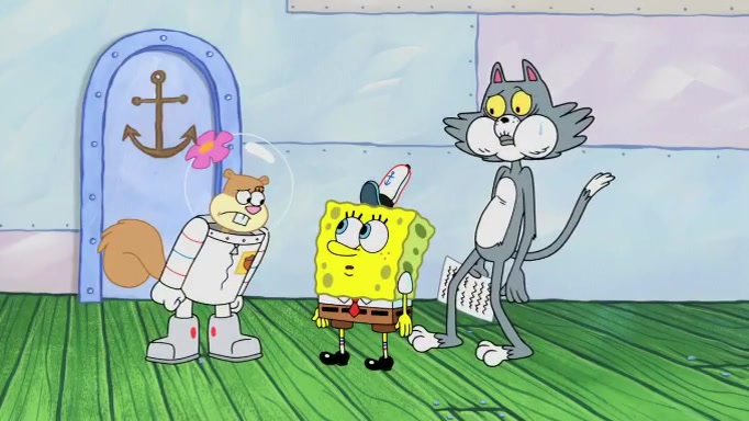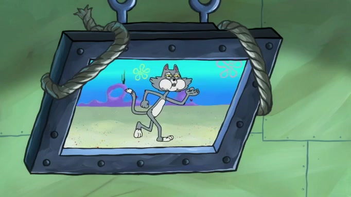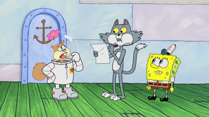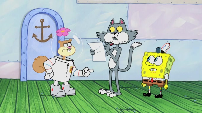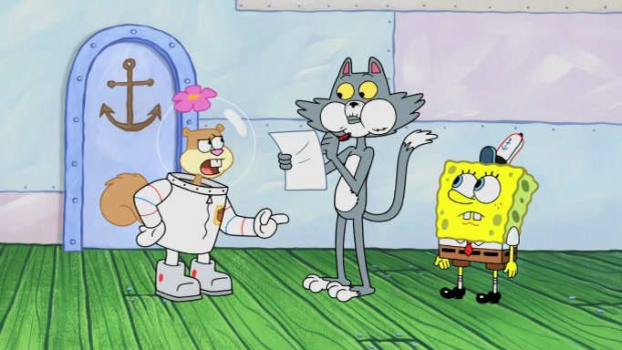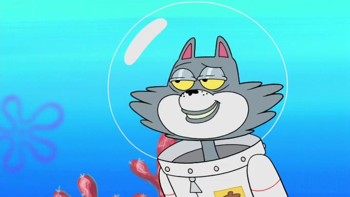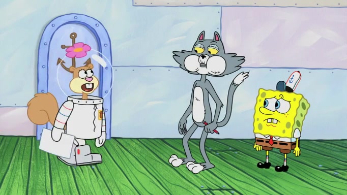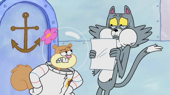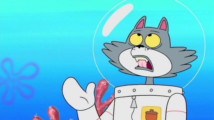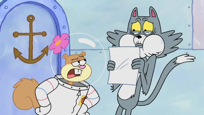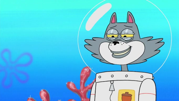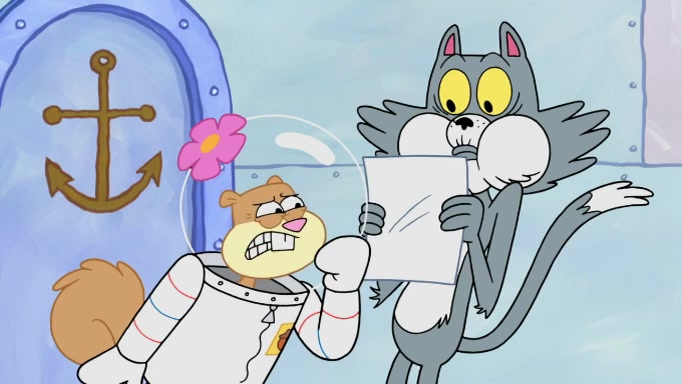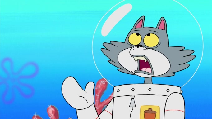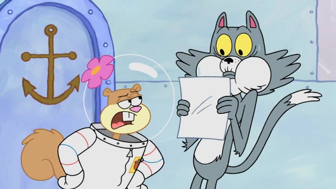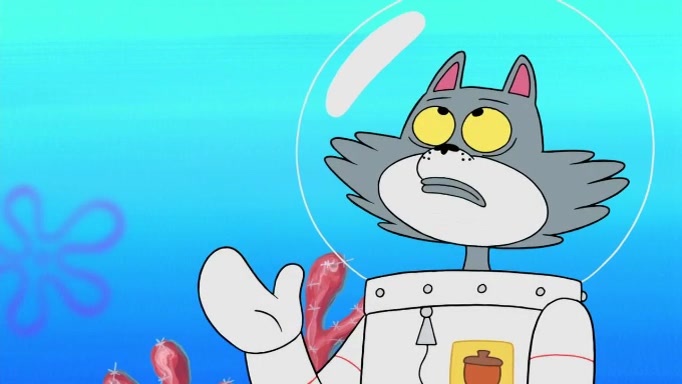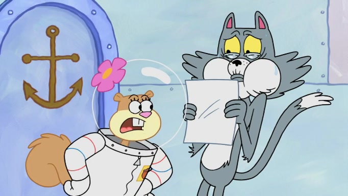 However, SpongeBob decides to help Kenny by giving him a suit and helmet. He decides that Kenny should become a famous cat who lives underwater (like Sandy does). Kenny thanks SpongeBob for helping him, but sadly Sandy arrives, kicks Kenny and sends him back home to the surface. Sandy mentions that you can never trust a cat, but gets confused, saying, "Or is it a dog?" The episode then ends.