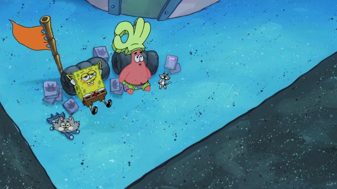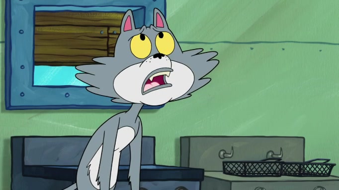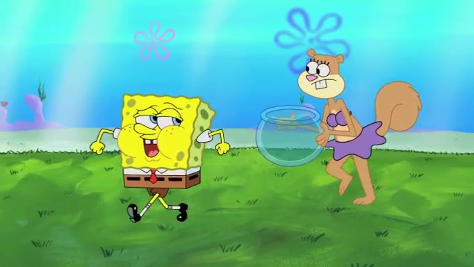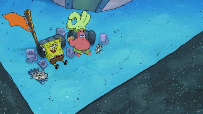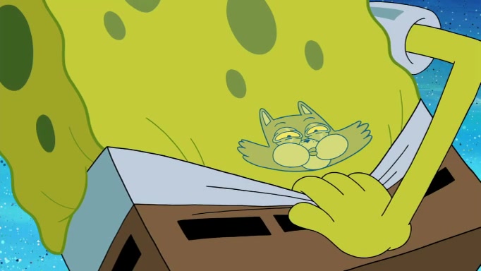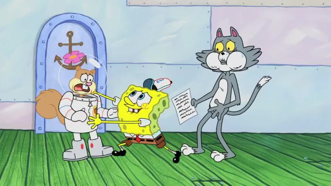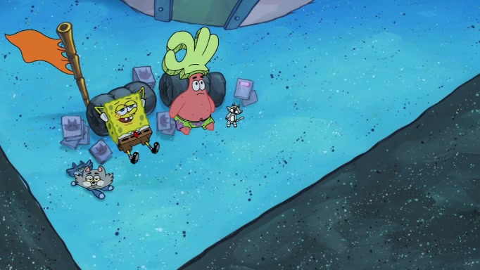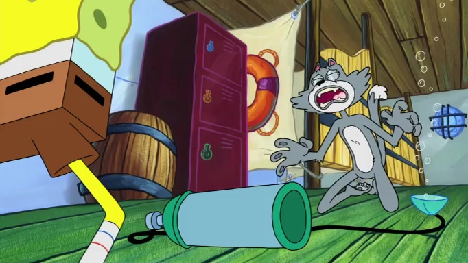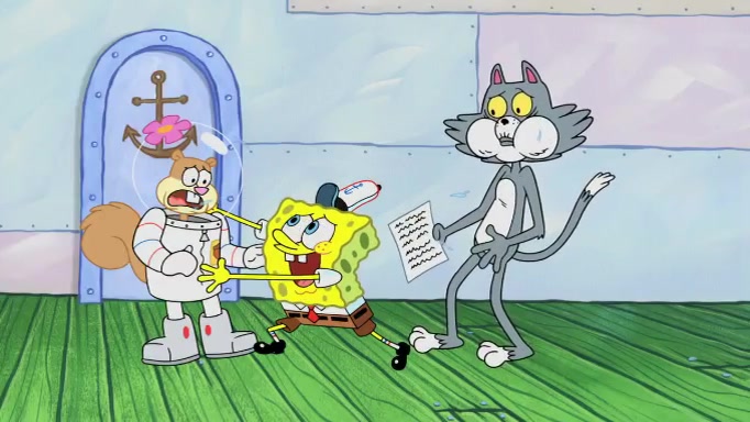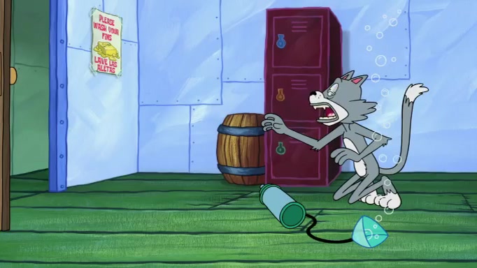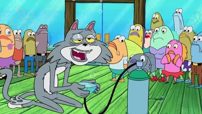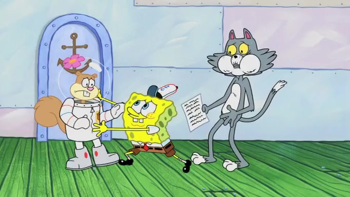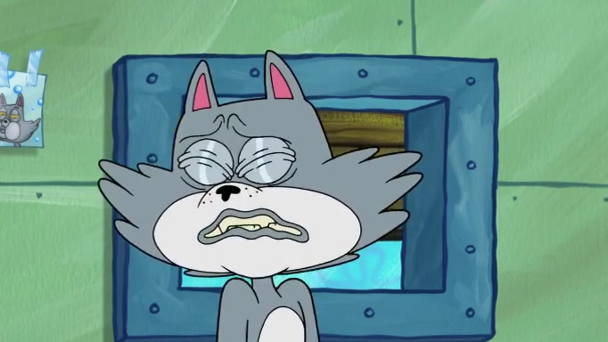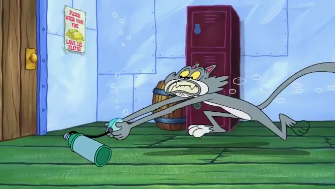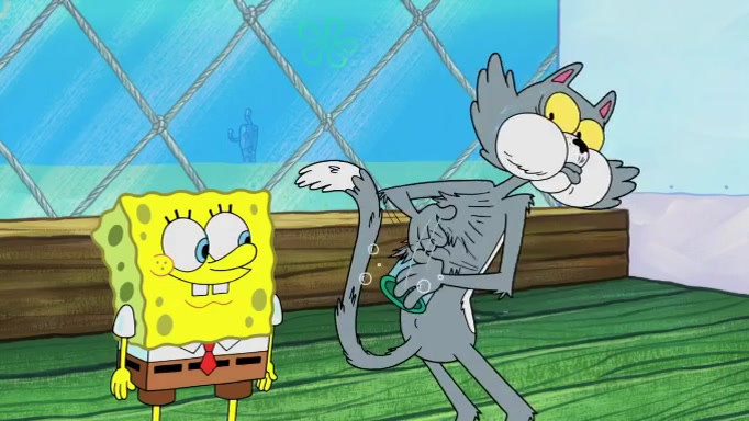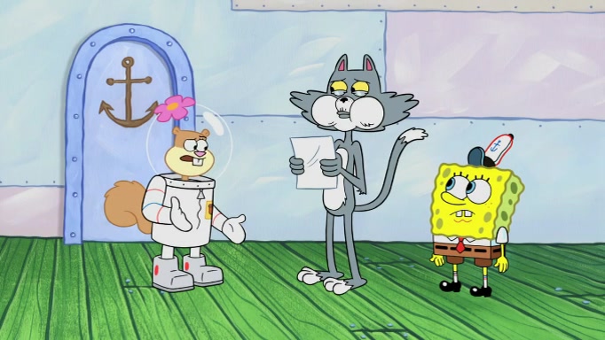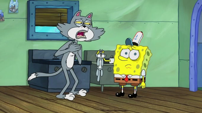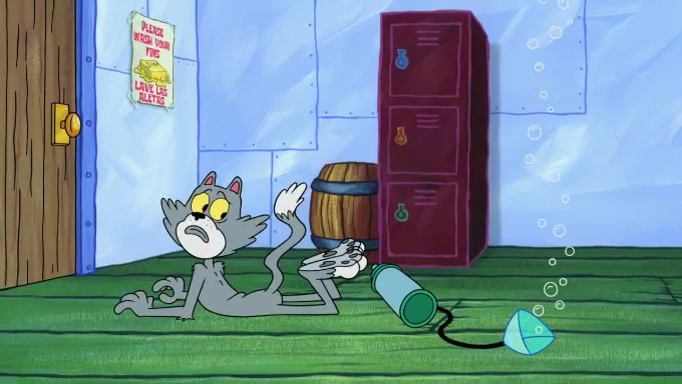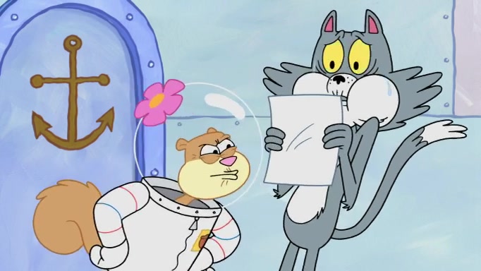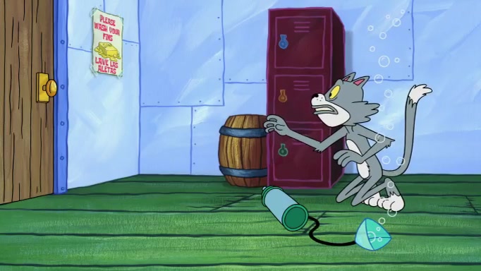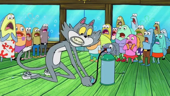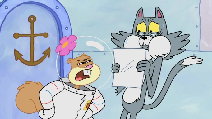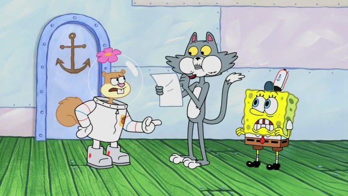 However, SpongeBob decides to help Kenny by giving him a suit and helmet. He decides that Kenny should become a famous cat who lives underwater (like Sandy does). Kenny thanks SpongeBob for helping him, but sadly Sandy arrives, kicks Kenny and sends him back home to the surface. Sandy mentions that you can never trust a cat, but gets confused, saying, "Or is it a dog?" The episode then ends.
