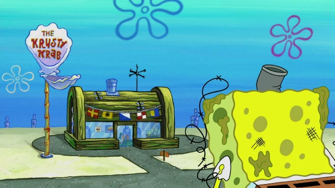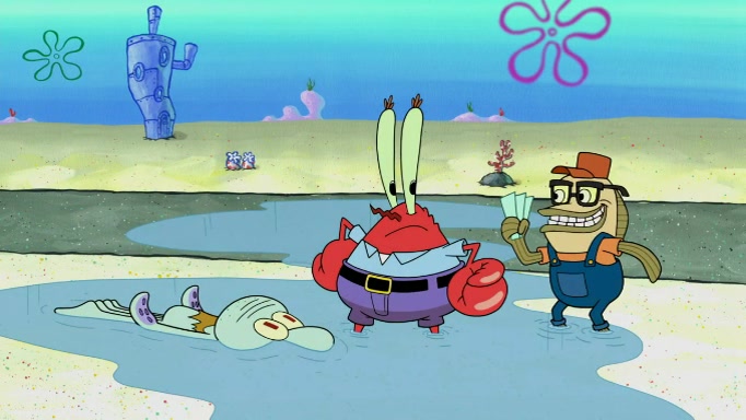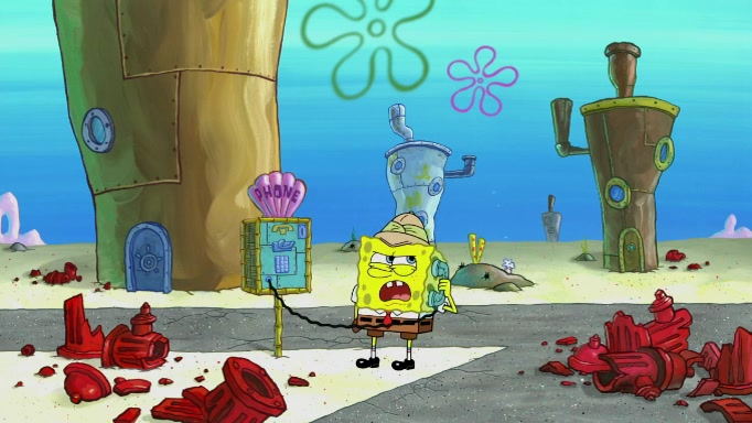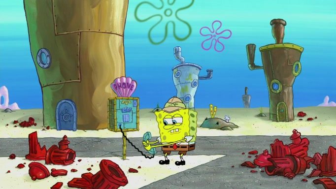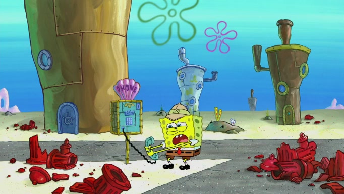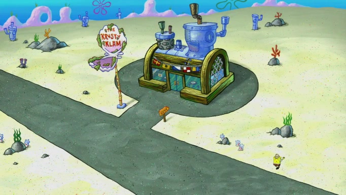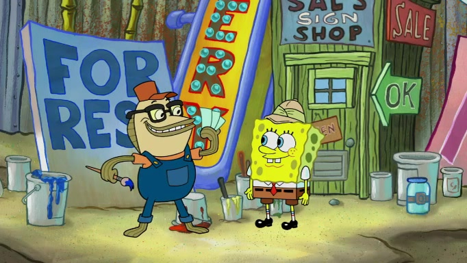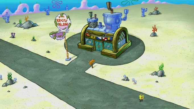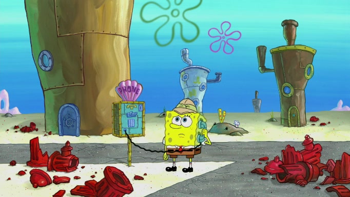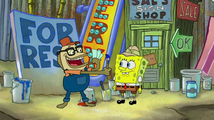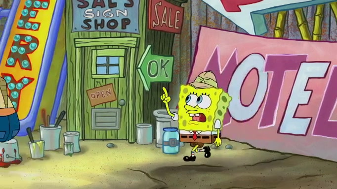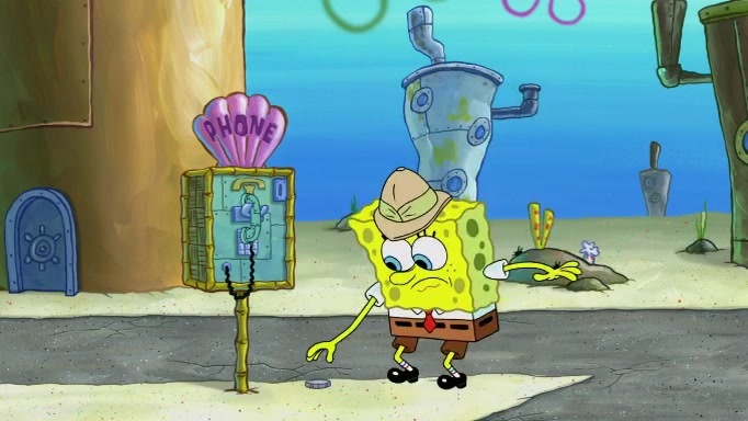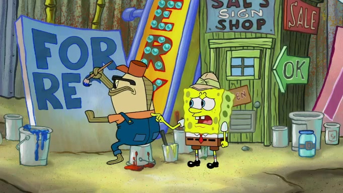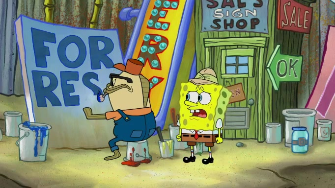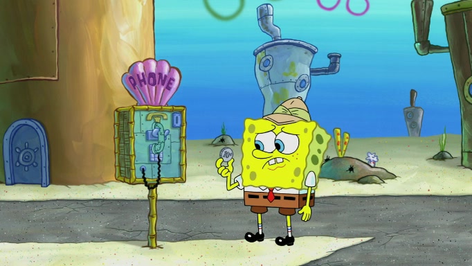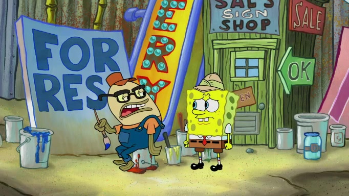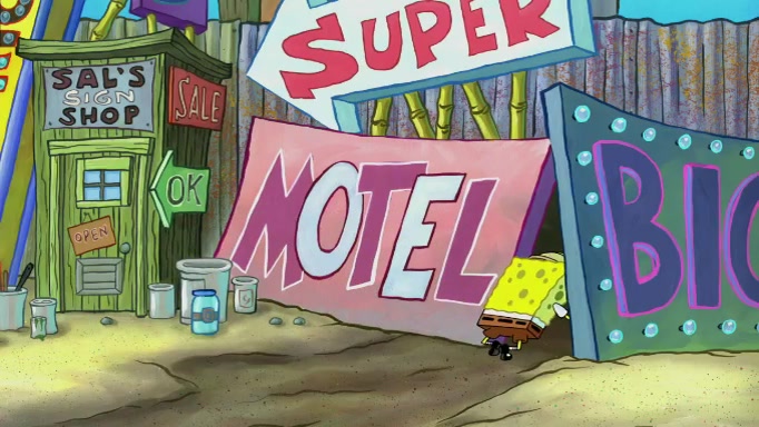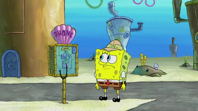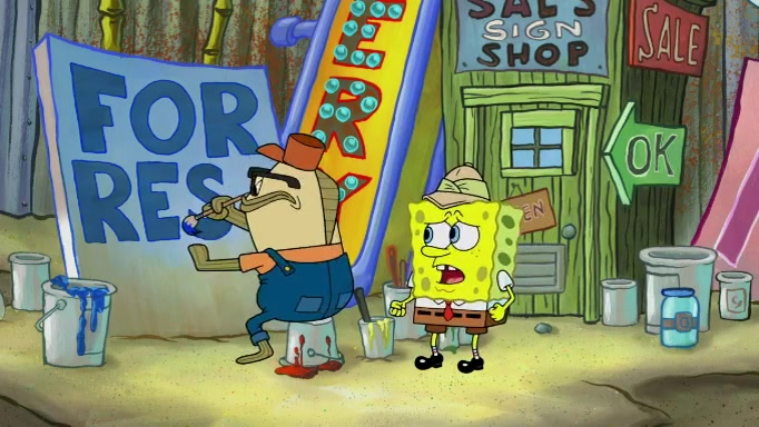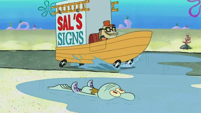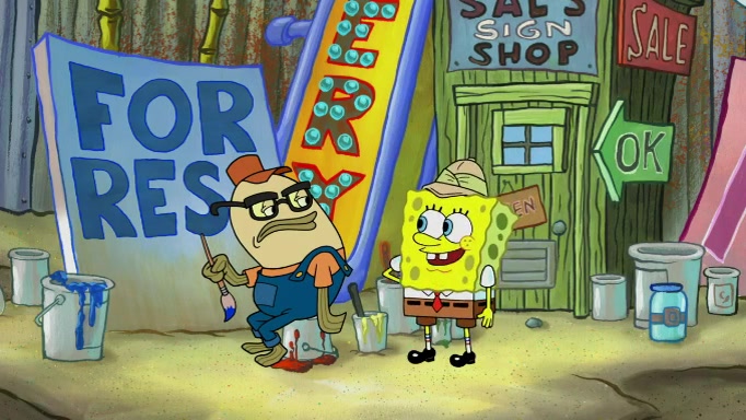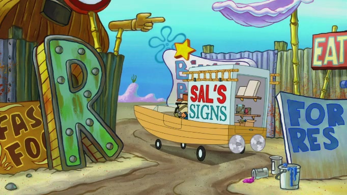 The scene cuts back to SpongeBob going toward what he thinks is The Krusty Krab but it turns out just to be a sign that says The Krabby Krust. He notices a guy painting signs and asks him if he knew where the Krusty Krab was, but the guy, Sal, says he's never heard of it. SpongeBob told him about it and gives him coupons and then Sal goes there on his truck even though he said he didn't know that place. SpongeBob cries and remembers to use his landmarks and then tries to go back where he came from but can't remember too well. He finds the broken fire hydrant he found previously but then notices many broken fire hydrants. SpongeBob finds a pay phone and calls Squidward and asks what he should do. The operator interrupts the call and tells him if he wants to continue the call he needs to insert another dime but he doesn't have one. He spots an abandoned sofa and then sees three tough-looking fish drinking soda and SpongeBob tries to reach under the the cushions of the sofa to see if there are any dimes but instead finds two nickels and then one of the fish, Scott, asks him what he was doing and SpongeBob tells him that he is looking for a dime. Scott shouts at SpongeBob and says that he drives a pedicab so SpongeBob hops into the pedicab and tells him that he needs to go to the Krusty Krab so Scott drops off to what he thinks is The Krusty Krab but it turns out to be at The Krusty Klam. SpongeBob began frantically running and checks his clock and then starts to make another shortcut which causes him great pain but finally finds the Krusty Krab. He crawls to it and enters, and then hugs two customers. He finds Patrick there and SpongeBob asks Patrick how he got to The Krusty Krab and Patrick says that Scott gave him a ride. Mr. Krabs appears and says that SpongeBob is scaring his customers away and then tells SpongeBob to go home and take a bath. Squidward says that it was his thing. Mr. Krabs says that he is clean and then Squidward starts to roll around on the dirt and asks where his bubble bath was. Then Sal comes to The Krusty Krab on his truck and runs over a puddle which splashes on Squidward. Sal asks about the coupon but Mr. Krabs says it's actually another fee. Mr. Krabs and Sal walk off screen with Squidward still in the puddle and then the episode ends.