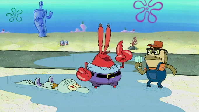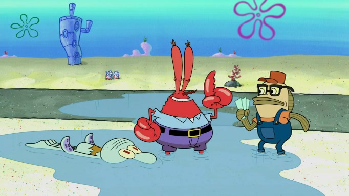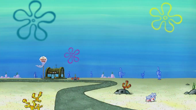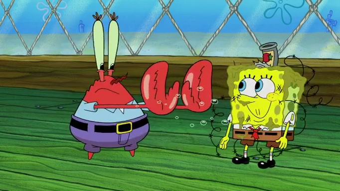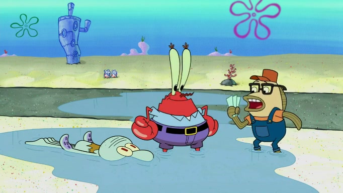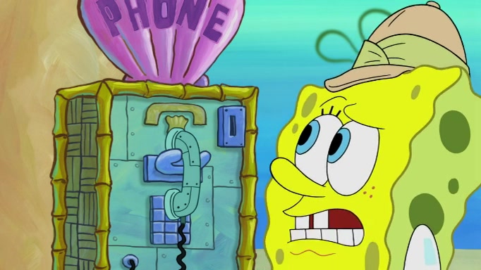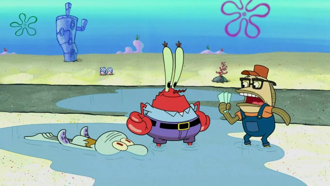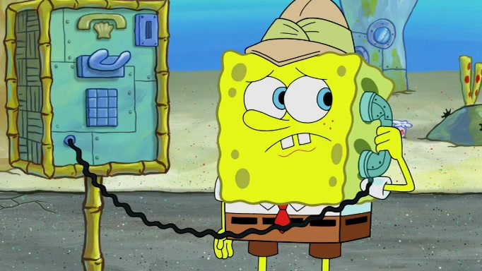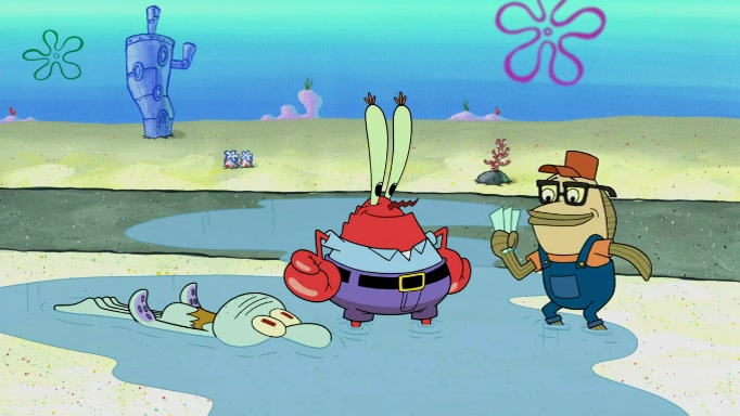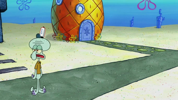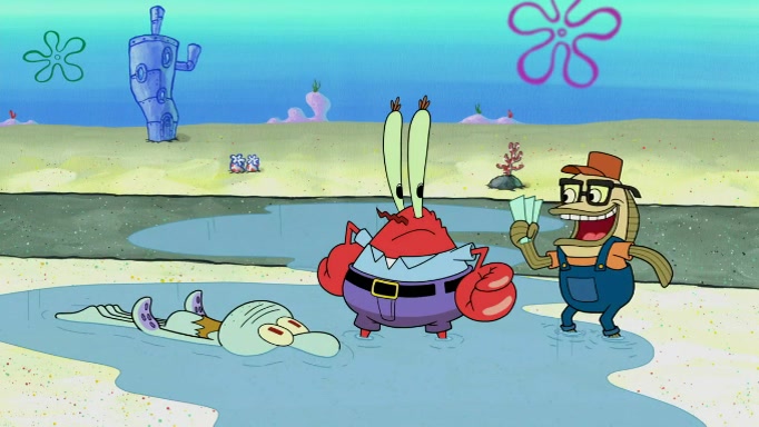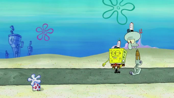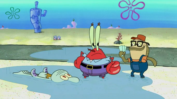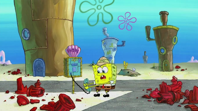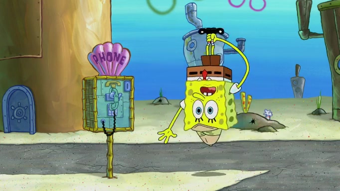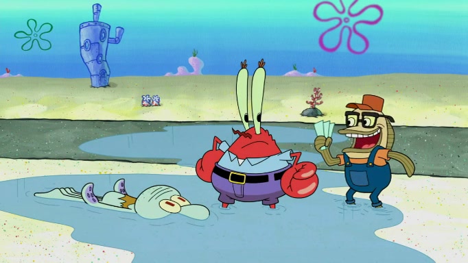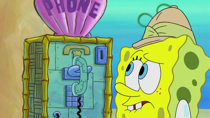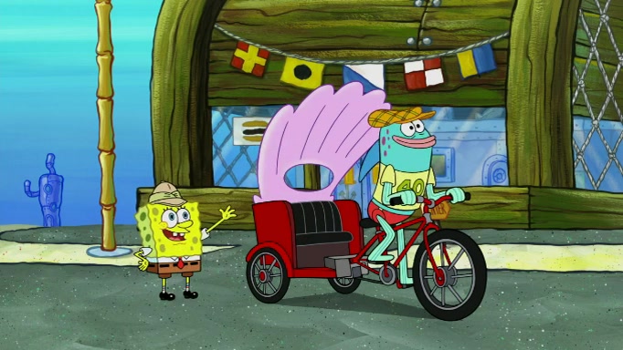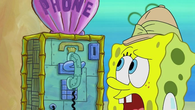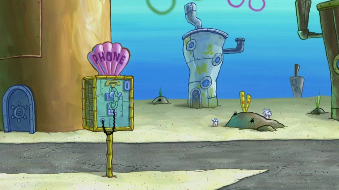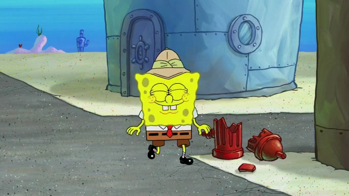 The scene cuts back to SpongeBob going toward what he thinks is The Krusty Krab but it turns out just to be a sign that says The Krabby Krust. He notices a guy painting signs and asks him if he knew where the Krusty Krab was, but the guy, Sal, says he's never heard of it. SpongeBob told him about it and gives him coupons and then Sal goes there on his truck even though he said he didn't know that place. SpongeBob cries and remembers to use his landmarks and then tries to go back where he came from but can't remember too well. He finds the broken fire hydrant he found previously but then notices many broken fire hydrants. SpongeBob finds a pay phone and calls Squidward and asks what he should do. The operator interrupts the call and tells him if he wants to continue the call he needs to insert another dime but he doesn't have one. He spots an abandoned sofa and then sees three tough-looking fish drinking soda and SpongeBob tries to reach under the the cushions of the sofa to see if there are any dimes but instead finds two nickels and then one of the fish, Scott, asks him what he was doing and SpongeBob tells him that he is looking for a dime. Scott shouts at SpongeBob and says that he drives a pedicab so SpongeBob hops into the pedicab and tells him that he needs to go to the Krusty Krab so Scott drops off to what he thinks is The Krusty Krab but it turns out to be at The Krusty Klam. SpongeBob began frantically running and checks his clock and then starts to make another shortcut which causes him great pain but finally finds the Krusty Krab. He crawls to it and enters, and then hugs two customers. He finds Patrick there and SpongeBob asks Patrick how he got to The Krusty Krab and Patrick says that Scott gave him a ride. Mr. Krabs appears and says that SpongeBob is scaring his customers away and then tells SpongeBob to go home and take a bath. Squidward says that it was his thing. Mr. Krabs says that he is clean and then Squidward starts to roll around on the dirt and asks where his bubble bath was. Then Sal comes to The Krusty Krab on his truck and runs over a puddle which splashes on Squidward. Sal asks about the coupon but Mr. Krabs says it's actually another fee. Mr. Krabs and Sal walk off screen with Squidward still in the puddle and then the episode ends.