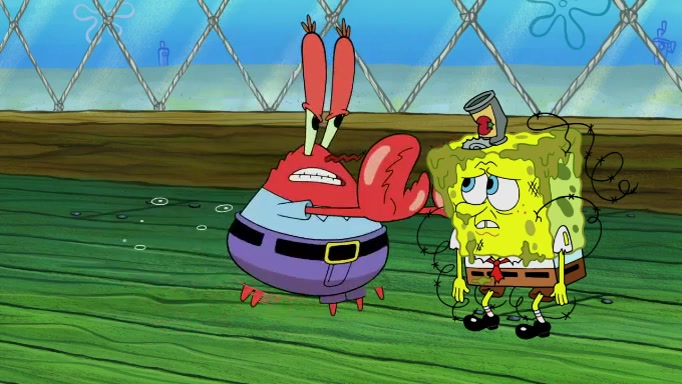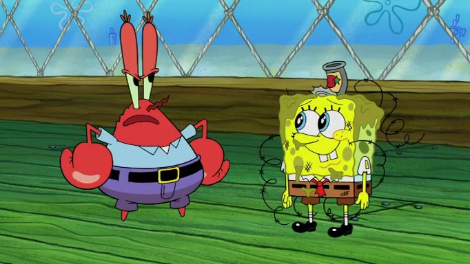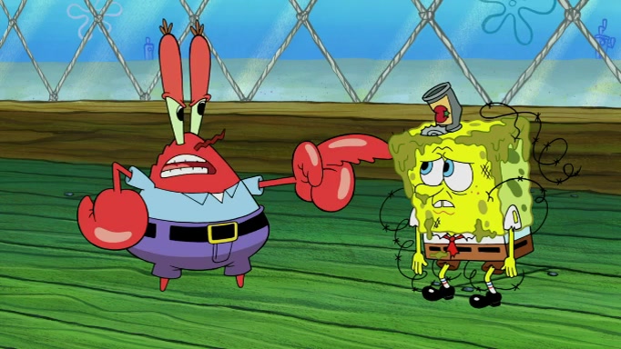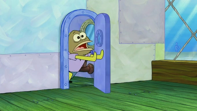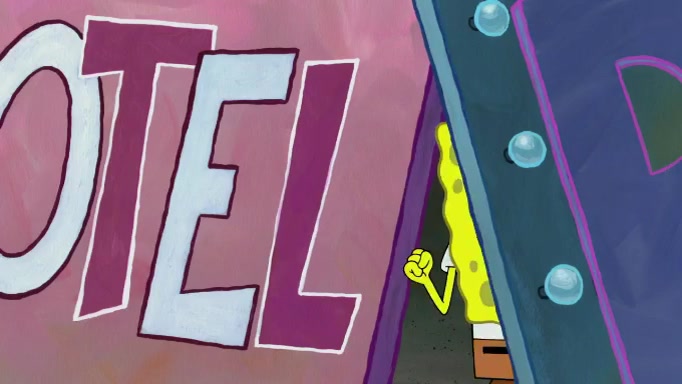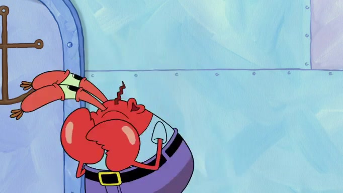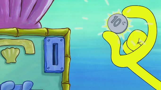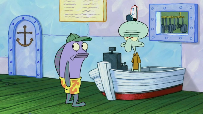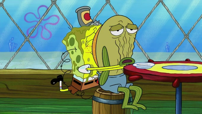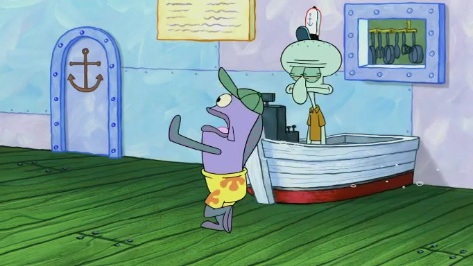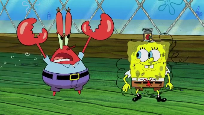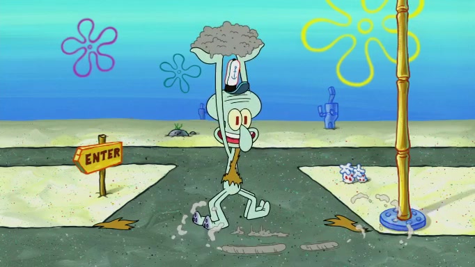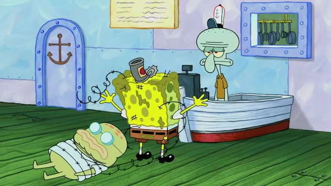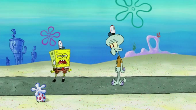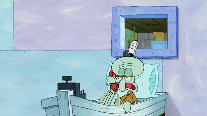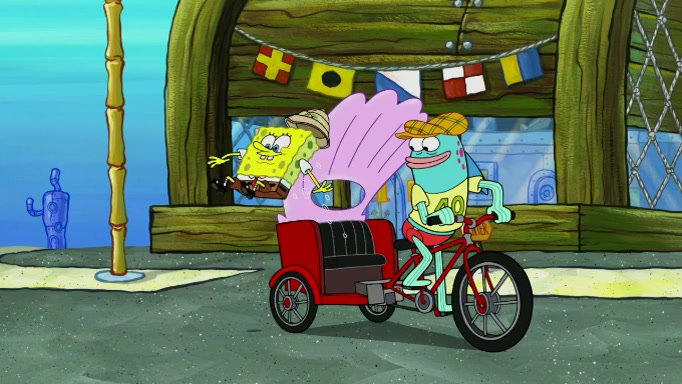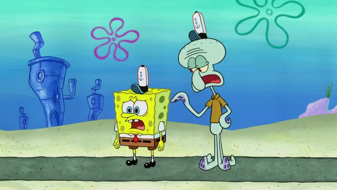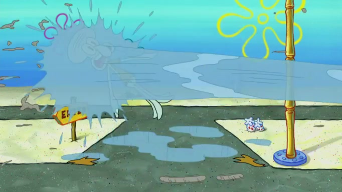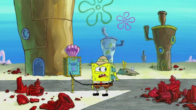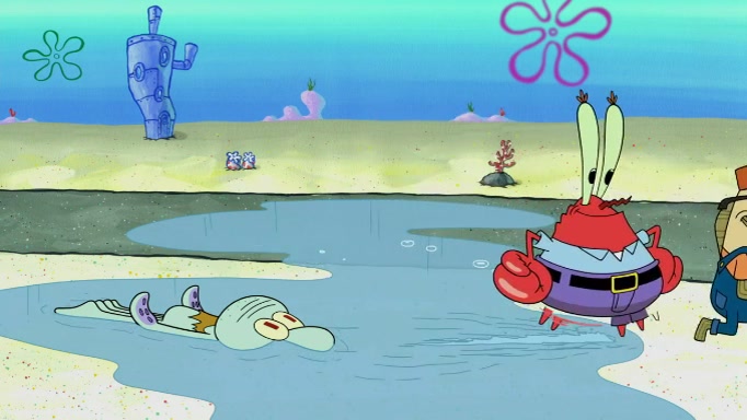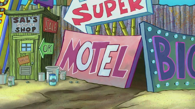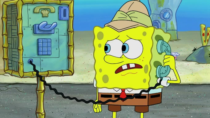 The scene cuts back to SpongeBob going toward what he thinks is The Krusty Krab but it turns out just to be a sign that says The Krabby Krust. He notices a guy painting signs and asks him if he knew where the Krusty Krab was, but the guy, Sal, says he's never heard of it. SpongeBob told him about it and gives him coupons and then Sal goes there on his truck even though he said he didn't know that place. SpongeBob cries and remembers to use his landmarks and then tries to go back where he came from but can't remember too well. He finds the broken fire hydrant he found previously but then notices many broken fire hydrants. SpongeBob finds a pay phone and calls Squidward and asks what he should do. The operator interrupts the call and tells him if he wants to continue the call he needs to insert another dime but he doesn't have one. He spots an abandoned sofa and then sees three tough-looking fish drinking soda and SpongeBob tries to reach under the the cushions of the sofa to see if there are any dimes but instead finds two nickels and then one of the fish, Scott, asks him what he was doing and SpongeBob tells him that he is looking for a dime. Scott shouts at SpongeBob and says that he drives a pedicab so SpongeBob hops into the pedicab and tells him that he needs to go to the Krusty Krab so Scott drops off to what he thinks is The Krusty Krab but it turns out to be at The Krusty Klam. SpongeBob began frantically running and checks his clock and then starts to make another shortcut which causes him great pain but finally finds the Krusty Krab. He crawls to it and enters, and then hugs two customers. He finds Patrick there and SpongeBob asks Patrick how he got to The Krusty Krab and Patrick says that Scott gave him a ride. Mr. Krabs appears and says that SpongeBob is scaring his customers away and then tells SpongeBob to go home and take a bath. Squidward says that it was his thing. Mr. Krabs says that he is clean and then Squidward starts to roll around on the dirt and asks where his bubble bath was. Then Sal comes to The Krusty Krab on his truck and runs over a puddle which splashes on Squidward. Sal asks about the coupon but Mr. Krabs says it's actually another fee. Mr. Krabs and Sal walk off screen with Squidward still in the puddle and then the episode ends.