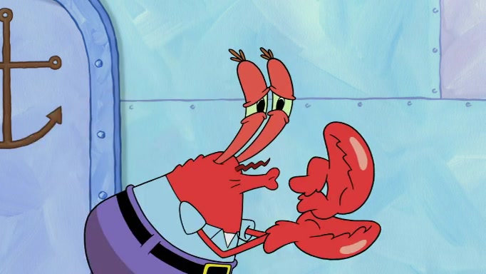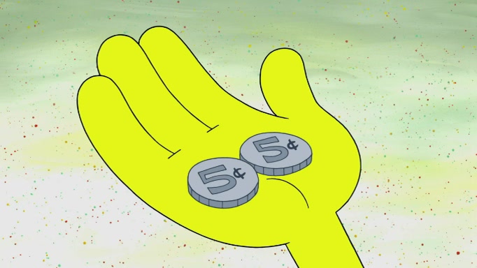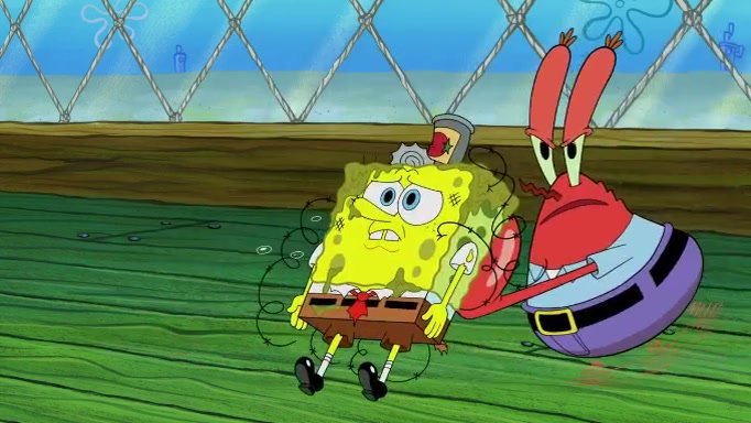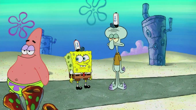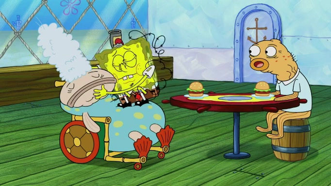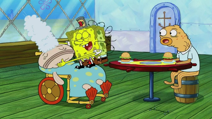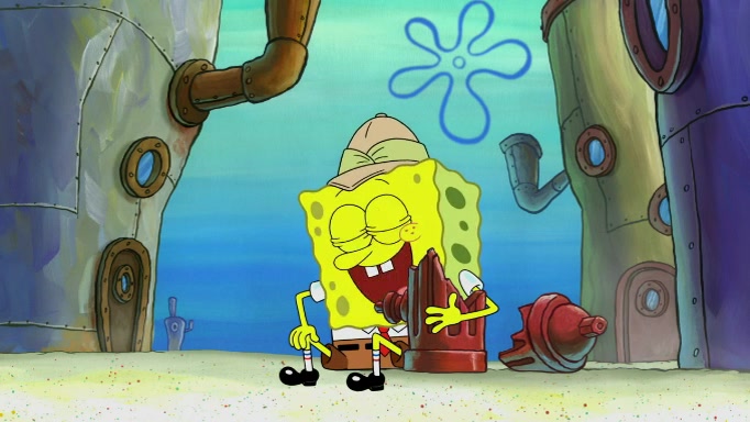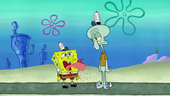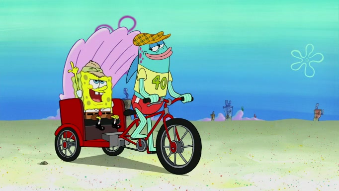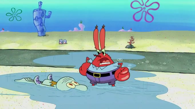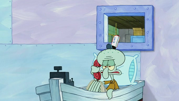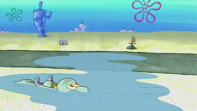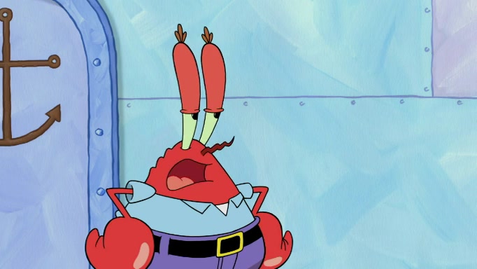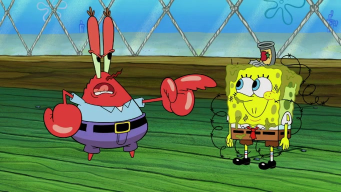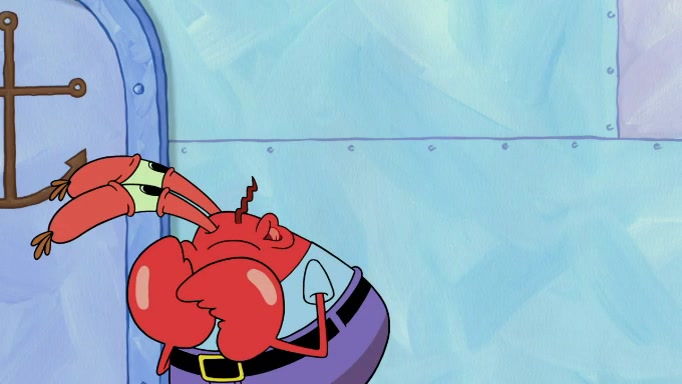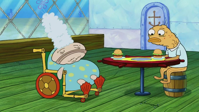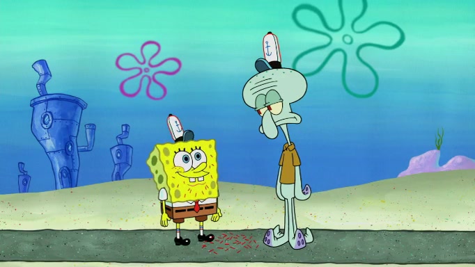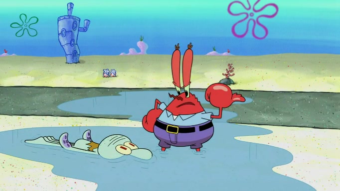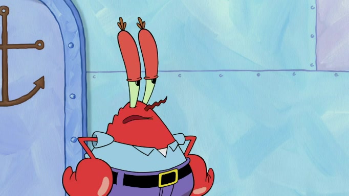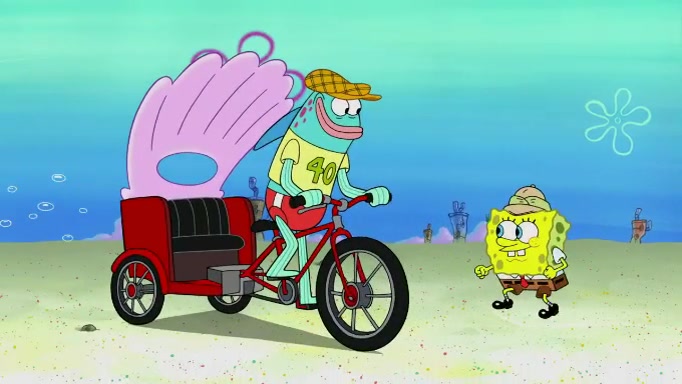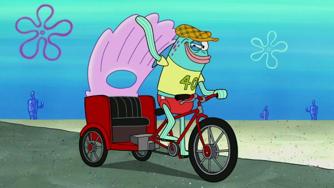 The scene cuts back to SpongeBob going toward what he thinks is The Krusty Krab but it turns out just to be a sign that says The Krabby Krust. He notices a guy painting signs and asks him if he knew where the Krusty Krab was, but the guy, Sal, says he's never heard of it. SpongeBob told him about it and gives him coupons and then Sal goes there on his truck even though he said he didn't know that place. SpongeBob cries and remembers to use his landmarks and then tries to go back where he came from but can't remember too well. He finds the broken fire hydrant he found previously but then notices many broken fire hydrants. SpongeBob finds a pay phone and calls Squidward and asks what he should do. The operator interrupts the call and tells him if he wants to continue the call he needs to insert another dime but he doesn't have one. He spots an abandoned sofa and then sees three tough-looking fish drinking soda and SpongeBob tries to reach under the the cushions of the sofa to see if there are any dimes but instead finds two nickels and then one of the fish, Scott, asks him what he was doing and SpongeBob tells him that he is looking for a dime. Scott shouts at SpongeBob and says that he drives a pedicab so SpongeBob hops into the pedicab and tells him that he needs to go to the Krusty Krab so Scott drops off to what he thinks is The Krusty Krab but it turns out to be at The Krusty Klam. SpongeBob began frantically running and checks his clock and then starts to make another shortcut which causes him great pain but finally finds the Krusty Krab. He crawls to it and enters, and then hugs two customers. He finds Patrick there and SpongeBob asks Patrick how he got to The Krusty Krab and Patrick says that Scott gave him a ride. Mr. Krabs appears and says that SpongeBob is scaring his customers away and then tells SpongeBob to go home and take a bath. Squidward says that it was his thing. Mr. Krabs says that he is clean and then Squidward starts to roll around on the dirt and asks where his bubble bath was. Then Sal comes to The Krusty Krab on his truck and runs over a puddle which splashes on Squidward. Sal asks about the coupon but Mr. Krabs says it's actually another fee. Mr. Krabs and Sal walk off screen with Squidward still in the puddle and then the episode ends.