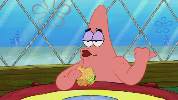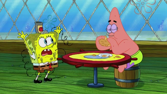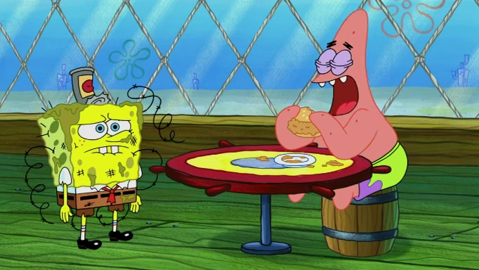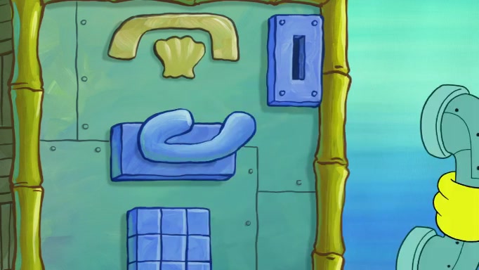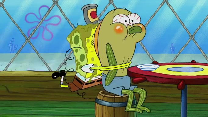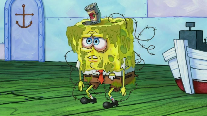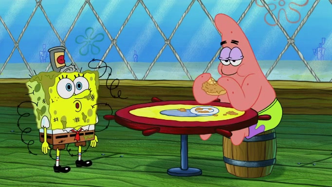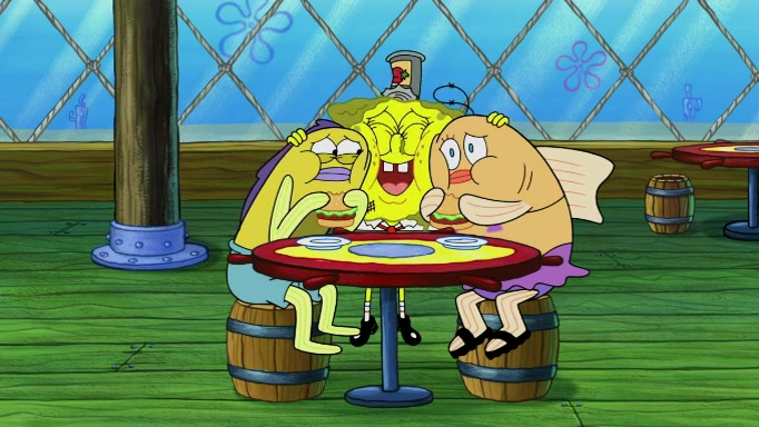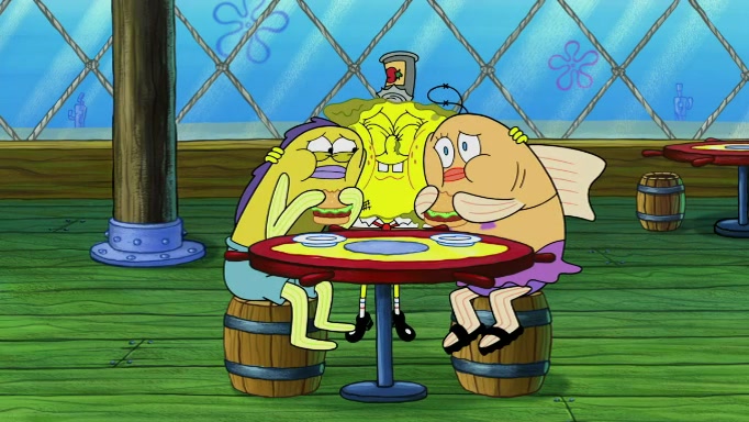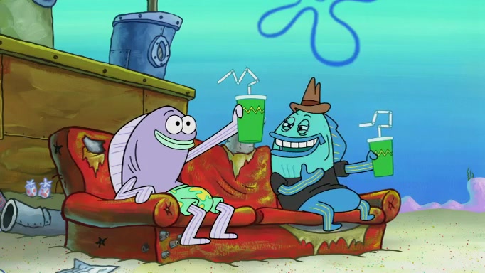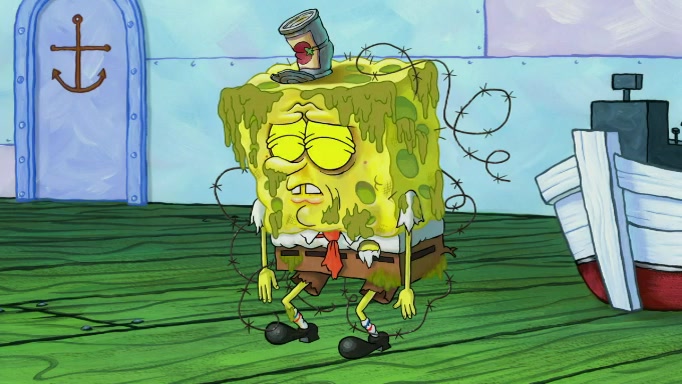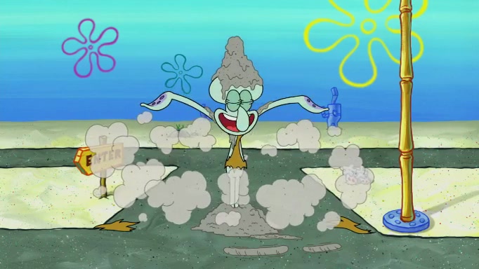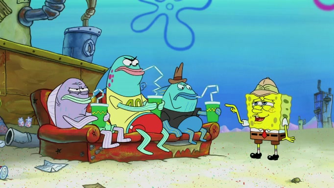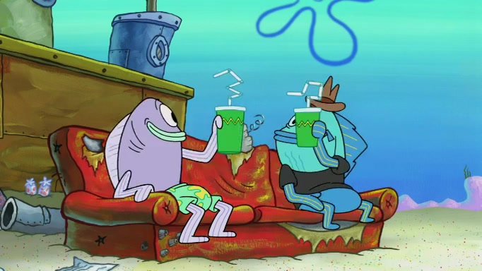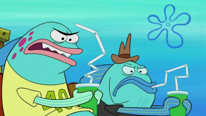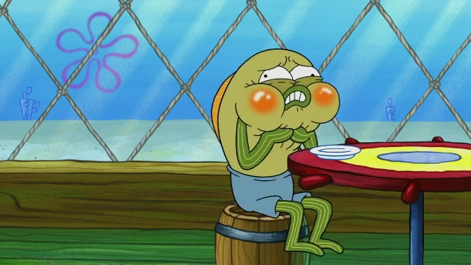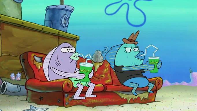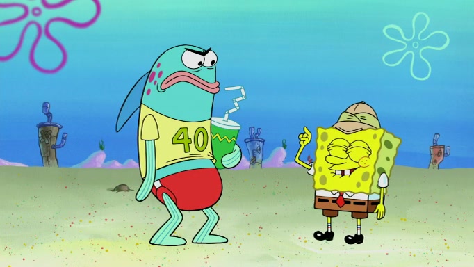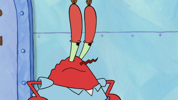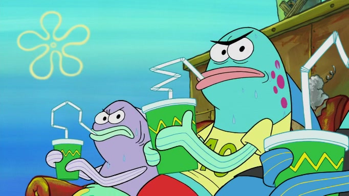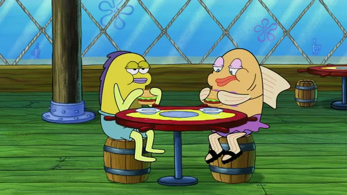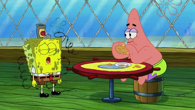 The scene cuts back to SpongeBob going toward what he thinks is The Krusty Krab but it turns out just to be a sign that says The Krabby Krust. He notices a guy painting signs and asks him if he knew where the Krusty Krab was, but the guy, Sal, says he's never heard of it. SpongeBob told him about it and gives him coupons and then Sal goes there on his truck even though he said he didn't know that place. SpongeBob cries and remembers to use his landmarks and then tries to go back where he came from but can't remember too well. He finds the broken fire hydrant he found previously but then notices many broken fire hydrants. SpongeBob finds a pay phone and calls Squidward and asks what he should do. The operator interrupts the call and tells him if he wants to continue the call he needs to insert another dime but he doesn't have one. He spots an abandoned sofa and then sees three tough-looking fish drinking soda and SpongeBob tries to reach under the the cushions of the sofa to see if there are any dimes but instead finds two nickels and then one of the fish, Scott, asks him what he was doing and SpongeBob tells him that he is looking for a dime. Scott shouts at SpongeBob and says that he drives a pedicab so SpongeBob hops into the pedicab and tells him that he needs to go to the Krusty Krab so Scott drops off to what he thinks is The Krusty Krab but it turns out to be at The Krusty Klam. SpongeBob began frantically running and checks his clock and then starts to make another shortcut which causes him great pain but finally finds the Krusty Krab. He crawls to it and enters, and then hugs two customers. He finds Patrick there and SpongeBob asks Patrick how he got to The Krusty Krab and Patrick says that Scott gave him a ride. Mr. Krabs appears and says that SpongeBob is scaring his customers away and then tells SpongeBob to go home and take a bath. Squidward says that it was his thing. Mr. Krabs says that he is clean and then Squidward starts to roll around on the dirt and asks where his bubble bath was. Then Sal comes to The Krusty Krab on his truck and runs over a puddle which splashes on Squidward. Sal asks about the coupon but Mr. Krabs says it's actually another fee. Mr. Krabs and Sal walk off screen with Squidward still in the puddle and then the episode ends.