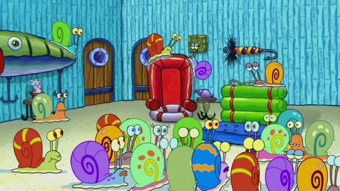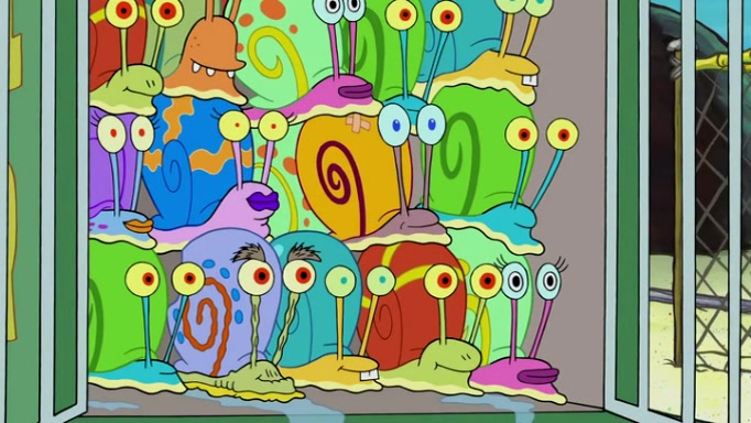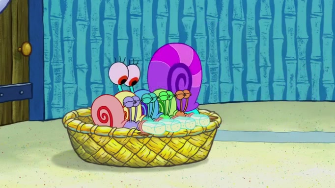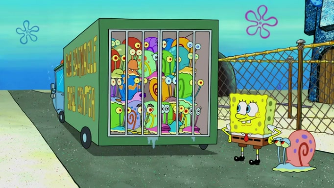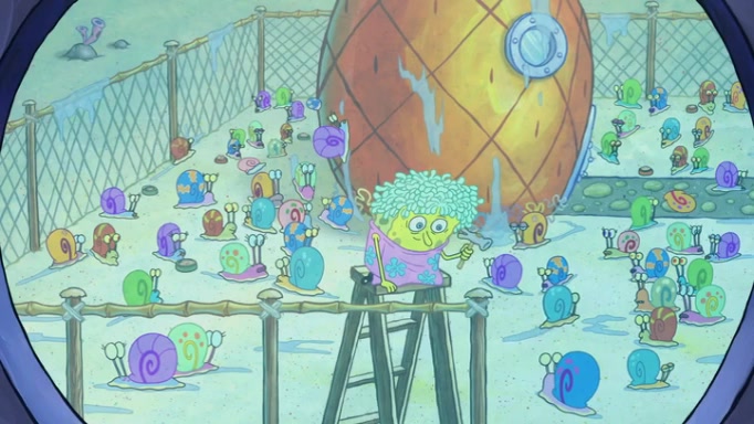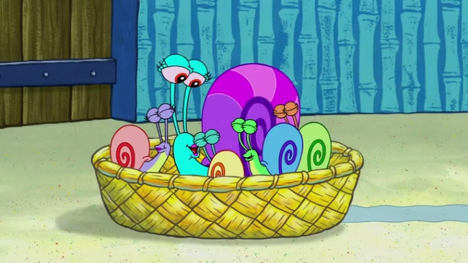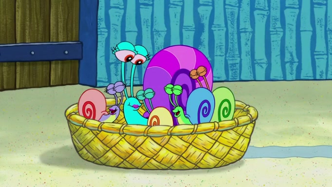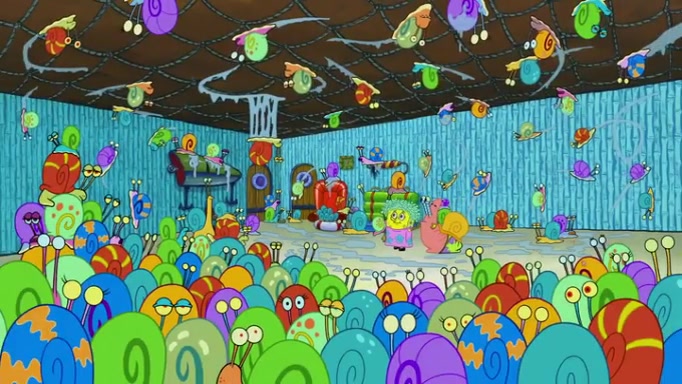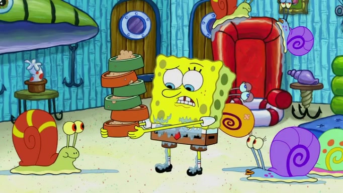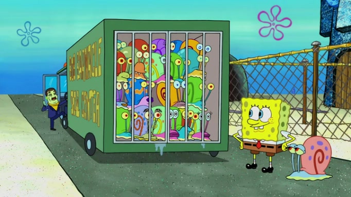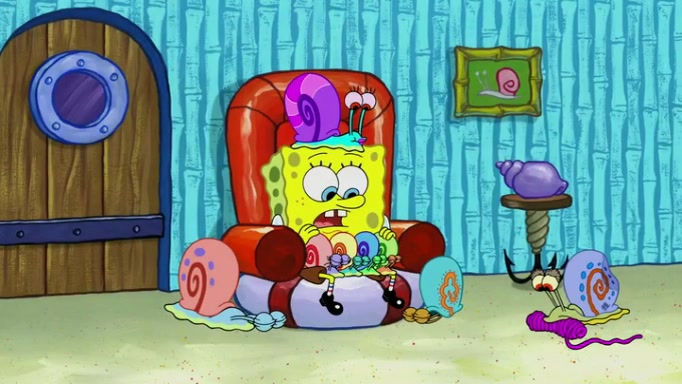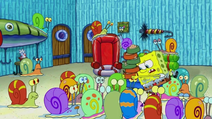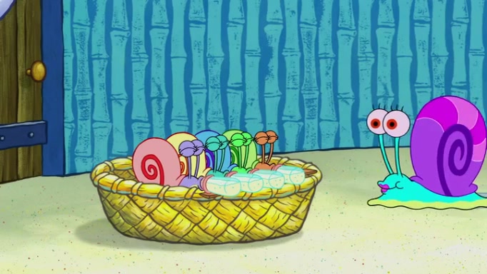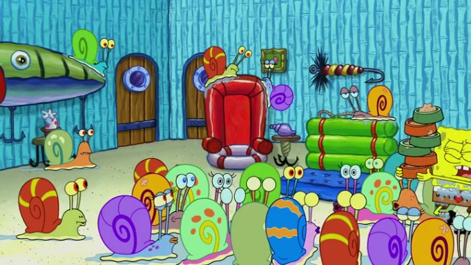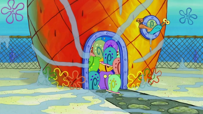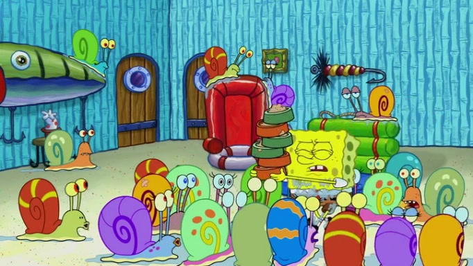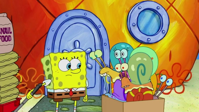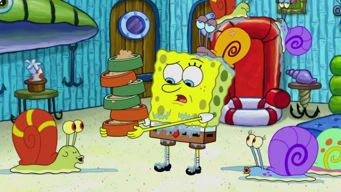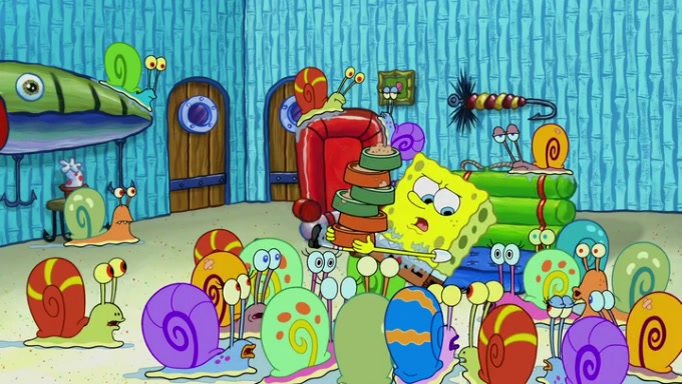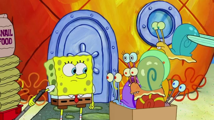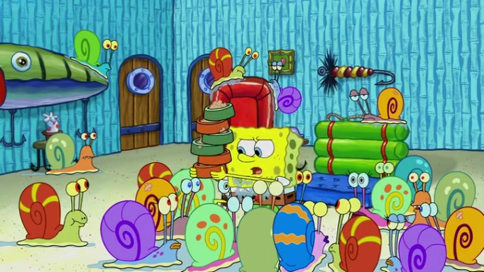 It is a sunny day and SpongeBob is taking Gary for a walk when he hears a meow from nearby. He then sees it and takes him home after naming him Senior Poopus. After he takes him home, Senior Poopus seems very happy and comfortable. Patrick then arrives and tells SpongeBob about the baby snails he left behind. SpongeBob quickly goes back to look and, sure enough, finds them. After taking them home and putting them under a heated blanket and giving them milk, another snail then bursts in and walks over SpongeBob right to the babies, apparently being the mother. Later, Another guy drops off a stray snail, saying "Thanks, snail guy!" Not long after that, there is a whole line of people waiting to give SpongeBob their snails, and SpongeBob eventually ends up with over 230 snails.