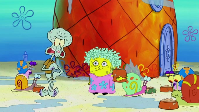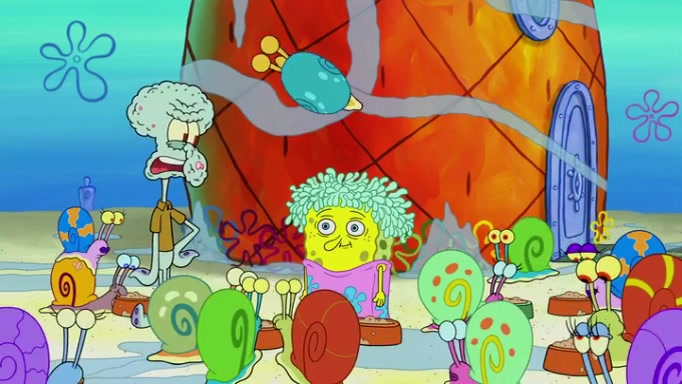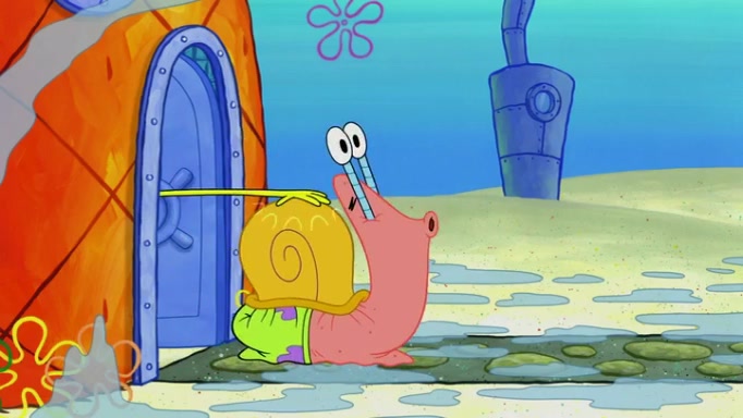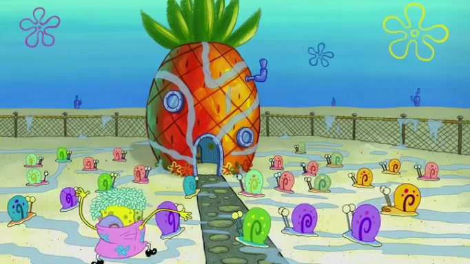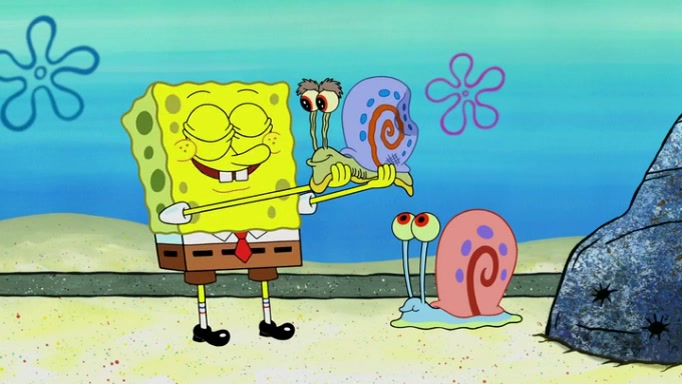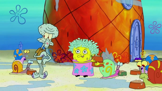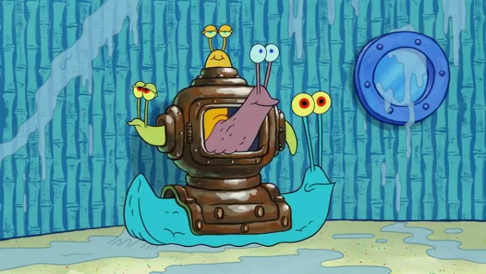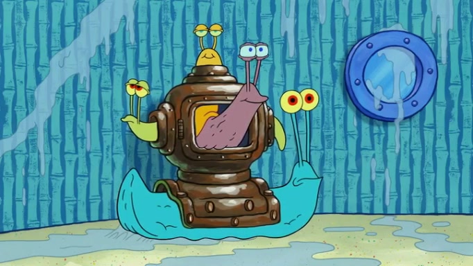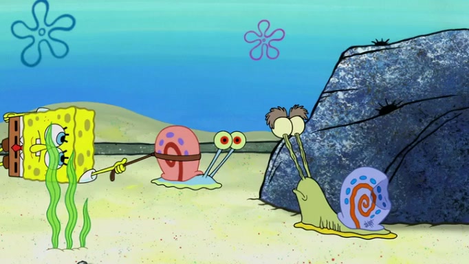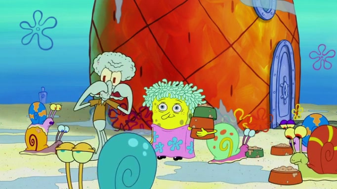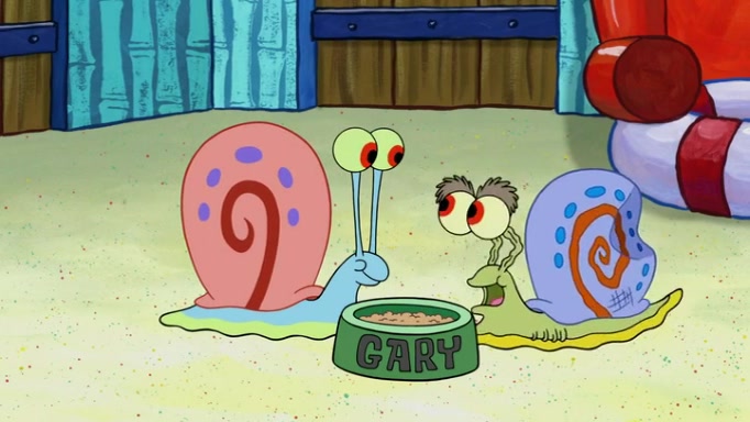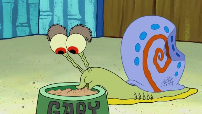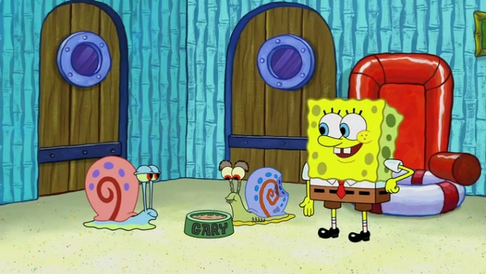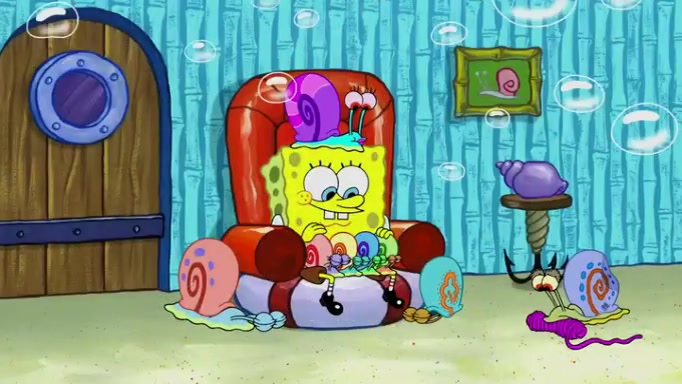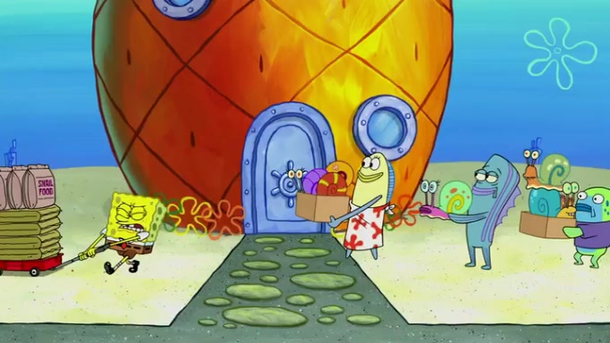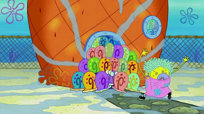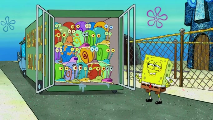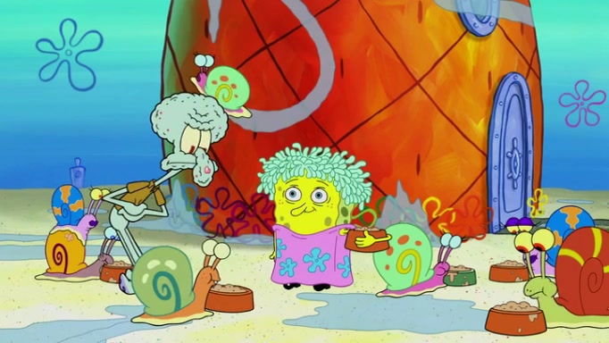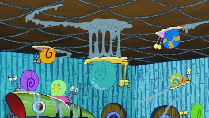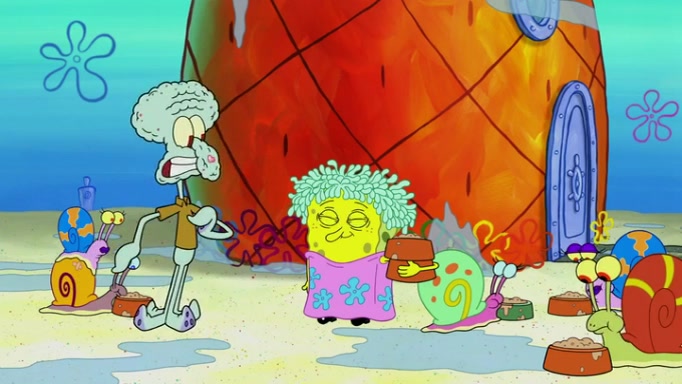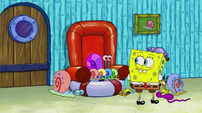 It is a sunny day and SpongeBob is taking Gary for a walk when he hears a meow from nearby. He then sees it and takes him home after naming him Senior Poopus. After he takes him home, Senior Poopus seems very happy and comfortable. Patrick then arrives and tells SpongeBob about the baby snails he left behind. SpongeBob quickly goes back to look and, sure enough, finds them. After taking them home and putting them under a heated blanket and giving them milk, another snail then bursts in and walks over SpongeBob right to the babies, apparently being the mother. Later, Another guy drops off a stray snail, saying "Thanks, snail guy!" Not long after that, there is a whole line of people waiting to give SpongeBob their snails, and SpongeBob eventually ends up with over 230 snails.