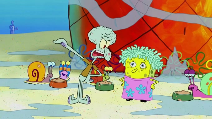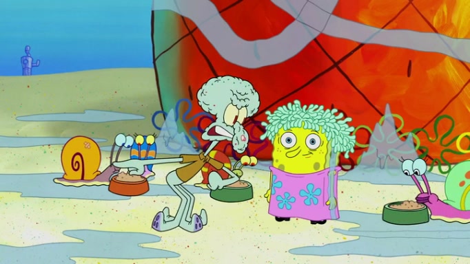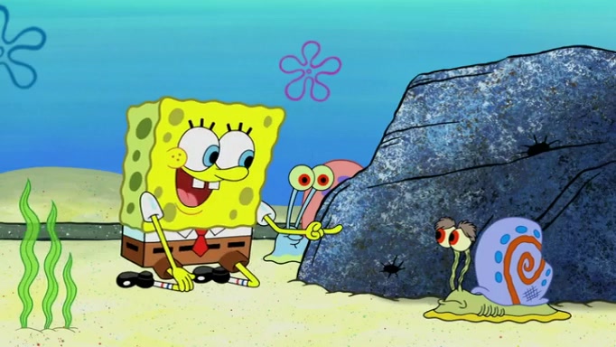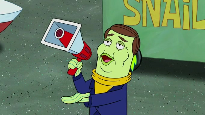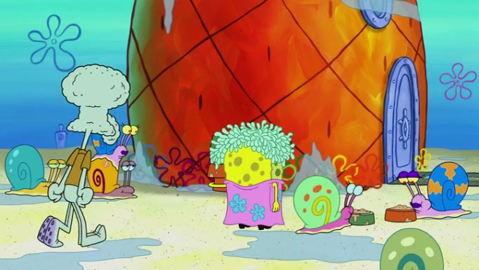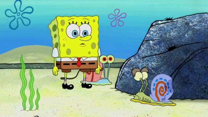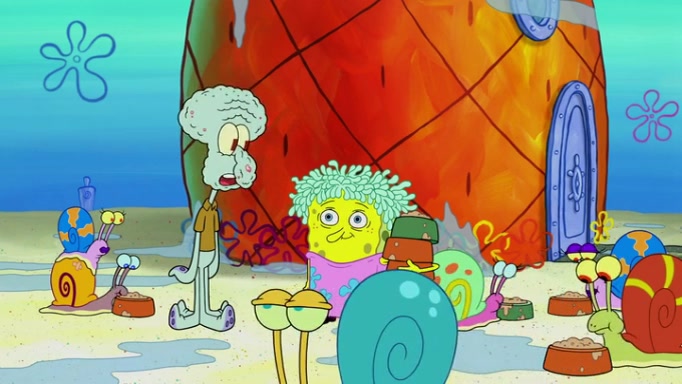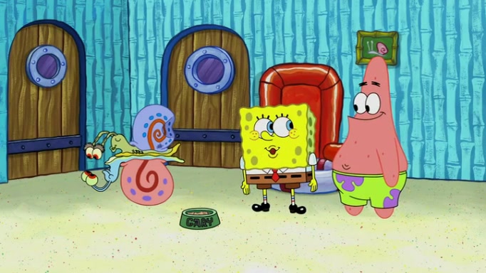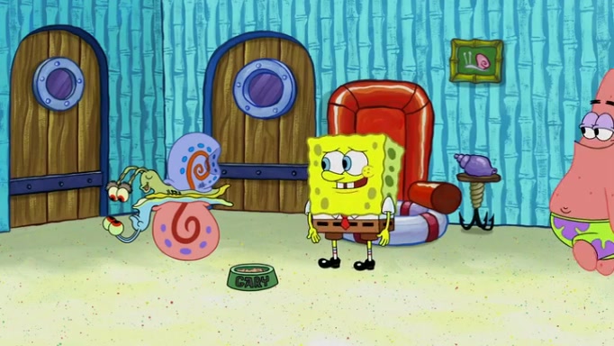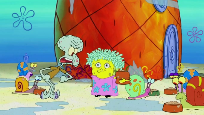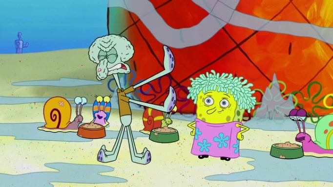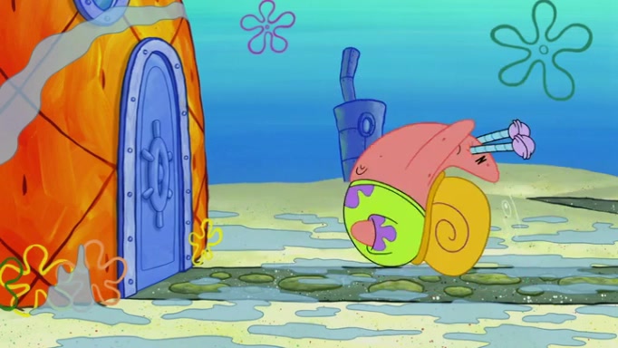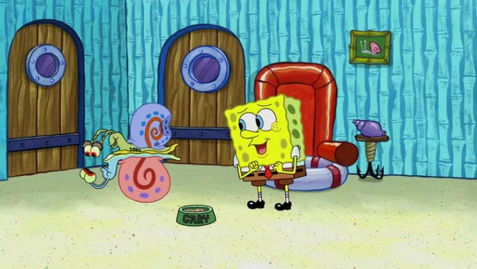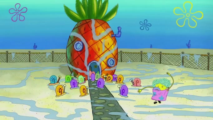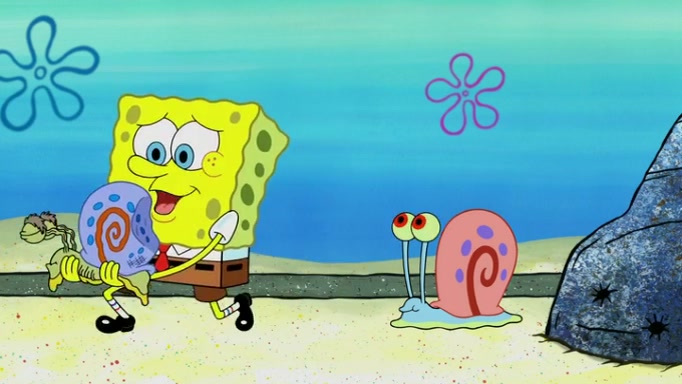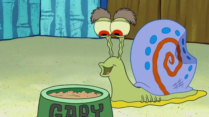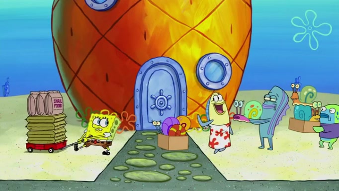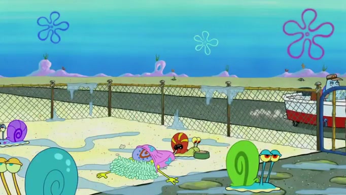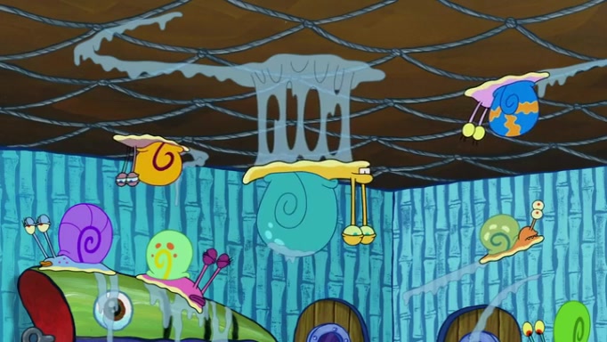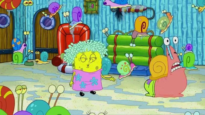 It is a sunny day and SpongeBob is taking Gary for a walk when he hears a meow from nearby. He then sees it and takes him home after naming him Senior Poopus. After he takes him home, Senior Poopus seems very happy and comfortable. Patrick then arrives and tells SpongeBob about the baby snails he left behind. SpongeBob quickly goes back to look and, sure enough, finds them. After taking them home and putting them under a heated blanket and giving them milk, another snail then bursts in and walks over SpongeBob right to the babies, apparently being the mother. Later, Another guy drops off a stray snail, saying "Thanks, snail guy!" Not long after that, there is a whole line of people waiting to give SpongeBob their snails, and SpongeBob eventually ends up with over 230 snails.