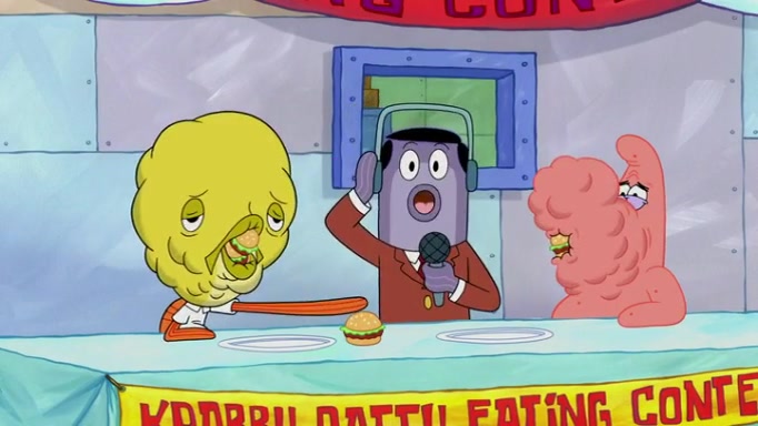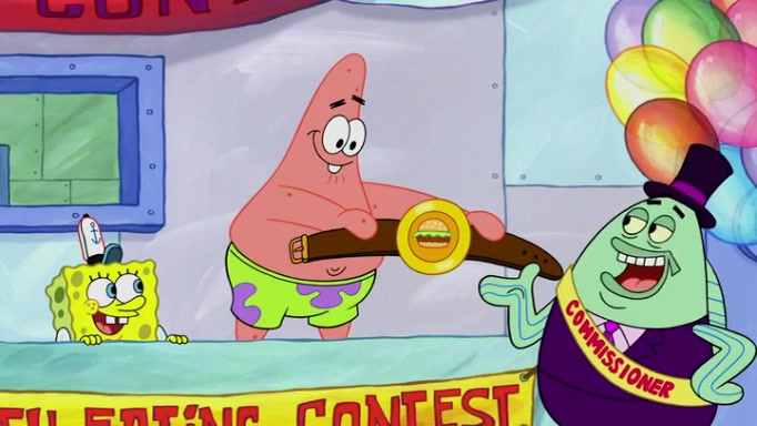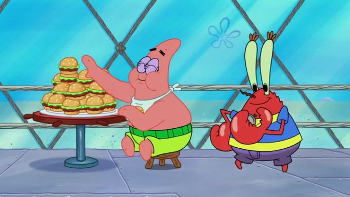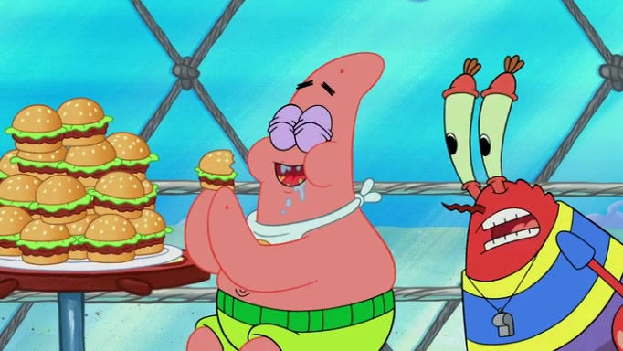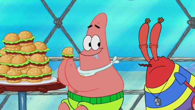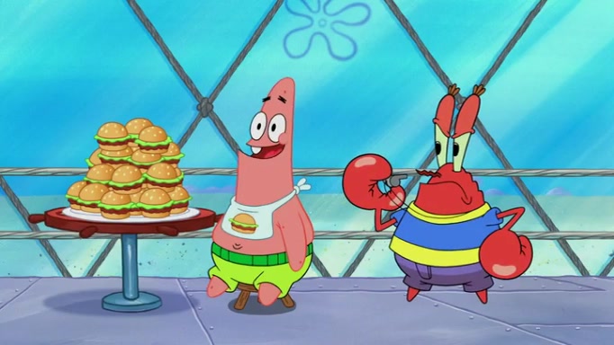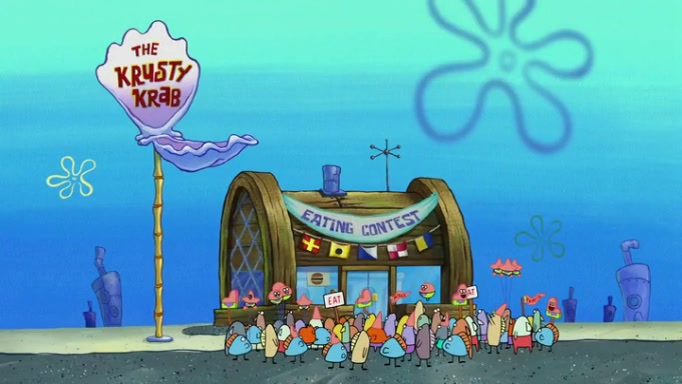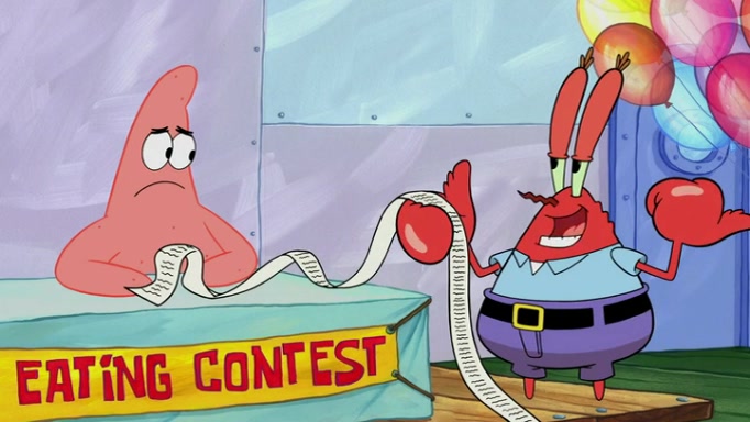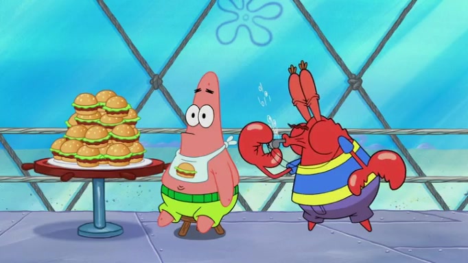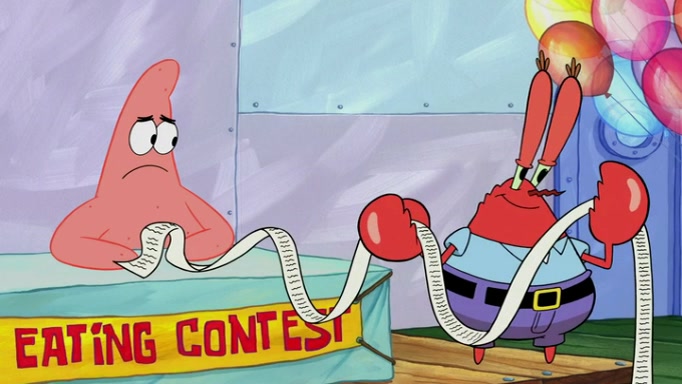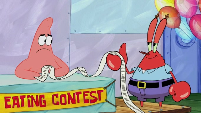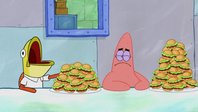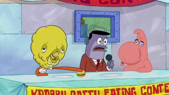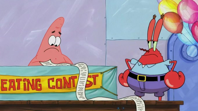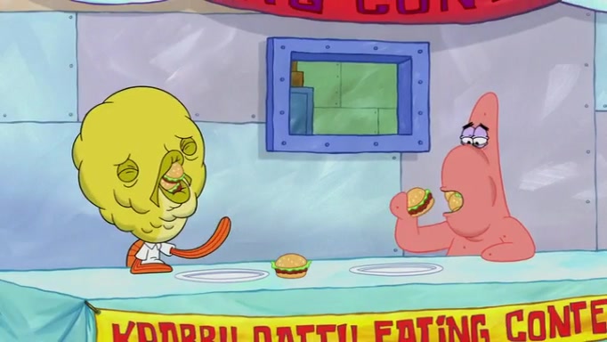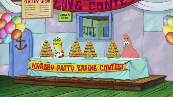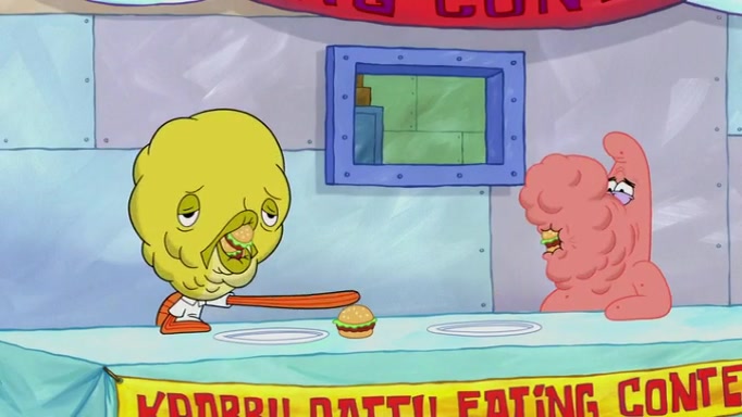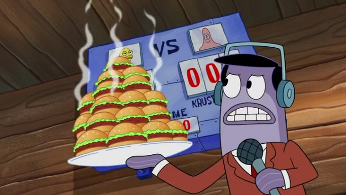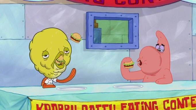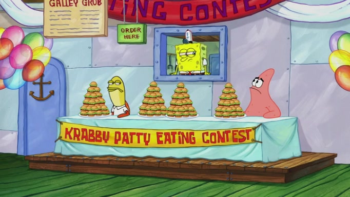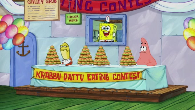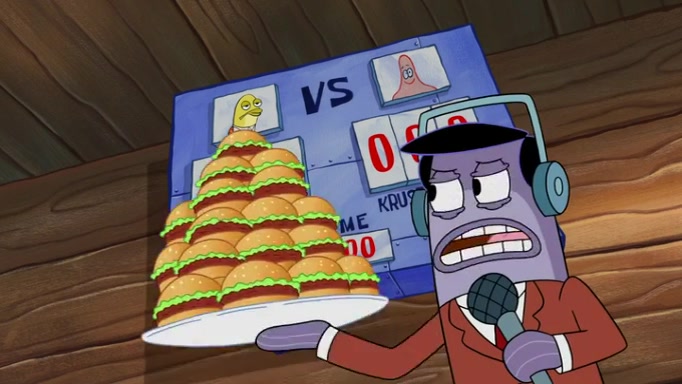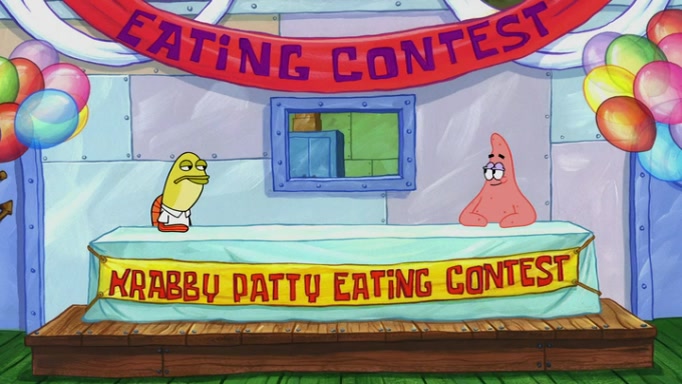 The episode begins at the Krusty Krab, where the Krusty Crew are celebrating the annual Krabby Patty eating contest. SpongeBob asks why Mr. Krabs is so overjoyed, and Mr. Krabs explains that this is time of the year where he gets the most money due to him being the supplier of the Krabby Patties. Then a news flash appears on the television. An unbeatable challenger named Oswald McNulty has won every Krabby Patty eating contest, and beaten every single city champion except Bikini Bottom. Things take an even darker turn because the Bikini Bottom champion has retired. Mr. Krabs is devastated by the news, and believes he isn't going to get any revenue until he sees Patrick, who comes in to order 40 Krabby Patties as a light lunch. Mr. Krabs then proposes that Patrick becomes the next Krabby Patty eating champion, and Patrick agrees.
