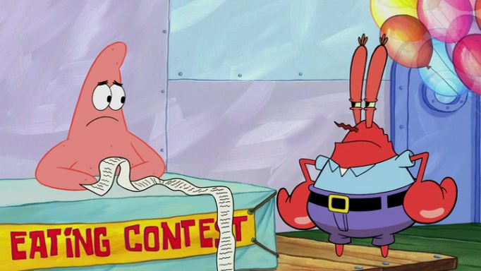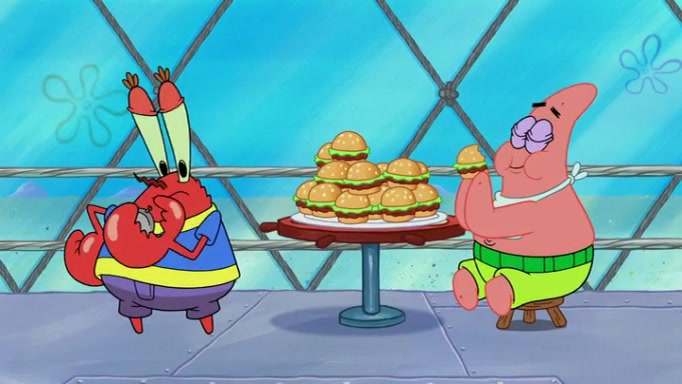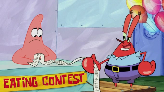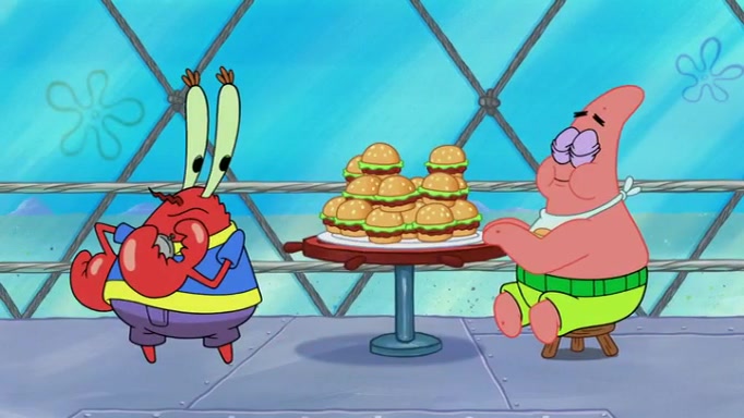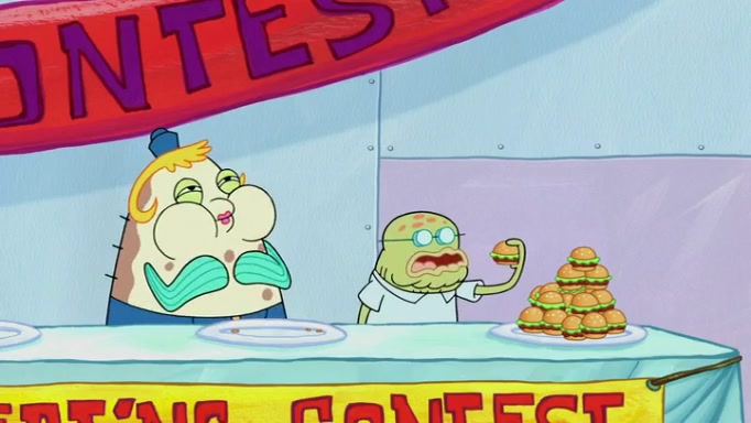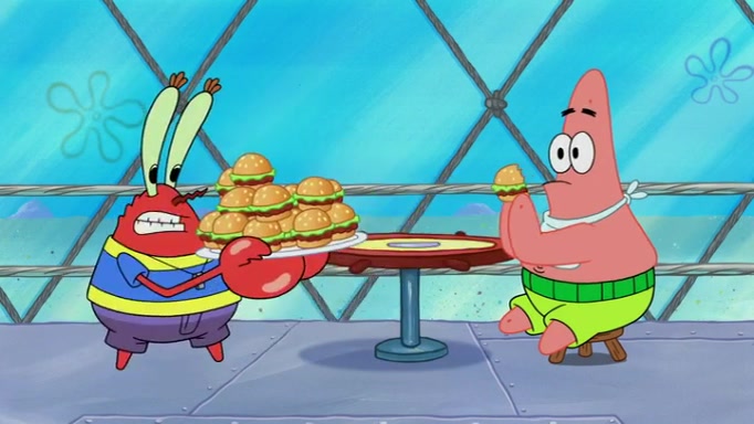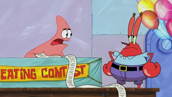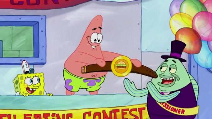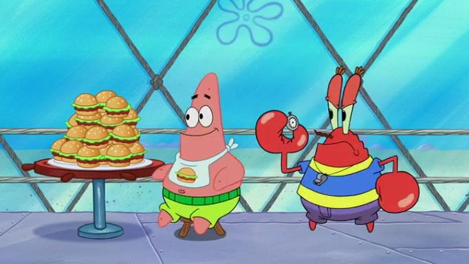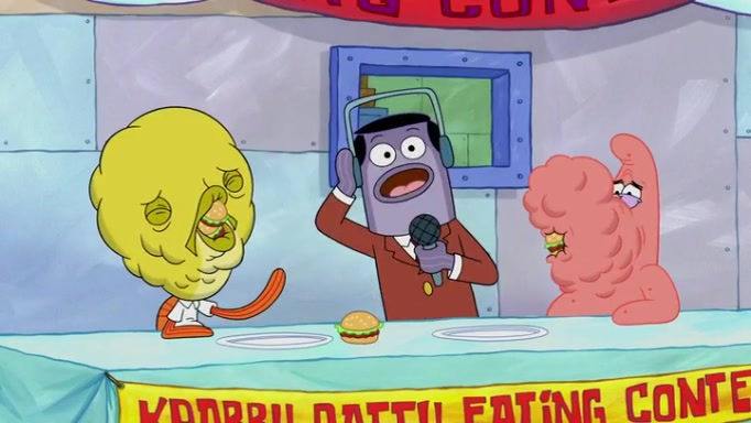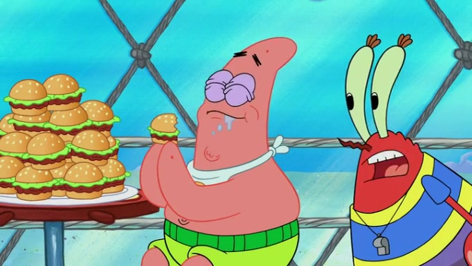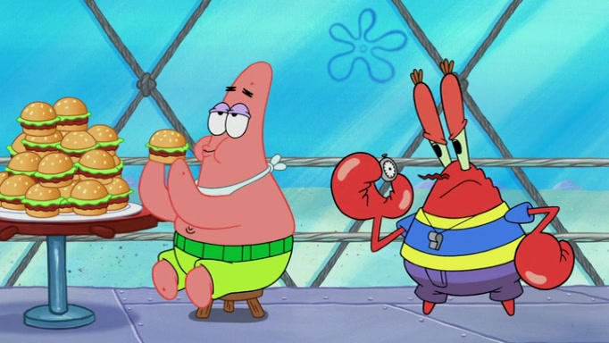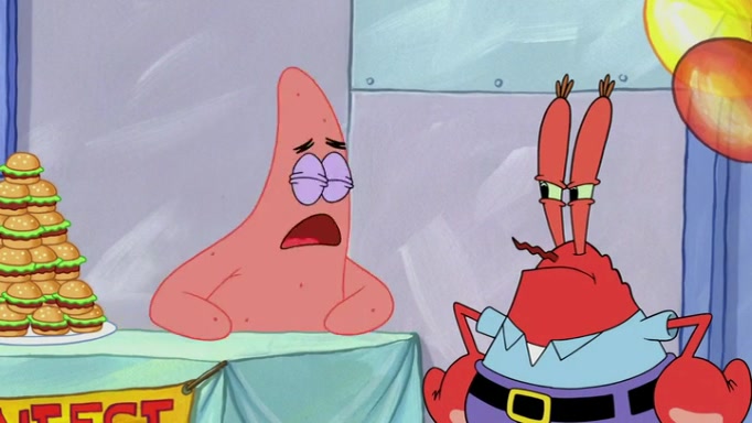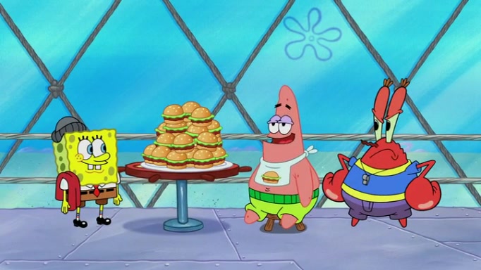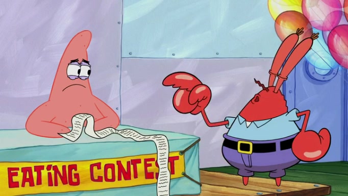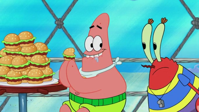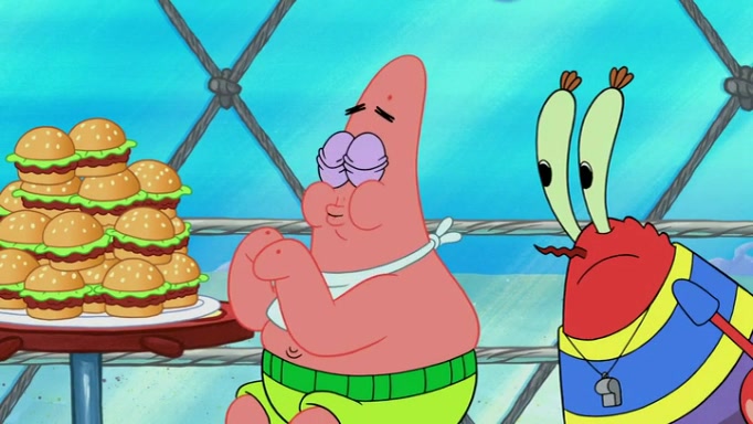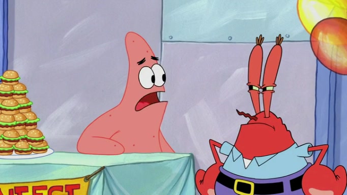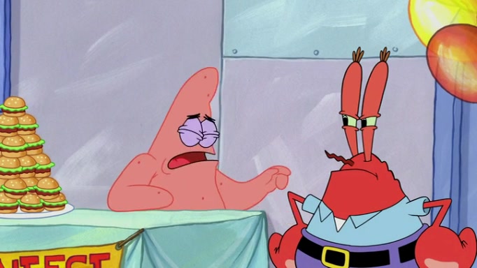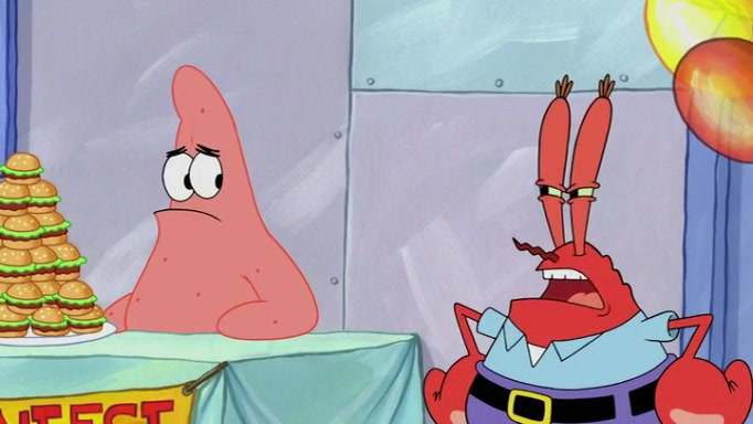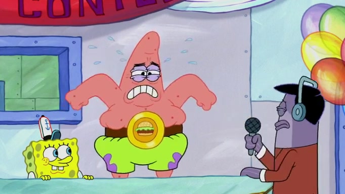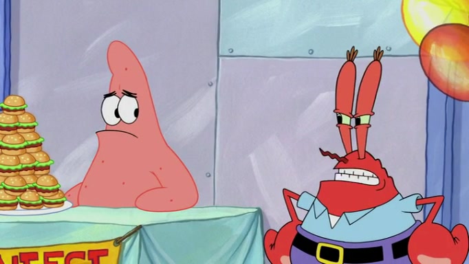 The episode begins at the Krusty Krab, where the Krusty Crew are celebrating the annual Krabby Patty eating contest. SpongeBob asks why Mr. Krabs is so overjoyed, and Mr. Krabs explains that this is time of the year where he gets the most money due to him being the supplier of the Krabby Patties. Then a news flash appears on the television. An unbeatable challenger named Oswald McNulty has won every Krabby Patty eating contest, and beaten every single city champion except Bikini Bottom. Things take an even darker turn because the Bikini Bottom champion has retired. Mr. Krabs is devastated by the news, and believes he isn't going to get any revenue until he sees Patrick, who comes in to order 40 Krabby Patties as a light lunch. Mr. Krabs then proposes that Patrick becomes the next Krabby Patty eating champion, and Patrick agrees.