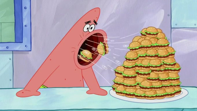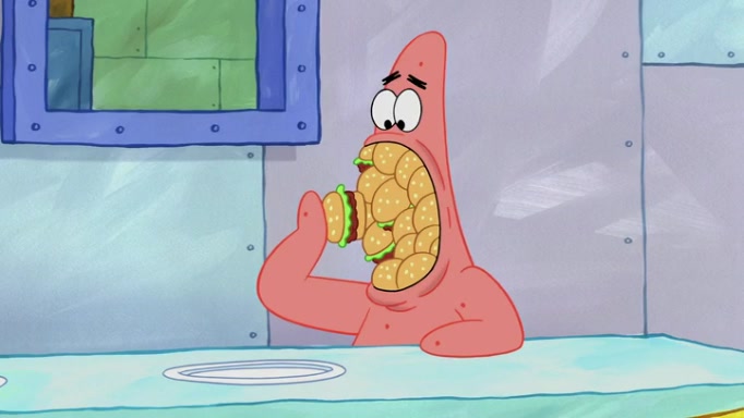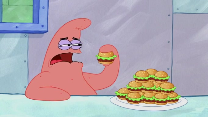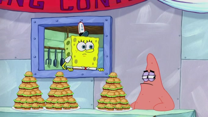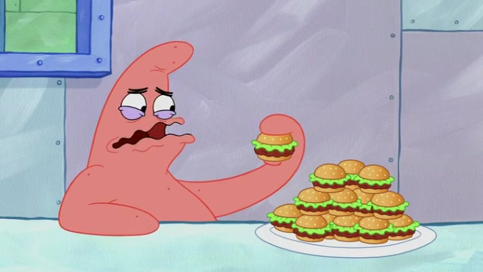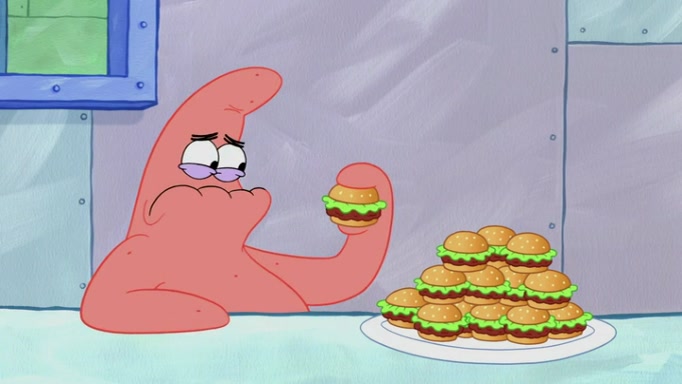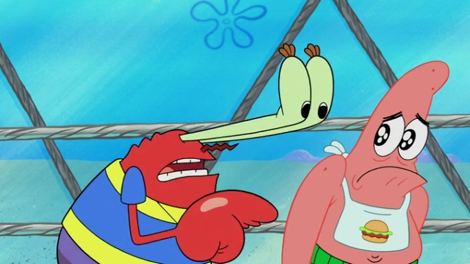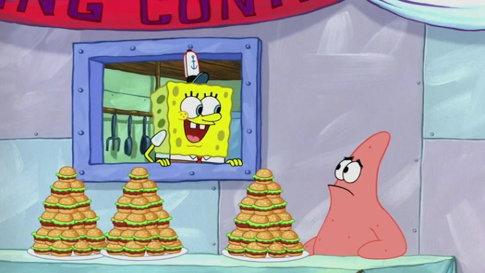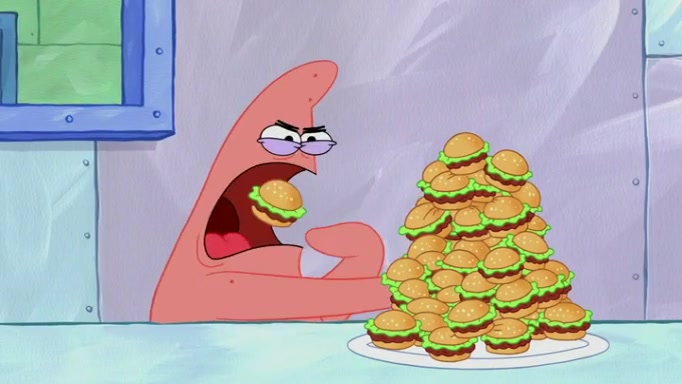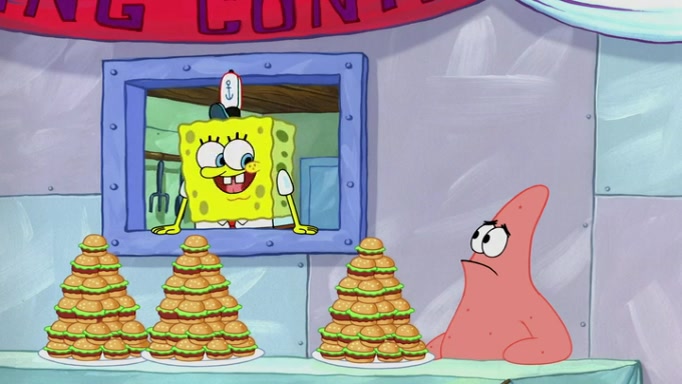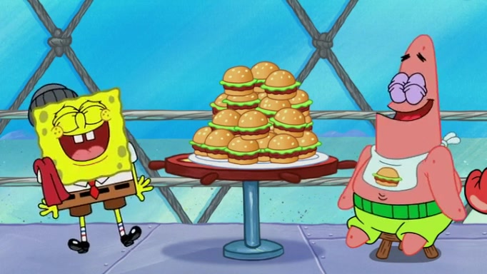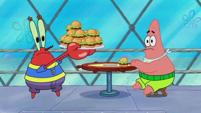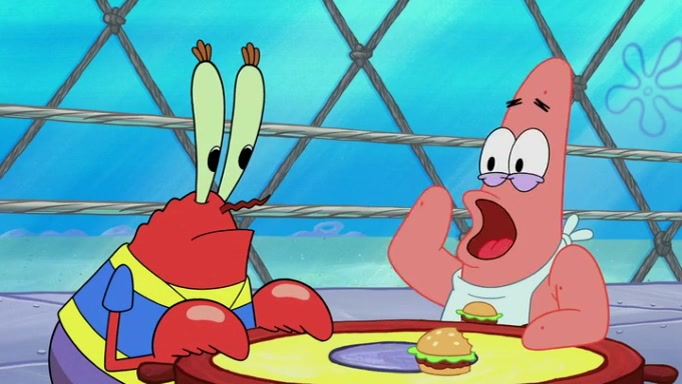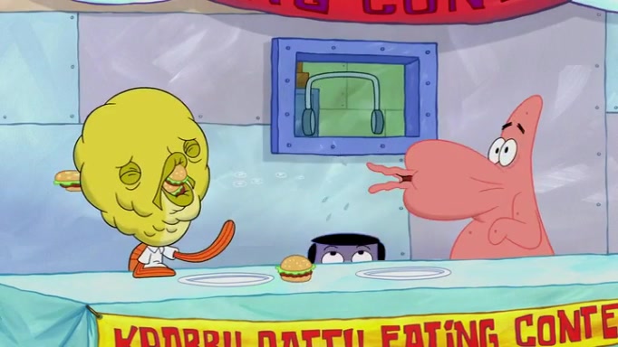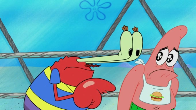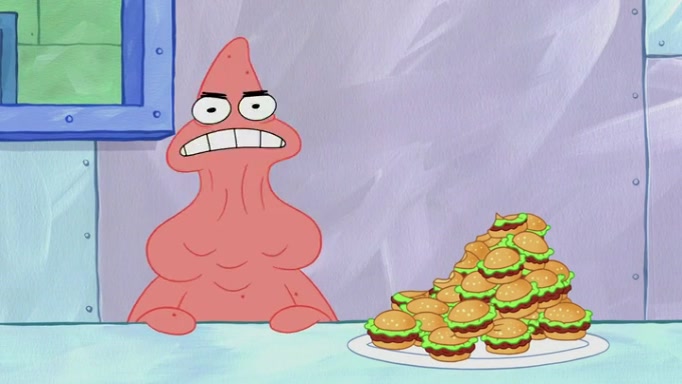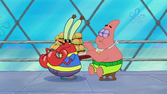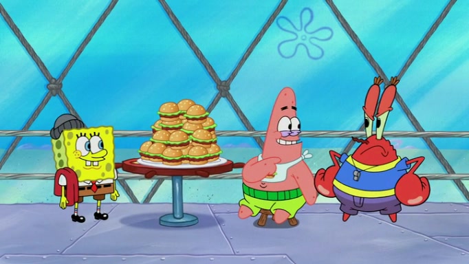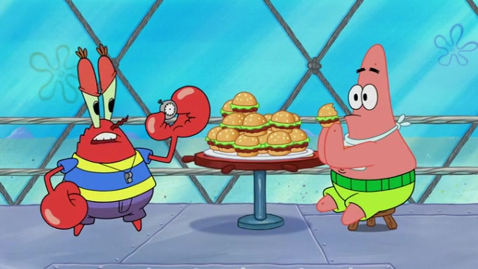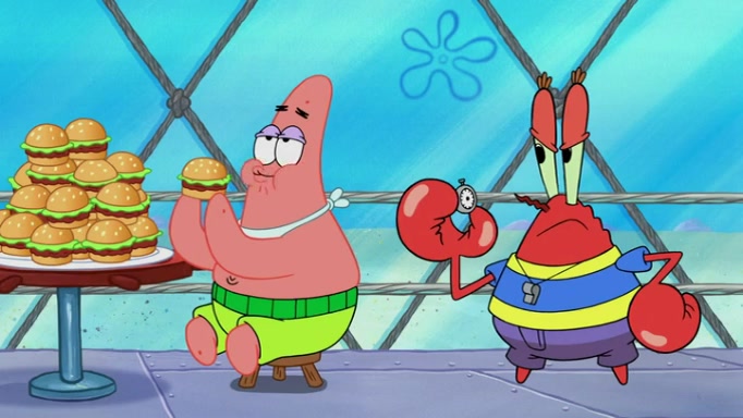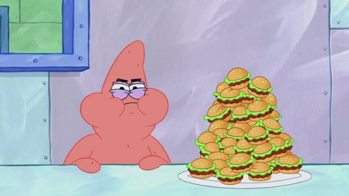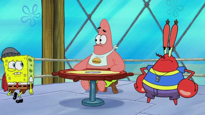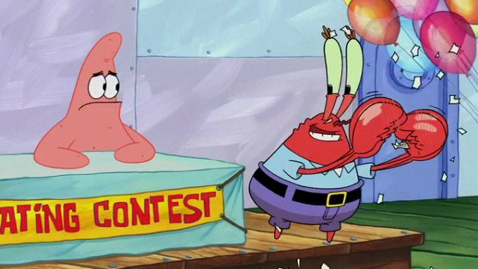 The episode begins at the Krusty Krab, where the Krusty Crew are celebrating the annual Krabby Patty eating contest. SpongeBob asks why Mr. Krabs is so overjoyed, and Mr. Krabs explains that this is time of the year where he gets the most money due to him being the supplier of the Krabby Patties. Then a news flash appears on the television. An unbeatable challenger named Oswald McNulty has won every Krabby Patty eating contest, and beaten every single city champion except Bikini Bottom. Things take an even darker turn because the Bikini Bottom champion has retired. Mr. Krabs is devastated by the news, and believes he isn't going to get any revenue until he sees Patrick, who comes in to order 40 Krabby Patties as a light lunch. Mr. Krabs then proposes that Patrick becomes the next Krabby Patty eating champion, and Patrick agrees.