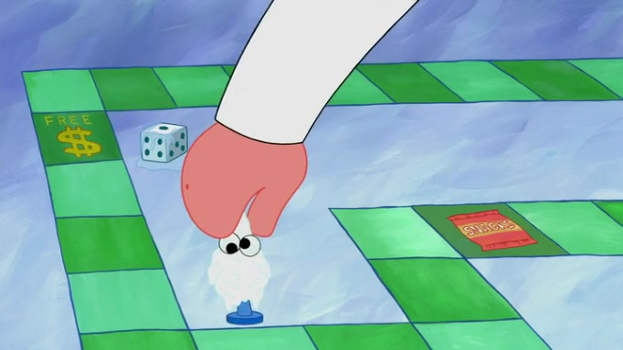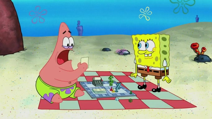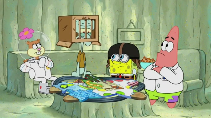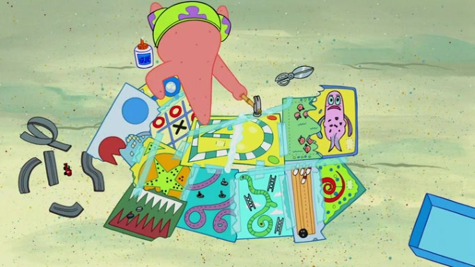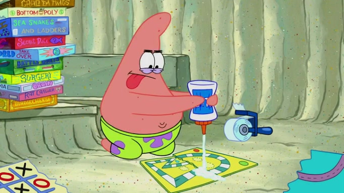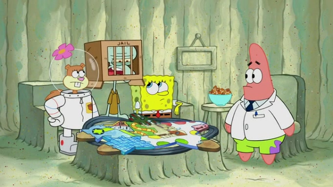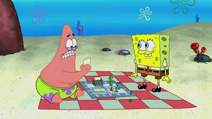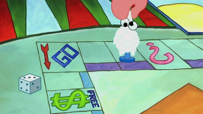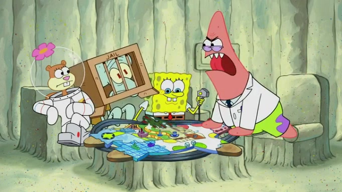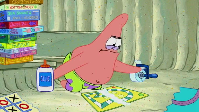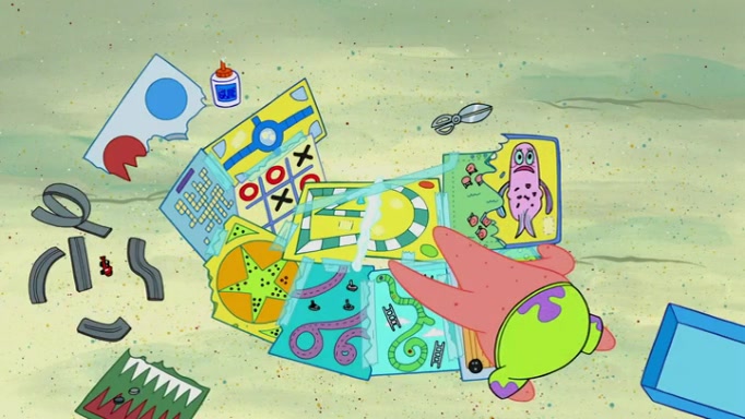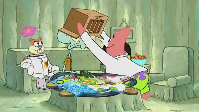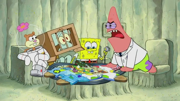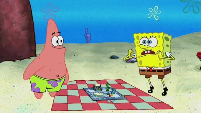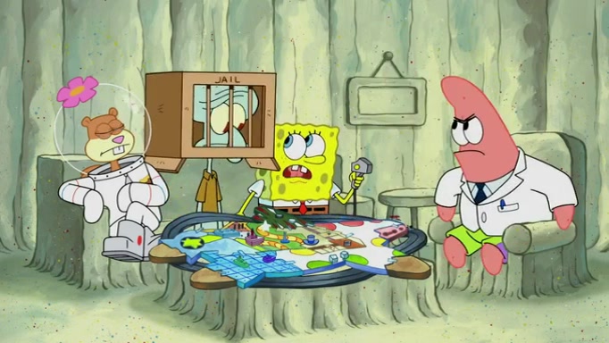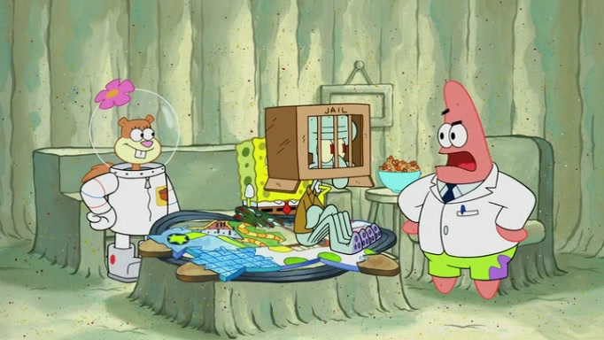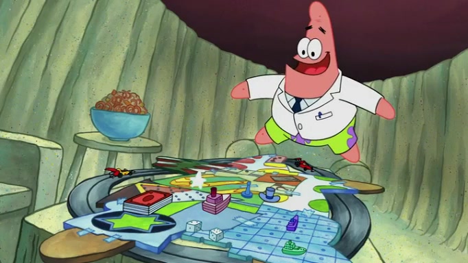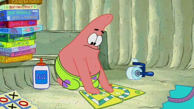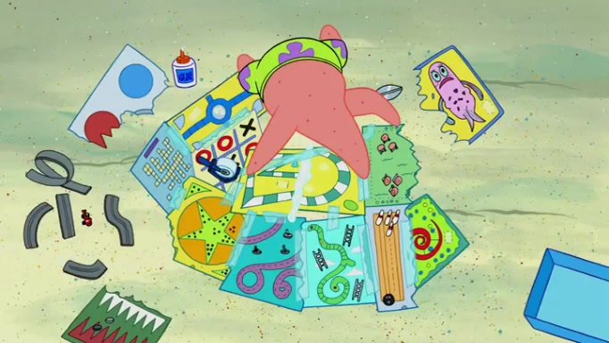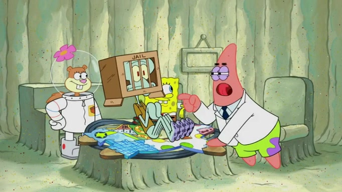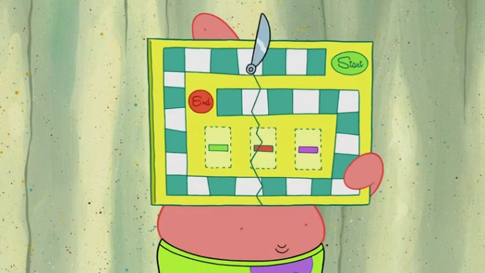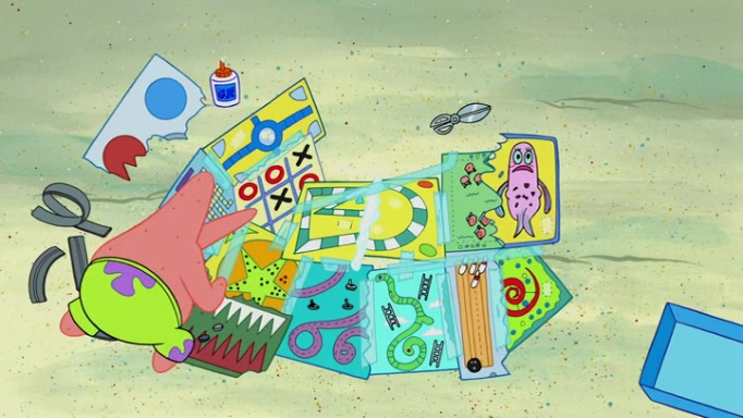 Patrick then goes to the Krusty Krab and tells Squidward that he invented a game. He explains how hard Tic Tac Toe is for him, and says that he made an easier version:Tic-Tac, which is the same but with a 2x2 grid. Patrick and Squidward play numerous games of Tic Tac but Squidward wins them all. Patrick, disappointed, says that he should have gone with his first idea: Tic. He then comes up with "Rock, Paper, Butter". Squidward trashes that idea by saying an awful pun. Patrick then comes up with "Whose rope is longer?". Squidward easily wins this, but Patrick thinks Squidward played it before. Patrick goes over to Sandy's Treedome and tells her he cannot make a game. Sandy tells Patrick to find what's best out of the games Patrick likes. So, Patrick starts cutting, gluing and taping his favorite board games together. He then says he knows what it is like to be a game maker, Frankenstein style. Squidward, SpongeBob, and Sandy all go to Patrick's rock to try out his new game. SpongeBob asks what it is called. Squidward suggests "Garbage" but Patrick comes up with "Patrick! The Game". Squidward determines a turn order which goes: Patrick, Sandy, SpongeBob, Squidward. Patrick goes first. He passes a go square and gets a lot of money. Sandy rolls and builds a beach hut on Goo Lagoon. SpongeBob lands on a chest and gets a drivers license, which means on his next go, he can move or race a car. Squidward rolls and ends up in jail. Patrick then puts a box on Squidward's head to show he is in jail which then a fish is shown inside the jail Squidward is in. Patrick rolls and lands on snacks. Patrick then eats the snacks. Sandy lands and buys Coral Avenue. SpongeBob rolls a 12 and decides to race the car. Squidward tries to roll but Patrick says you cannot roll in jail. After asking, Squidward is told that the only way to get out of jail is rolling a 6. Squidward questions that and Patrick changes it to "If a person is in jail, he or she shall stay there until he rolls a 6 or someone says his name". Sandy lands on "do surgery". Her operation card says "Remove finbone from player to your left"(Squidward). It turns out she just has to remove the finbone out of an operation fish. SpongeBob decides to race the car. Squidward decides to just leave, causing everyone else to say his name multiple times, thus getting him out of jail. SpongeBob decides to race the car again. Squidward rolls a 2 and lands on snacks. His piece, however, is knocked back to jail by the car. Patrick puts the box over Squidward's head again. Squidward starts thinking the game is random because it jumps from one game to another, nobody knows how to win and Patrick is making up the rules as he goes along. Squidward decides to go outside after SpongeBob and Sandy start feeding Patrick snacks. Patrick then makes up a rule that "If a person declares outsidsies everyone must go outside". Squidward tries to take that back but he is too late and everyone goes outside. Patrick then rolls a 4 getting everyone into the giggle zone. Everyone giggles (Squidward is forced by Sandy). SpongeBob's roll then results in everyone making silly faces. Squidward then rants that the rules are that the game does not matter. He then demonstrates by saying he could just roll and then say "Automatic winner". SpongeBob and Sandy then celebrate Squidward's win until Patrick makes up a rule that "No player can declare himself automatic winner". Squidward starts beating up the game board. He is then taken to real jail for destruction of private property which Squidward is happy about, until he sees his cellmate. He then yells at SpongeBob, Patrick, and Sandy to say his name. The episode ends with a box of the game with the words "Game over!" on it and Patrick saying "Game over!"