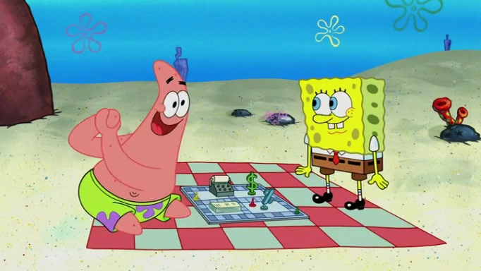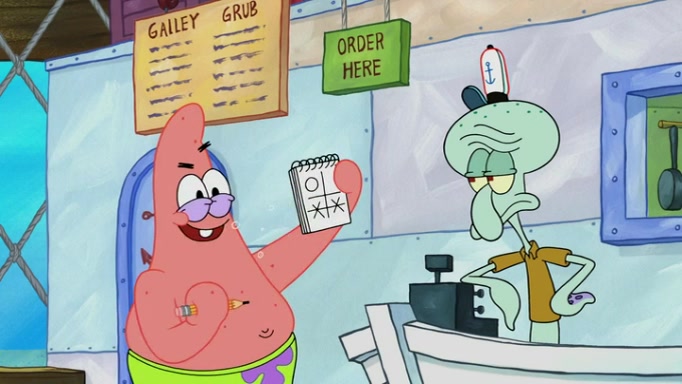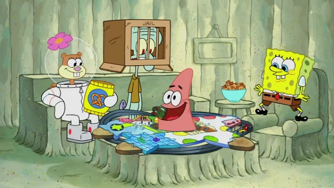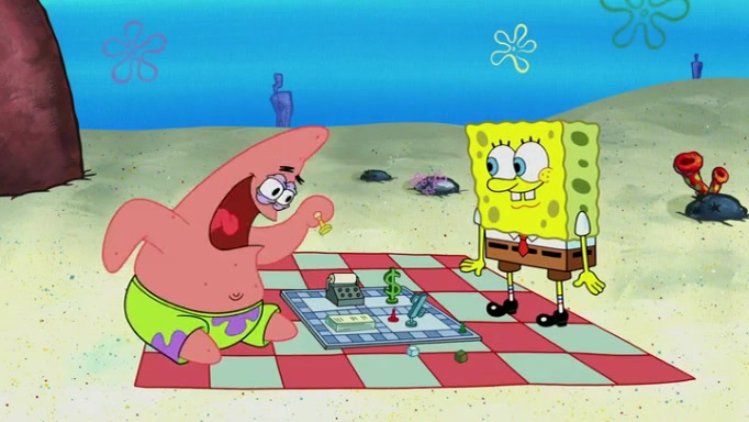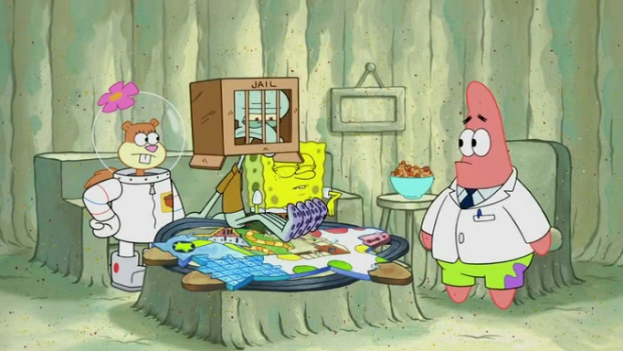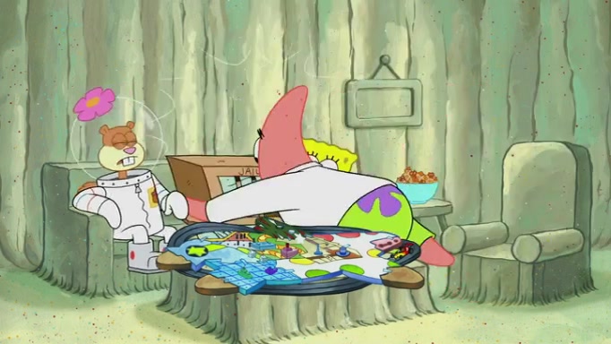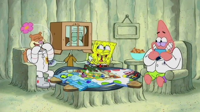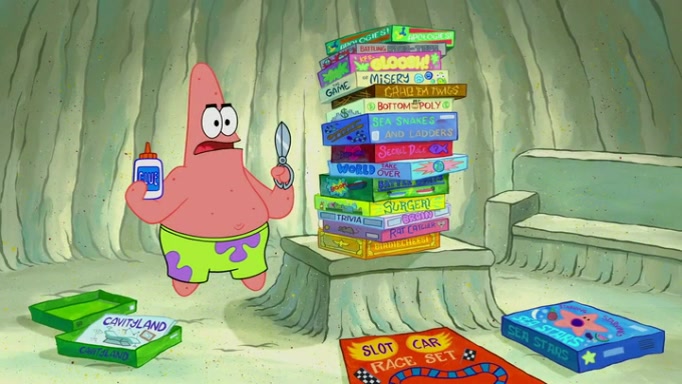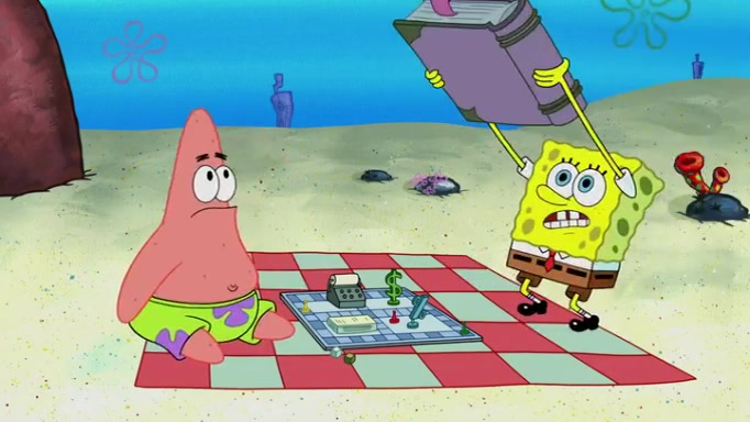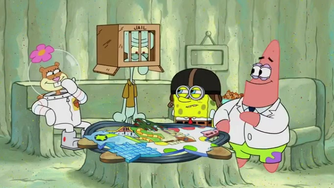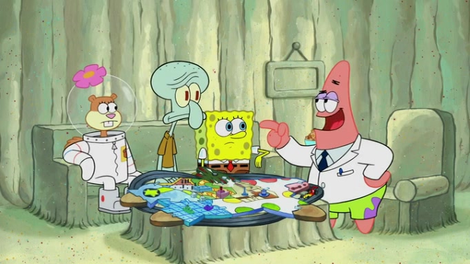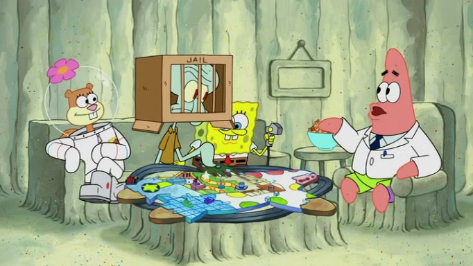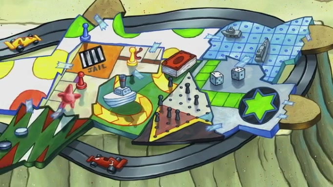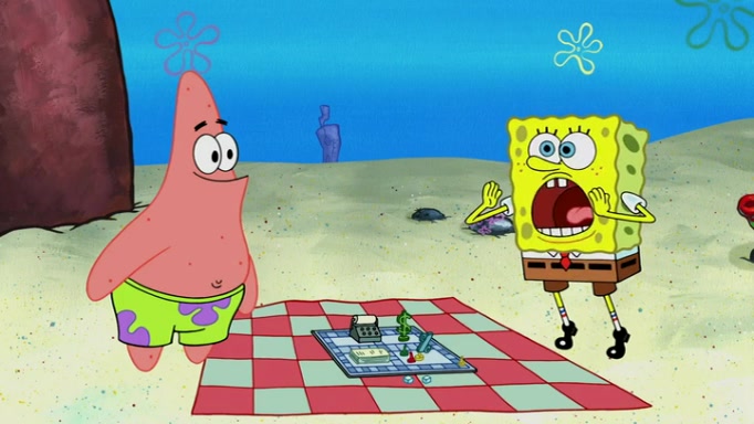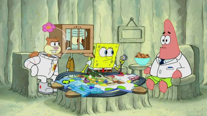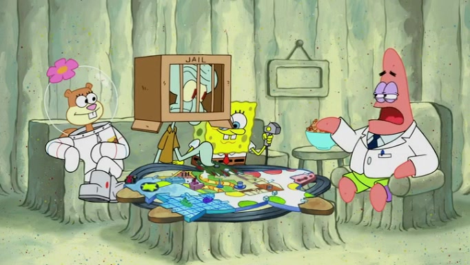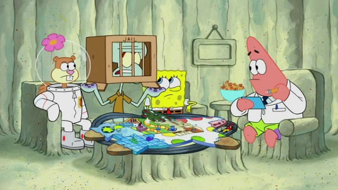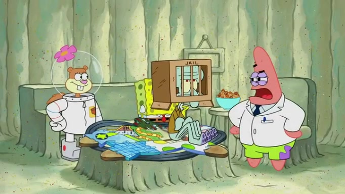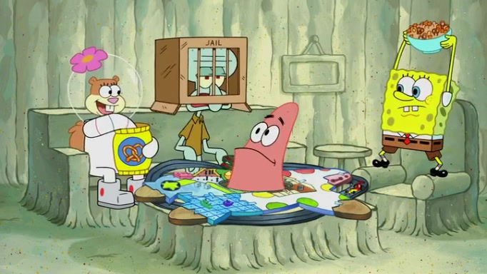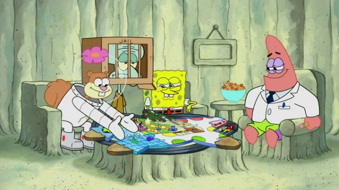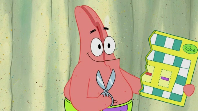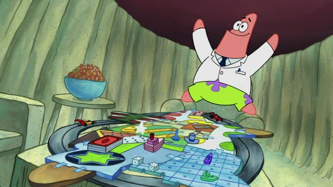 Patrick then goes to the Krusty Krab and tells Squidward that he invented a game. He explains how hard Tic Tac Toe is for him, and says that he made an easier version:Tic-Tac, which is the same but with a 2x2 grid. Patrick and Squidward play numerous games of Tic Tac but Squidward wins them all. Patrick, disappointed, says that he should have gone with his first idea: Tic. He then comes up with "Rock, Paper, Butter". Squidward trashes that idea by saying an awful pun. Patrick then comes up with "Whose rope is longer?". Squidward easily wins this, but Patrick thinks Squidward played it before. Patrick goes over to Sandy's Treedome and tells her he cannot make a game. Sandy tells Patrick to find what's best out of the games Patrick likes. So, Patrick starts cutting, gluing and taping his favorite board games together. He then says he knows what it is like to be a game maker, Frankenstein style. Squidward, SpongeBob, and Sandy all go to Patrick's rock to try out his new game. SpongeBob asks what it is called. Squidward suggests "Garbage" but Patrick comes up with "Patrick! The Game". Squidward determines a turn order which goes: Patrick, Sandy, SpongeBob, Squidward. Patrick goes first. He passes a go square and gets a lot of money. Sandy rolls and builds a beach hut on Goo Lagoon. SpongeBob lands on a chest and gets a drivers license, which means on his next go, he can move or race a car. Squidward rolls and ends up in jail. Patrick then puts a box on Squidward's head to show he is in jail which then a fish is shown inside the jail Squidward is in. Patrick rolls and lands on snacks. Patrick then eats the snacks. Sandy lands and buys Coral Avenue. SpongeBob rolls a 12 and decides to race the car. Squidward tries to roll but Patrick says you cannot roll in jail. After asking, Squidward is told that the only way to get out of jail is rolling a 6. Squidward questions that and Patrick changes it to "If a person is in jail, he or she shall stay there until he rolls a 6 or someone says his name". Sandy lands on "do surgery". Her operation card says "Remove finbone from player to your left"(Squidward). It turns out she just has to remove the finbone out of an operation fish. SpongeBob decides to race the car. Squidward decides to just leave, causing everyone else to say his name multiple times, thus getting him out of jail. SpongeBob decides to race the car again. Squidward rolls a 2 and lands on snacks. His piece, however, is knocked back to jail by the car. Patrick puts the box over Squidward's head again. Squidward starts thinking the game is random because it jumps from one game to another, nobody knows how to win and Patrick is making up the rules as he goes along. Squidward decides to go outside after SpongeBob and Sandy start feeding Patrick snacks. Patrick then makes up a rule that "If a person declares outsidsies everyone must go outside". Squidward tries to take that back but he is too late and everyone goes outside. Patrick then rolls a 4 getting everyone into the giggle zone. Everyone giggles (Squidward is forced by Sandy). SpongeBob's roll then results in everyone making silly faces. Squidward then rants that the rules are that the game does not matter. He then demonstrates by saying he could just roll and then say "Automatic winner". SpongeBob and Sandy then celebrate Squidward's win until Patrick makes up a rule that "No player can declare himself automatic winner". Squidward starts beating up the game board. He is then taken to real jail for destruction of private property which Squidward is happy about, until he sees his cellmate. He then yells at SpongeBob, Patrick, and Sandy to say his name. The episode ends with a box of the game with the words "Game over!" on it and Patrick saying "Game over!"
