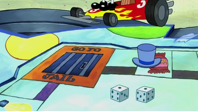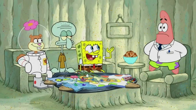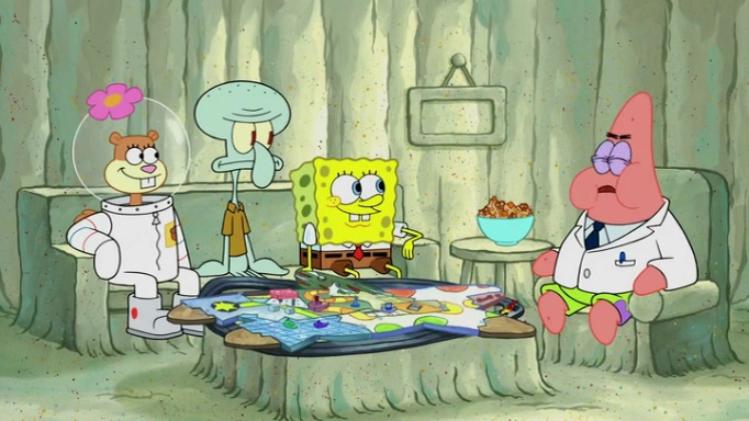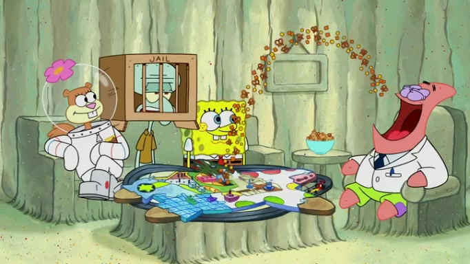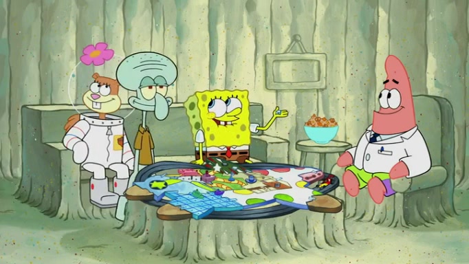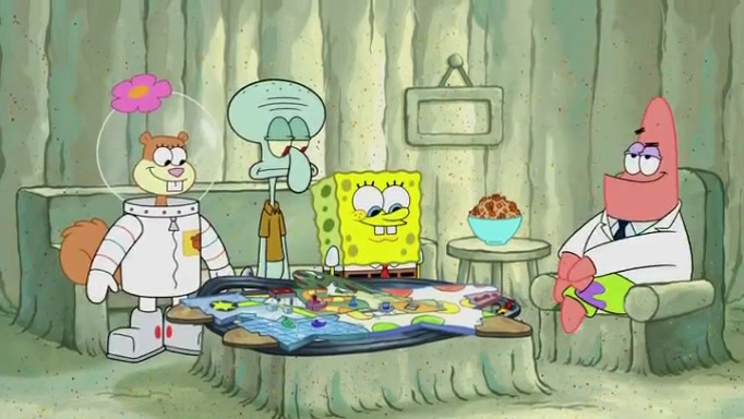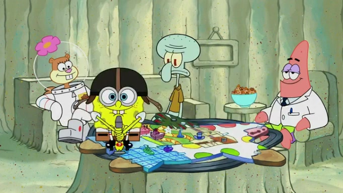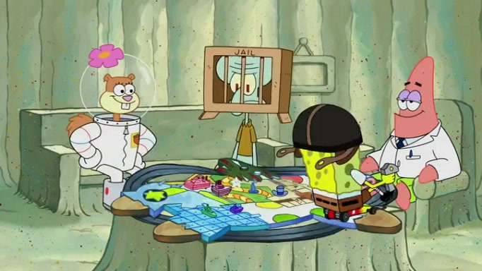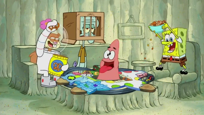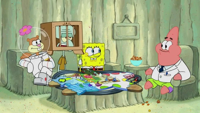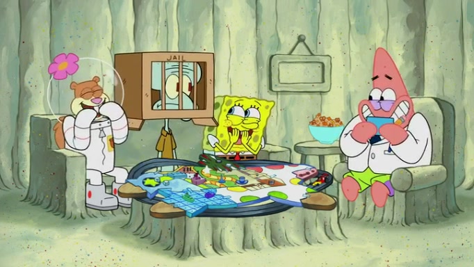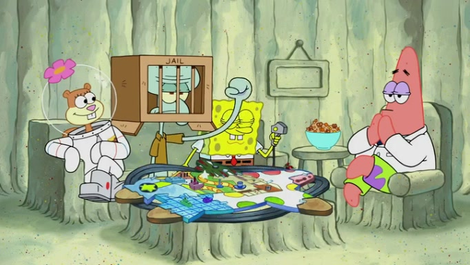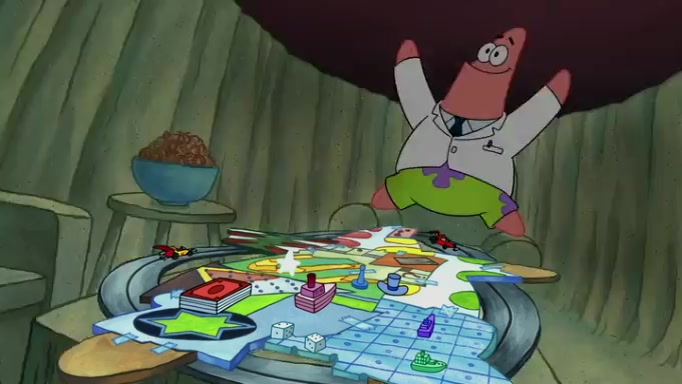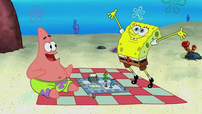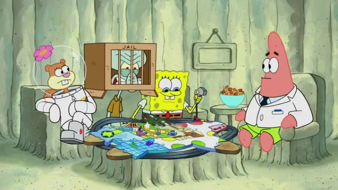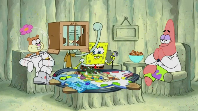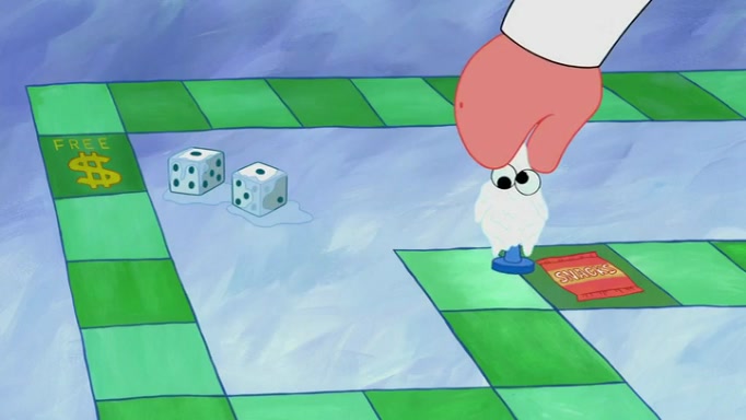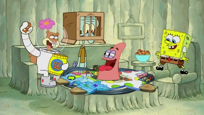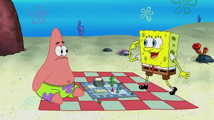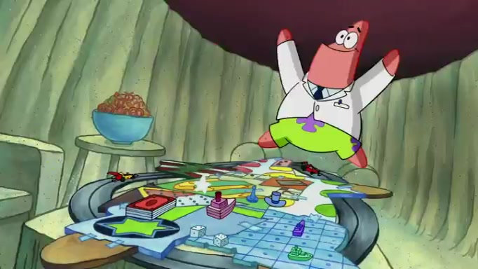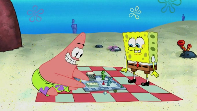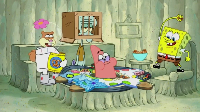 Patrick then goes to the Krusty Krab and tells Squidward that he invented a game. He explains how hard Tic Tac Toe is for him, and says that he made an easier version:Tic-Tac, which is the same but with a 2x2 grid. Patrick and Squidward play numerous games of Tic Tac but Squidward wins them all. Patrick, disappointed, says that he should have gone with his first idea: Tic. He then comes up with "Rock, Paper, Butter". Squidward trashes that idea by saying an awful pun. Patrick then comes up with "Whose rope is longer?". Squidward easily wins this, but Patrick thinks Squidward played it before. Patrick goes over to Sandy's Treedome and tells her he cannot make a game. Sandy tells Patrick to find what's best out of the games Patrick likes. So, Patrick starts cutting, gluing and taping his favorite board games together. He then says he knows what it is like to be a game maker, Frankenstein style. Squidward, SpongeBob, and Sandy all go to Patrick's rock to try out his new game. SpongeBob asks what it is called. Squidward suggests "Garbage" but Patrick comes up with "Patrick! The Game". Squidward determines a turn order which goes: Patrick, Sandy, SpongeBob, Squidward. Patrick goes first. He passes a go square and gets a lot of money. Sandy rolls and builds a beach hut on Goo Lagoon. SpongeBob lands on a chest and gets a drivers license, which means on his next go, he can move or race a car. Squidward rolls and ends up in jail. Patrick then puts a box on Squidward's head to show he is in jail which then a fish is shown inside the jail Squidward is in. Patrick rolls and lands on snacks. Patrick then eats the snacks. Sandy lands and buys Coral Avenue. SpongeBob rolls a 12 and decides to race the car. Squidward tries to roll but Patrick says you cannot roll in jail. After asking, Squidward is told that the only way to get out of jail is rolling a 6. Squidward questions that and Patrick changes it to "If a person is in jail, he or she shall stay there until he rolls a 6 or someone says his name". Sandy lands on "do surgery". Her operation card says "Remove finbone from player to your left"(Squidward). It turns out she just has to remove the finbone out of an operation fish. SpongeBob decides to race the car. Squidward decides to just leave, causing everyone else to say his name multiple times, thus getting him out of jail. SpongeBob decides to race the car again. Squidward rolls a 2 and lands on snacks. His piece, however, is knocked back to jail by the car. Patrick puts the box over Squidward's head again. Squidward starts thinking the game is random because it jumps from one game to another, nobody knows how to win and Patrick is making up the rules as he goes along. Squidward decides to go outside after SpongeBob and Sandy start feeding Patrick snacks. Patrick then makes up a rule that "If a person declares outsidsies everyone must go outside". Squidward tries to take that back but he is too late and everyone goes outside. Patrick then rolls a 4 getting everyone into the giggle zone. Everyone giggles (Squidward is forced by Sandy). SpongeBob's roll then results in everyone making silly faces. Squidward then rants that the rules are that the game does not matter. He then demonstrates by saying he could just roll and then say "Automatic winner". SpongeBob and Sandy then celebrate Squidward's win until Patrick makes up a rule that "No player can declare himself automatic winner". Squidward starts beating up the game board. He is then taken to real jail for destruction of private property which Squidward is happy about, until he sees his cellmate. He then yells at SpongeBob, Patrick, and Sandy to say his name. The episode ends with a box of the game with the words "Game over!" on it and Patrick saying "Game over!"