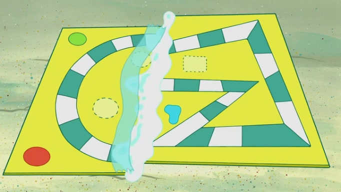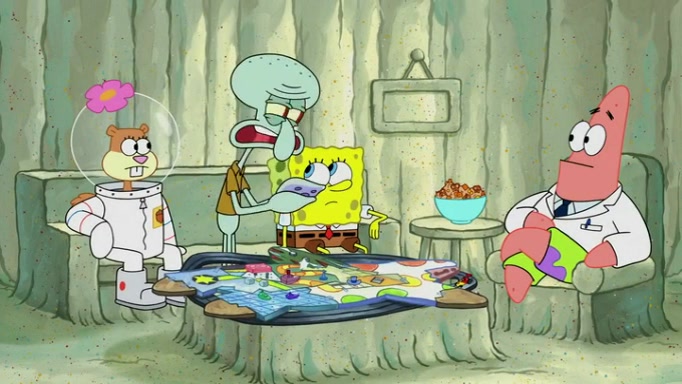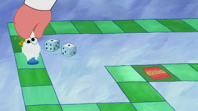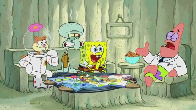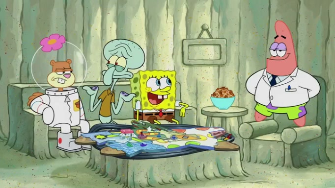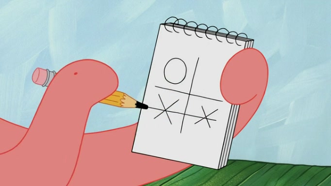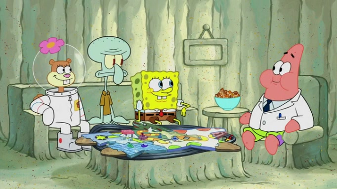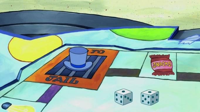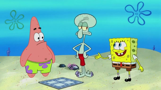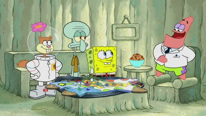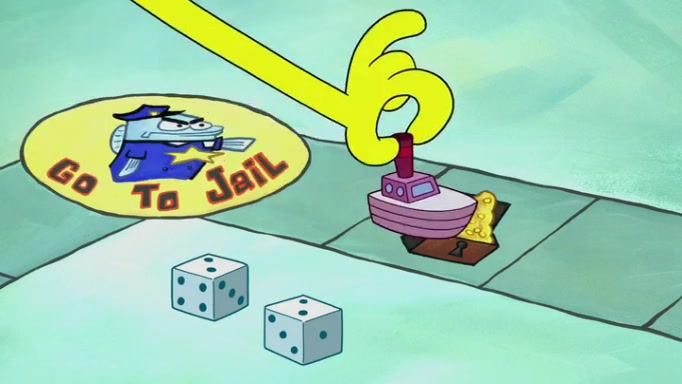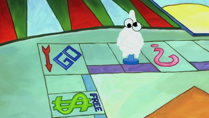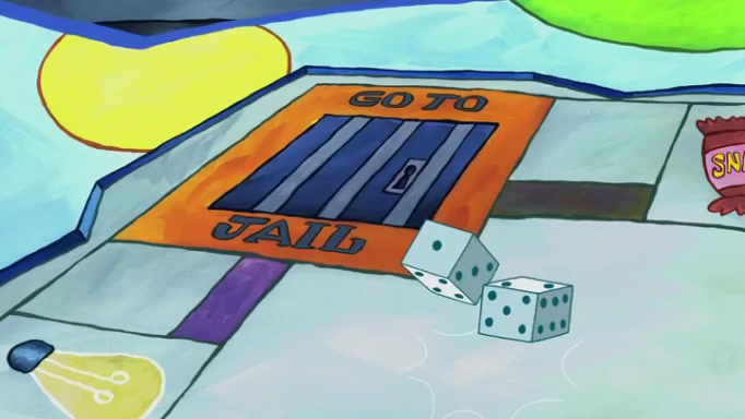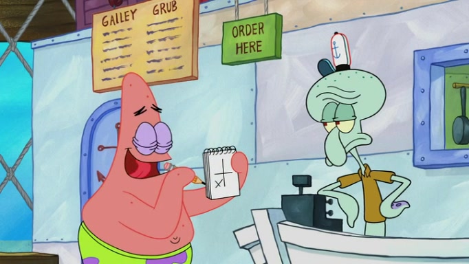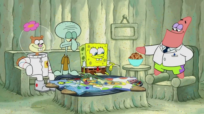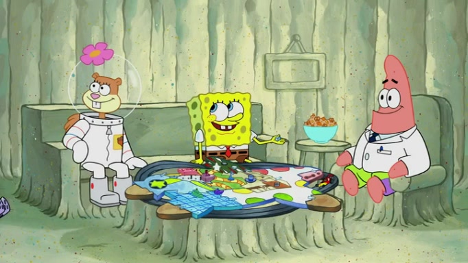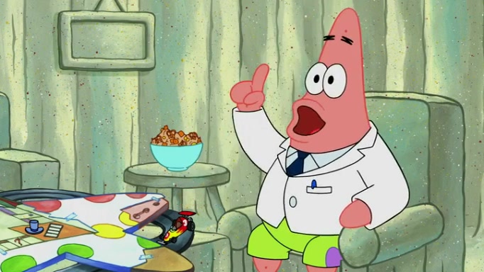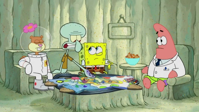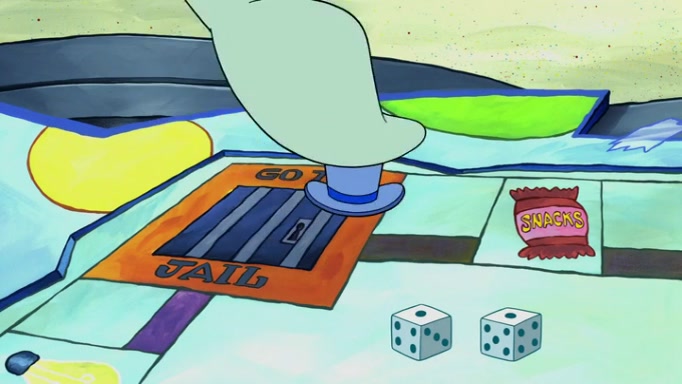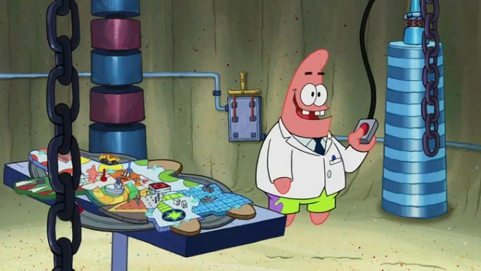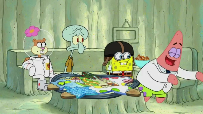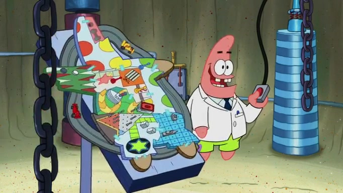 Patrick then goes to the Krusty Krab and tells Squidward that he invented a game. He explains how hard Tic Tac Toe is for him, and says that he made an easier version:Tic-Tac, which is the same but with a 2x2 grid. Patrick and Squidward play numerous games of Tic Tac but Squidward wins them all. Patrick, disappointed, says that he should have gone with his first idea: Tic. He then comes up with "Rock, Paper, Butter". Squidward trashes that idea by saying an awful pun. Patrick then comes up with "Whose rope is longer?". Squidward easily wins this, but Patrick thinks Squidward played it before. Patrick goes over to Sandy's Treedome and tells her he cannot make a game. Sandy tells Patrick to find what's best out of the games Patrick likes. So, Patrick starts cutting, gluing and taping his favorite board games together. He then says he knows what it is like to be a game maker, Frankenstein style. Squidward, SpongeBob, and Sandy all go to Patrick's rock to try out his new game. SpongeBob asks what it is called. Squidward suggests "Garbage" but Patrick comes up with "Patrick! The Game". Squidward determines a turn order which goes: Patrick, Sandy, SpongeBob, Squidward. Patrick goes first. He passes a go square and gets a lot of money. Sandy rolls and builds a beach hut on Goo Lagoon. SpongeBob lands on a chest and gets a drivers license, which means on his next go, he can move or race a car. Squidward rolls and ends up in jail. Patrick then puts a box on Squidward's head to show he is in jail which then a fish is shown inside the jail Squidward is in. Patrick rolls and lands on snacks. Patrick then eats the snacks. Sandy lands and buys Coral Avenue. SpongeBob rolls a 12 and decides to race the car. Squidward tries to roll but Patrick says you cannot roll in jail. After asking, Squidward is told that the only way to get out of jail is rolling a 6. Squidward questions that and Patrick changes it to "If a person is in jail, he or she shall stay there until he rolls a 6 or someone says his name". Sandy lands on "do surgery". Her operation card says "Remove finbone from player to your left"(Squidward). It turns out she just has to remove the finbone out of an operation fish. SpongeBob decides to race the car. Squidward decides to just leave, causing everyone else to say his name multiple times, thus getting him out of jail. SpongeBob decides to race the car again. Squidward rolls a 2 and lands on snacks. His piece, however, is knocked back to jail by the car. Patrick puts the box over Squidward's head again. Squidward starts thinking the game is random because it jumps from one game to another, nobody knows how to win and Patrick is making up the rules as he goes along. Squidward decides to go outside after SpongeBob and Sandy start feeding Patrick snacks. Patrick then makes up a rule that "If a person declares outsidsies everyone must go outside". Squidward tries to take that back but he is too late and everyone goes outside. Patrick then rolls a 4 getting everyone into the giggle zone. Everyone giggles (Squidward is forced by Sandy). SpongeBob's roll then results in everyone making silly faces. Squidward then rants that the rules are that the game does not matter. He then demonstrates by saying he could just roll and then say "Automatic winner". SpongeBob and Sandy then celebrate Squidward's win until Patrick makes up a rule that "No player can declare himself automatic winner". Squidward starts beating up the game board. He is then taken to real jail for destruction of private property which Squidward is happy about, until he sees his cellmate. He then yells at SpongeBob, Patrick, and Sandy to say his name. The episode ends with a box of the game with the words "Game over!" on it and Patrick saying "Game over!"