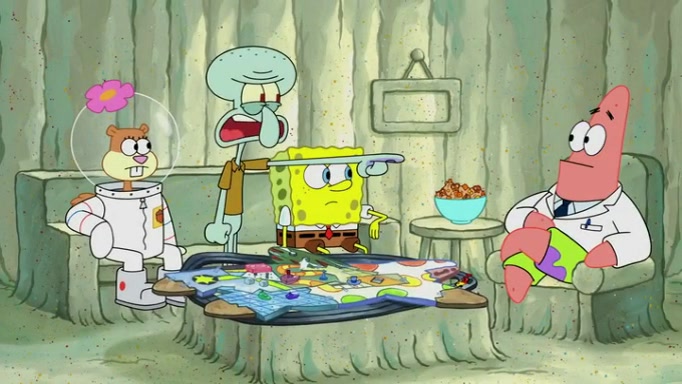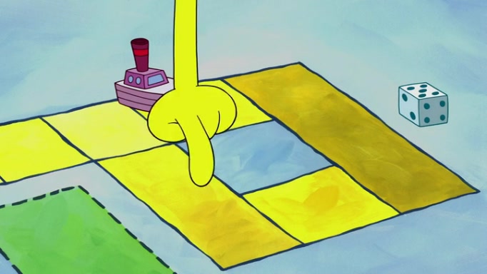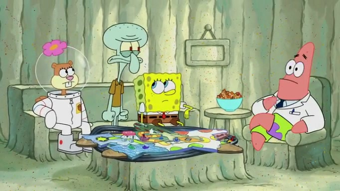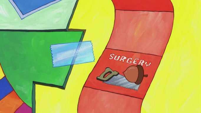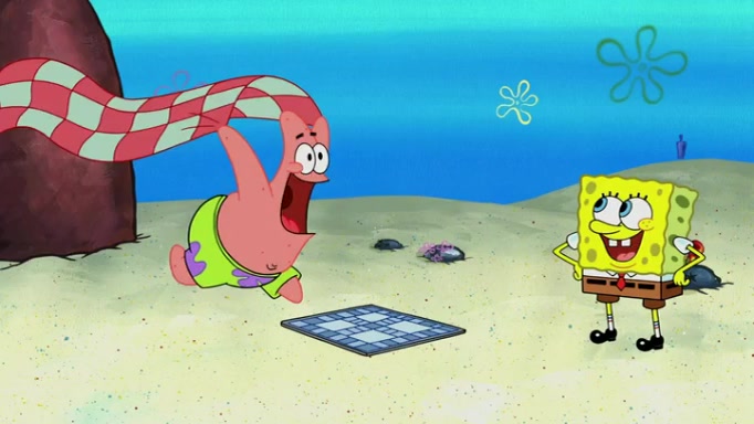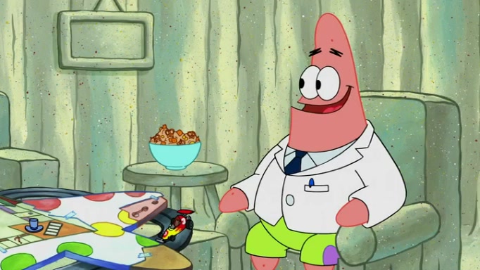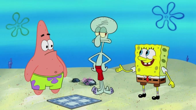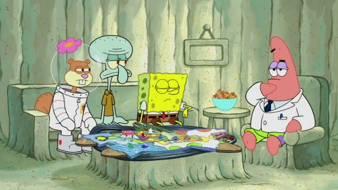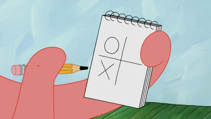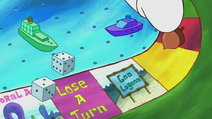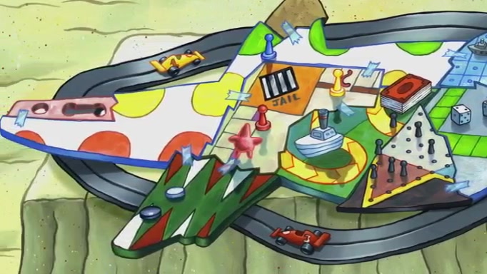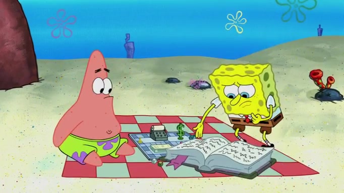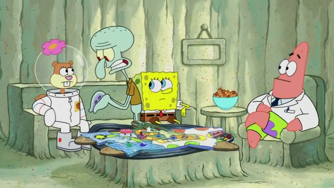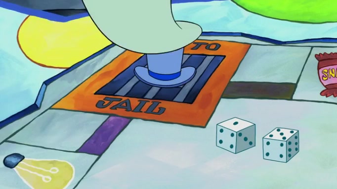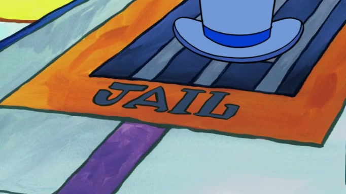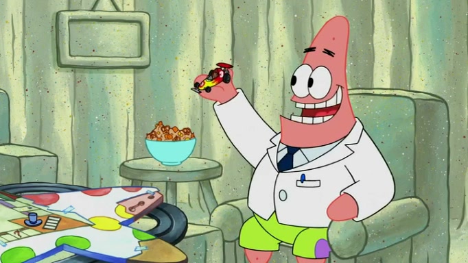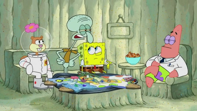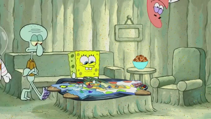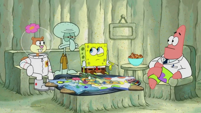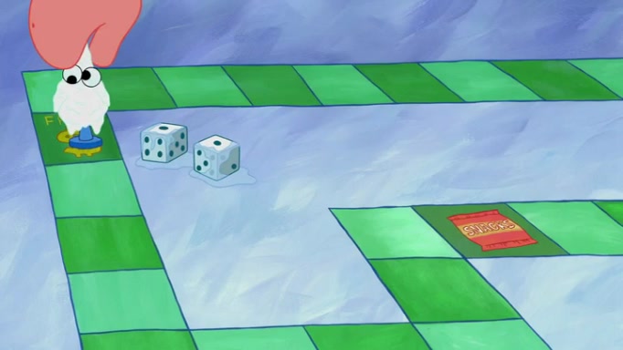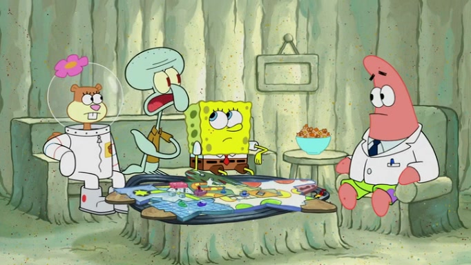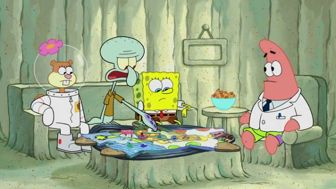 Patrick then goes to the Krusty Krab and tells Squidward that he invented a game. He explains how hard Tic Tac Toe is for him, and says that he made an easier version:Tic-Tac, which is the same but with a 2x2 grid. Patrick and Squidward play numerous games of Tic Tac but Squidward wins them all. Patrick, disappointed, says that he should have gone with his first idea: Tic. He then comes up with "Rock, Paper, Butter". Squidward trashes that idea by saying an awful pun. Patrick then comes up with "Whose rope is longer?". Squidward easily wins this, but Patrick thinks Squidward played it before. Patrick goes over to Sandy's Treedome and tells her he cannot make a game. Sandy tells Patrick to find what's best out of the games Patrick likes. So, Patrick starts cutting, gluing and taping his favorite board games together. He then says he knows what it is like to be a game maker, Frankenstein style. Squidward, SpongeBob, and Sandy all go to Patrick's rock to try out his new game. SpongeBob asks what it is called. Squidward suggests "Garbage" but Patrick comes up with "Patrick! The Game". Squidward determines a turn order which goes: Patrick, Sandy, SpongeBob, Squidward. Patrick goes first. He passes a go square and gets a lot of money. Sandy rolls and builds a beach hut on Goo Lagoon. SpongeBob lands on a chest and gets a drivers license, which means on his next go, he can move or race a car. Squidward rolls and ends up in jail. Patrick then puts a box on Squidward's head to show he is in jail which then a fish is shown inside the jail Squidward is in. Patrick rolls and lands on snacks. Patrick then eats the snacks. Sandy lands and buys Coral Avenue. SpongeBob rolls a 12 and decides to race the car. Squidward tries to roll but Patrick says you cannot roll in jail. After asking, Squidward is told that the only way to get out of jail is rolling a 6. Squidward questions that and Patrick changes it to "If a person is in jail, he or she shall stay there until he rolls a 6 or someone says his name". Sandy lands on "do surgery". Her operation card says "Remove finbone from player to your left"(Squidward). It turns out she just has to remove the finbone out of an operation fish. SpongeBob decides to race the car. Squidward decides to just leave, causing everyone else to say his name multiple times, thus getting him out of jail. SpongeBob decides to race the car again. Squidward rolls a 2 and lands on snacks. His piece, however, is knocked back to jail by the car. Patrick puts the box over Squidward's head again. Squidward starts thinking the game is random because it jumps from one game to another, nobody knows how to win and Patrick is making up the rules as he goes along. Squidward decides to go outside after SpongeBob and Sandy start feeding Patrick snacks. Patrick then makes up a rule that "If a person declares outsidsies everyone must go outside". Squidward tries to take that back but he is too late and everyone goes outside. Patrick then rolls a 4 getting everyone into the giggle zone. Everyone giggles (Squidward is forced by Sandy). SpongeBob's roll then results in everyone making silly faces. Squidward then rants that the rules are that the game does not matter. He then demonstrates by saying he could just roll and then say "Automatic winner". SpongeBob and Sandy then celebrate Squidward's win until Patrick makes up a rule that "No player can declare himself automatic winner". Squidward starts beating up the game board. He is then taken to real jail for destruction of private property which Squidward is happy about, until he sees his cellmate. He then yells at SpongeBob, Patrick, and Sandy to say his name. The episode ends with a box of the game with the words "Game over!" on it and Patrick saying "Game over!"