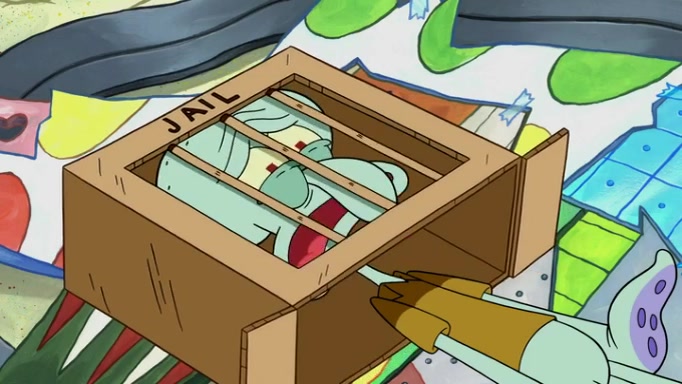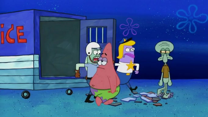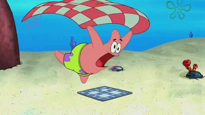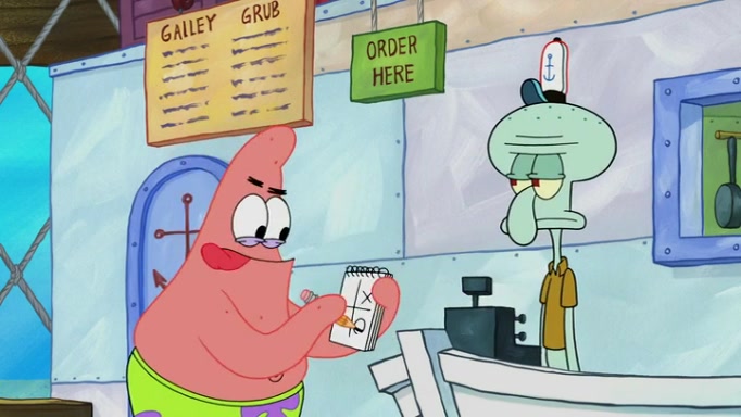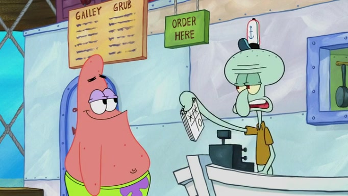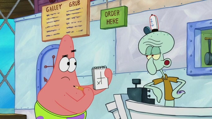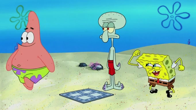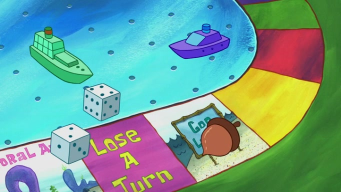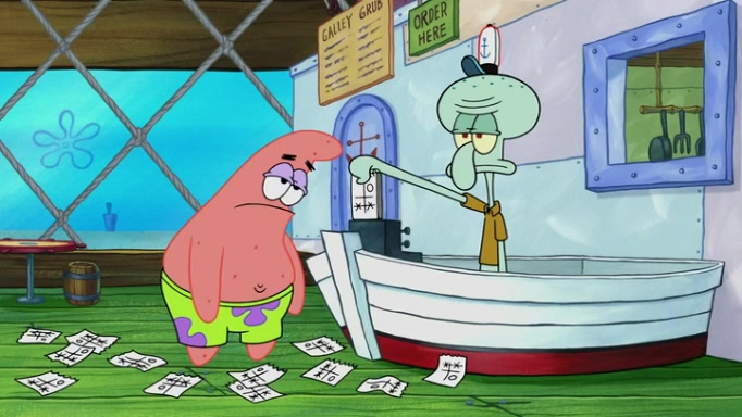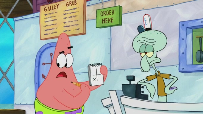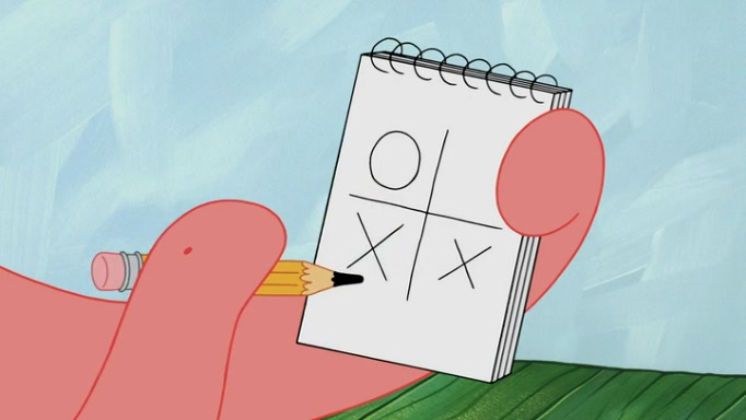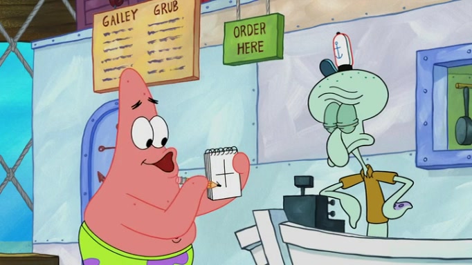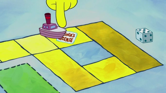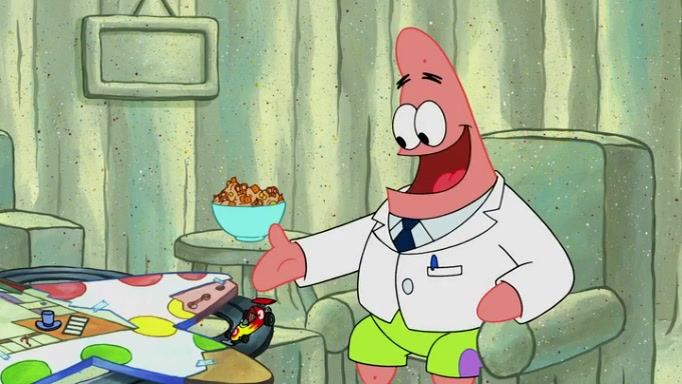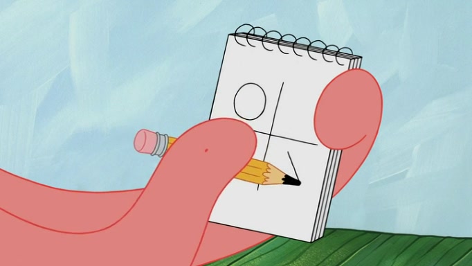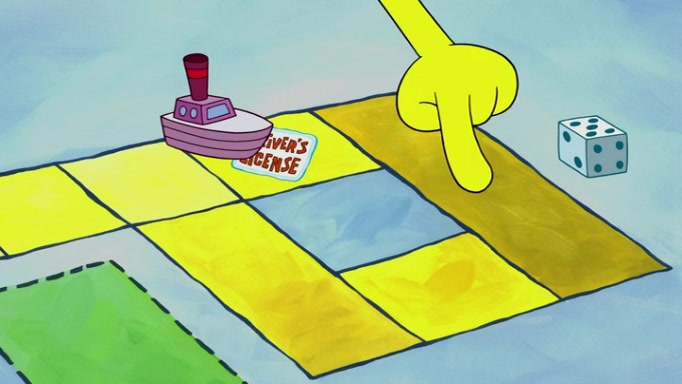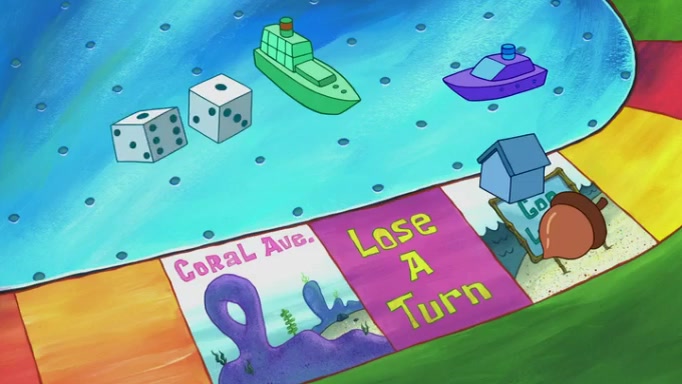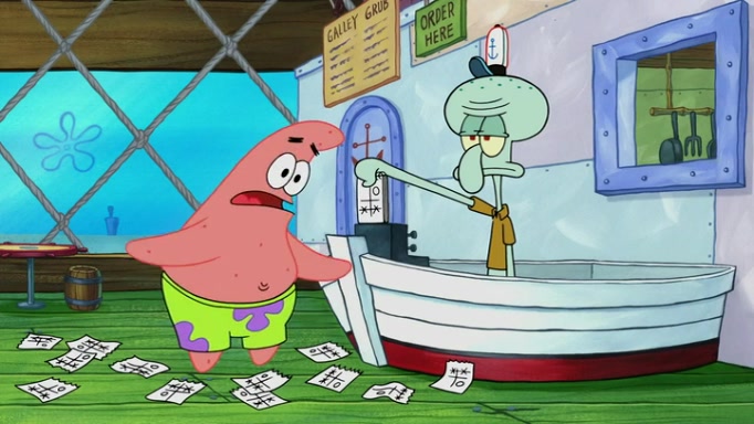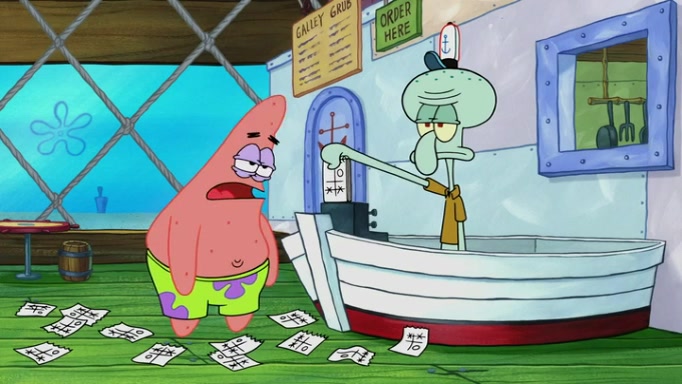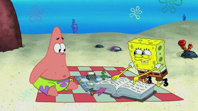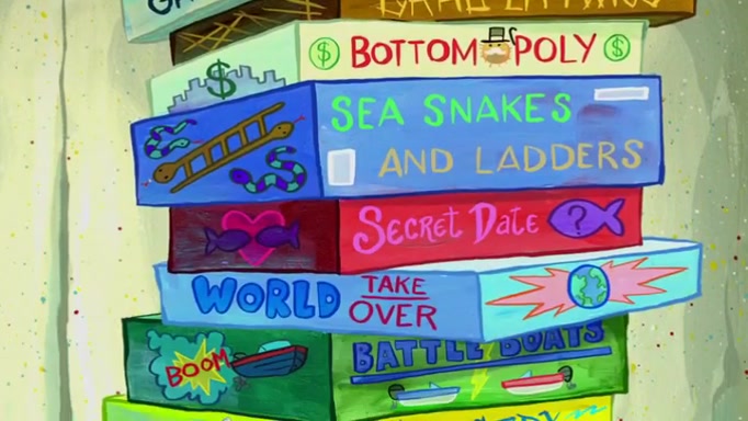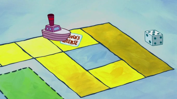 Patrick then goes to the Krusty Krab and tells Squidward that he invented a game. He explains how hard Tic Tac Toe is for him, and says that he made an easier version:Tic-Tac, which is the same but with a 2x2 grid. Patrick and Squidward play numerous games of Tic Tac but Squidward wins them all. Patrick, disappointed, says that he should have gone with his first idea: Tic. He then comes up with "Rock, Paper, Butter". Squidward trashes that idea by saying an awful pun. Patrick then comes up with "Whose rope is longer?". Squidward easily wins this, but Patrick thinks Squidward played it before. Patrick goes over to Sandy's Treedome and tells her he cannot make a game. Sandy tells Patrick to find what's best out of the games Patrick likes. So, Patrick starts cutting, gluing and taping his favorite board games together. He then says he knows what it is like to be a game maker, Frankenstein style. Squidward, SpongeBob, and Sandy all go to Patrick's rock to try out his new game. SpongeBob asks what it is called. Squidward suggests "Garbage" but Patrick comes up with "Patrick! The Game". Squidward determines a turn order which goes: Patrick, Sandy, SpongeBob, Squidward. Patrick goes first. He passes a go square and gets a lot of money. Sandy rolls and builds a beach hut on Goo Lagoon. SpongeBob lands on a chest and gets a drivers license, which means on his next go, he can move or race a car. Squidward rolls and ends up in jail. Patrick then puts a box on Squidward's head to show he is in jail which then a fish is shown inside the jail Squidward is in. Patrick rolls and lands on snacks. Patrick then eats the snacks. Sandy lands and buys Coral Avenue. SpongeBob rolls a 12 and decides to race the car. Squidward tries to roll but Patrick says you cannot roll in jail. After asking, Squidward is told that the only way to get out of jail is rolling a 6. Squidward questions that and Patrick changes it to "If a person is in jail, he or she shall stay there until he rolls a 6 or someone says his name". Sandy lands on "do surgery". Her operation card says "Remove finbone from player to your left"(Squidward). It turns out she just has to remove the finbone out of an operation fish. SpongeBob decides to race the car. Squidward decides to just leave, causing everyone else to say his name multiple times, thus getting him out of jail. SpongeBob decides to race the car again. Squidward rolls a 2 and lands on snacks. His piece, however, is knocked back to jail by the car. Patrick puts the box over Squidward's head again. Squidward starts thinking the game is random because it jumps from one game to another, nobody knows how to win and Patrick is making up the rules as he goes along. Squidward decides to go outside after SpongeBob and Sandy start feeding Patrick snacks. Patrick then makes up a rule that "If a person declares outsidsies everyone must go outside". Squidward tries to take that back but he is too late and everyone goes outside. Patrick then rolls a 4 getting everyone into the giggle zone. Everyone giggles (Squidward is forced by Sandy). SpongeBob's roll then results in everyone making silly faces. Squidward then rants that the rules are that the game does not matter. He then demonstrates by saying he could just roll and then say "Automatic winner". SpongeBob and Sandy then celebrate Squidward's win until Patrick makes up a rule that "No player can declare himself automatic winner". Squidward starts beating up the game board. He is then taken to real jail for destruction of private property which Squidward is happy about, until he sees his cellmate. He then yells at SpongeBob, Patrick, and Sandy to say his name. The episode ends with a box of the game with the words "Game over!" on it and Patrick saying "Game over!"