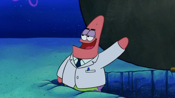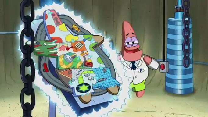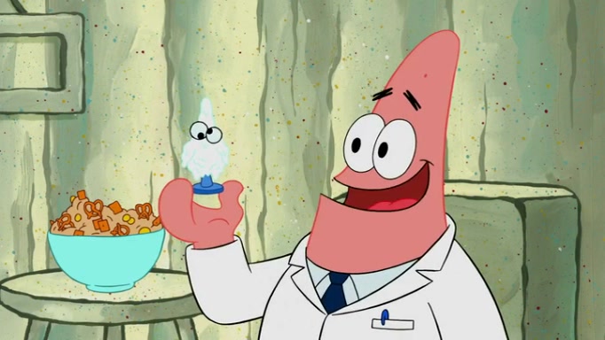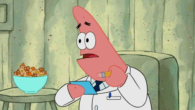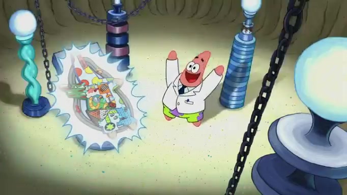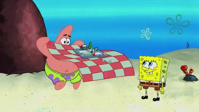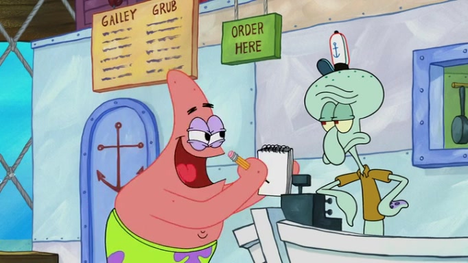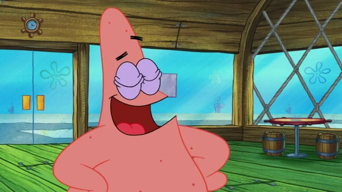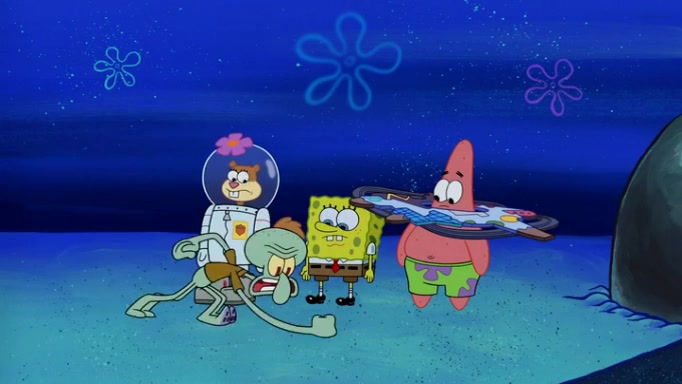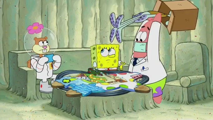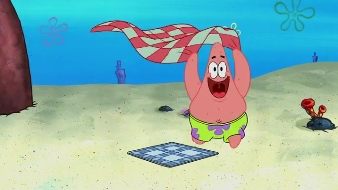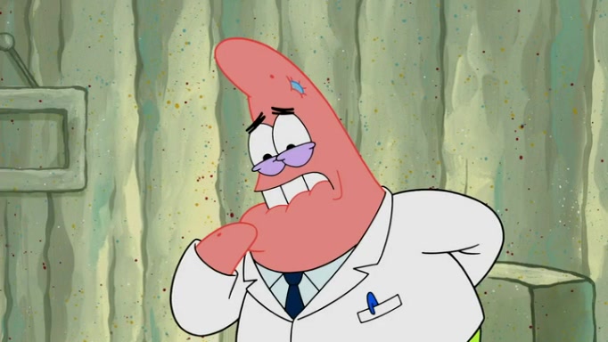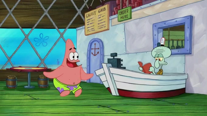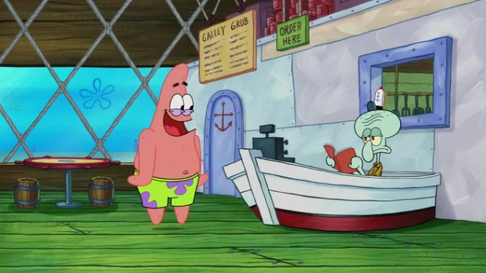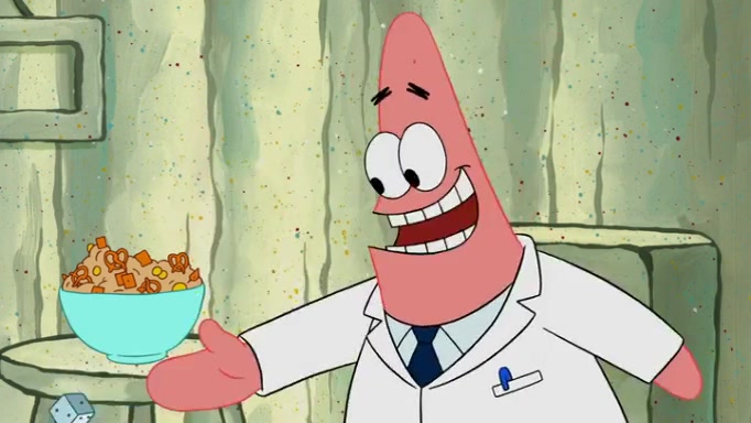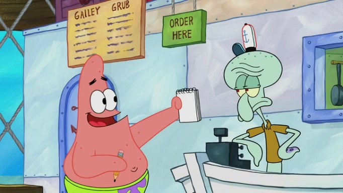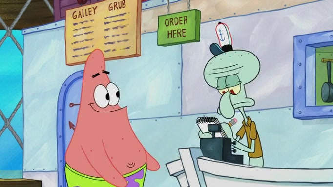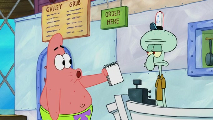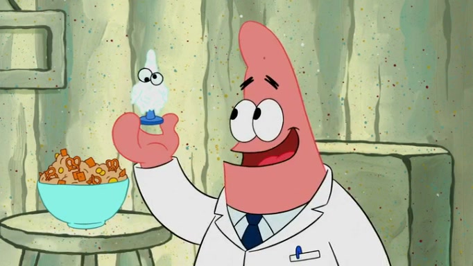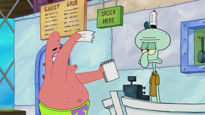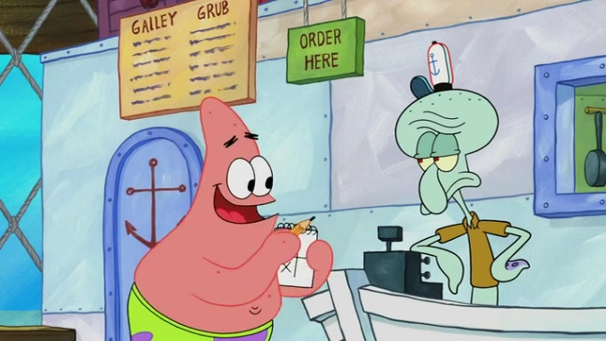 Patrick then goes to the Krusty Krab and tells Squidward that he invented a game. He explains how hard Tic Tac Toe is for him, and says that he made an easier version:Tic-Tac, which is the same but with a 2x2 grid. Patrick and Squidward play numerous games of Tic Tac but Squidward wins them all. Patrick, disappointed, says that he should have gone with his first idea: Tic. He then comes up with "Rock, Paper, Butter". Squidward trashes that idea by saying an awful pun. Patrick then comes up with "Whose rope is longer?". Squidward easily wins this, but Patrick thinks Squidward played it before. Patrick goes over to Sandy's Treedome and tells her he cannot make a game. Sandy tells Patrick to find what's best out of the games Patrick likes. So, Patrick starts cutting, gluing and taping his favorite board games together. He then says he knows what it is like to be a game maker, Frankenstein style. Squidward, SpongeBob, and Sandy all go to Patrick's rock to try out his new game. SpongeBob asks what it is called. Squidward suggests "Garbage" but Patrick comes up with "Patrick! The Game". Squidward determines a turn order which goes: Patrick, Sandy, SpongeBob, Squidward. Patrick goes first. He passes a go square and gets a lot of money. Sandy rolls and builds a beach hut on Goo Lagoon. SpongeBob lands on a chest and gets a drivers license, which means on his next go, he can move or race a car. Squidward rolls and ends up in jail. Patrick then puts a box on Squidward's head to show he is in jail which then a fish is shown inside the jail Squidward is in. Patrick rolls and lands on snacks. Patrick then eats the snacks. Sandy lands and buys Coral Avenue. SpongeBob rolls a 12 and decides to race the car. Squidward tries to roll but Patrick says you cannot roll in jail. After asking, Squidward is told that the only way to get out of jail is rolling a 6. Squidward questions that and Patrick changes it to "If a person is in jail, he or she shall stay there until he rolls a 6 or someone says his name". Sandy lands on "do surgery". Her operation card says "Remove finbone from player to your left"(Squidward). It turns out she just has to remove the finbone out of an operation fish. SpongeBob decides to race the car. Squidward decides to just leave, causing everyone else to say his name multiple times, thus getting him out of jail. SpongeBob decides to race the car again. Squidward rolls a 2 and lands on snacks. His piece, however, is knocked back to jail by the car. Patrick puts the box over Squidward's head again. Squidward starts thinking the game is random because it jumps from one game to another, nobody knows how to win and Patrick is making up the rules as he goes along. Squidward decides to go outside after SpongeBob and Sandy start feeding Patrick snacks. Patrick then makes up a rule that "If a person declares outsidsies everyone must go outside". Squidward tries to take that back but he is too late and everyone goes outside. Patrick then rolls a 4 getting everyone into the giggle zone. Everyone giggles (Squidward is forced by Sandy). SpongeBob's roll then results in everyone making silly faces. Squidward then rants that the rules are that the game does not matter. He then demonstrates by saying he could just roll and then say "Automatic winner". SpongeBob and Sandy then celebrate Squidward's win until Patrick makes up a rule that "No player can declare himself automatic winner". Squidward starts beating up the game board. He is then taken to real jail for destruction of private property which Squidward is happy about, until he sees his cellmate. He then yells at SpongeBob, Patrick, and Sandy to say his name. The episode ends with a box of the game with the words "Game over!" on it and Patrick saying "Game over!"