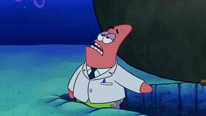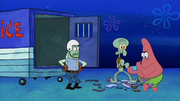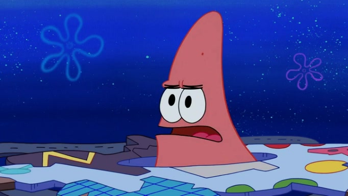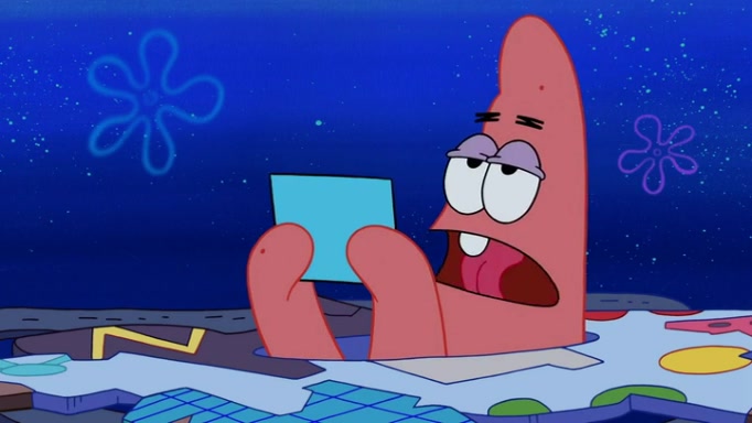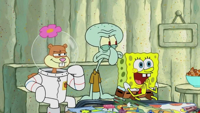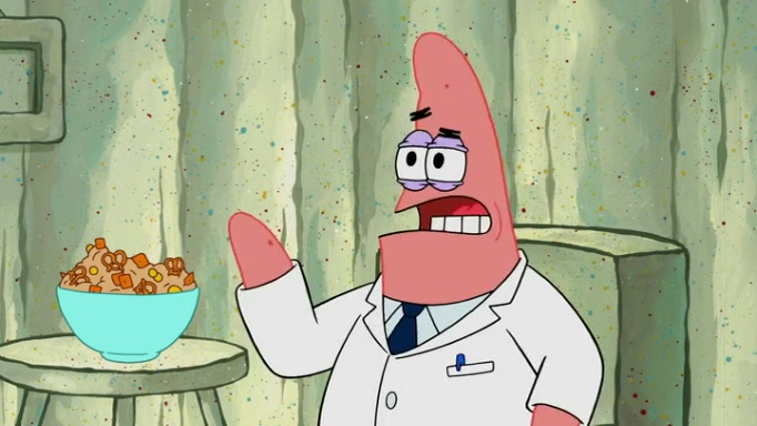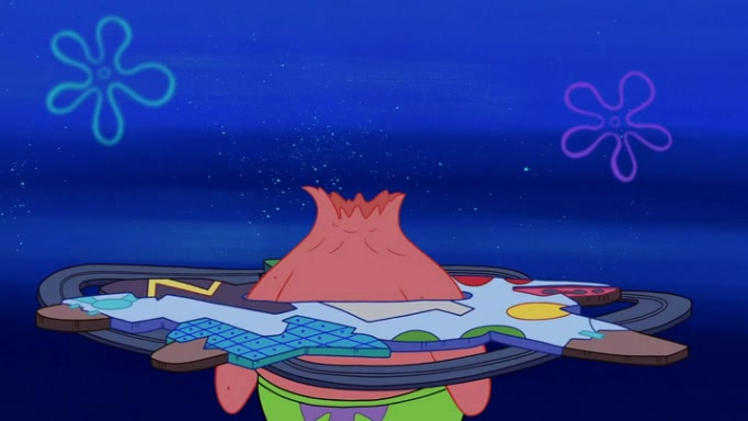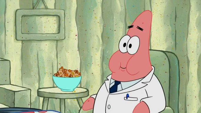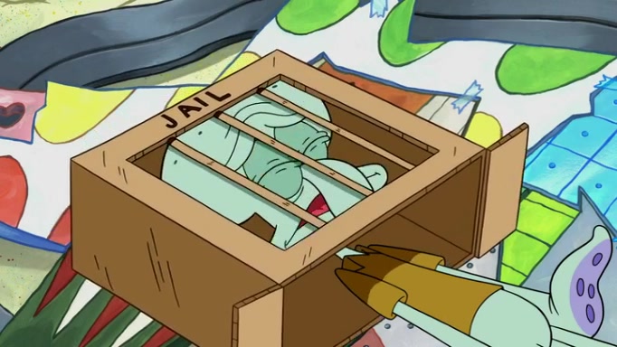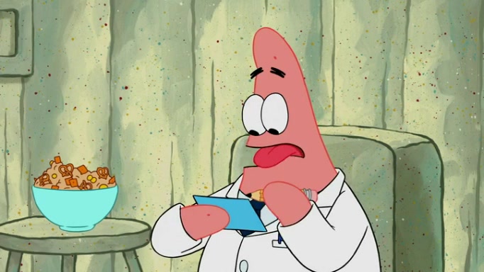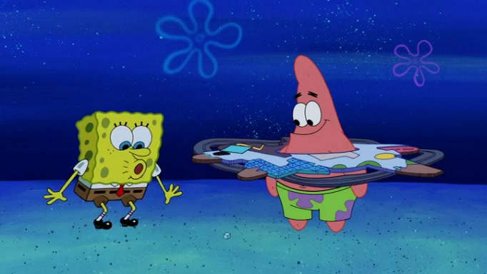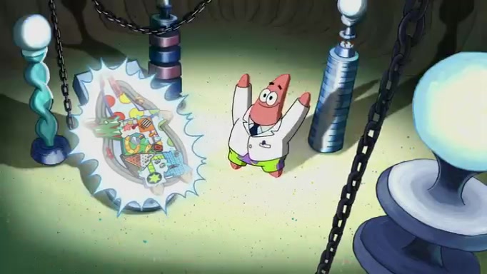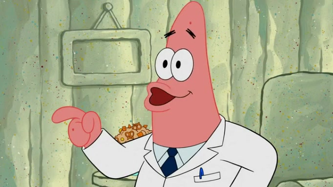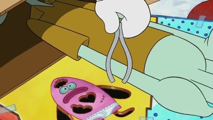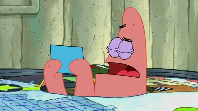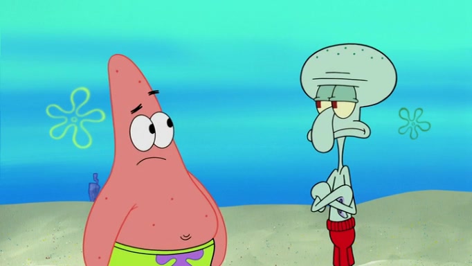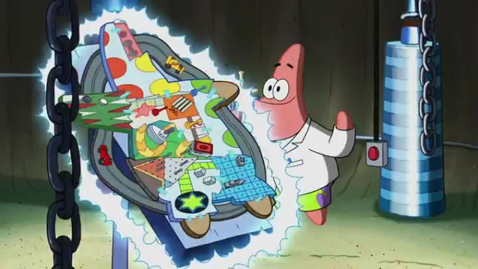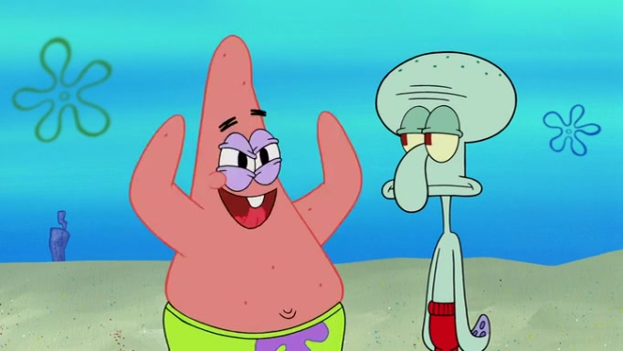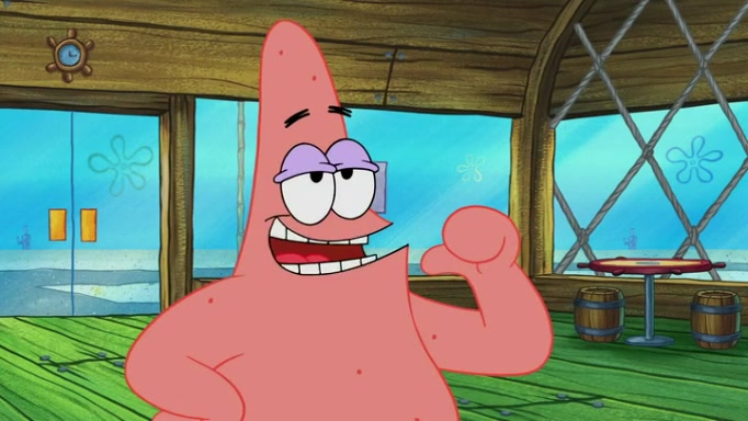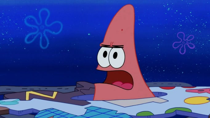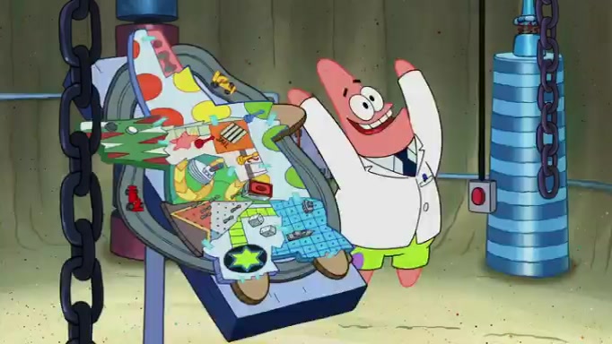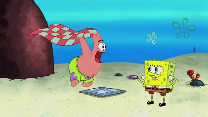 Patrick then goes to the Krusty Krab and tells Squidward that he invented a game. He explains how hard Tic Tac Toe is for him, and says that he made an easier version:Tic-Tac, which is the same but with a 2x2 grid. Patrick and Squidward play numerous games of Tic Tac but Squidward wins them all. Patrick, disappointed, says that he should have gone with his first idea: Tic. He then comes up with "Rock, Paper, Butter". Squidward trashes that idea by saying an awful pun. Patrick then comes up with "Whose rope is longer?". Squidward easily wins this, but Patrick thinks Squidward played it before. Patrick goes over to Sandy's Treedome and tells her he cannot make a game. Sandy tells Patrick to find what's best out of the games Patrick likes. So, Patrick starts cutting, gluing and taping his favorite board games together. He then says he knows what it is like to be a game maker, Frankenstein style. Squidward, SpongeBob, and Sandy all go to Patrick's rock to try out his new game. SpongeBob asks what it is called. Squidward suggests "Garbage" but Patrick comes up with "Patrick! The Game". Squidward determines a turn order which goes: Patrick, Sandy, SpongeBob, Squidward. Patrick goes first. He passes a go square and gets a lot of money. Sandy rolls and builds a beach hut on Goo Lagoon. SpongeBob lands on a chest and gets a drivers license, which means on his next go, he can move or race a car. Squidward rolls and ends up in jail. Patrick then puts a box on Squidward's head to show he is in jail which then a fish is shown inside the jail Squidward is in. Patrick rolls and lands on snacks. Patrick then eats the snacks. Sandy lands and buys Coral Avenue. SpongeBob rolls a 12 and decides to race the car. Squidward tries to roll but Patrick says you cannot roll in jail. After asking, Squidward is told that the only way to get out of jail is rolling a 6. Squidward questions that and Patrick changes it to "If a person is in jail, he or she shall stay there until he rolls a 6 or someone says his name". Sandy lands on "do surgery". Her operation card says "Remove finbone from player to your left"(Squidward). It turns out she just has to remove the finbone out of an operation fish. SpongeBob decides to race the car. Squidward decides to just leave, causing everyone else to say his name multiple times, thus getting him out of jail. SpongeBob decides to race the car again. Squidward rolls a 2 and lands on snacks. His piece, however, is knocked back to jail by the car. Patrick puts the box over Squidward's head again. Squidward starts thinking the game is random because it jumps from one game to another, nobody knows how to win and Patrick is making up the rules as he goes along. Squidward decides to go outside after SpongeBob and Sandy start feeding Patrick snacks. Patrick then makes up a rule that "If a person declares outsidsies everyone must go outside". Squidward tries to take that back but he is too late and everyone goes outside. Patrick then rolls a 4 getting everyone into the giggle zone. Everyone giggles (Squidward is forced by Sandy). SpongeBob's roll then results in everyone making silly faces. Squidward then rants that the rules are that the game does not matter. He then demonstrates by saying he could just roll and then say "Automatic winner". SpongeBob and Sandy then celebrate Squidward's win until Patrick makes up a rule that "No player can declare himself automatic winner". Squidward starts beating up the game board. He is then taken to real jail for destruction of private property which Squidward is happy about, until he sees his cellmate. He then yells at SpongeBob, Patrick, and Sandy to say his name. The episode ends with a box of the game with the words "Game over!" on it and Patrick saying "Game over!"