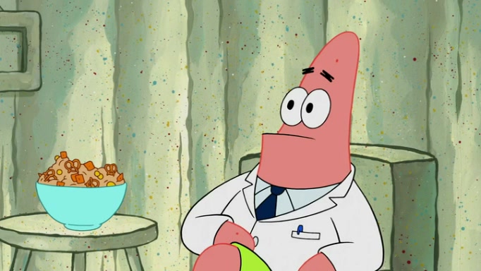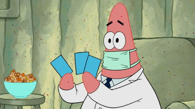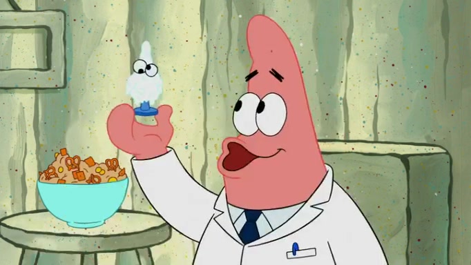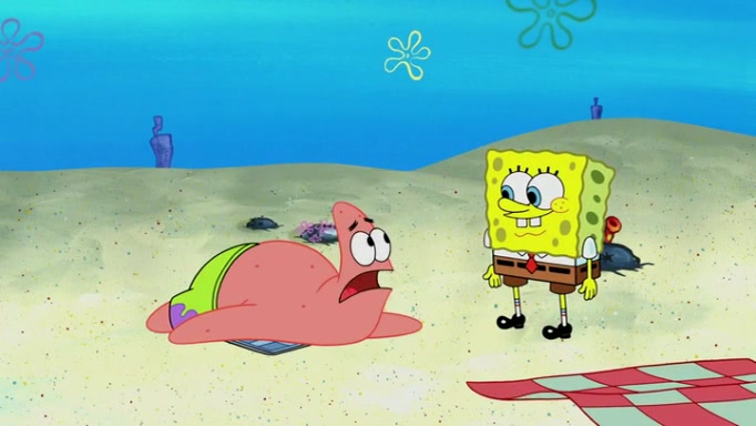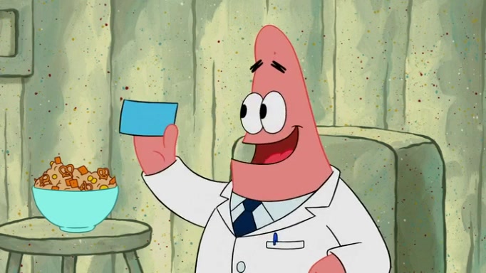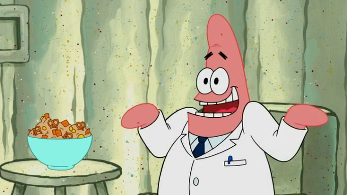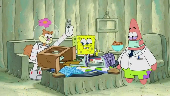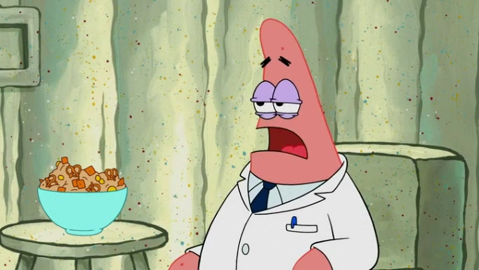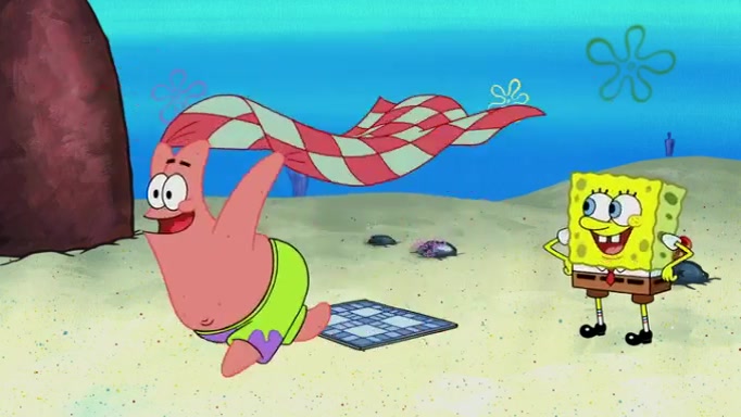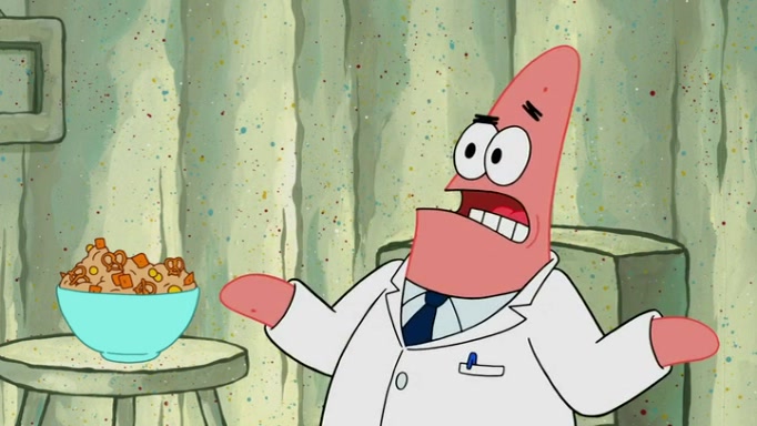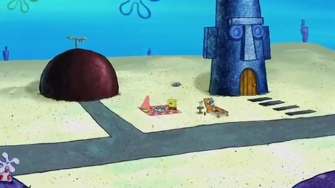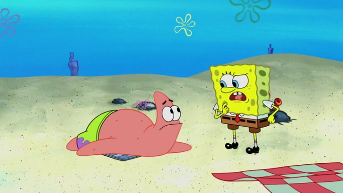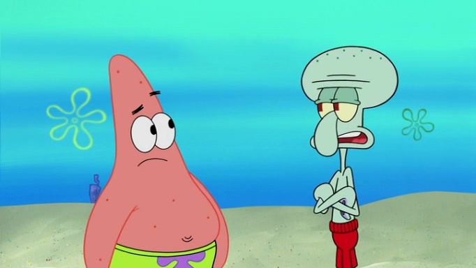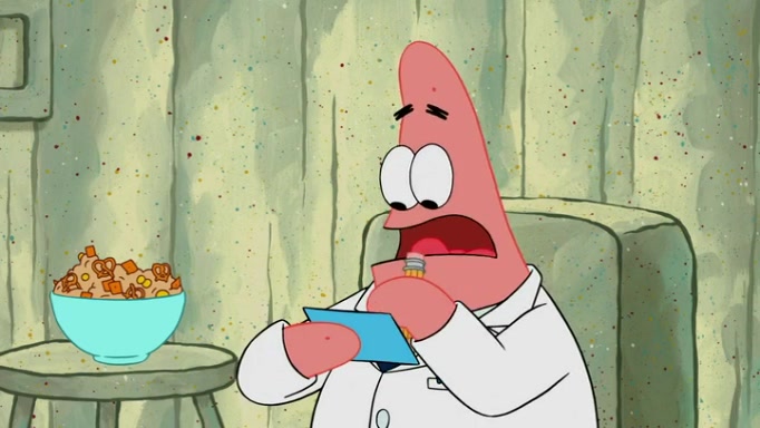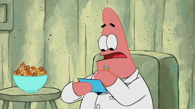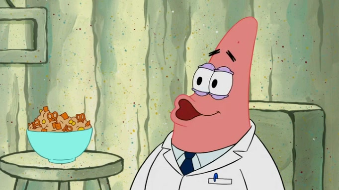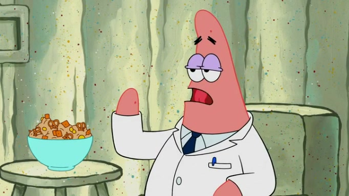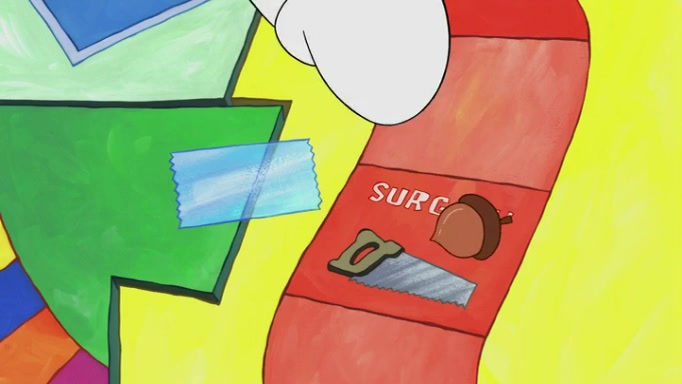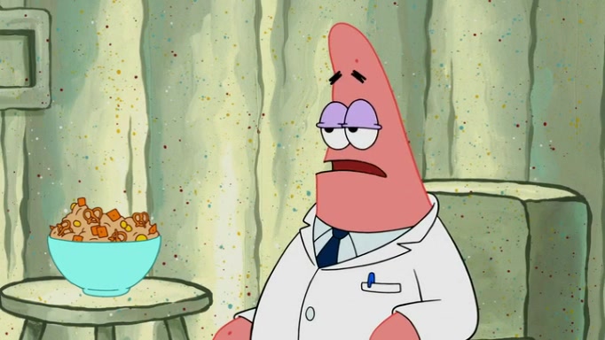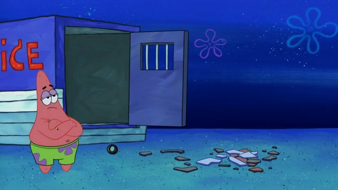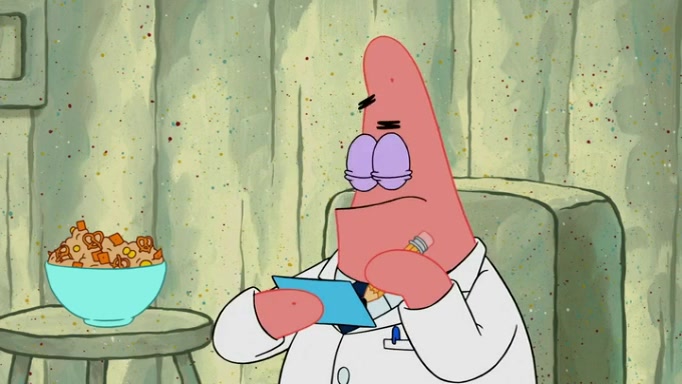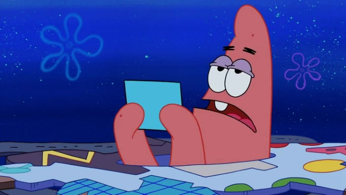 Patrick then goes to the Krusty Krab and tells Squidward that he invented a game. He explains how hard Tic Tac Toe is for him, and says that he made an easier version:Tic-Tac, which is the same but with a 2x2 grid. Patrick and Squidward play numerous games of Tic Tac but Squidward wins them all. Patrick, disappointed, says that he should have gone with his first idea: Tic. He then comes up with "Rock, Paper, Butter". Squidward trashes that idea by saying an awful pun. Patrick then comes up with "Whose rope is longer?". Squidward easily wins this, but Patrick thinks Squidward played it before. Patrick goes over to Sandy's Treedome and tells her he cannot make a game. Sandy tells Patrick to find what's best out of the games Patrick likes. So, Patrick starts cutting, gluing and taping his favorite board games together. He then says he knows what it is like to be a game maker, Frankenstein style. Squidward, SpongeBob, and Sandy all go to Patrick's rock to try out his new game. SpongeBob asks what it is called. Squidward suggests "Garbage" but Patrick comes up with "Patrick! The Game". Squidward determines a turn order which goes: Patrick, Sandy, SpongeBob, Squidward. Patrick goes first. He passes a go square and gets a lot of money. Sandy rolls and builds a beach hut on Goo Lagoon. SpongeBob lands on a chest and gets a drivers license, which means on his next go, he can move or race a car. Squidward rolls and ends up in jail. Patrick then puts a box on Squidward's head to show he is in jail which then a fish is shown inside the jail Squidward is in. Patrick rolls and lands on snacks. Patrick then eats the snacks. Sandy lands and buys Coral Avenue. SpongeBob rolls a 12 and decides to race the car. Squidward tries to roll but Patrick says you cannot roll in jail. After asking, Squidward is told that the only way to get out of jail is rolling a 6. Squidward questions that and Patrick changes it to "If a person is in jail, he or she shall stay there until he rolls a 6 or someone says his name". Sandy lands on "do surgery". Her operation card says "Remove finbone from player to your left"(Squidward). It turns out she just has to remove the finbone out of an operation fish. SpongeBob decides to race the car. Squidward decides to just leave, causing everyone else to say his name multiple times, thus getting him out of jail. SpongeBob decides to race the car again. Squidward rolls a 2 and lands on snacks. His piece, however, is knocked back to jail by the car. Patrick puts the box over Squidward's head again. Squidward starts thinking the game is random because it jumps from one game to another, nobody knows how to win and Patrick is making up the rules as he goes along. Squidward decides to go outside after SpongeBob and Sandy start feeding Patrick snacks. Patrick then makes up a rule that "If a person declares outsidsies everyone must go outside". Squidward tries to take that back but he is too late and everyone goes outside. Patrick then rolls a 4 getting everyone into the giggle zone. Everyone giggles (Squidward is forced by Sandy). SpongeBob's roll then results in everyone making silly faces. Squidward then rants that the rules are that the game does not matter. He then demonstrates by saying he could just roll and then say "Automatic winner". SpongeBob and Sandy then celebrate Squidward's win until Patrick makes up a rule that "No player can declare himself automatic winner". Squidward starts beating up the game board. He is then taken to real jail for destruction of private property which Squidward is happy about, until he sees his cellmate. He then yells at SpongeBob, Patrick, and Sandy to say his name. The episode ends with a box of the game with the words "Game over!" on it and Patrick saying "Game over!"