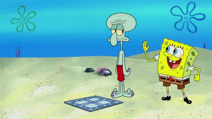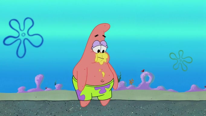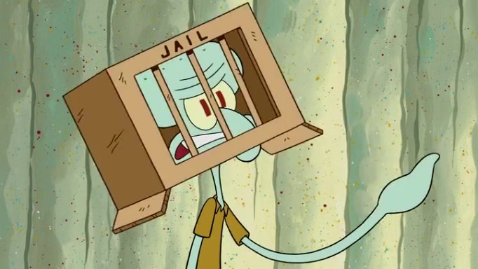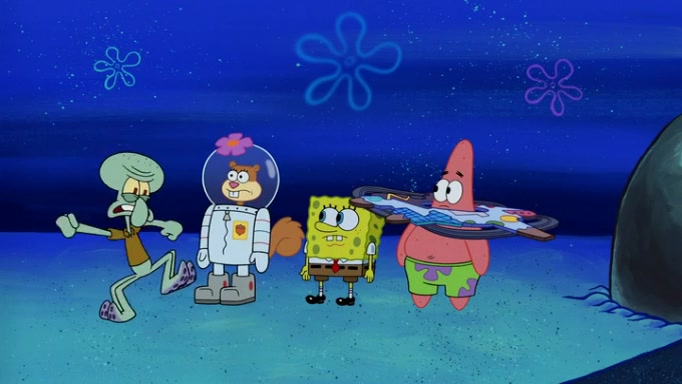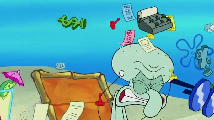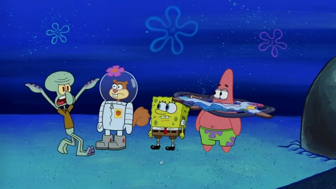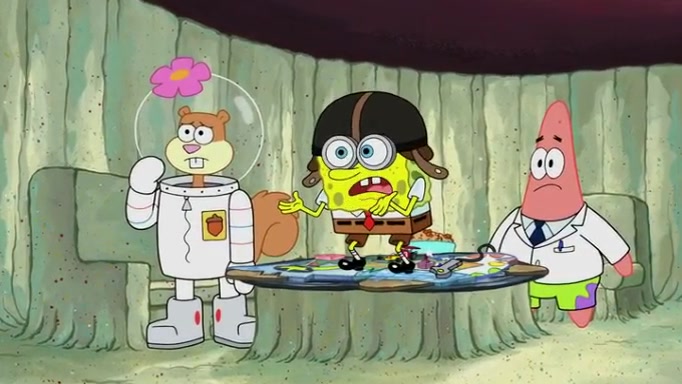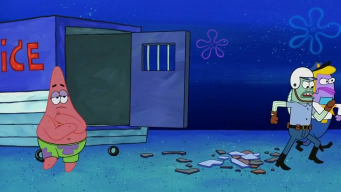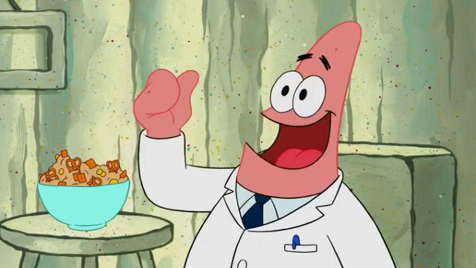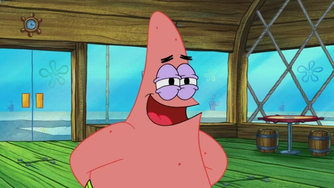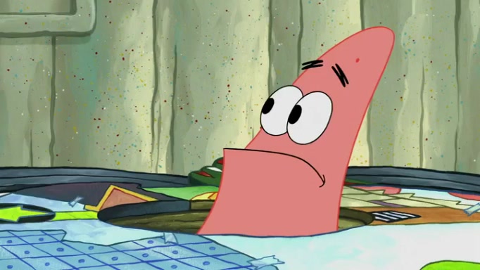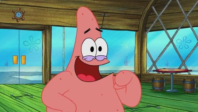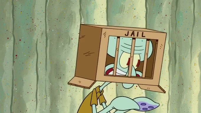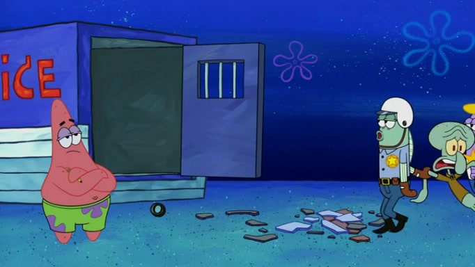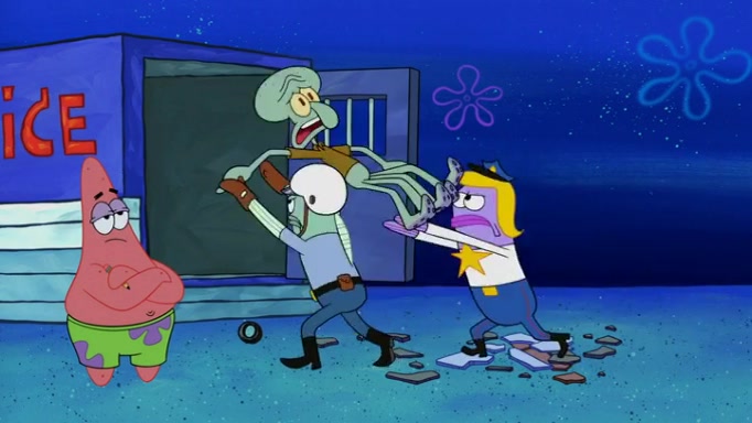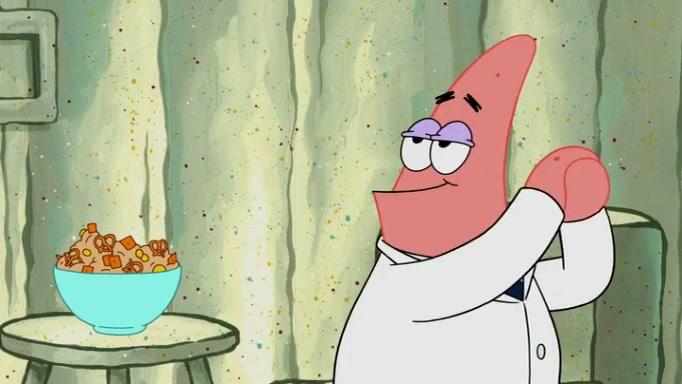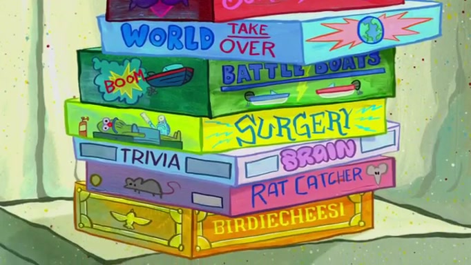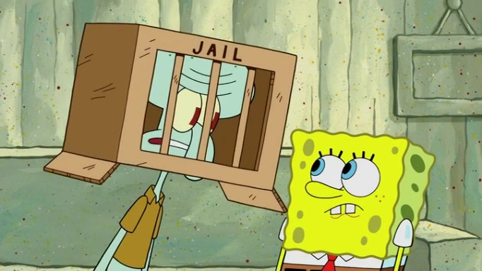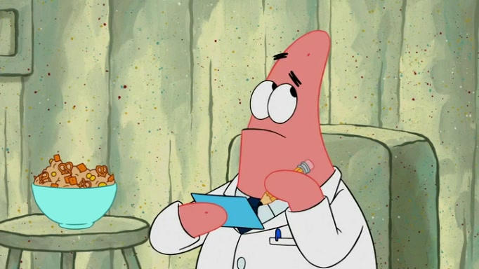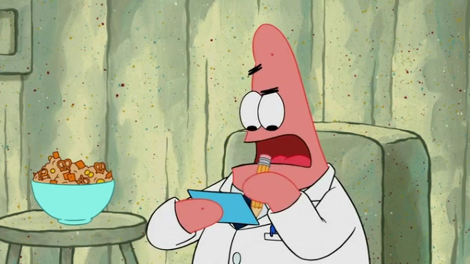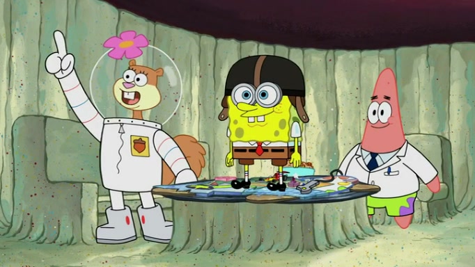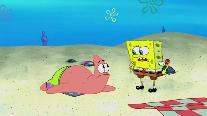 Patrick then goes to the Krusty Krab and tells Squidward that he invented a game. He explains how hard Tic Tac Toe is for him, and says that he made an easier version:Tic-Tac, which is the same but with a 2x2 grid. Patrick and Squidward play numerous games of Tic Tac but Squidward wins them all. Patrick, disappointed, says that he should have gone with his first idea: Tic. He then comes up with "Rock, Paper, Butter". Squidward trashes that idea by saying an awful pun. Patrick then comes up with "Whose rope is longer?". Squidward easily wins this, but Patrick thinks Squidward played it before. Patrick goes over to Sandy's Treedome and tells her he cannot make a game. Sandy tells Patrick to find what's best out of the games Patrick likes. So, Patrick starts cutting, gluing and taping his favorite board games together. He then says he knows what it is like to be a game maker, Frankenstein style. Squidward, SpongeBob, and Sandy all go to Patrick's rock to try out his new game. SpongeBob asks what it is called. Squidward suggests "Garbage" but Patrick comes up with "Patrick! The Game". Squidward determines a turn order which goes: Patrick, Sandy, SpongeBob, Squidward. Patrick goes first. He passes a go square and gets a lot of money. Sandy rolls and builds a beach hut on Goo Lagoon. SpongeBob lands on a chest and gets a drivers license, which means on his next go, he can move or race a car. Squidward rolls and ends up in jail. Patrick then puts a box on Squidward's head to show he is in jail which then a fish is shown inside the jail Squidward is in. Patrick rolls and lands on snacks. Patrick then eats the snacks. Sandy lands and buys Coral Avenue. SpongeBob rolls a 12 and decides to race the car. Squidward tries to roll but Patrick says you cannot roll in jail. After asking, Squidward is told that the only way to get out of jail is rolling a 6. Squidward questions that and Patrick changes it to "If a person is in jail, he or she shall stay there until he rolls a 6 or someone says his name". Sandy lands on "do surgery". Her operation card says "Remove finbone from player to your left"(Squidward). It turns out she just has to remove the finbone out of an operation fish. SpongeBob decides to race the car. Squidward decides to just leave, causing everyone else to say his name multiple times, thus getting him out of jail. SpongeBob decides to race the car again. Squidward rolls a 2 and lands on snacks. His piece, however, is knocked back to jail by the car. Patrick puts the box over Squidward's head again. Squidward starts thinking the game is random because it jumps from one game to another, nobody knows how to win and Patrick is making up the rules as he goes along. Squidward decides to go outside after SpongeBob and Sandy start feeding Patrick snacks. Patrick then makes up a rule that "If a person declares outsidsies everyone must go outside". Squidward tries to take that back but he is too late and everyone goes outside. Patrick then rolls a 4 getting everyone into the giggle zone. Everyone giggles (Squidward is forced by Sandy). SpongeBob's roll then results in everyone making silly faces. Squidward then rants that the rules are that the game does not matter. He then demonstrates by saying he could just roll and then say "Automatic winner". SpongeBob and Sandy then celebrate Squidward's win until Patrick makes up a rule that "No player can declare himself automatic winner". Squidward starts beating up the game board. He is then taken to real jail for destruction of private property which Squidward is happy about, until he sees his cellmate. He then yells at SpongeBob, Patrick, and Sandy to say his name. The episode ends with a box of the game with the words "Game over!" on it and Patrick saying "Game over!"