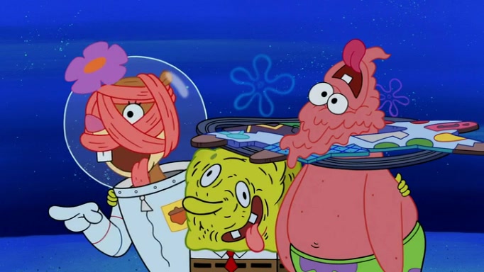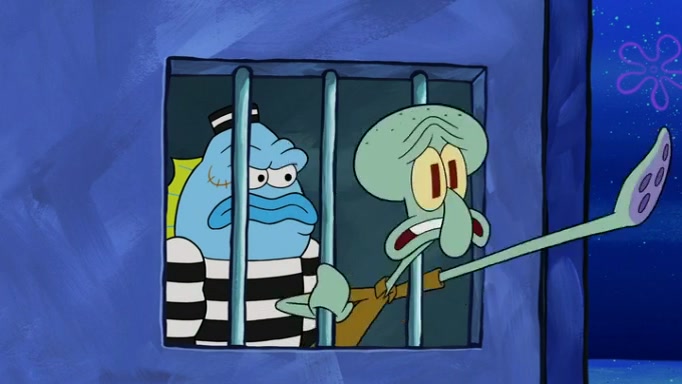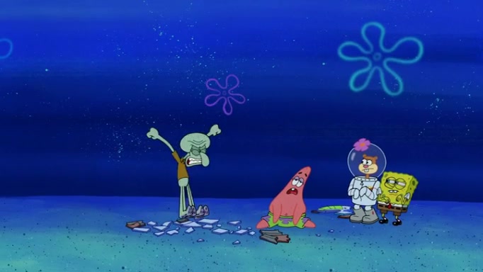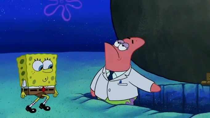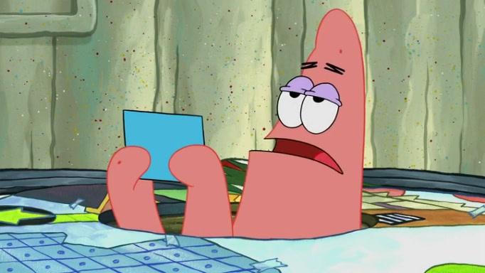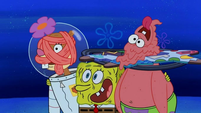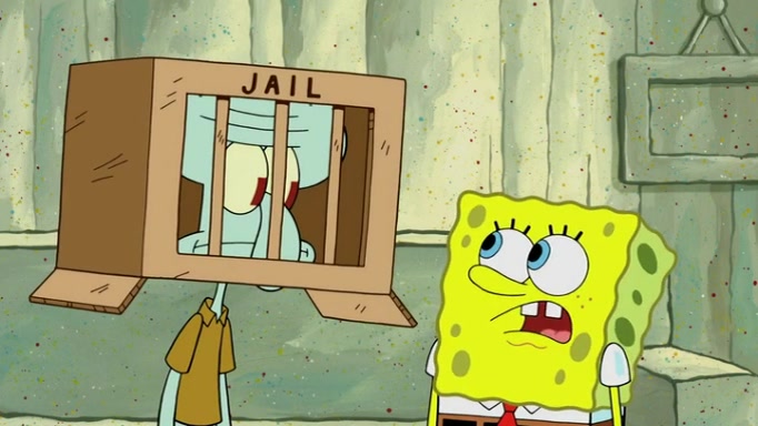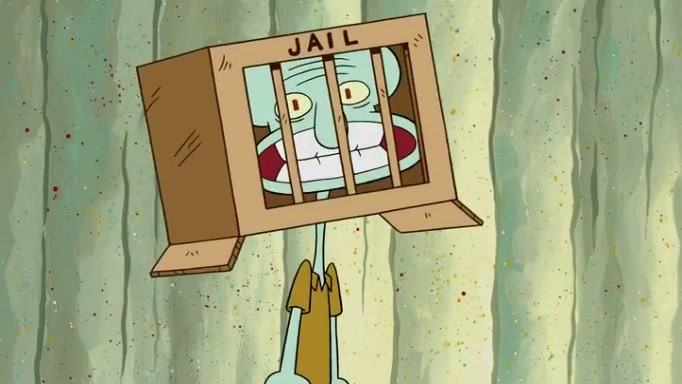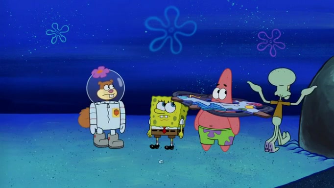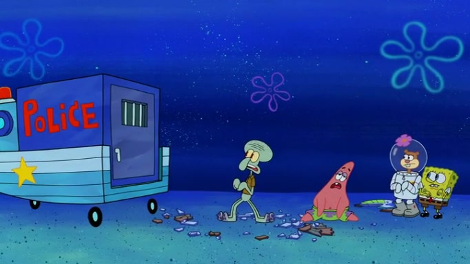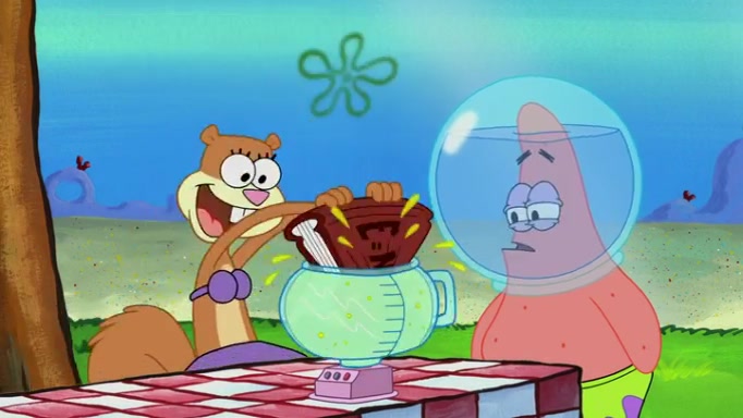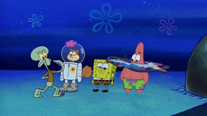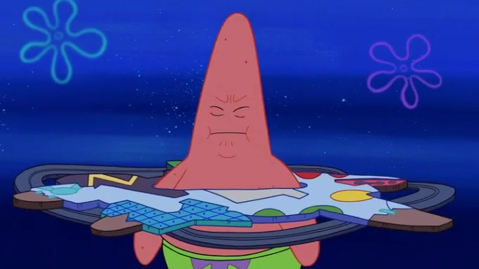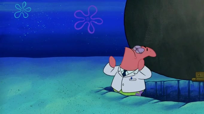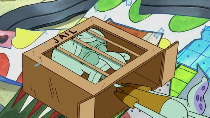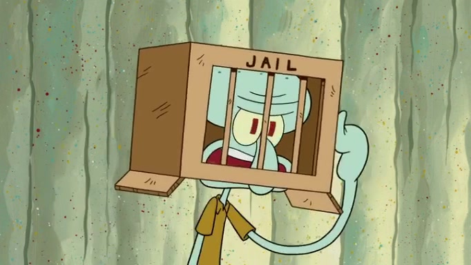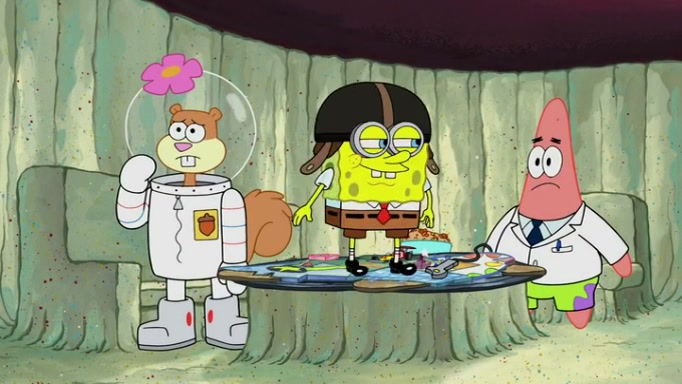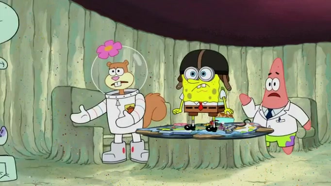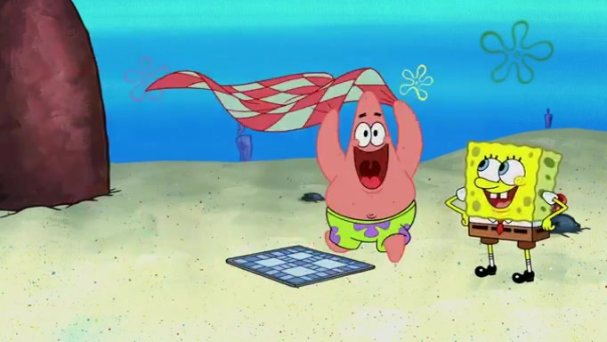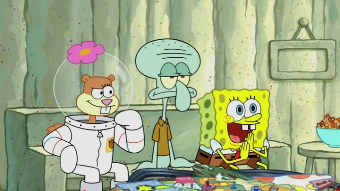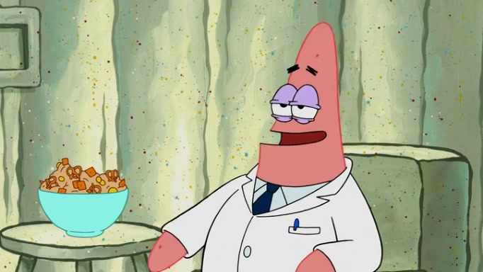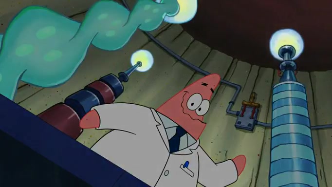 Patrick then goes to the Krusty Krab and tells Squidward that he invented a game. He explains how hard Tic Tac Toe is for him, and says that he made an easier version:Tic-Tac, which is the same but with a 2x2 grid. Patrick and Squidward play numerous games of Tic Tac but Squidward wins them all. Patrick, disappointed, says that he should have gone with his first idea: Tic. He then comes up with "Rock, Paper, Butter". Squidward trashes that idea by saying an awful pun. Patrick then comes up with "Whose rope is longer?". Squidward easily wins this, but Patrick thinks Squidward played it before. Patrick goes over to Sandy's Treedome and tells her he cannot make a game. Sandy tells Patrick to find what's best out of the games Patrick likes. So, Patrick starts cutting, gluing and taping his favorite board games together. He then says he knows what it is like to be a game maker, Frankenstein style. Squidward, SpongeBob, and Sandy all go to Patrick's rock to try out his new game. SpongeBob asks what it is called. Squidward suggests "Garbage" but Patrick comes up with "Patrick! The Game". Squidward determines a turn order which goes: Patrick, Sandy, SpongeBob, Squidward. Patrick goes first. He passes a go square and gets a lot of money. Sandy rolls and builds a beach hut on Goo Lagoon. SpongeBob lands on a chest and gets a drivers license, which means on his next go, he can move or race a car. Squidward rolls and ends up in jail. Patrick then puts a box on Squidward's head to show he is in jail which then a fish is shown inside the jail Squidward is in. Patrick rolls and lands on snacks. Patrick then eats the snacks. Sandy lands and buys Coral Avenue. SpongeBob rolls a 12 and decides to race the car. Squidward tries to roll but Patrick says you cannot roll in jail. After asking, Squidward is told that the only way to get out of jail is rolling a 6. Squidward questions that and Patrick changes it to "If a person is in jail, he or she shall stay there until he rolls a 6 or someone says his name". Sandy lands on "do surgery". Her operation card says "Remove finbone from player to your left"(Squidward). It turns out she just has to remove the finbone out of an operation fish. SpongeBob decides to race the car. Squidward decides to just leave, causing everyone else to say his name multiple times, thus getting him out of jail. SpongeBob decides to race the car again. Squidward rolls a 2 and lands on snacks. His piece, however, is knocked back to jail by the car. Patrick puts the box over Squidward's head again. Squidward starts thinking the game is random because it jumps from one game to another, nobody knows how to win and Patrick is making up the rules as he goes along. Squidward decides to go outside after SpongeBob and Sandy start feeding Patrick snacks. Patrick then makes up a rule that "If a person declares outsidsies everyone must go outside". Squidward tries to take that back but he is too late and everyone goes outside. Patrick then rolls a 4 getting everyone into the giggle zone. Everyone giggles (Squidward is forced by Sandy). SpongeBob's roll then results in everyone making silly faces. Squidward then rants that the rules are that the game does not matter. He then demonstrates by saying he could just roll and then say "Automatic winner". SpongeBob and Sandy then celebrate Squidward's win until Patrick makes up a rule that "No player can declare himself automatic winner". Squidward starts beating up the game board. He is then taken to real jail for destruction of private property which Squidward is happy about, until he sees his cellmate. He then yells at SpongeBob, Patrick, and Sandy to say his name. The episode ends with a box of the game with the words "Game over!" on it and Patrick saying "Game over!"